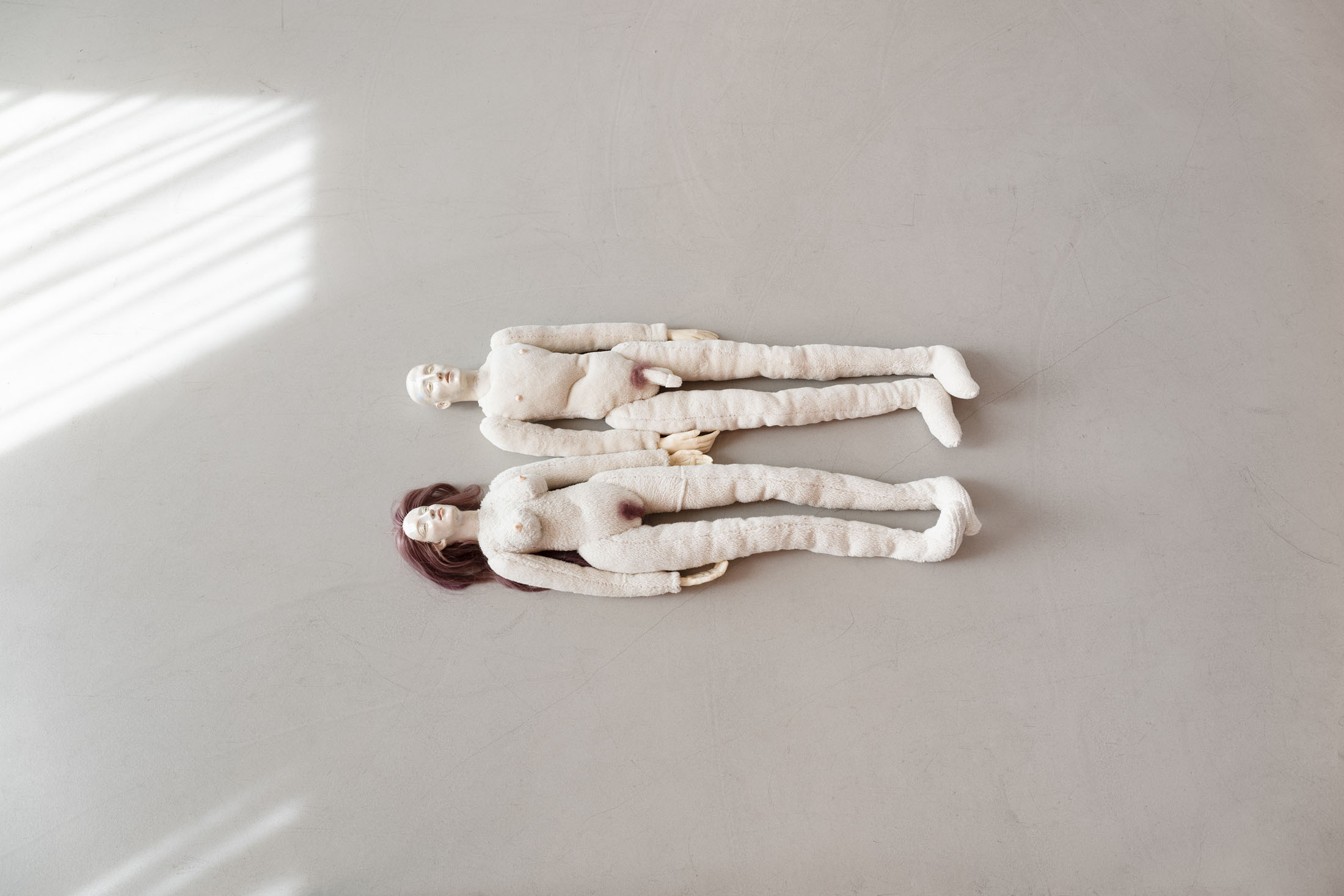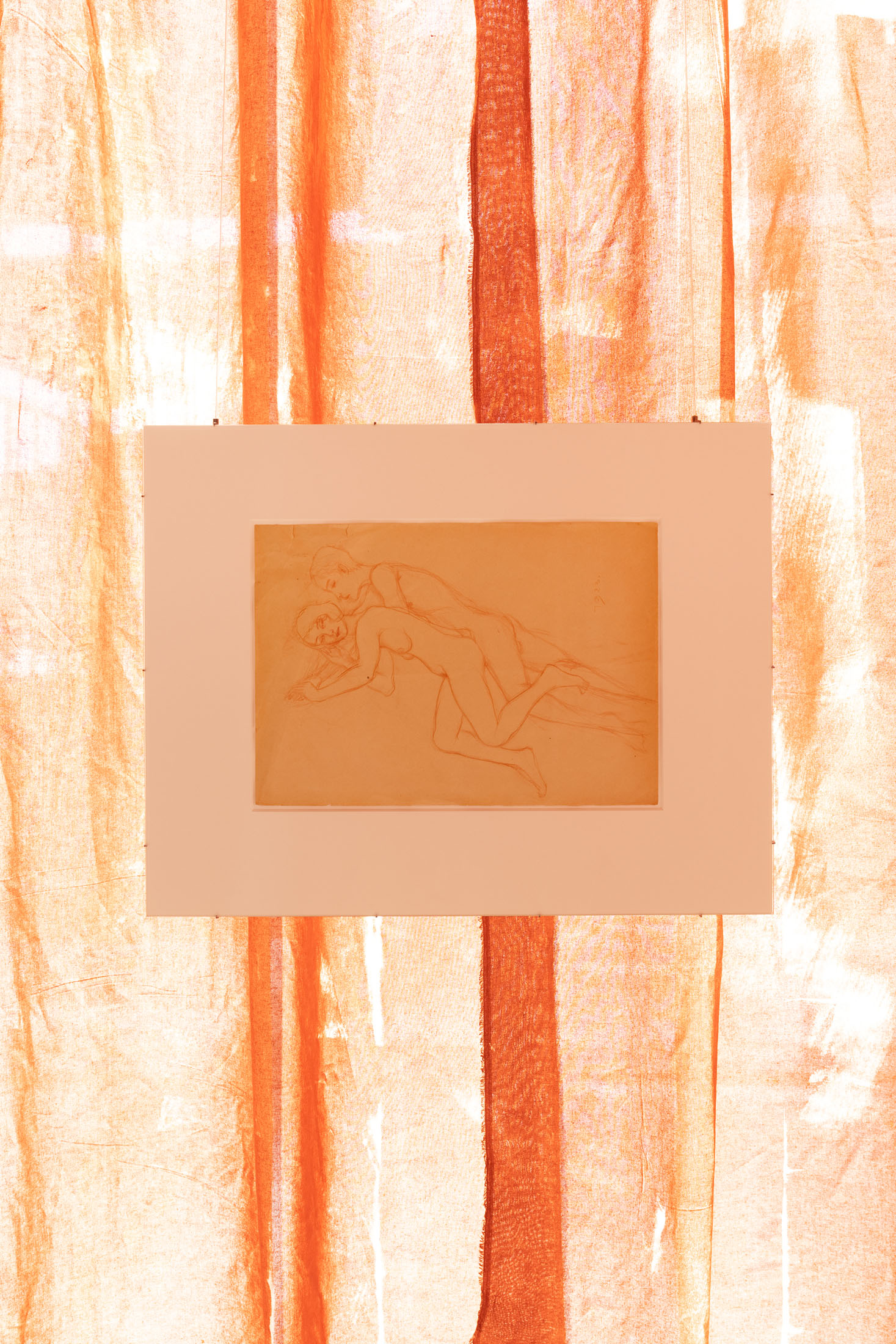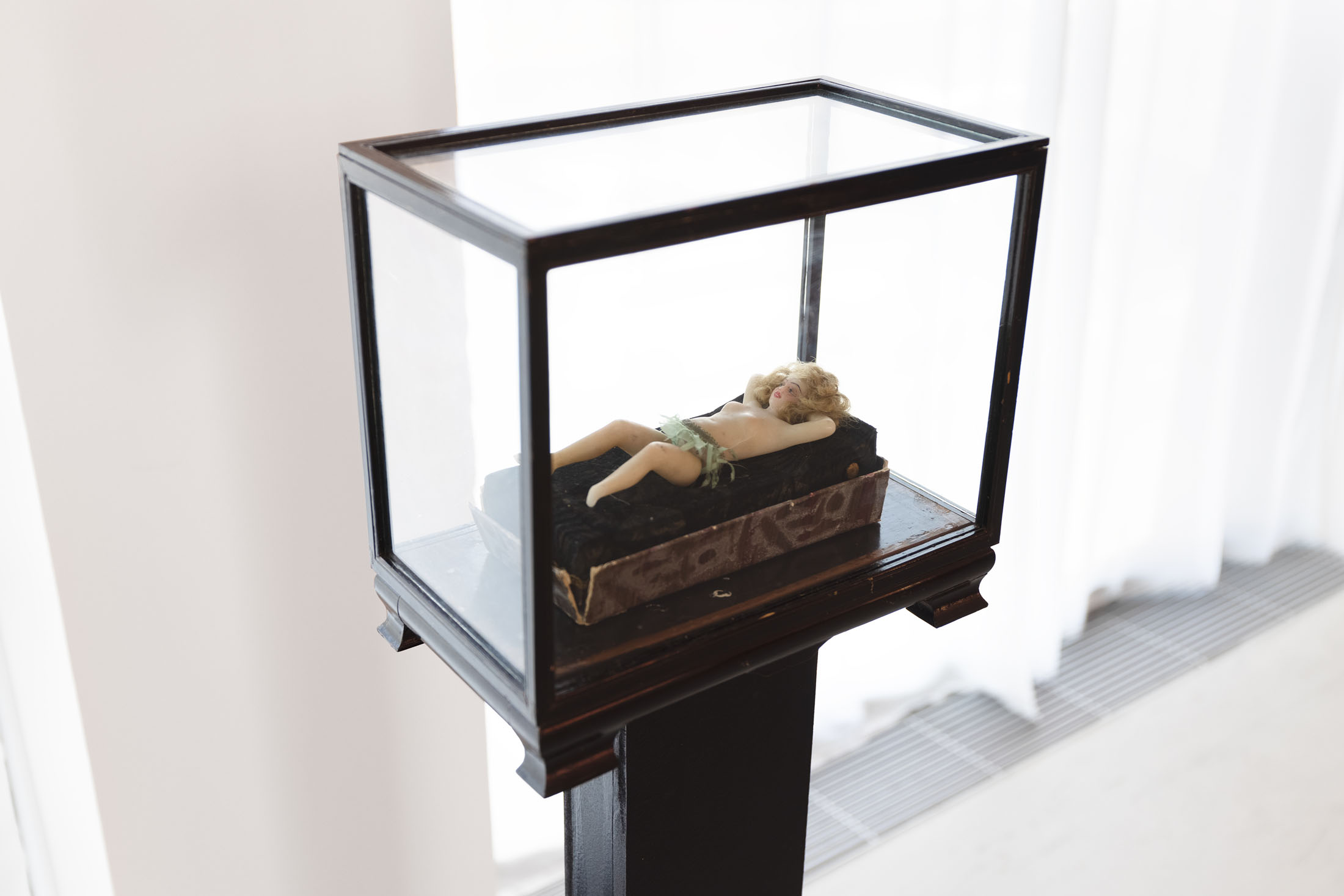 Drawing on numerous art historical references, Matsubara engages with the uncanny gap between representation and the represented: a doll, posed seductively and reminiscent of Édouard Manet’s ‘Olympia’ (1863), lies damaged, her foot severed, on a cardboard bed in an antique vitrine—a kind of glass coffin. Echoes of European fin-de-siècle painters such as Gustav Klimt (1862–1918), Francis Picabia (1879–1953), Fernand Khnopff (1858–1921), and Jean-Auguste-Dominique Ingres (1780–1867) emerge in the drawings, as well as references to Austrian painter Oskar Kokoschka (1886–1980), who famously commissioned a life-sized doll of his former lover Alma Mahler (1879–1964) to relive their time together. The exhibition evokes a longing for this era, poised at the threshold of a new age: in Vienna, where Matsubara lives today, psychoanalysis first turned its attention to eros, formulating concepts of desire that would later inform advertising and marketing.