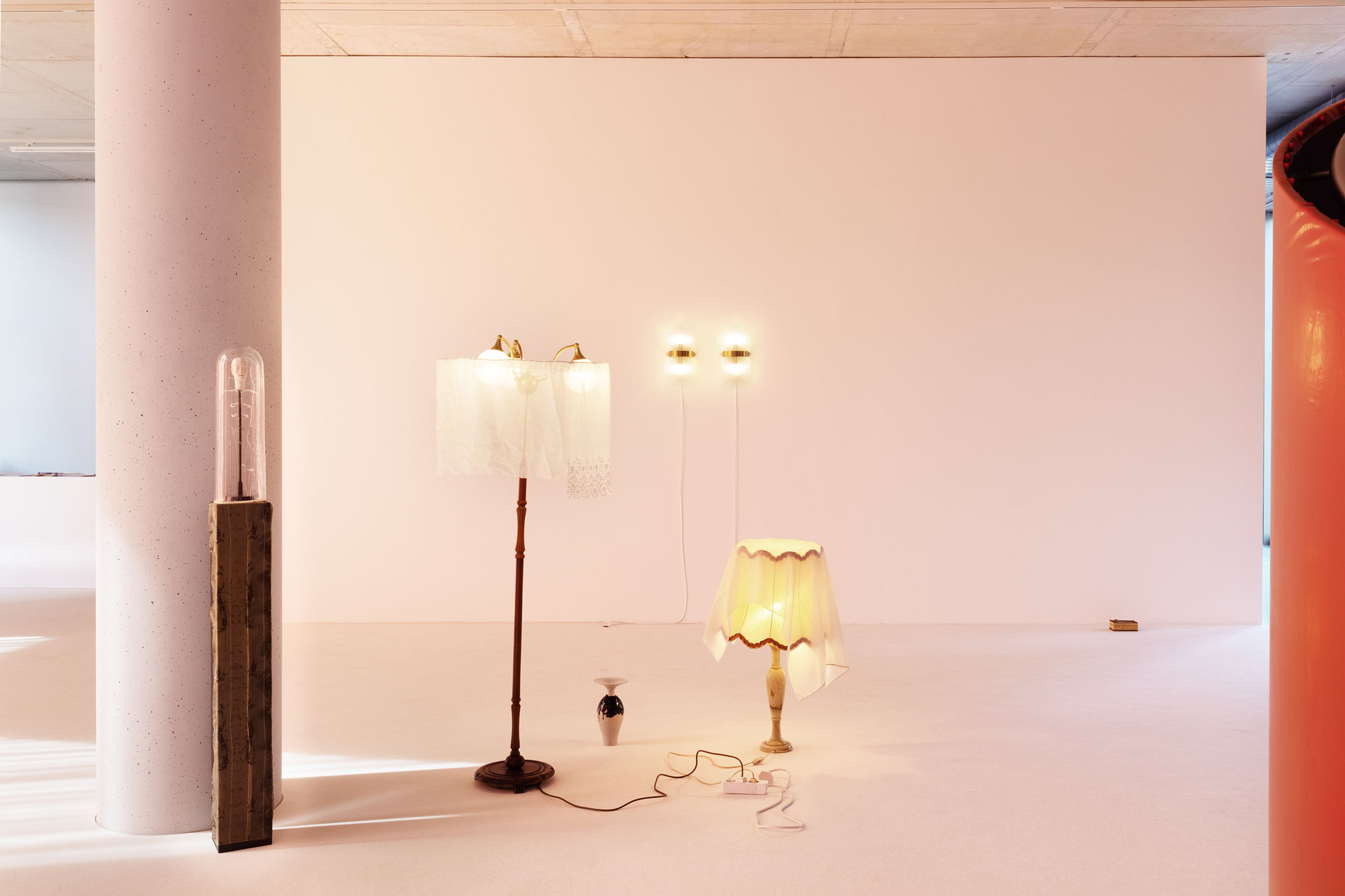 In ‘Sleeves of Desire’, Matsubara establishes a tension between here and now, then and there; between object and subject; between the exhibition as a situated environment and the outside world. Between a bygone era and the present—desire, longing, and impossibility. The exhibition becomes a confrontation with the erotic pull of the past, echoed in the works on display: found artworks from flea markets and antique shops are completed with Matsubara’s own drawings. Second-hand vases become torsos for ceramic heads—a hybrid between artwork and everyday item, decorative object and representation of the human body. It is an attempt to merge with a past moment, a gesture of the Other, a touch of the unknown as an object of desire. A visualization and objectification of the proximity between eros and death.