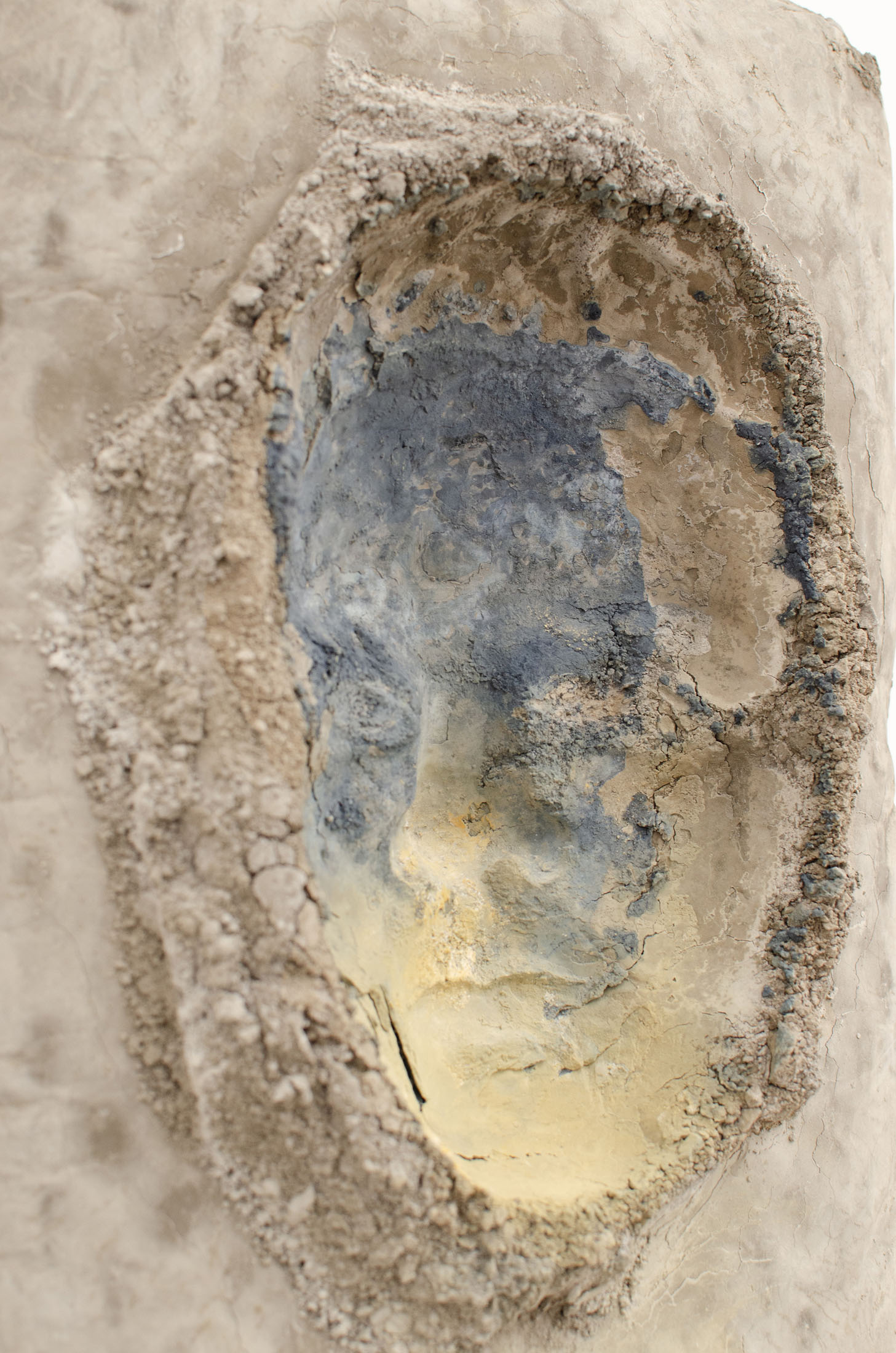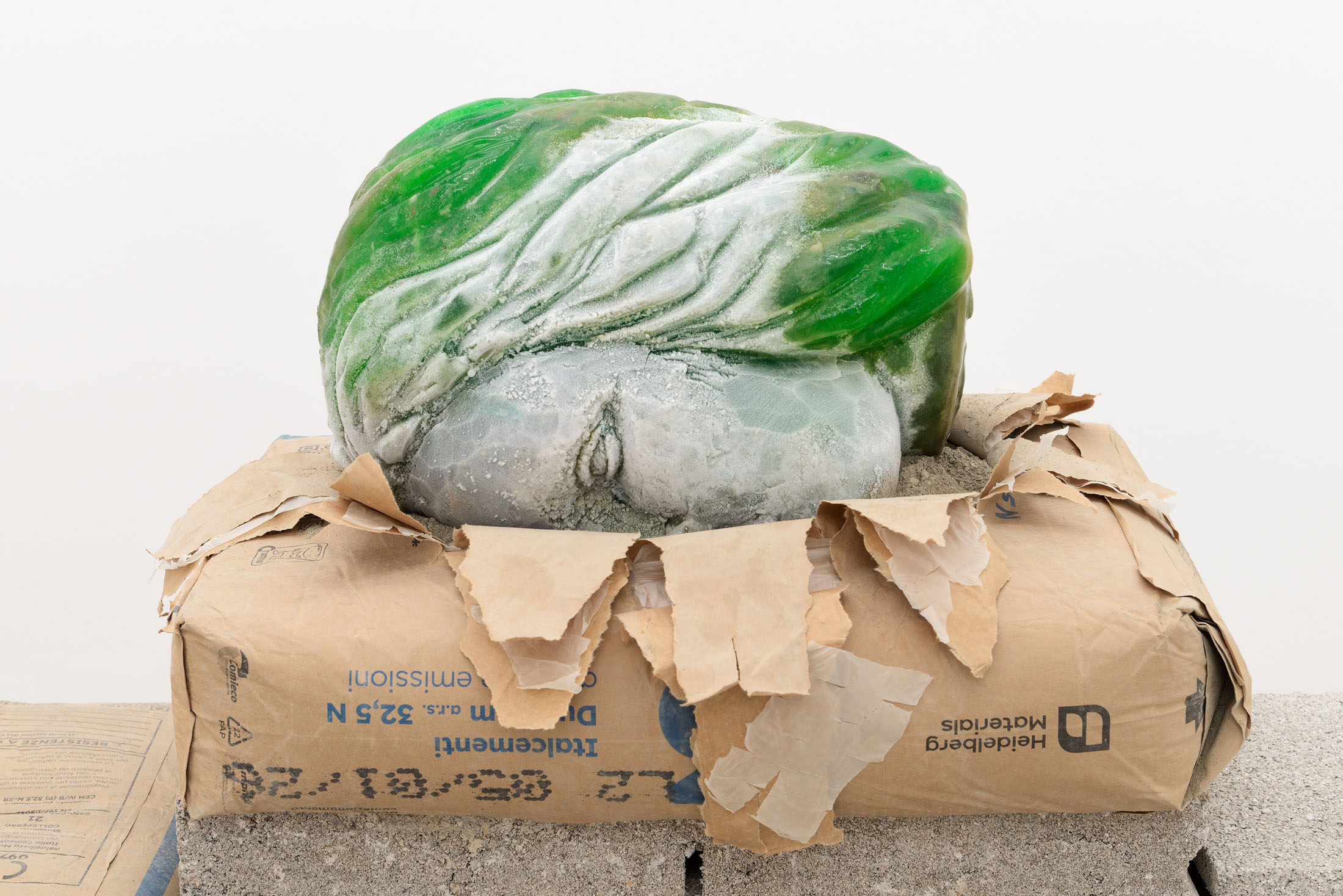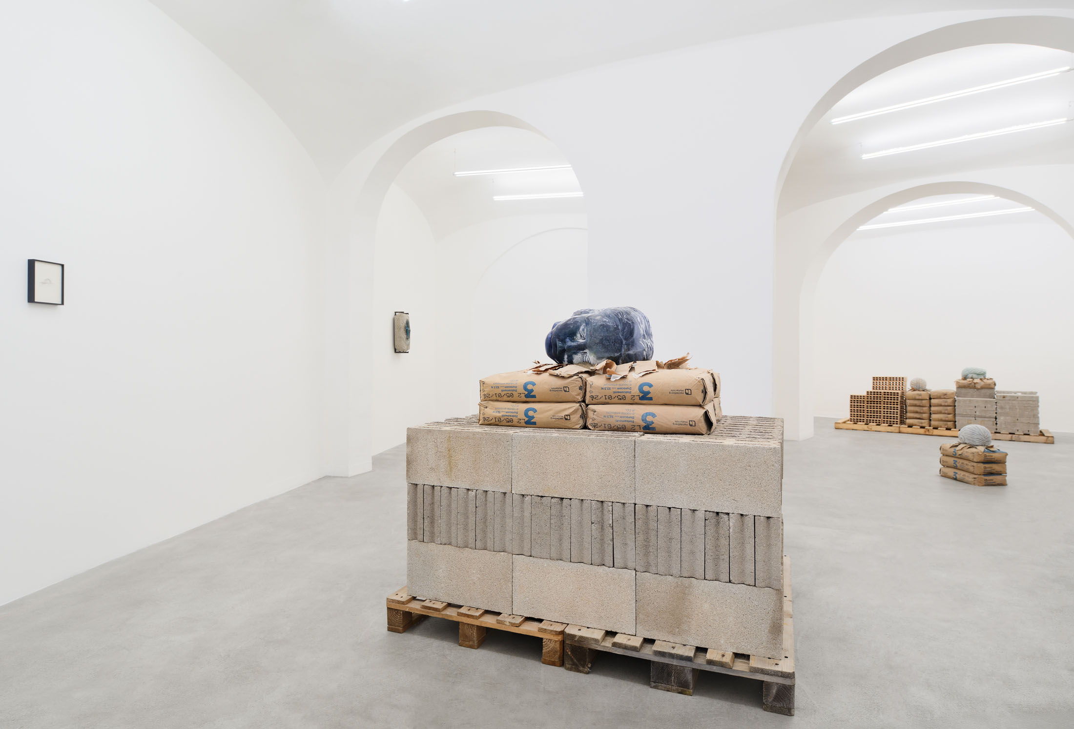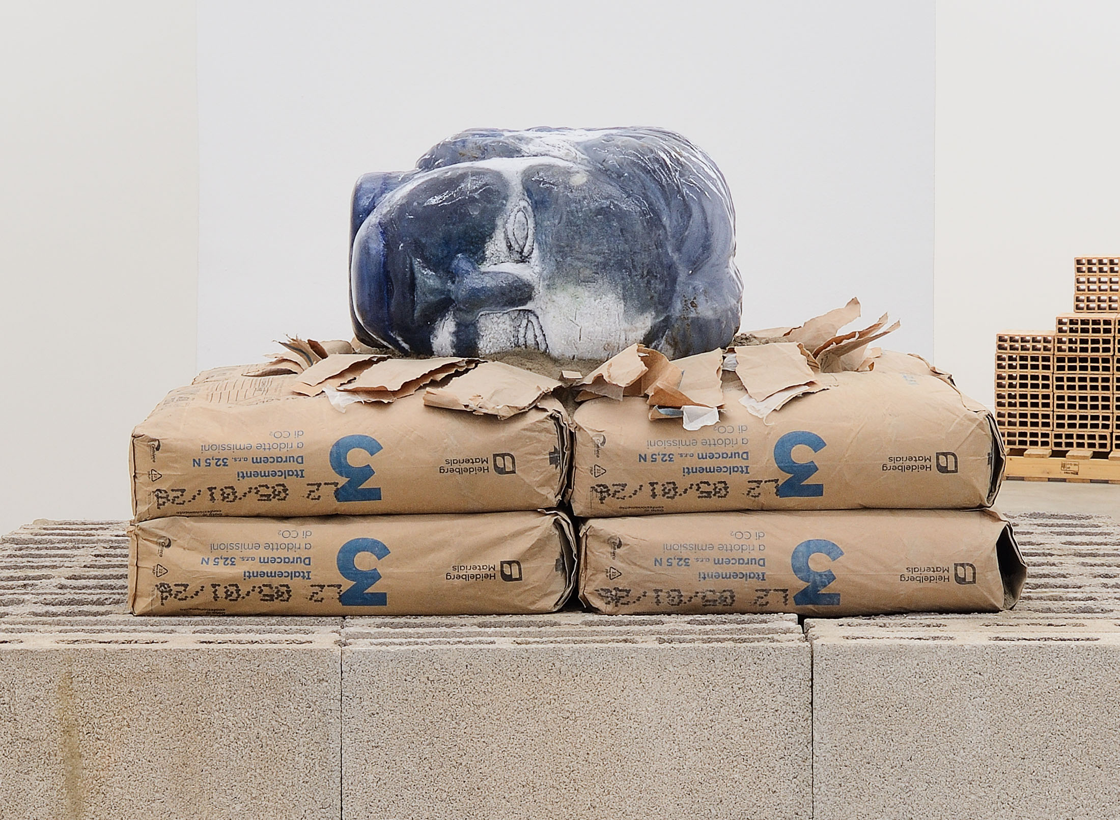 Polychrome sculptures composed of frozen water, oxides, and pigments depict imaginary figures resting atop towers of stacked materials, waiting to become architecture: suspended visions that emerge from the artist’s autobiographical imagination. As these ice busts rapidly melt, they soak the cement dust beneath, which reacts by solidifying into stone – a sedimentary fossil in the making, preserving the features of the face that once rested upon it. The result is a cascading morphology in which the sculpture forms from within, staining, excavating, and hardening matter layer by layer. This is a process that partly eludes the artist’s control, where fullness and void, solid and ephemeral matter, artifact and natural phenomenon, ancient and contemporary coexist.
