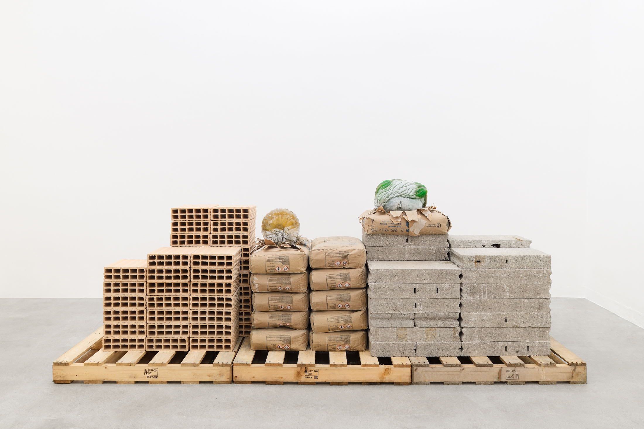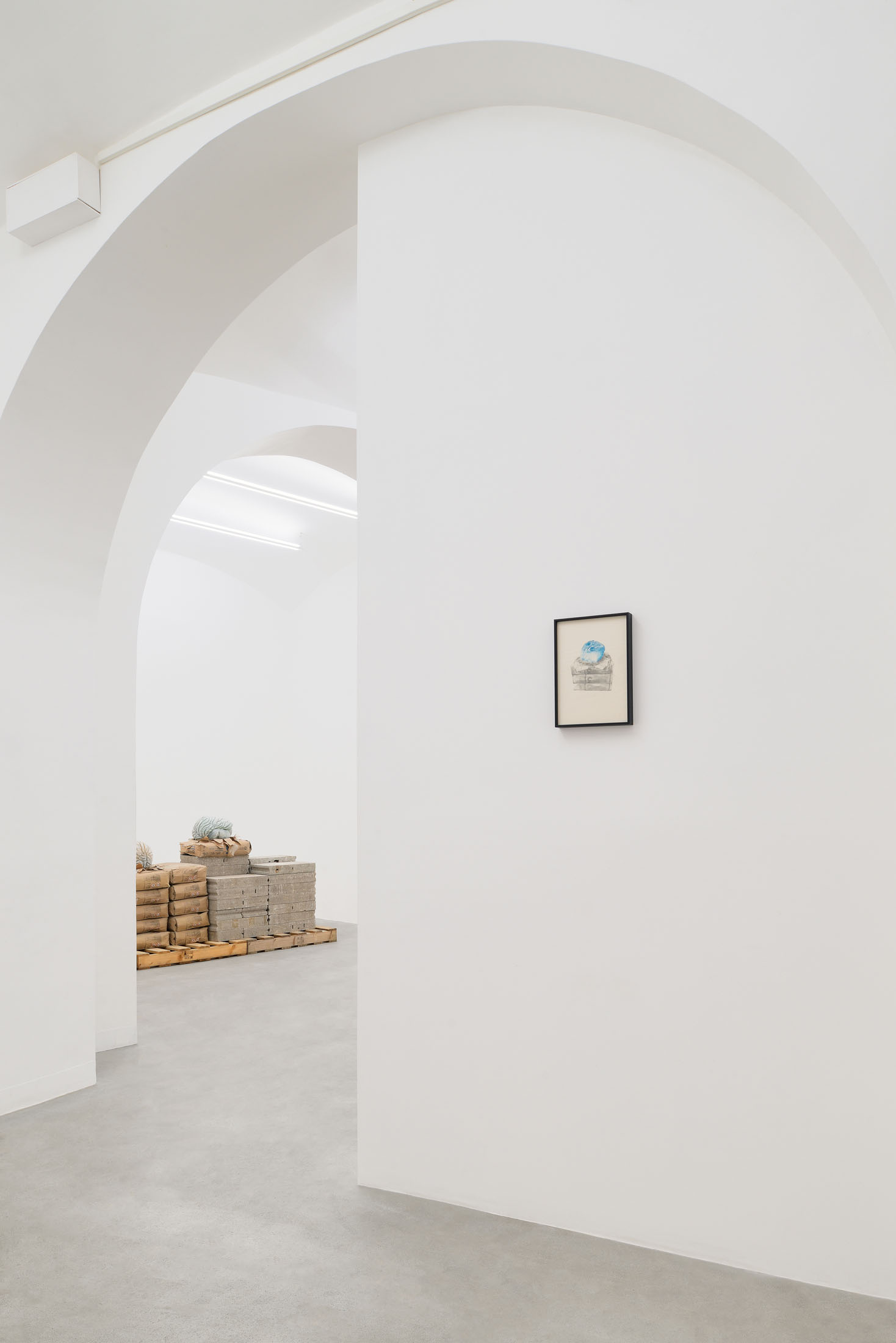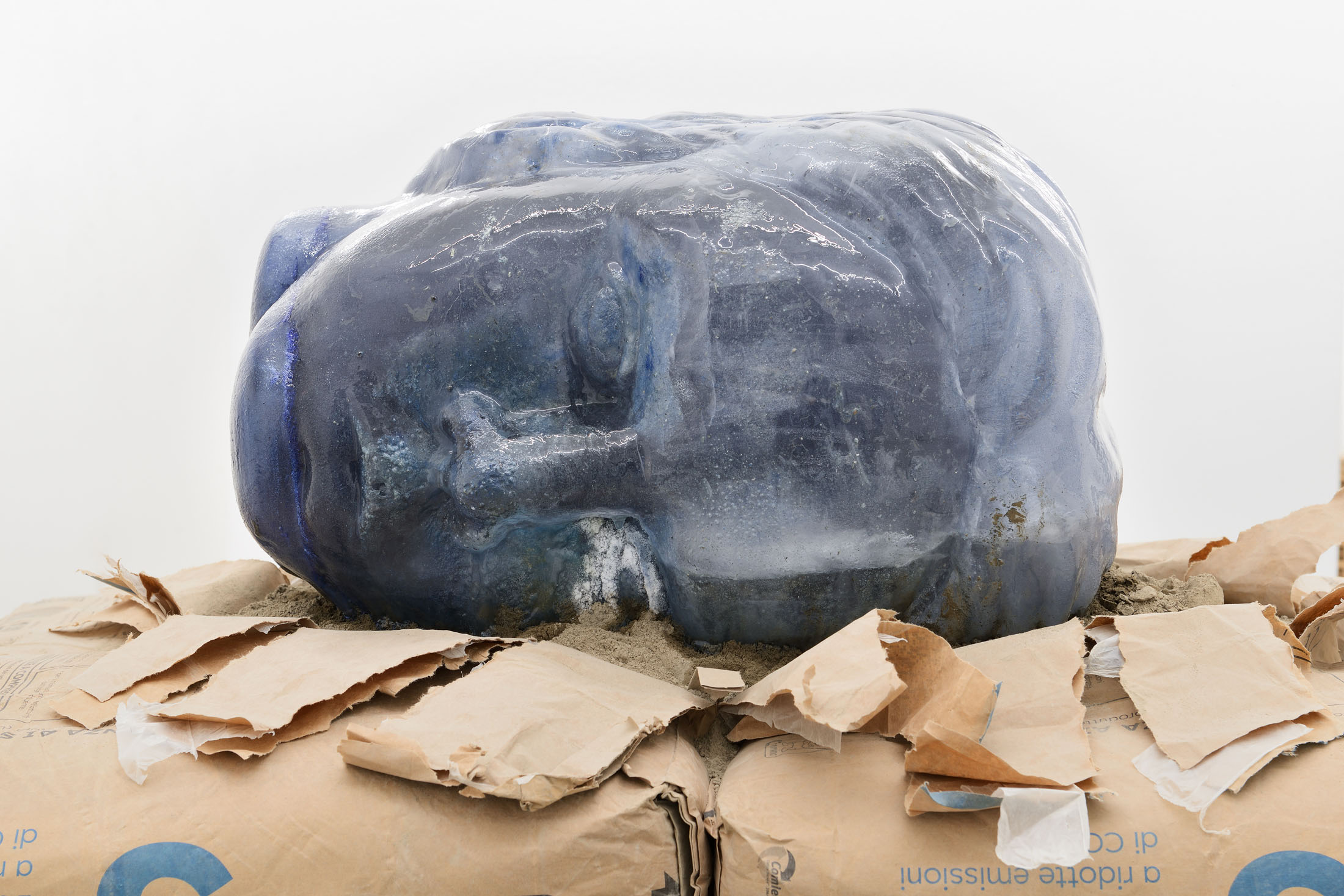 Polychrome sculptures composed of frozen water, oxides, and pigments depict imaginary figures resting atop towers of stacked materials, waiting to become architecture: suspended visions that emerge from the artist’s autobiographical imagination. As these ice busts rapidly melt, they soak the cement dust beneath, which reacts by solidifying into stone – a sedimentary fossil in the making, preserving the features of the face that once rested upon it. The result is a cascading morphology in which the sculpture forms from within, staining, excavating, and hardening matter layer by layer. This is a process that partly eludes the artist’s control, where fullness and void, solid and ephemeral matter, artifact and natural phenomenon, ancient and contemporary coexist.