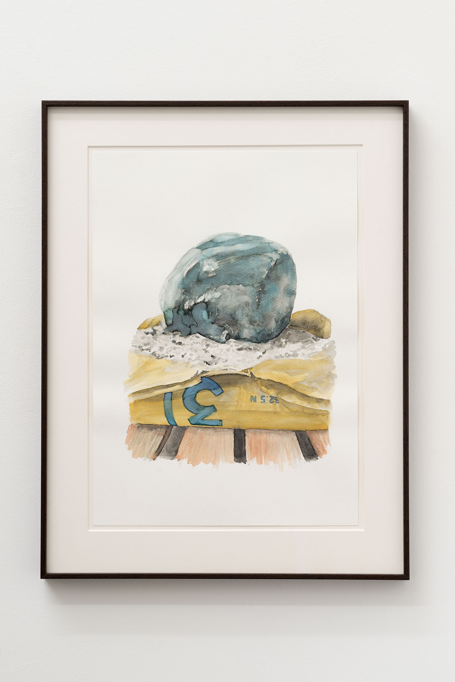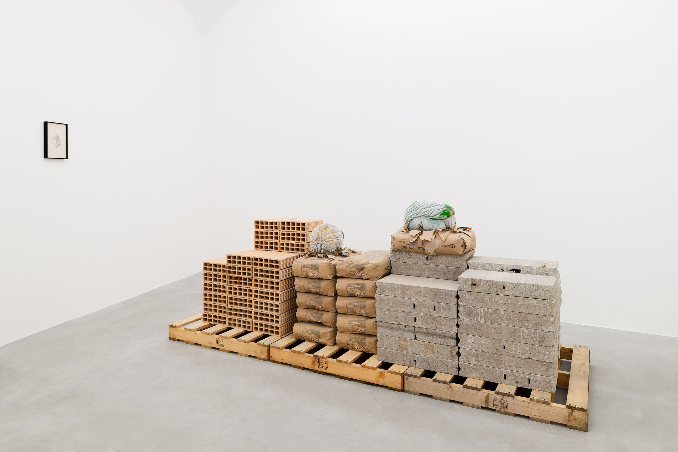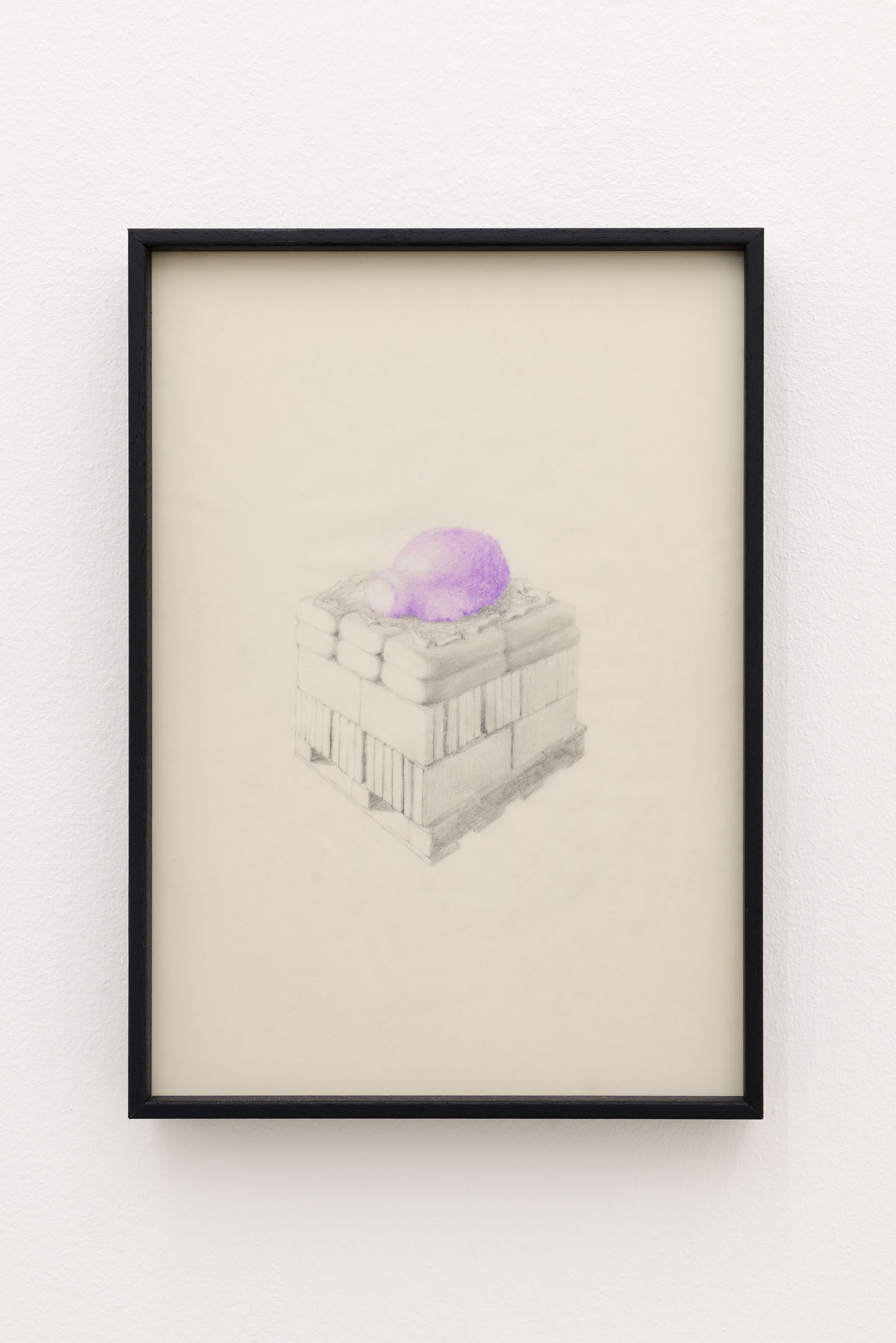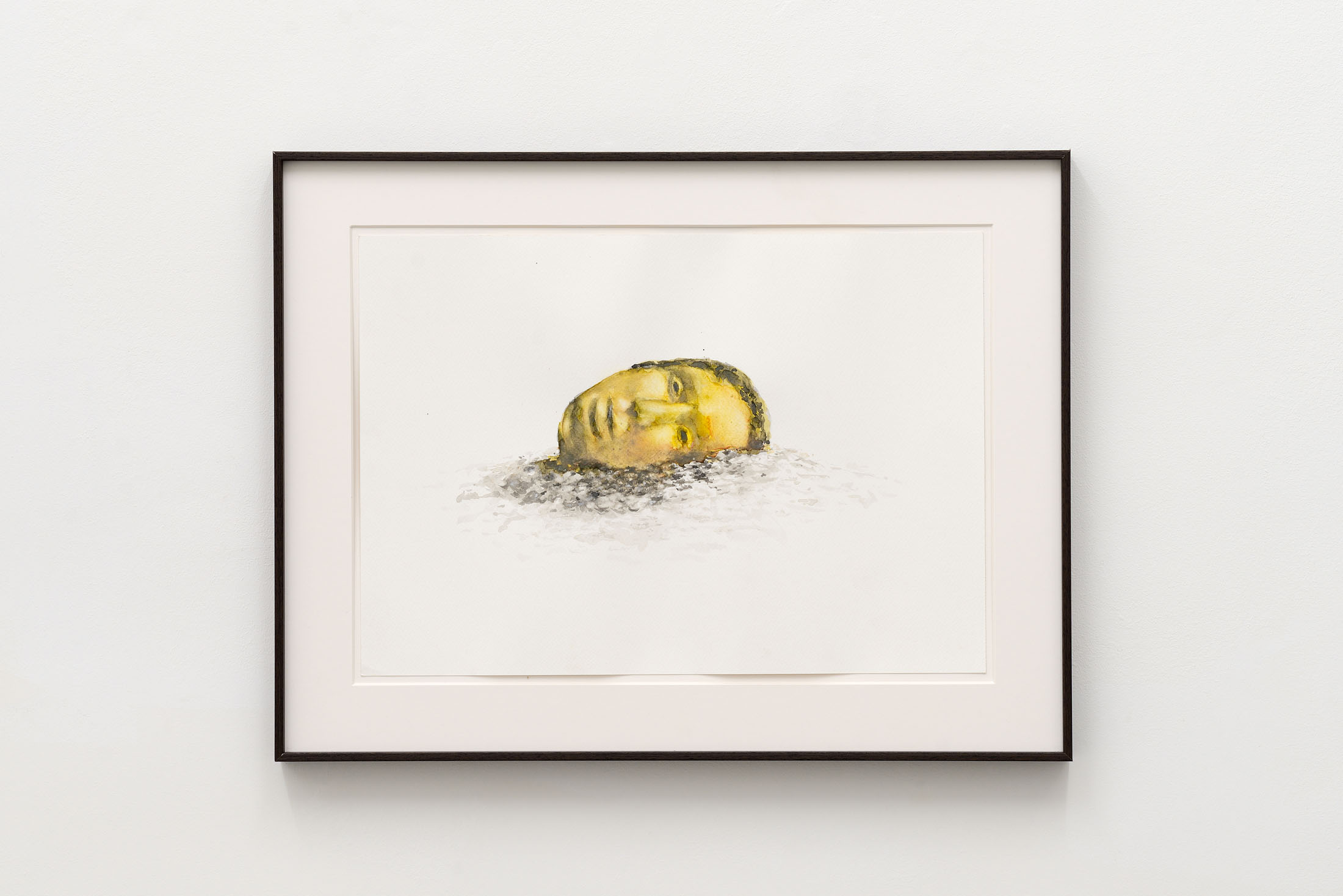 Polychrome sculptures composed of frozen water, oxides, and pigments depict imaginary figures resting atop towers of stacked materials, waiting to become architecture: suspended visions that emerge from the artist’s autobiographical imagination. As these ice busts rapidly melt, they soak the cement dust beneath, which reacts by solidifying into stone – a sedimentary fossil in the making, preserving the features of the face that once rested upon it. The result is a cascading morphology in which the sculpture forms from within, staining, excavating, and hardening matter layer by layer. This is a process that partly eludes the artist’s control, where fullness and void, solid and ephemeral matter, artifact and natural phenomenon, ancient and contemporary coexist.