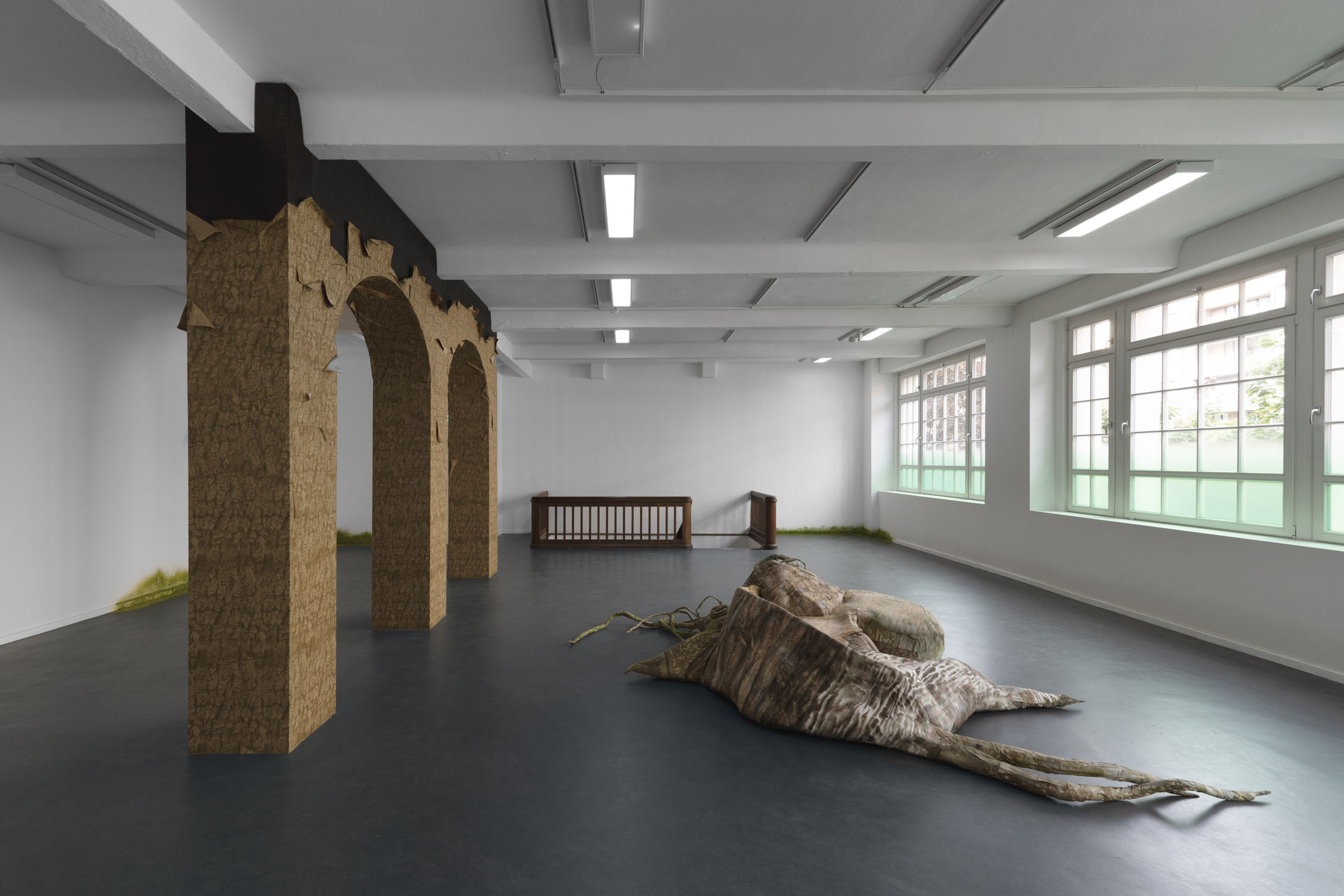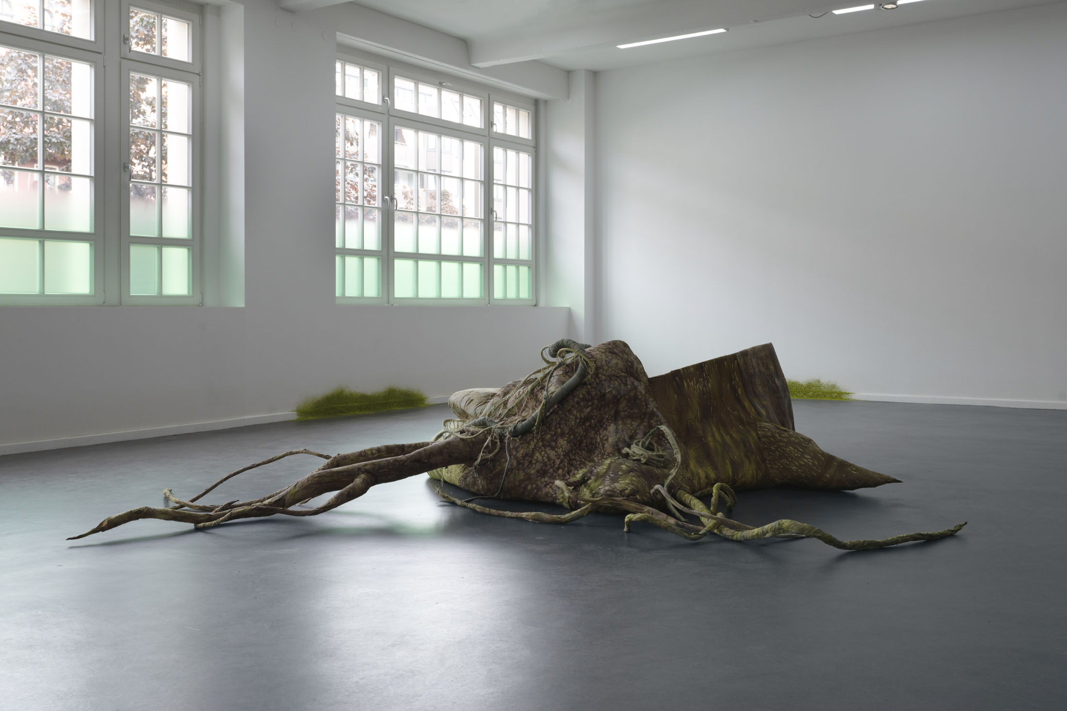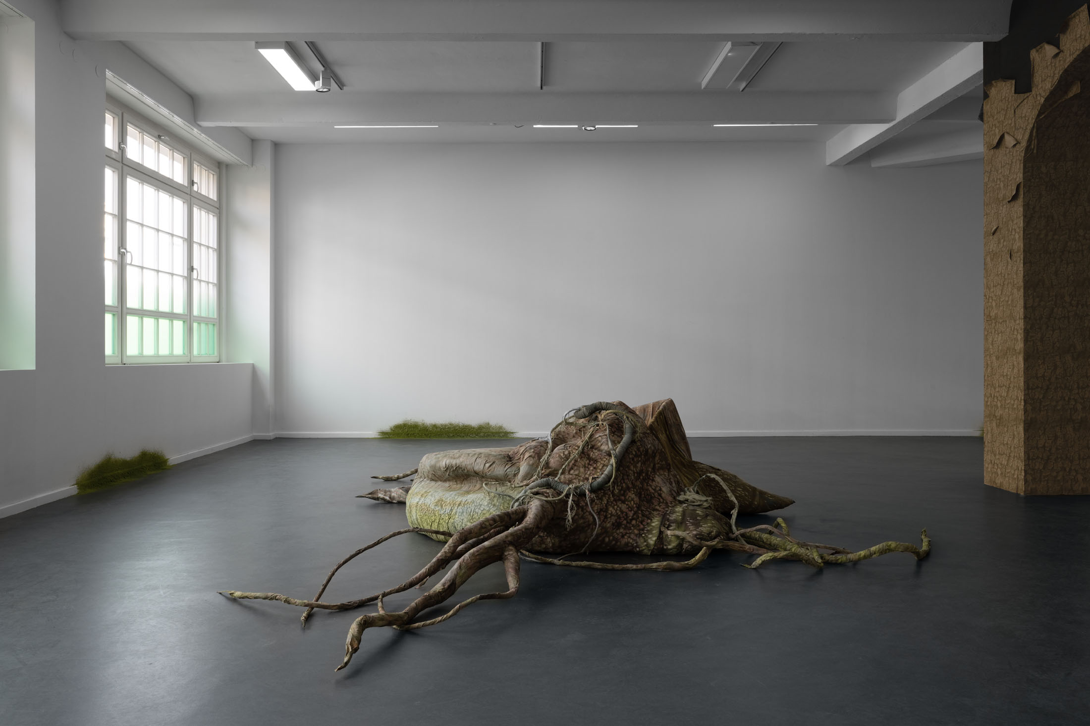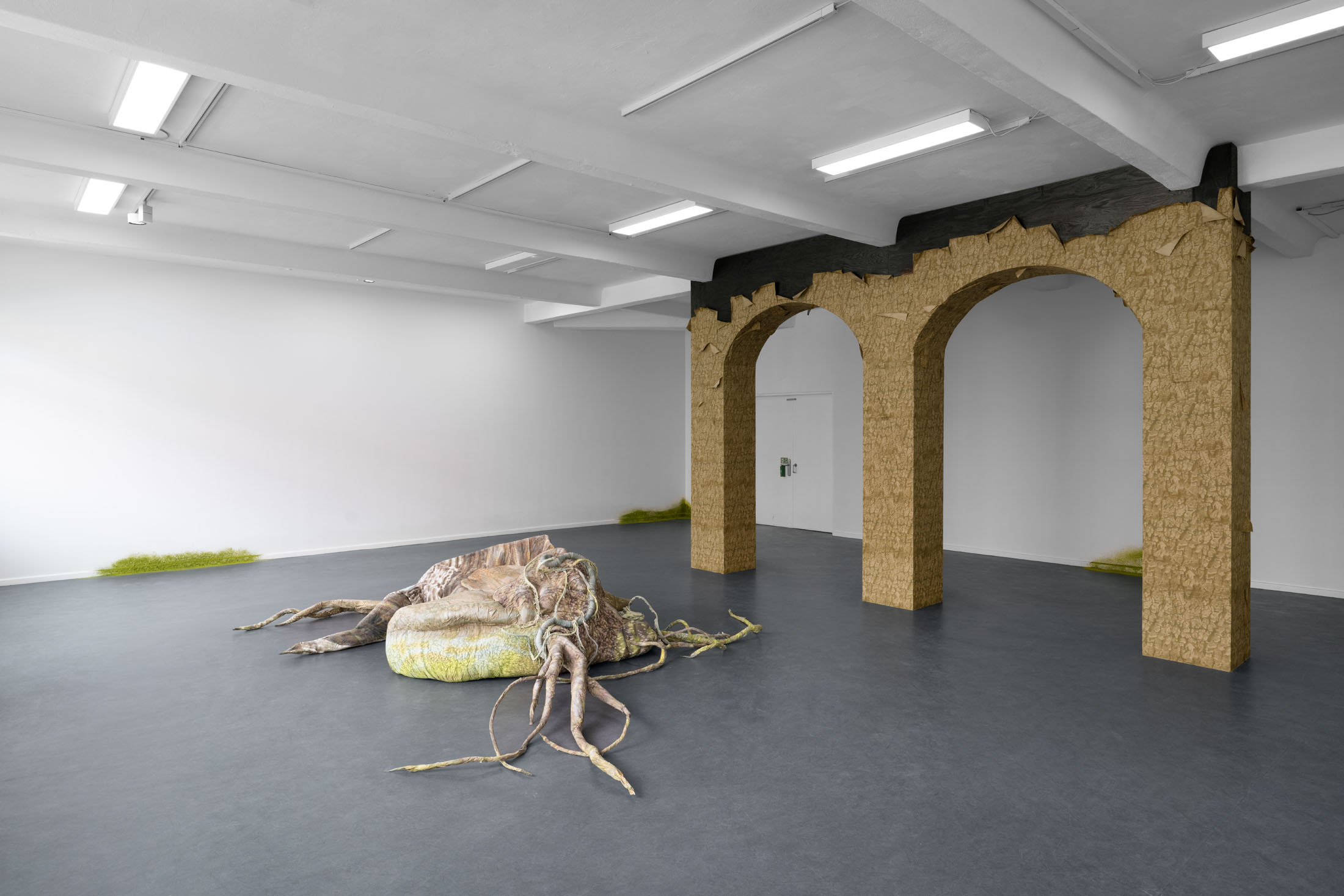 A massive, sprawling arch structure forms the centerpiece of the installation. Its scorch marks evoke industrial production processes, while its form conjures romantic associations with an idealized natural landscape. But this illusion crumbles: a large, tree-like sculpture lies uprooted on the ground, symbolizing the tension between natural growth and human intervention. On the walls, algae growth appears to rise—a painterly extension of the practice, oscillating between control and chance. The windows are coated with a greenish film that distorts the view of the outside world, as if a veil has been placed over perception. Architectural elements of the space are deliberately integrated to challenge the boundaries between the interior and exterior. By using materials in various stages of decay, the artist makes the constant transition between growth and decomposition visible.