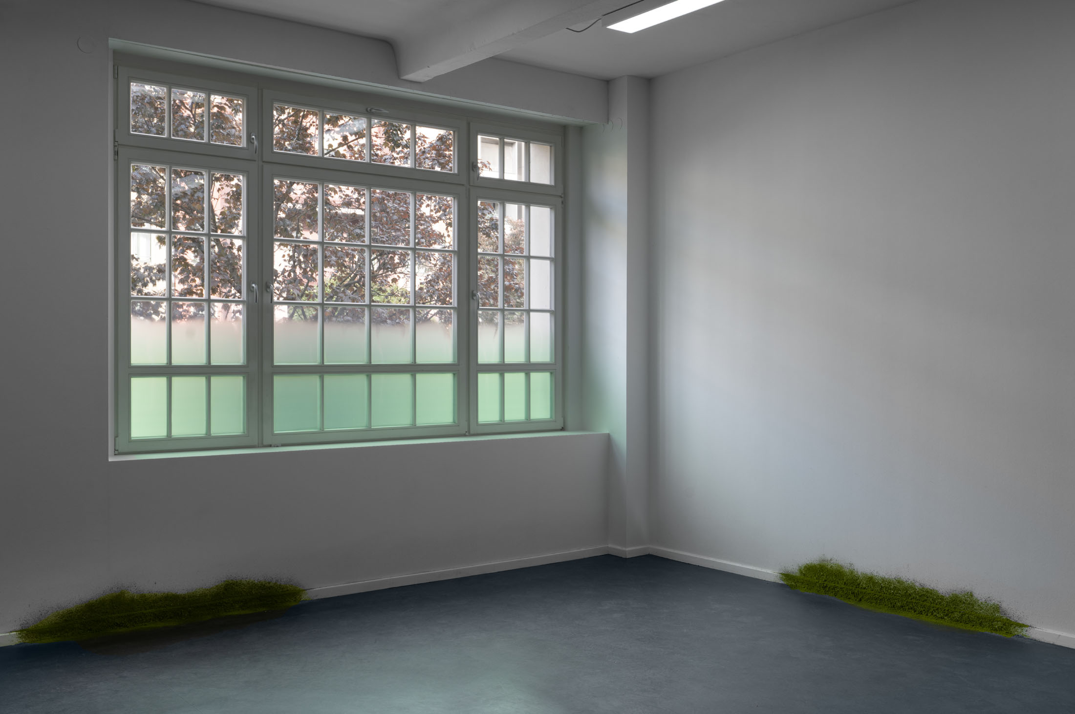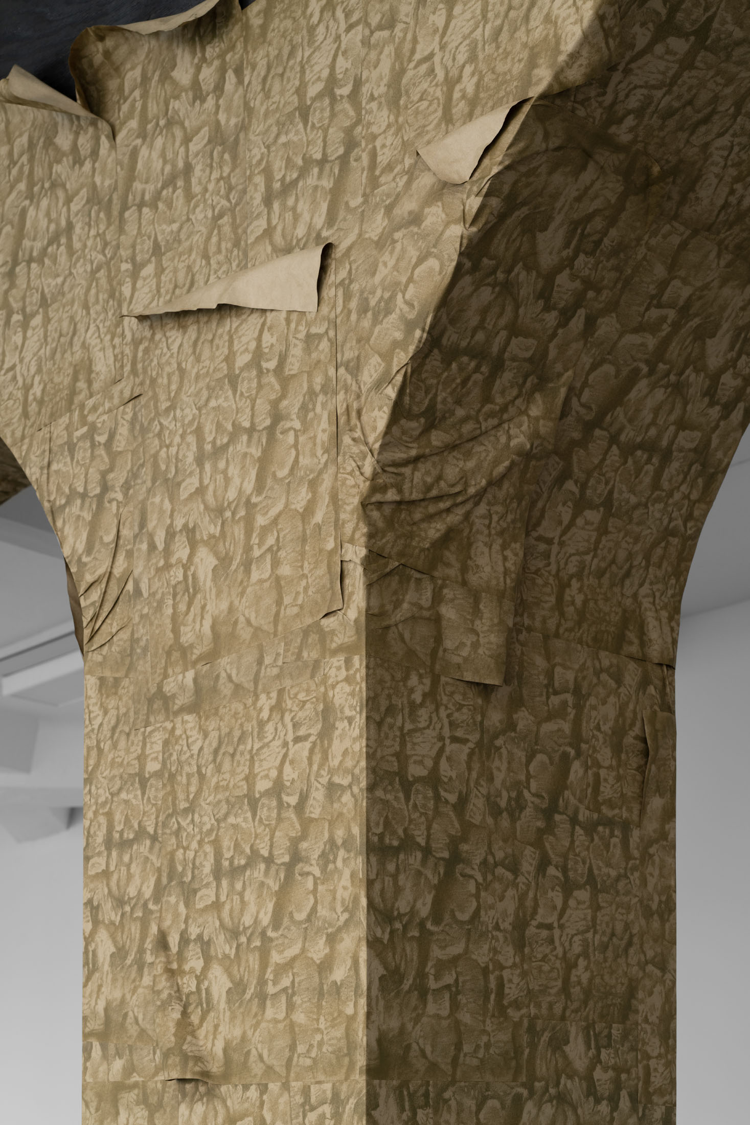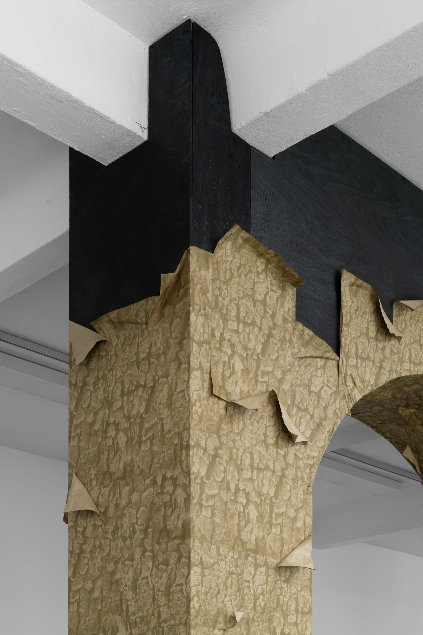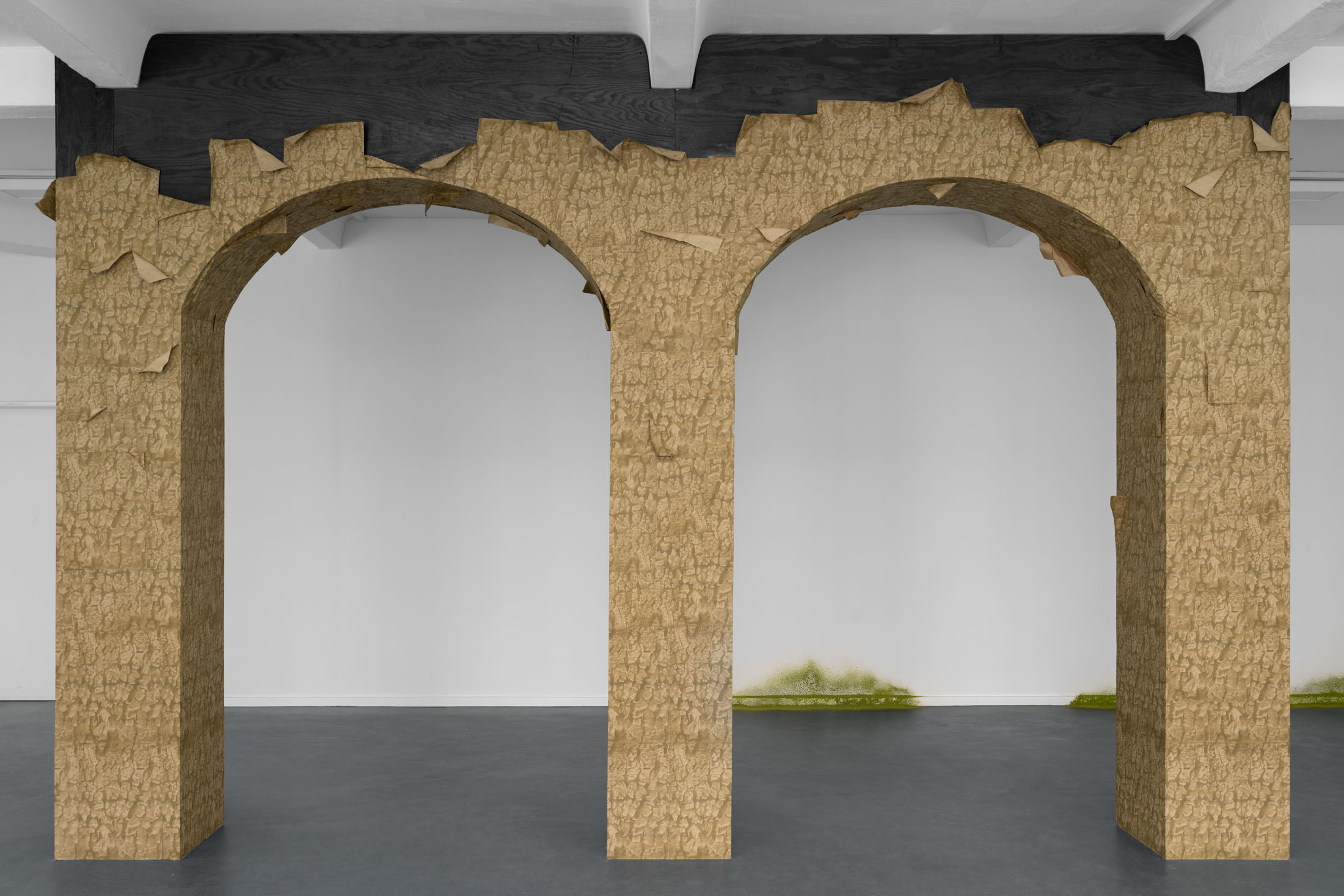 A massive, sprawling arch structure forms the centerpiece of the installation. Its scorch marks evoke industrial production processes, while its form conjures romantic associations with an idealized natural landscape. But this illusion crumbles: a large, tree-like sculpture lies uprooted on the ground, symbolizing the tension between natural growth and human intervention. On the walls, algae growth appears to rise—a painterly extension of the practice, oscillating between control and chance. The windows are coated with a greenish film that distorts the view of the outside world, as if a veil has been placed over perception. Architectural elements of the space are deliberately integrated to challenge the boundaries between the interior and exterior. By using materials in various stages of decay, the artist makes the constant transition between growth and decomposition visible.