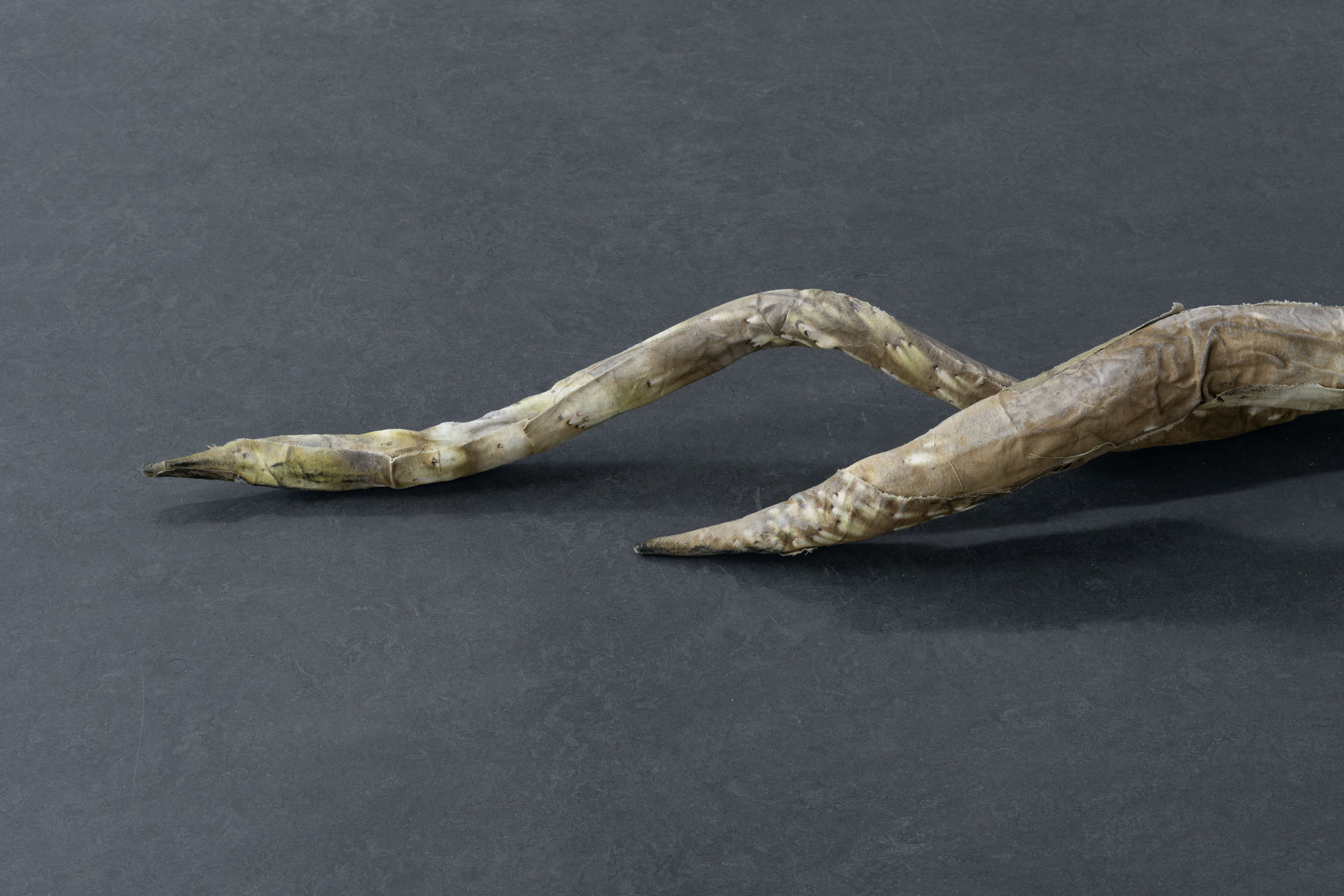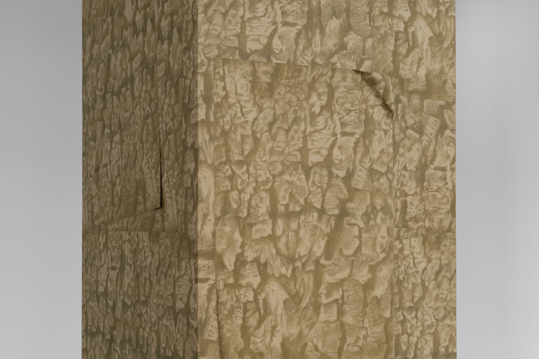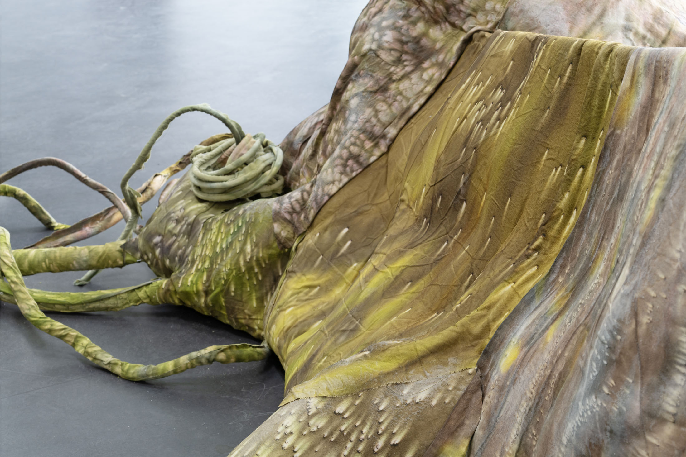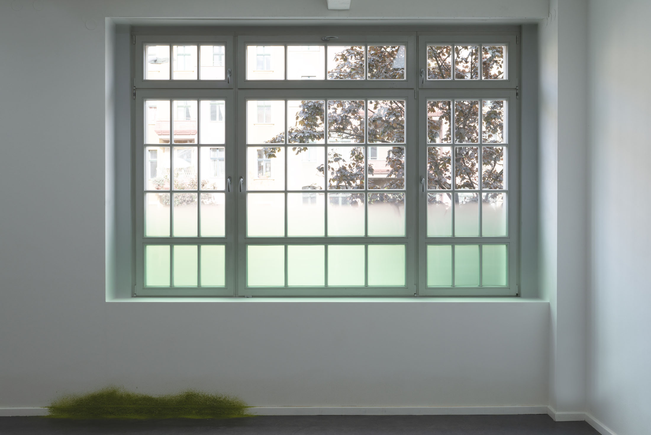 A massive, sprawling arch structure forms the centerpiece of the installation. Its scorch marks evoke industrial production processes, while its form conjures romantic associations with an idealized natural landscape. But this illusion crumbles: a large, tree-like sculpture lies uprooted on the ground, symbolizing the tension between natural growth and human intervention. On the walls, algae growth appears to rise—a painterly extension of the practice, oscillating between control and chance. The windows are coated with a greenish film that distorts the view of the outside world, as if a veil has been placed over perception. Architectural elements of the space are deliberately integrated to challenge the boundaries between the interior and exterior. By using materials in various stages of decay, the artist makes the constant transition between growth and decomposition visible.