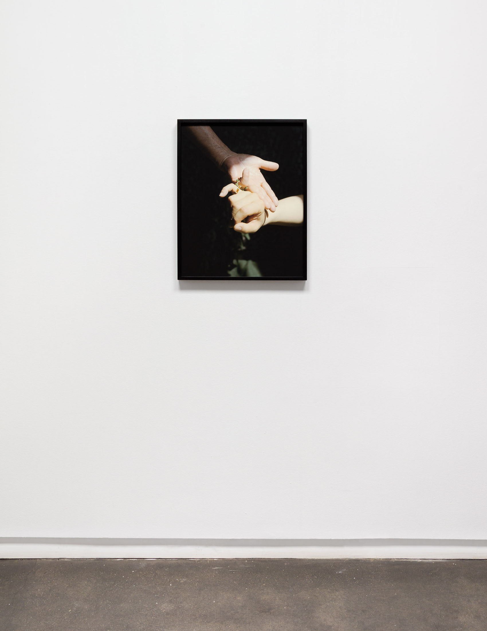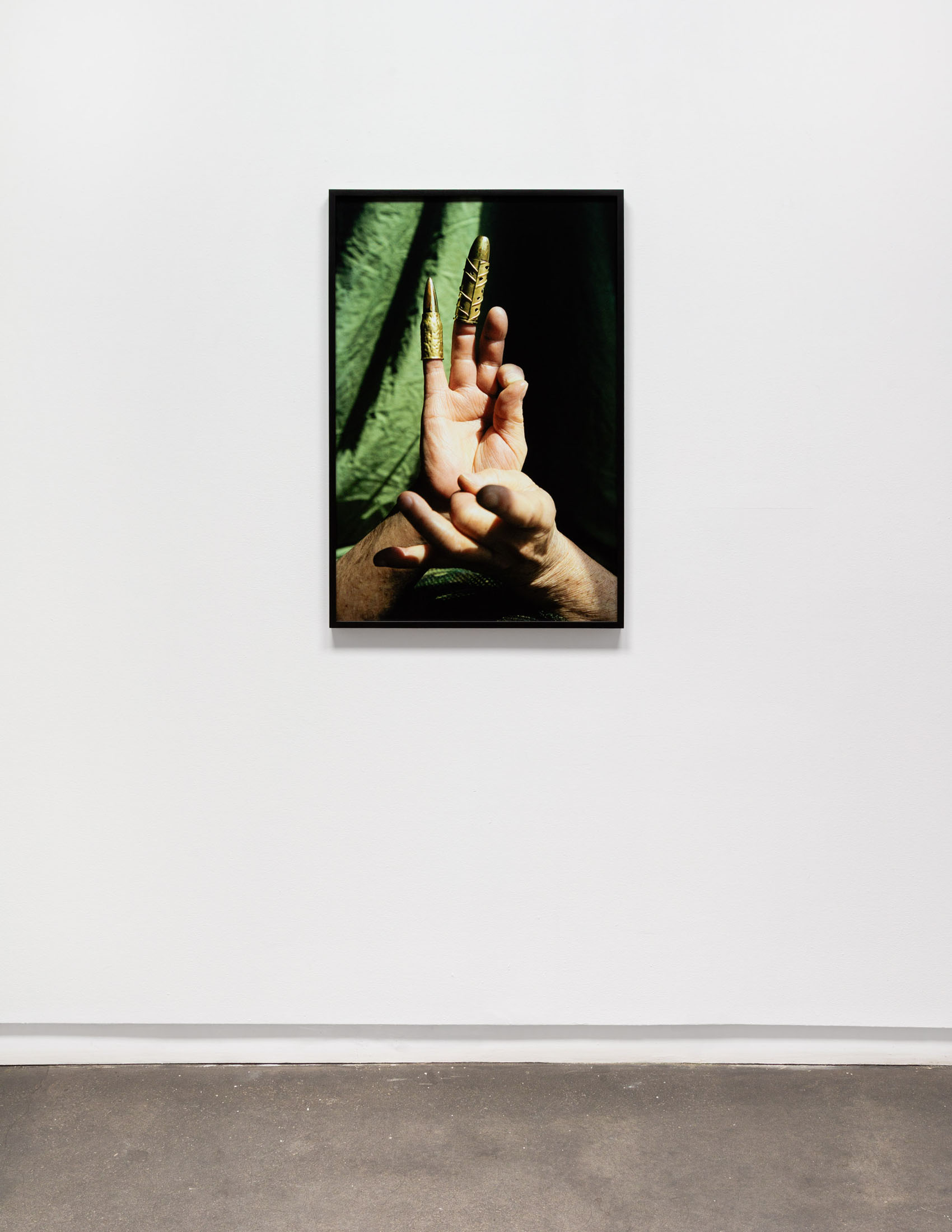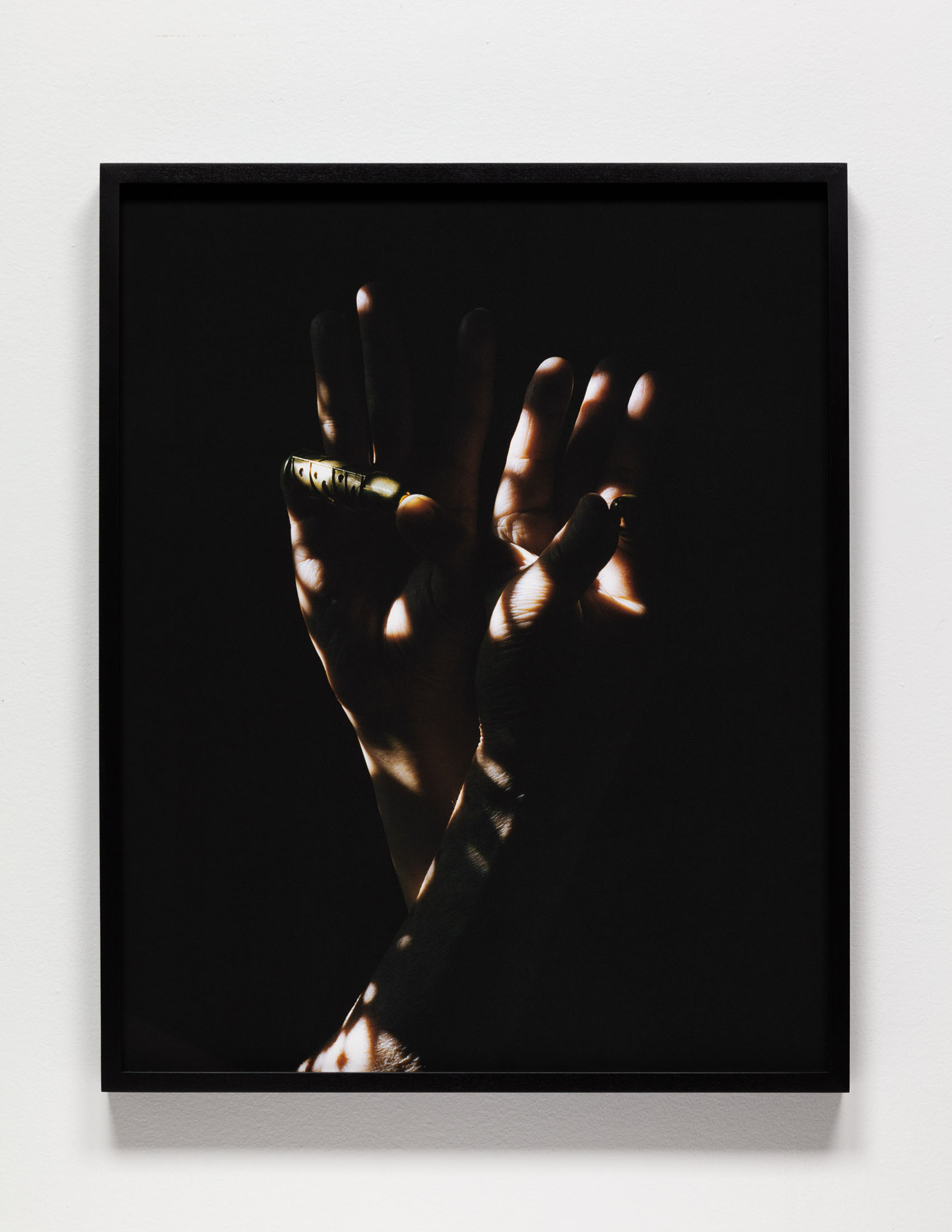 In the titular image, two bullet-shaped rings worn by Beckly’s father extend the reach of his fingers, which together form a mudra, a hand gesture symbolic within Buddhist circles. Known as the “turning of the wheel,” the tips of his thumb and index finger touch to form a circle, signifying the ongoing process of living and learning, as well as the cyclical nature of existence. In 62156227, Beckly wears a jade ring with his father’s military number embossed in brass, his index finger pointing to the same mudra, but in the form of a tattoo on the artist’s left arm. Hidden Power features Beckly’ and his father’s hands adorned with long brass rings inset with jade stones, which glint in the sunlight. Their hands are outstretched, joining together to perform a mudra named after the lotus flower, a symbol of awakening and open-heartedness. Visible on Beckly’s arm are two tattooed circles, a reference to Felix Gonzalez-Torres’ Untitled (Perfect Lovers) (1987-1990). Two hands joined, two circles meeting, two clocks ticking… These photographs remind us not only of the bonds between child and parent, but of any two people in relation, in love, in loss.