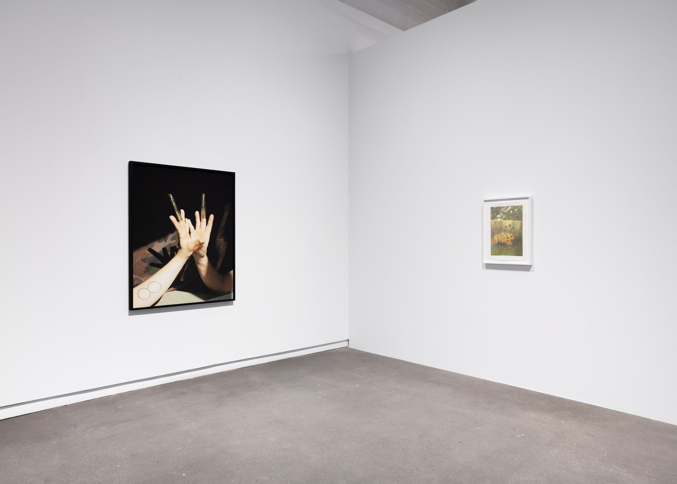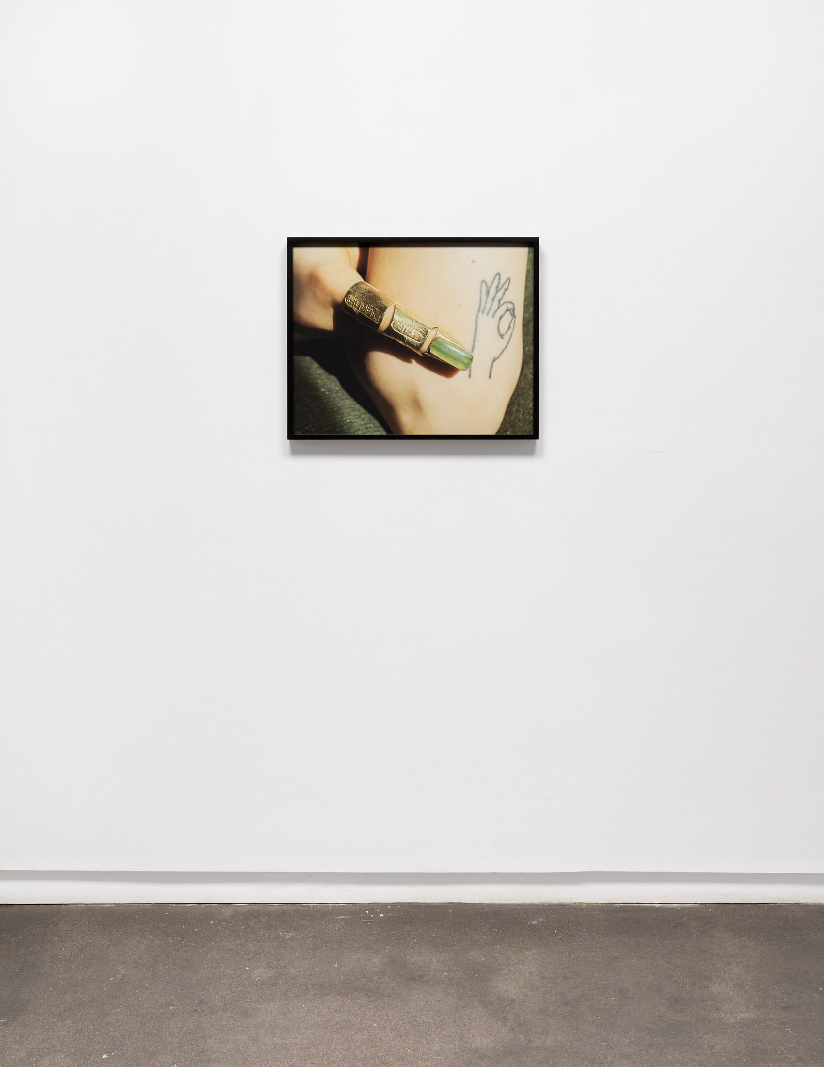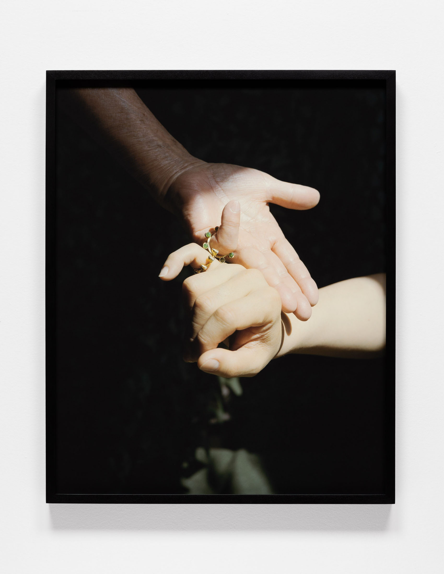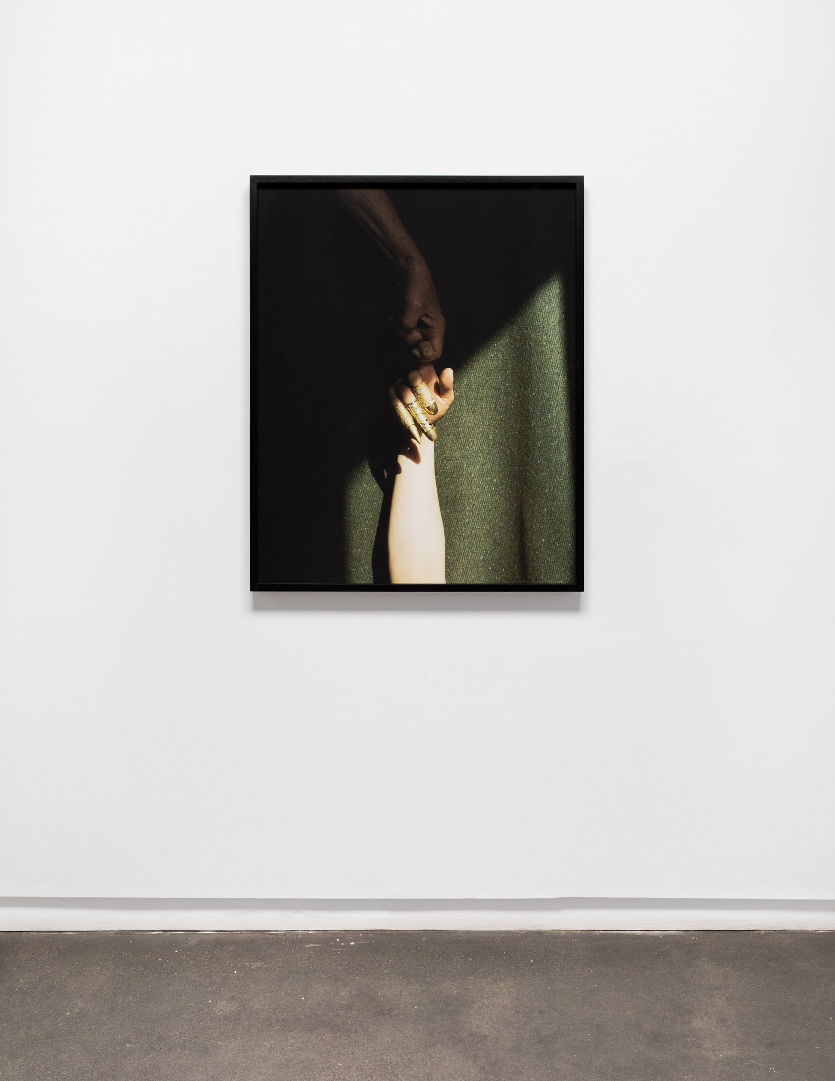 In the titular image, two bullet-shaped rings worn by Beckly’s father extend the reach of his fingers, which together form a mudra, a hand gesture symbolic within Buddhist circles. Known as the “turning of the wheel,” the tips of his thumb and index finger touch to form a circle, signifying the ongoing process of living and learning, as well as the cyclical nature of existence. In 62156227, Beckly wears a jade ring with his father’s military number embossed in brass, his index finger pointing to the same mudra, but in the form of a tattoo on the artist’s left arm. Hidden Power features Beckly’ and his father’s hands adorned with long brass rings inset with jade stones, which glint in the sunlight. Their hands are outstretched, joining together to perform a mudra named after the lotus flower, a symbol of awakening and open-heartedness. Visible on Beckly’s arm are two tattooed circles, a reference to Felix Gonzalez-Torres’ Untitled (Perfect Lovers) (1987-1990). Two hands joined, two circles meeting, two clocks ticking… These photographs remind us not only of the bonds between child and parent, but of any two people in relation, in love, in loss.