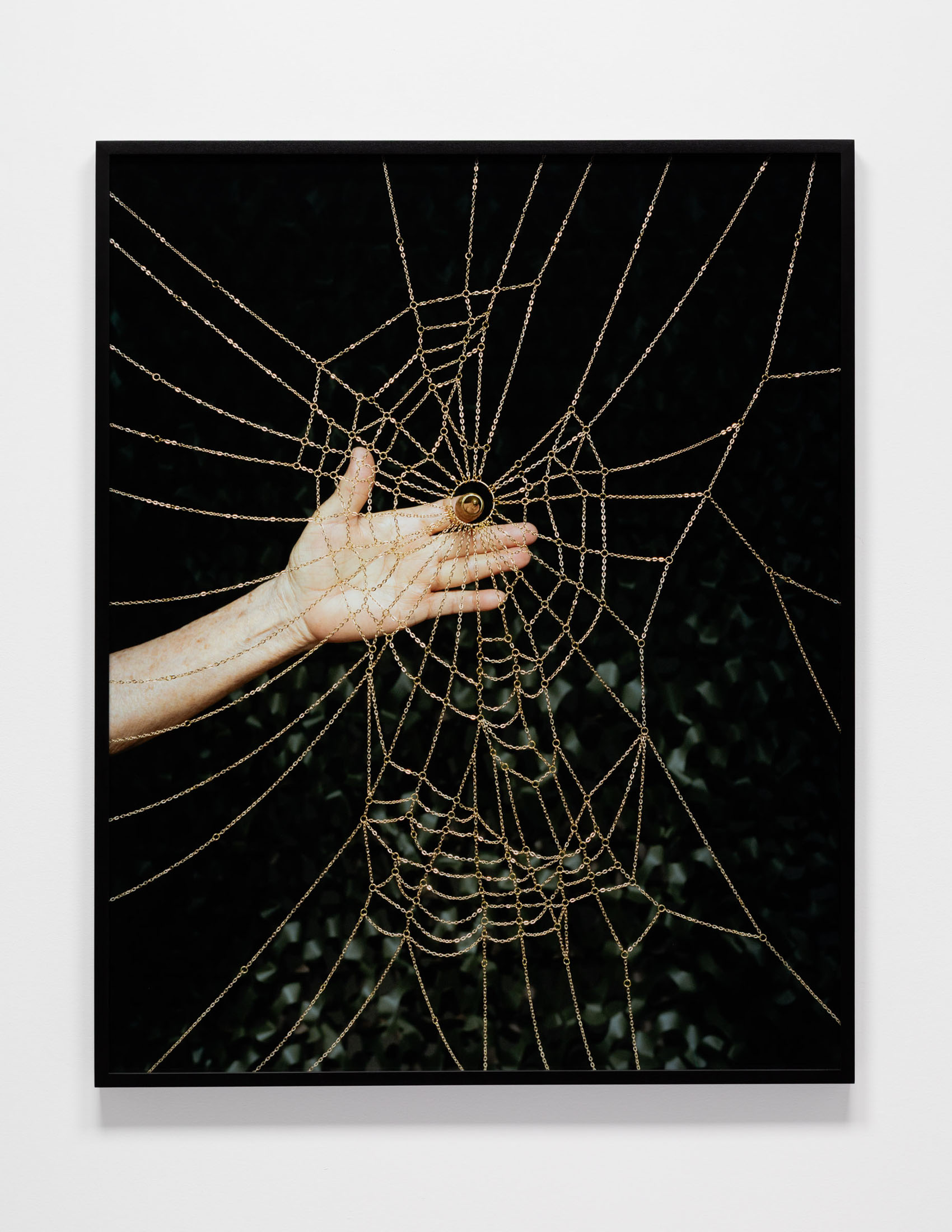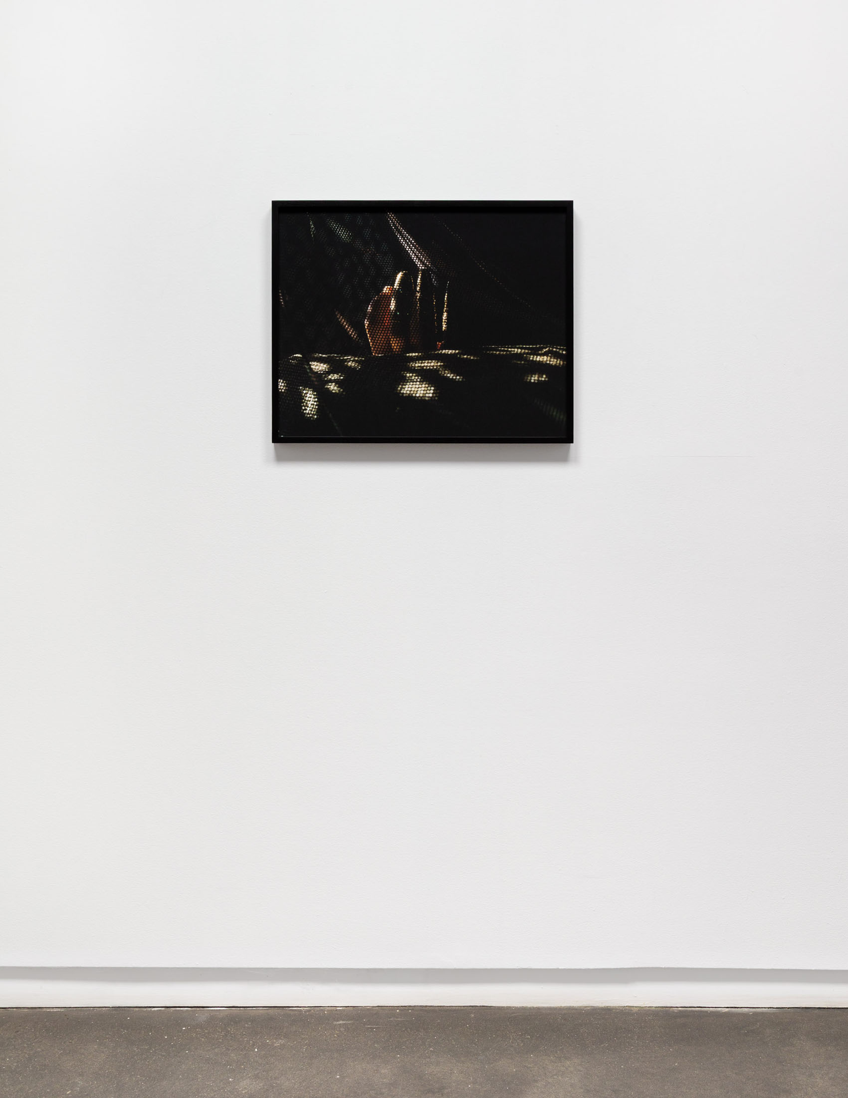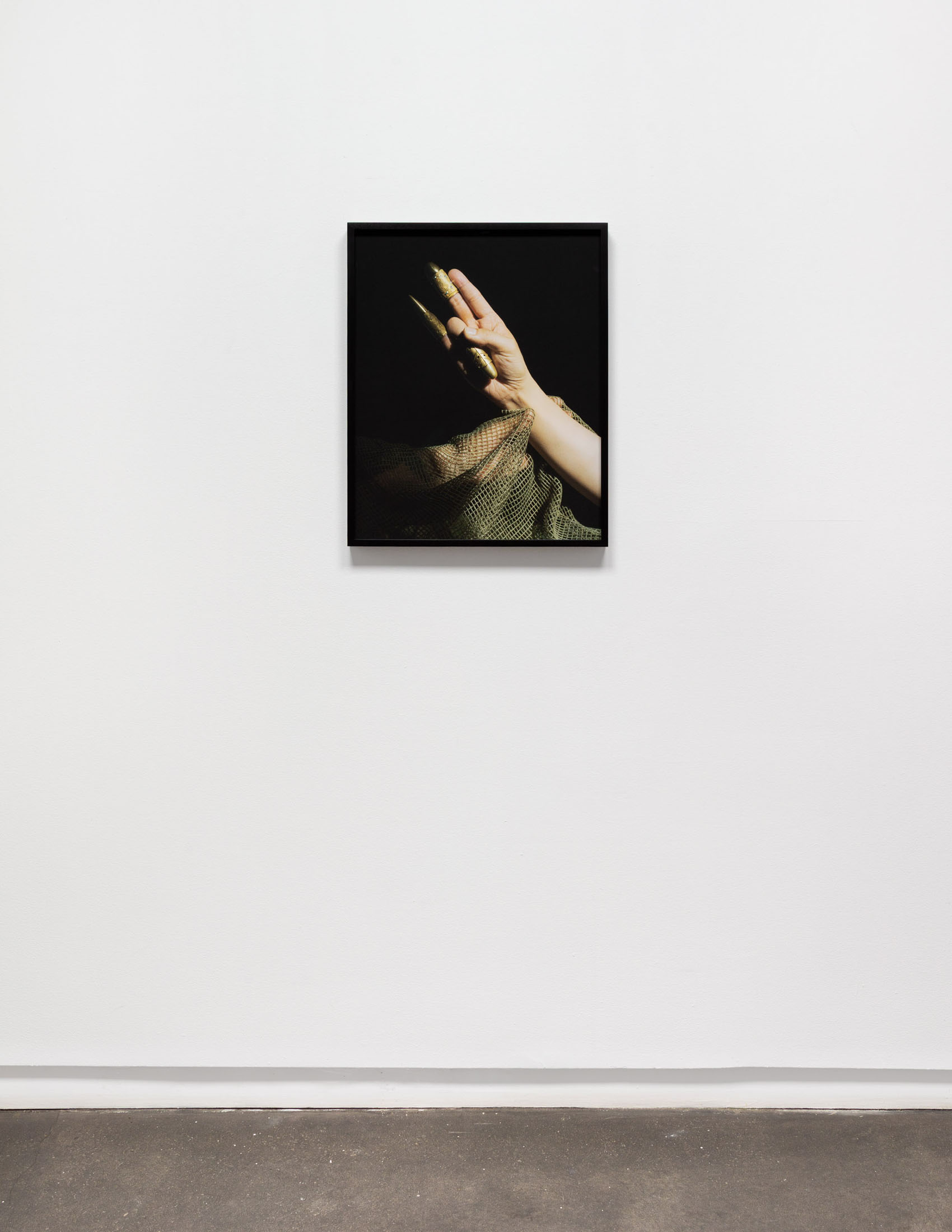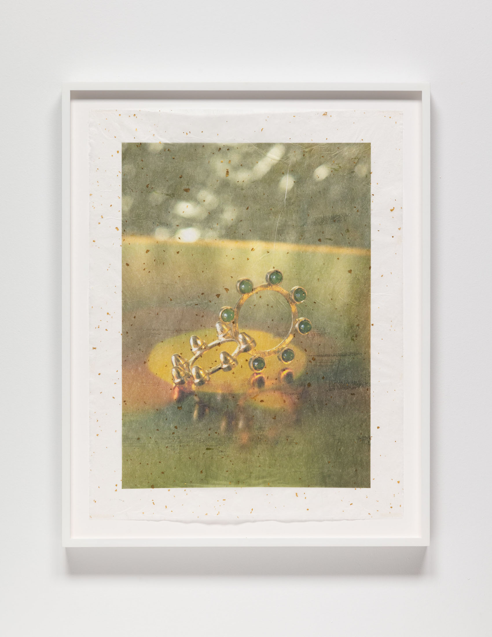 In Beckly’s photographic practice he expands and manipulates the medium by printing on materials such as tissue, handmade paper, plastic, or foil, many of which bend, distort, and sometimes fold the image. He often involves jewelry-like fixtures—chains, pins, gems, or shells— which fasten his work to the walls or hang in front of it like a veil. In Handy Work this process is reversed: the sculptural adornments appearing within, rather than outside of, the photographs.