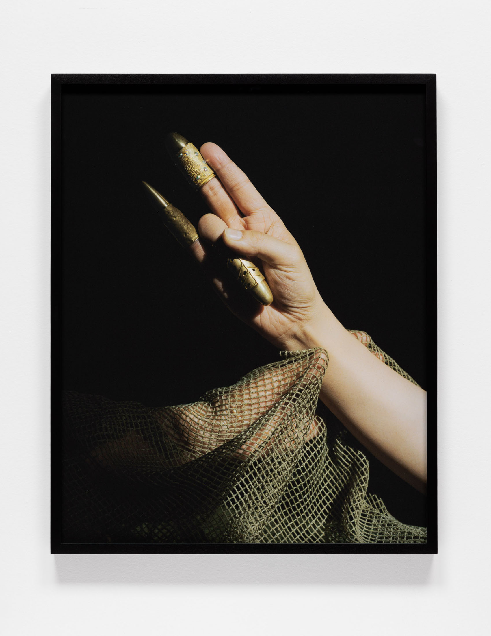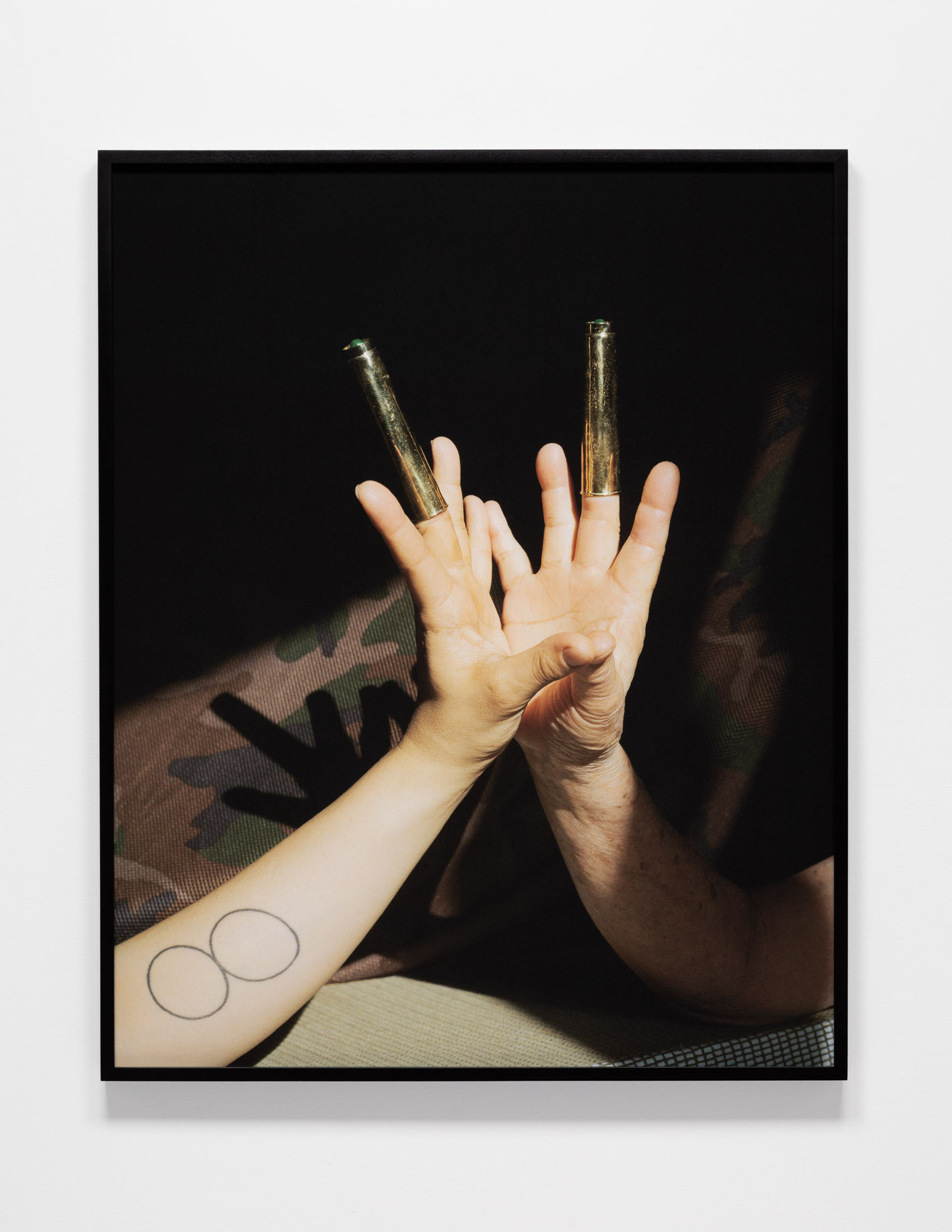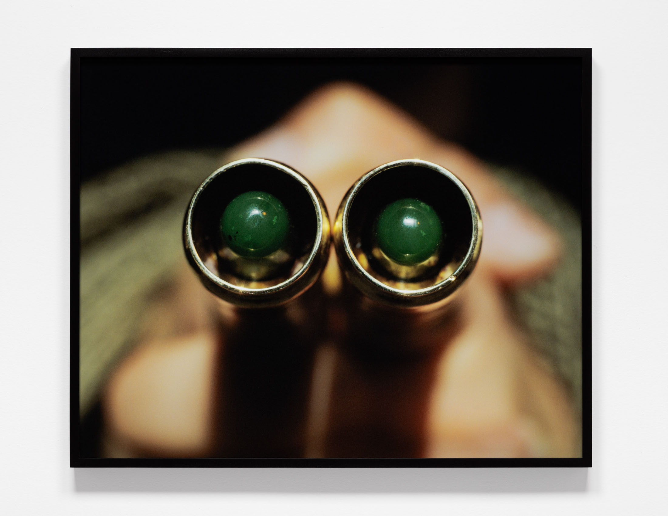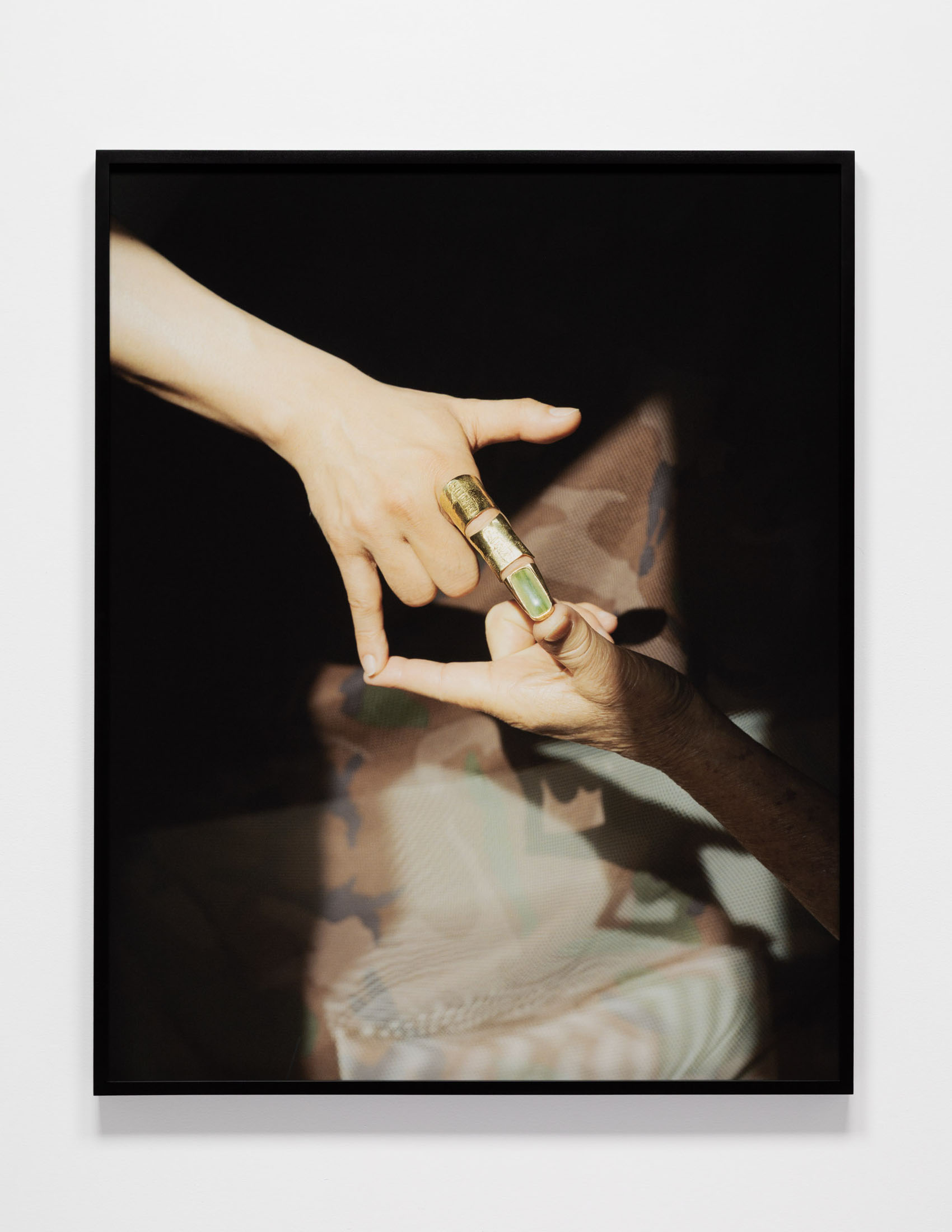 The photographs in Handy Work emerge from a collaborative process between Beckly and his father, a Chinese-Canadian war veteran. Based on conversations between the two about his father’s time as a weapons technician during the Vietnam War, Beckly worked with a local jewelry designer to fashion a series of unique rings referencing the shapes of bullets, casings, and shields, some inlaid with jade and gemstones. Their surfaces also reveal hints of the natural world: the veins of a leaf or the rippled texture of water. These are based on Beckly’s existing photographs, which have been translated into brass using 3D printing technology. Captured in chiaroscuro lighting against army-green and camouflage-patterned backdrops, the rings appear on Beckly’ and his father’s hands, as they twist and tangle in various evocative compositions.