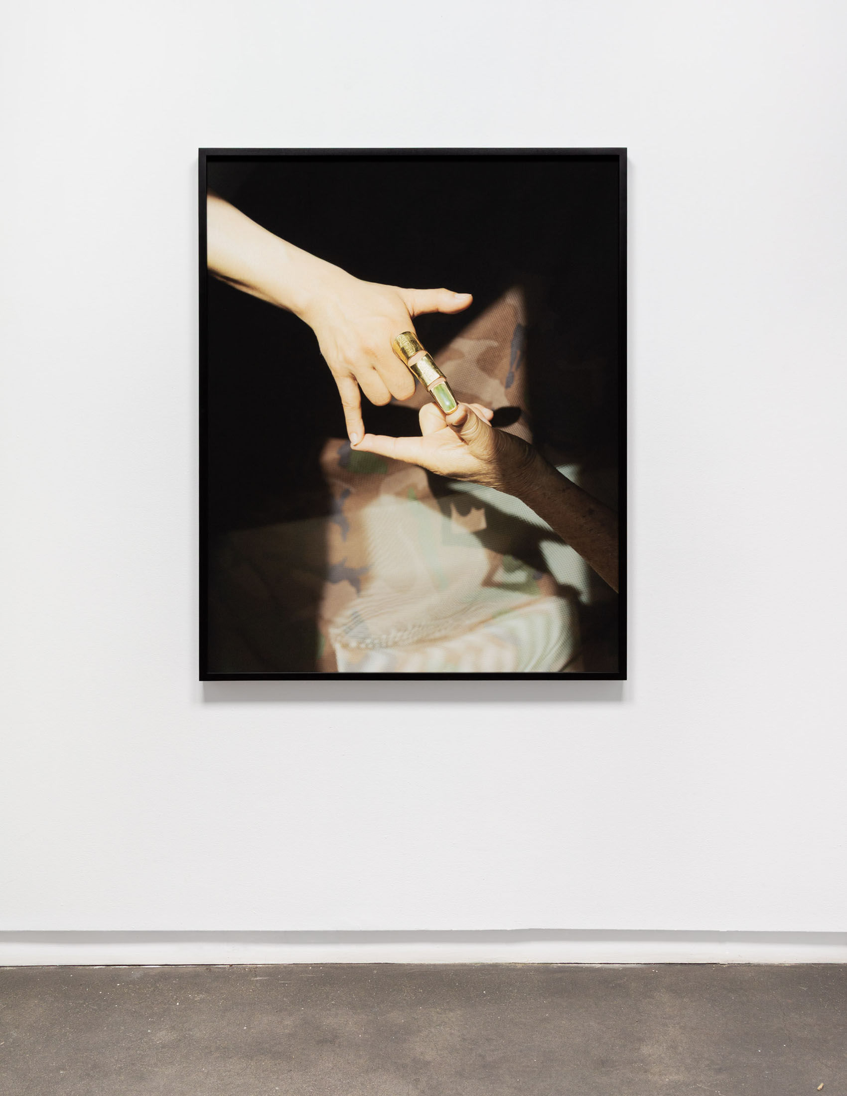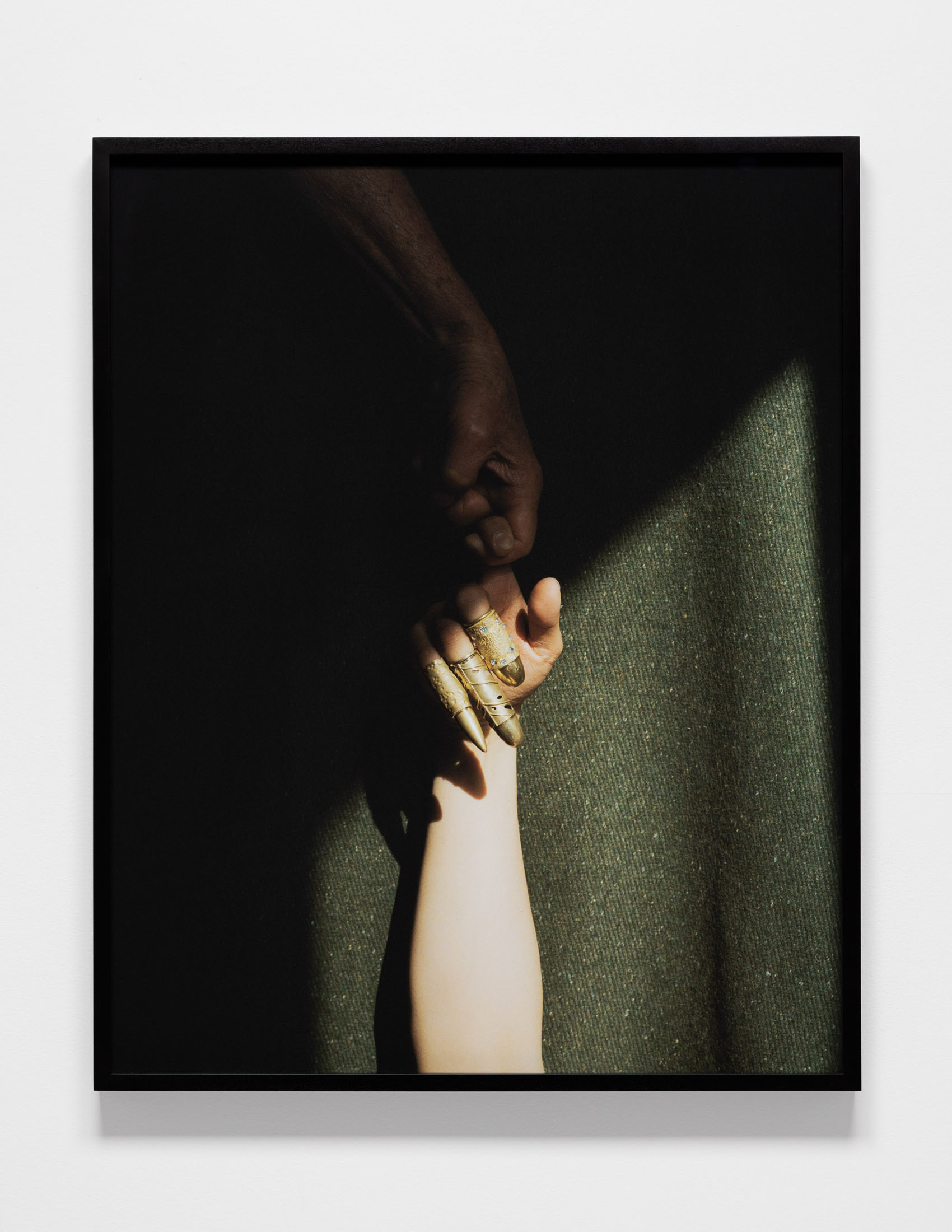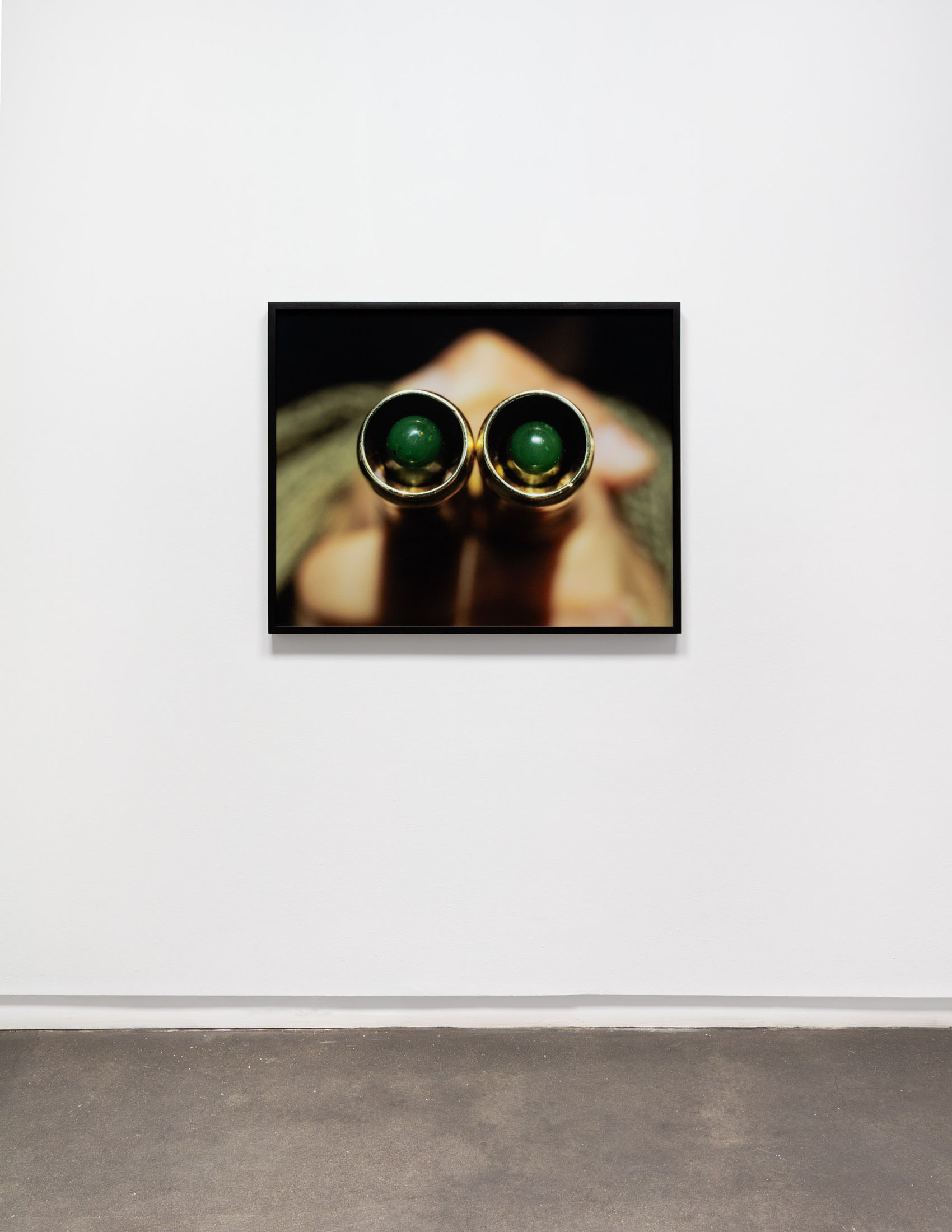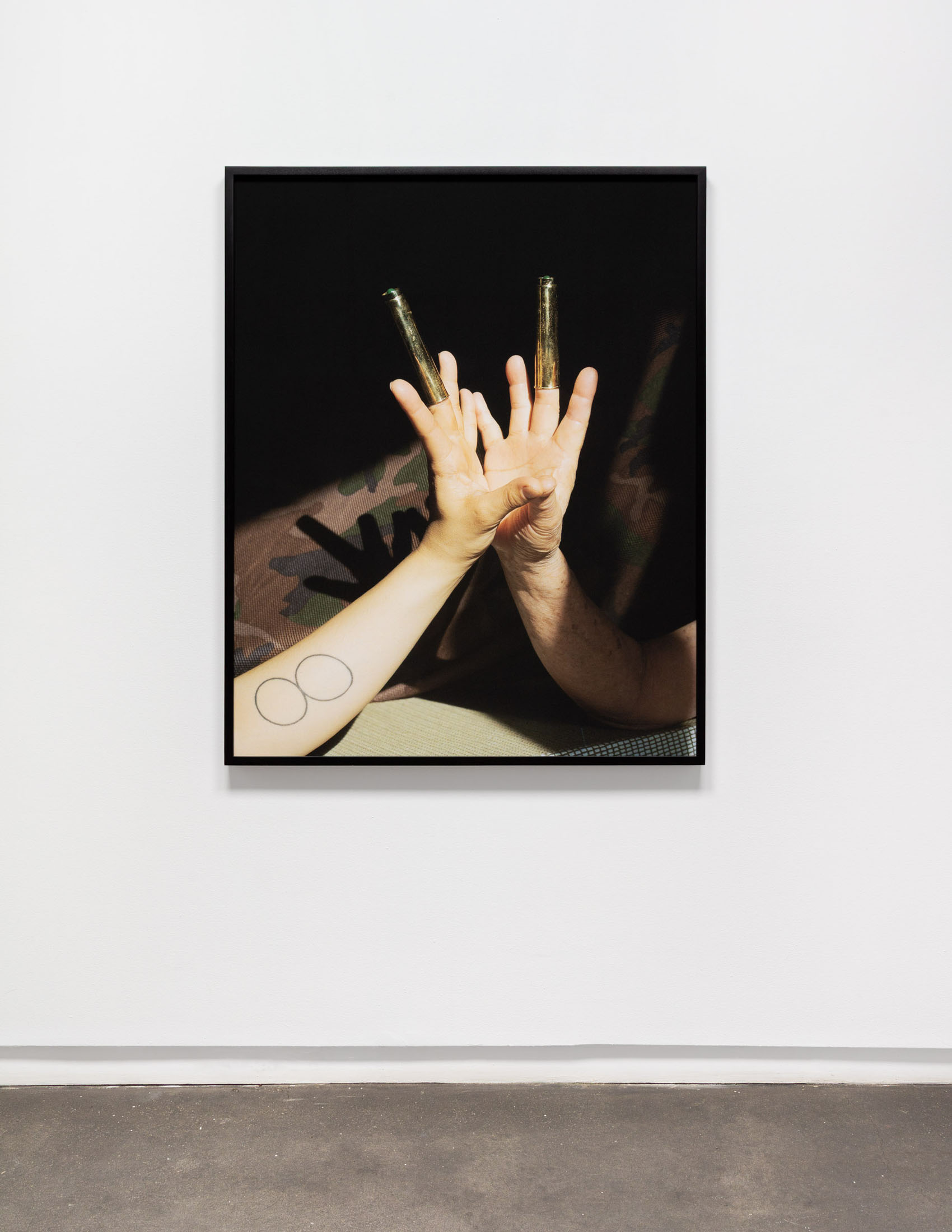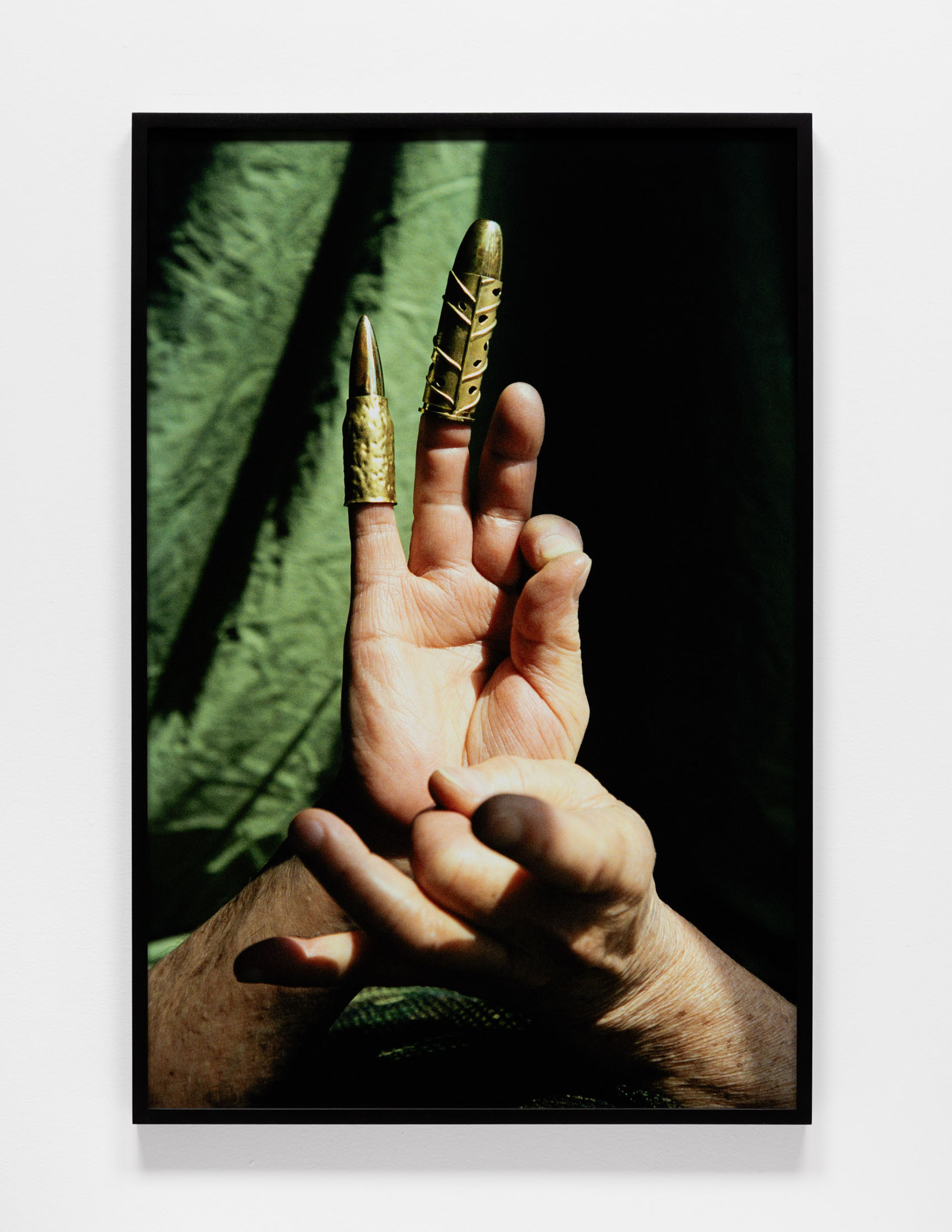 The photographs in Handy Work emerge from a collaborative process between Beckly and his father, a Chinese-Canadian war veteran. Based on conversations between the two about his father’s time as a weapons technician during the Vietnam War, Beckly worked with a local jewelry designer to fashion a series of unique rings referencing the shapes of bullets, casings, and shields, some inlaid with jade and gemstones. Their surfaces also reveal hints of the natural world: the veins of a leaf or the rippled texture of water. These are based on Beckly’s existing photographs, which have been translated into brass using 3D printing technology. Captured in chiaroscuro lighting against army-green and camouflage-patterned backdrops, the rings appear on Beckly’ and his father’s hands, as they twist and tangle in various evocative compositions.