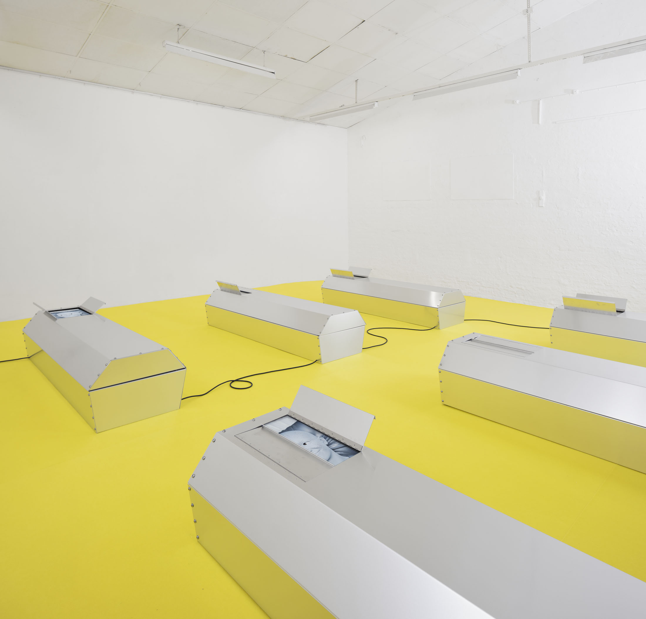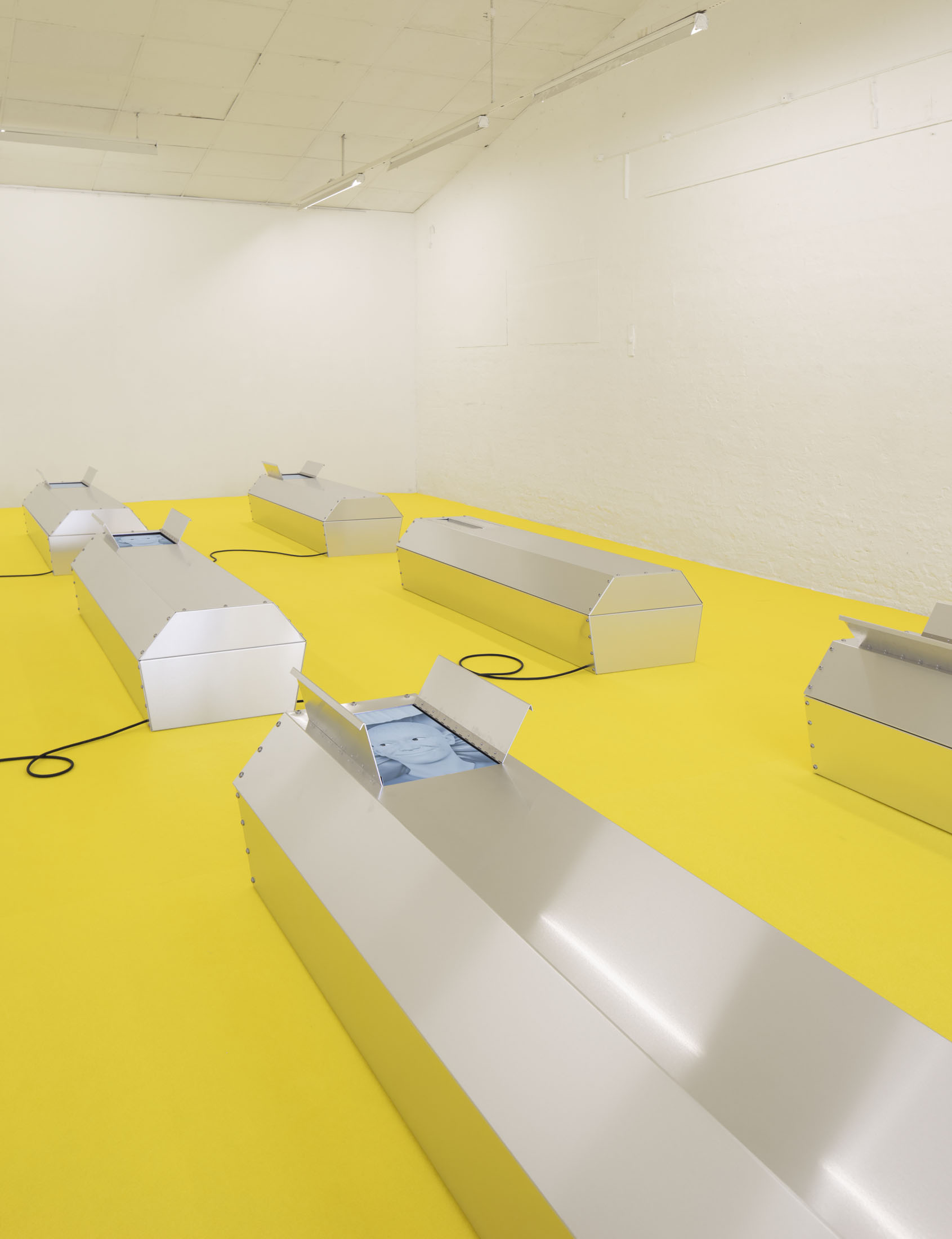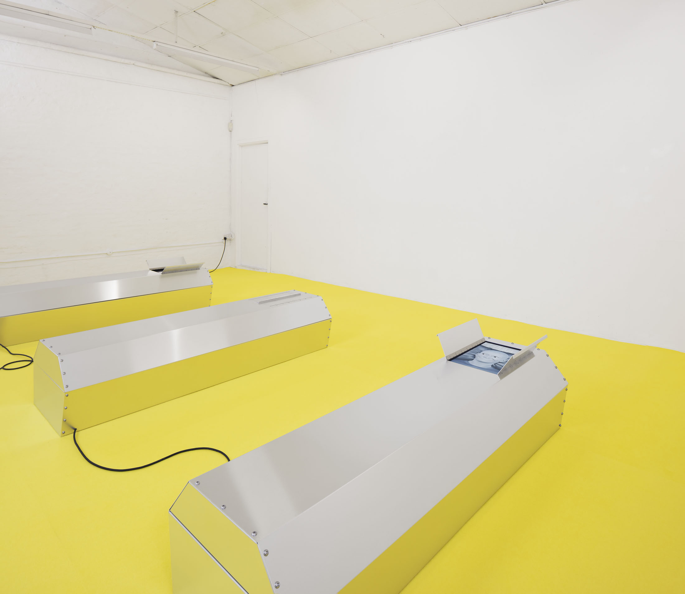 Take off your shoes but keep your socks on before stepping onto the carpet and moving towards the coffins. You are about to enter a simulated sacred space.