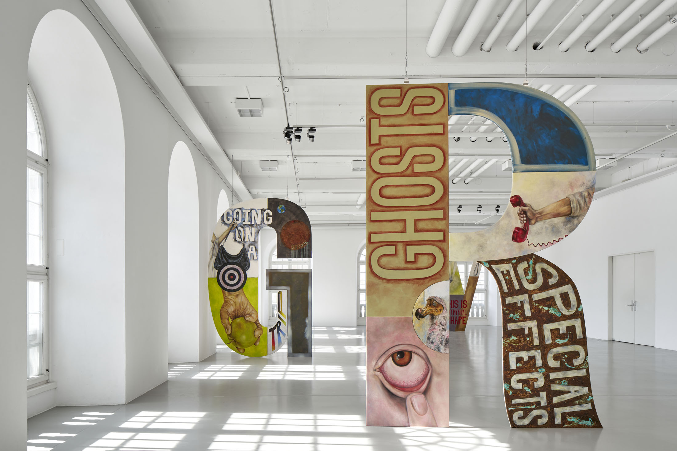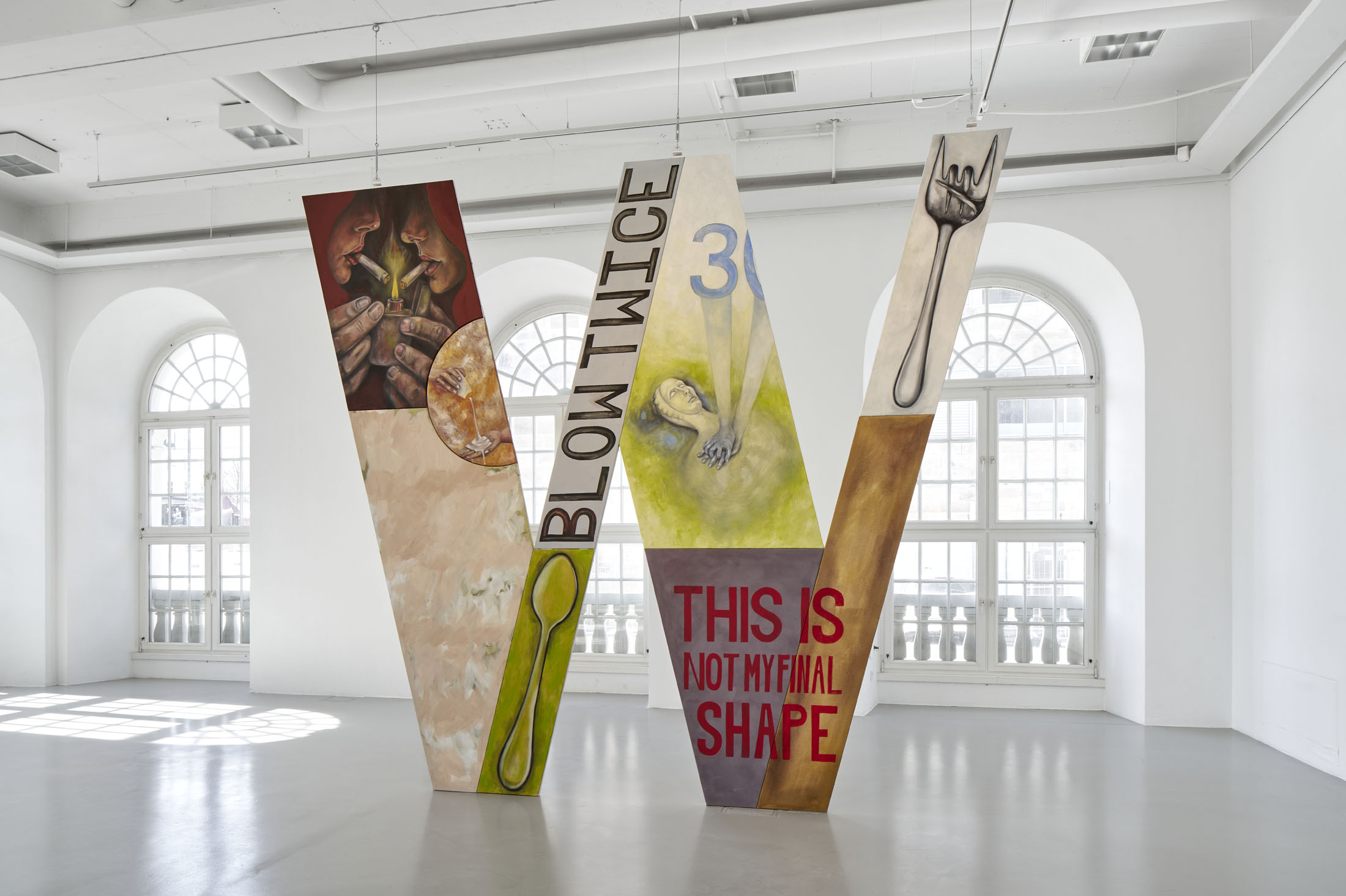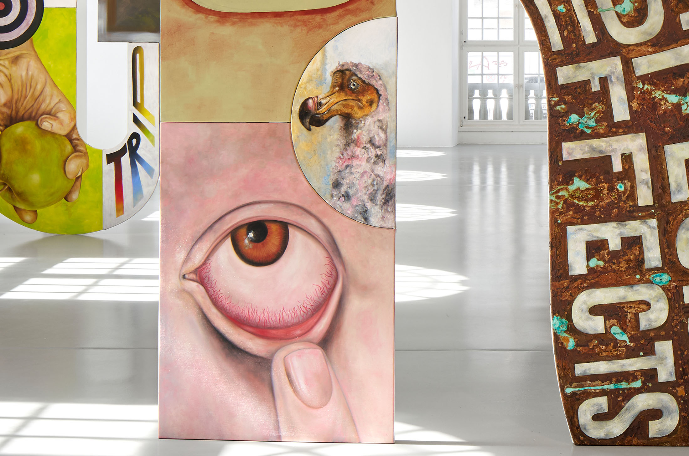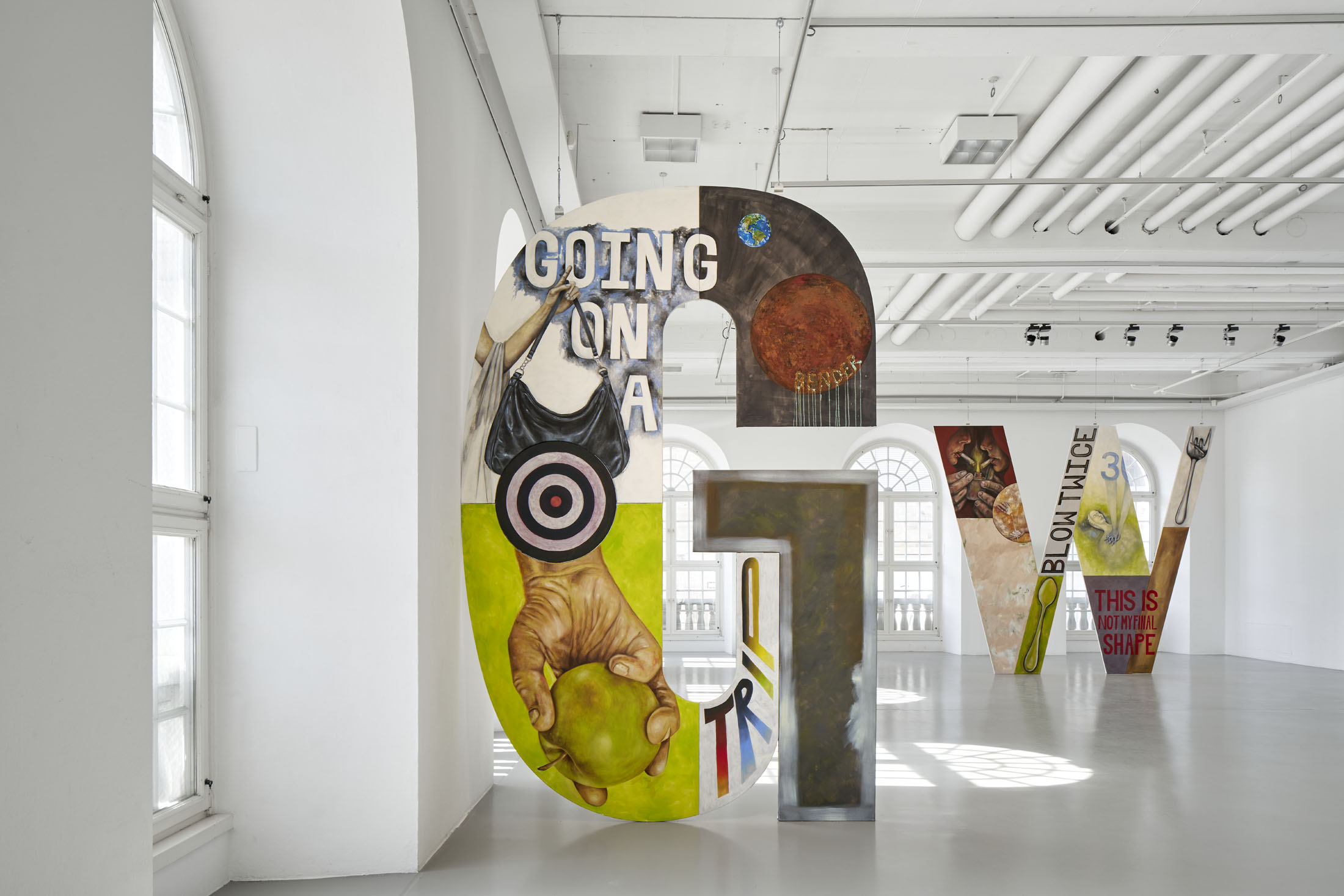 In the Kasseler Kunstverein, Tanja Nis-Hansen presents these four letters suspended in mid-air as paintings, or rather amalgamations of numerous paintings that come together like a puzzle to form their larger whole. Thirty in total, they feature an array of subject matter of images and words that, in their particular constellations, open up readings that extend beyond the individual works.