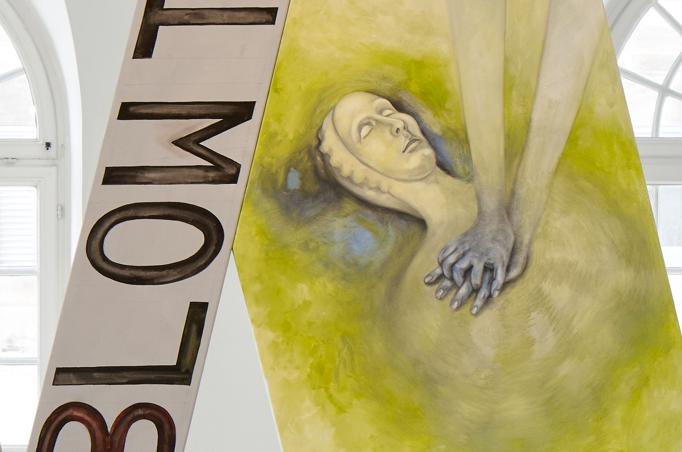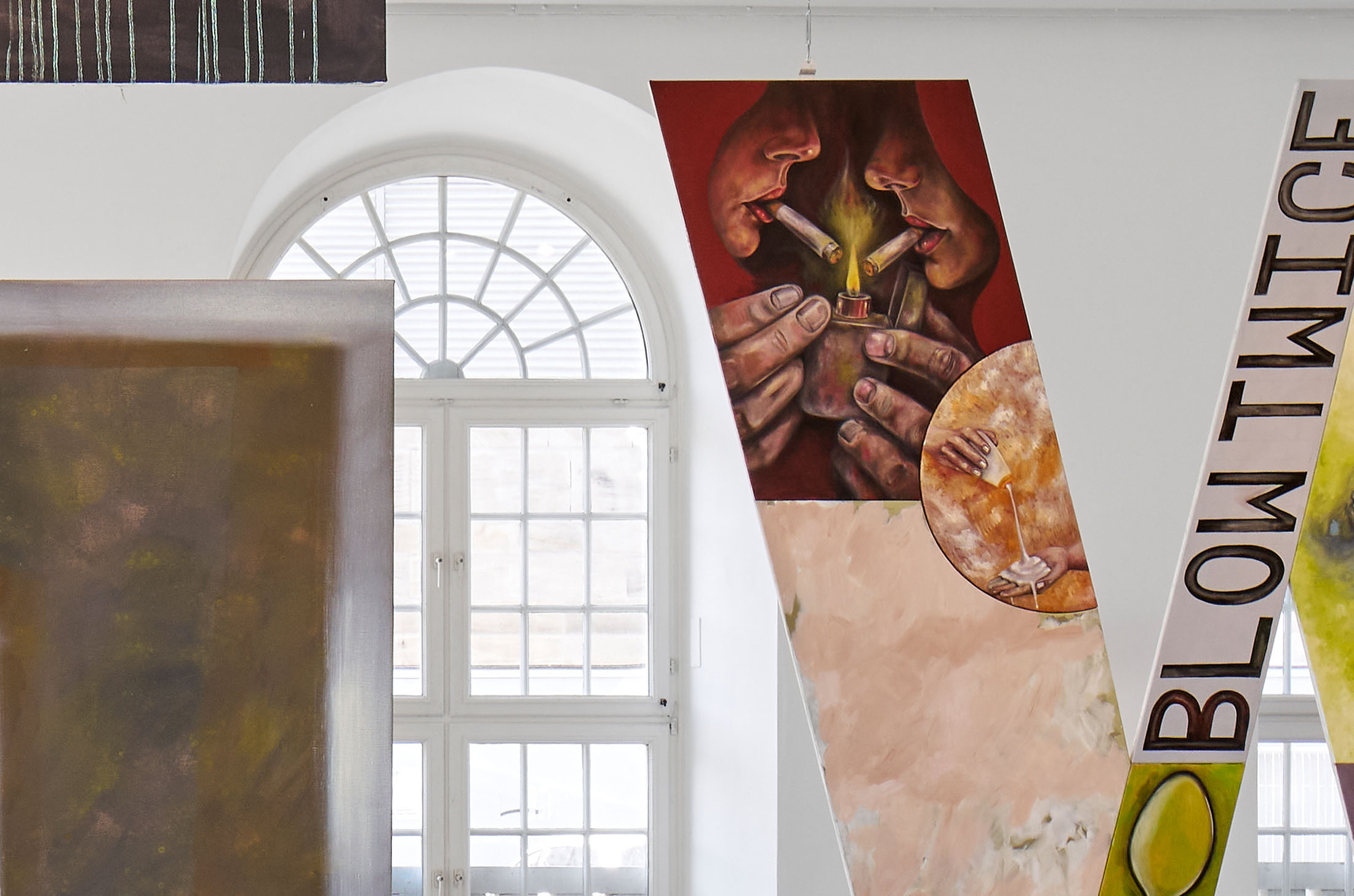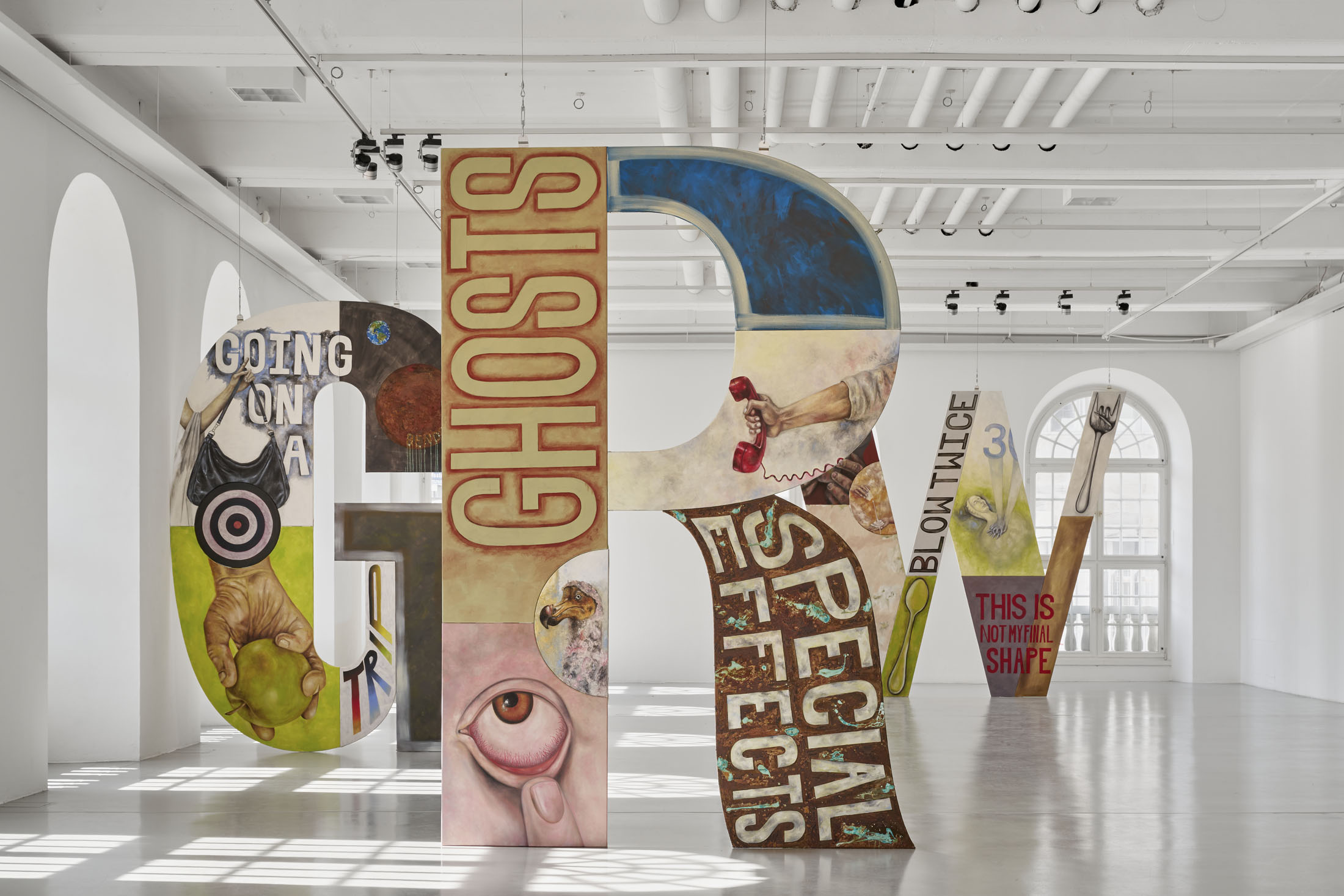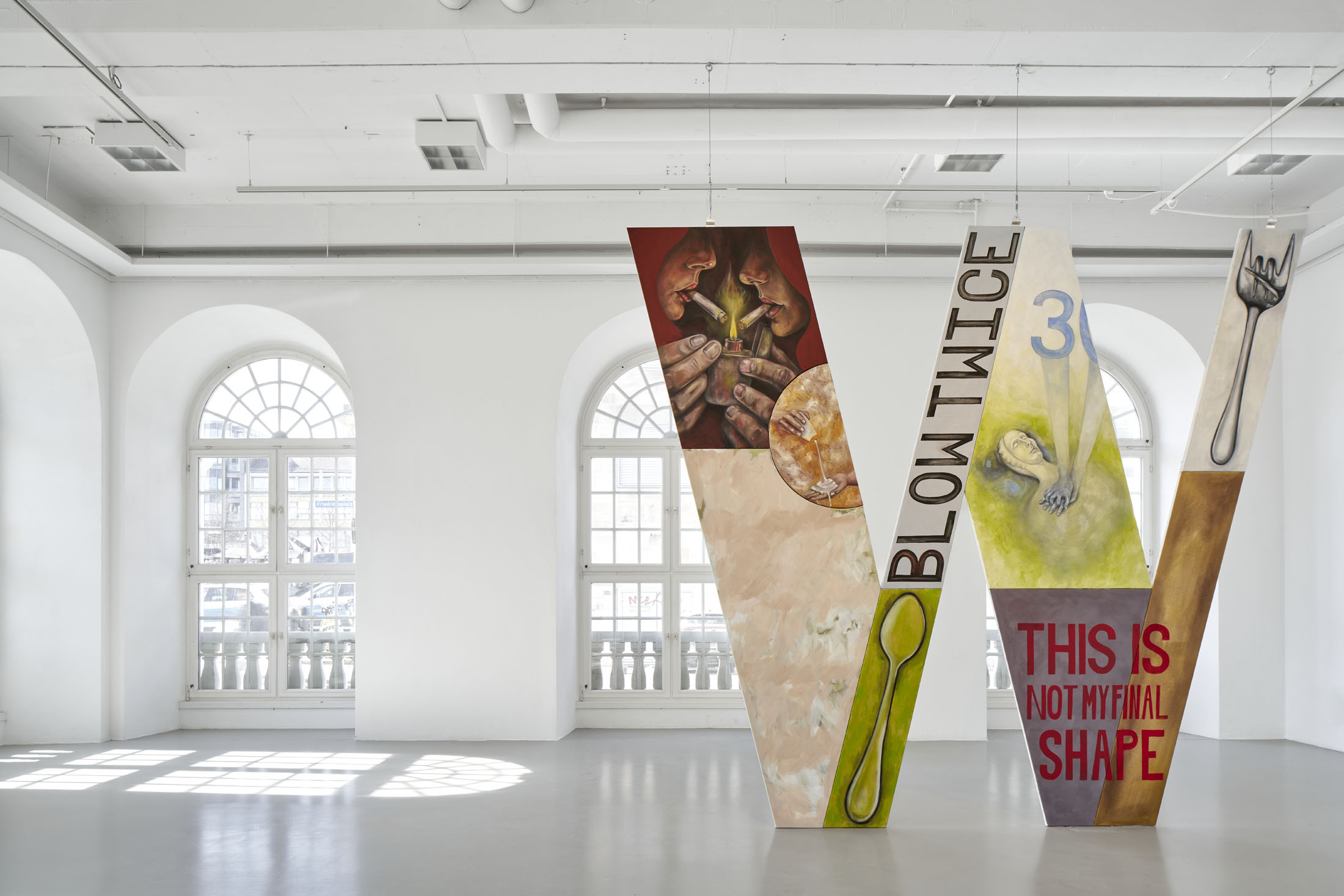 In the Kasseler Kunstverein, Tanja Nis-Hansen presents these four letters suspended in mid-air as paintings, or rather amalgamations of numerous paintings that come together like a puzzle to form their larger whole. Thirty in total, they feature an array of subject matter of images and words that, in their particular constellations, open up readings that extend beyond the individual works.