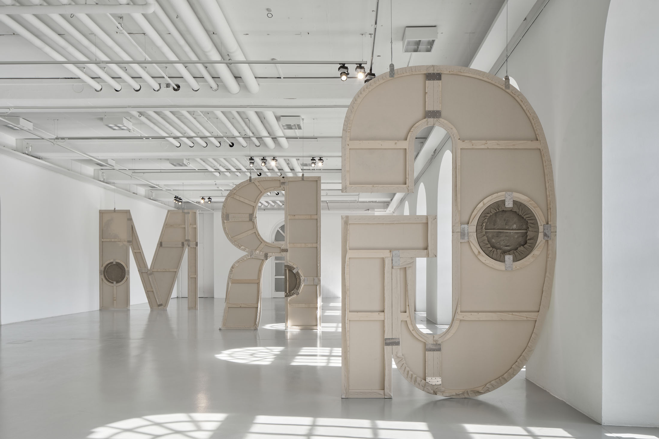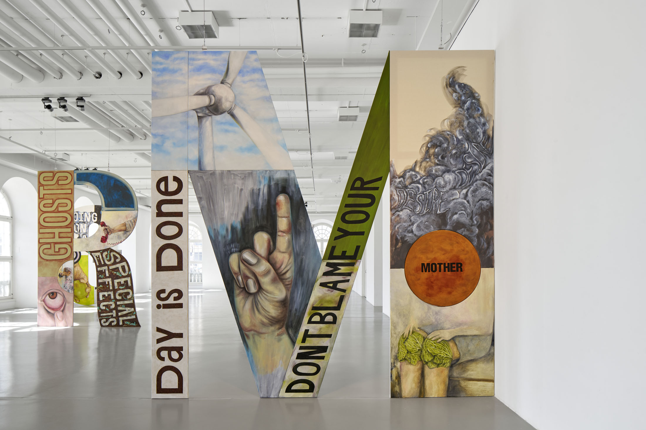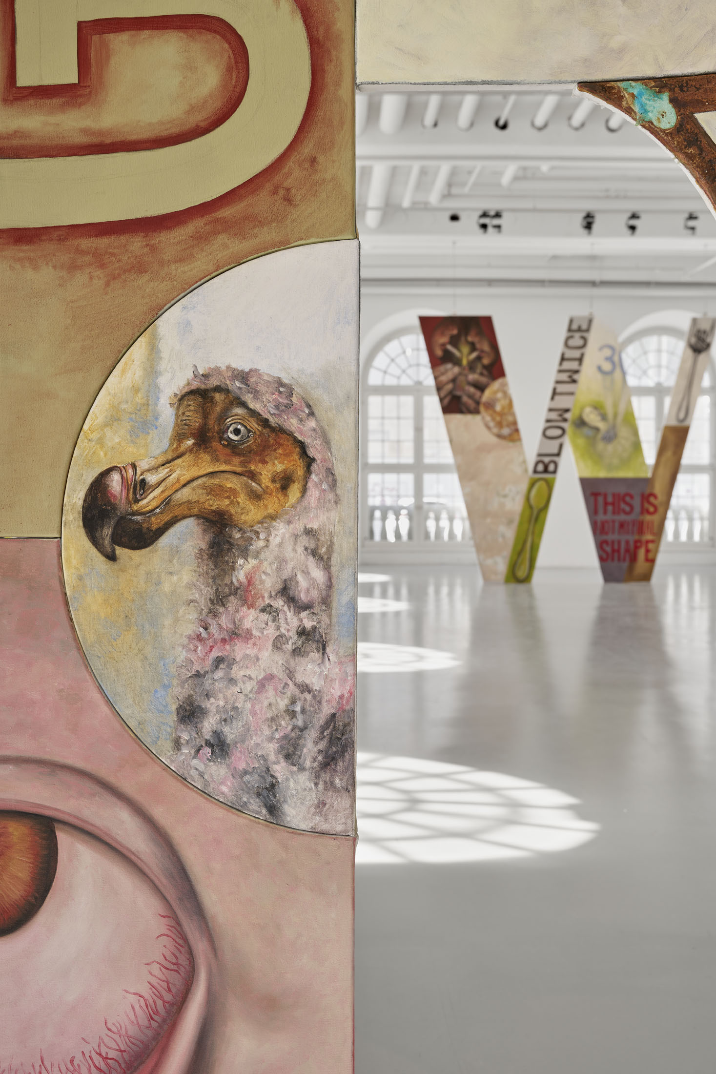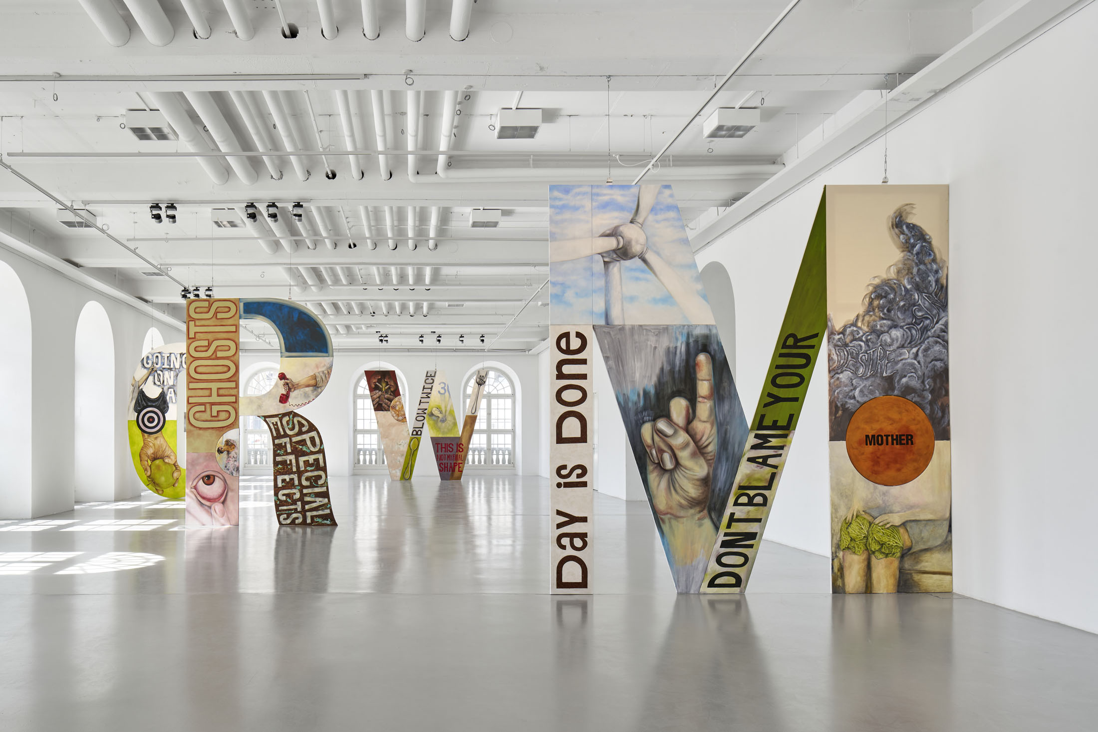 In the Kasseler Kunstverein, Tanja Nis-Hansen presents these four letters suspended in mid-air as paintings, or rather amalgamations of numerous paintings that come together like a puzzle to form their larger whole. Thirty in total, they feature an array of subject matter of images and words that, in their particular constellations, open up readings that extend beyond the individual works.