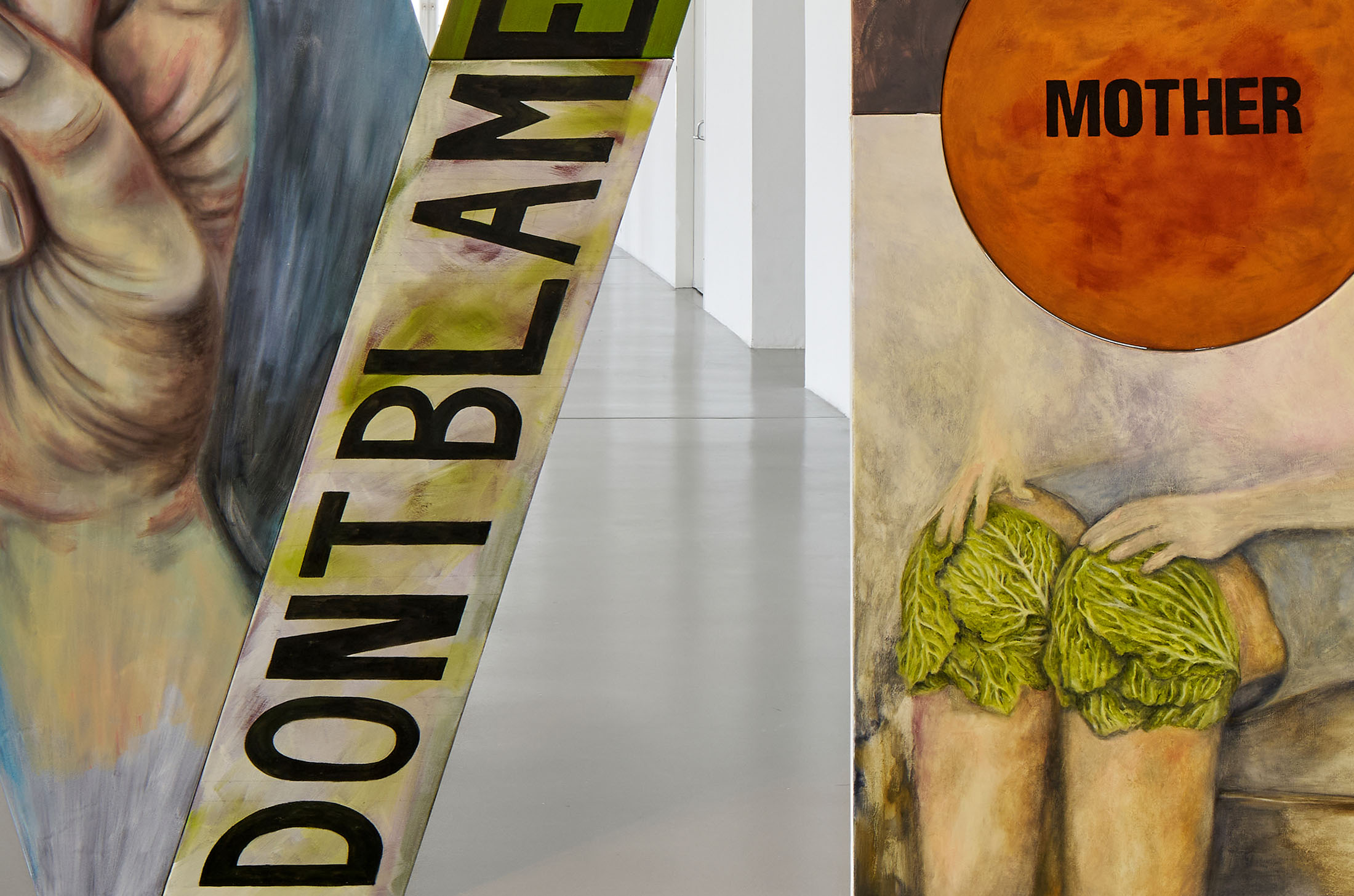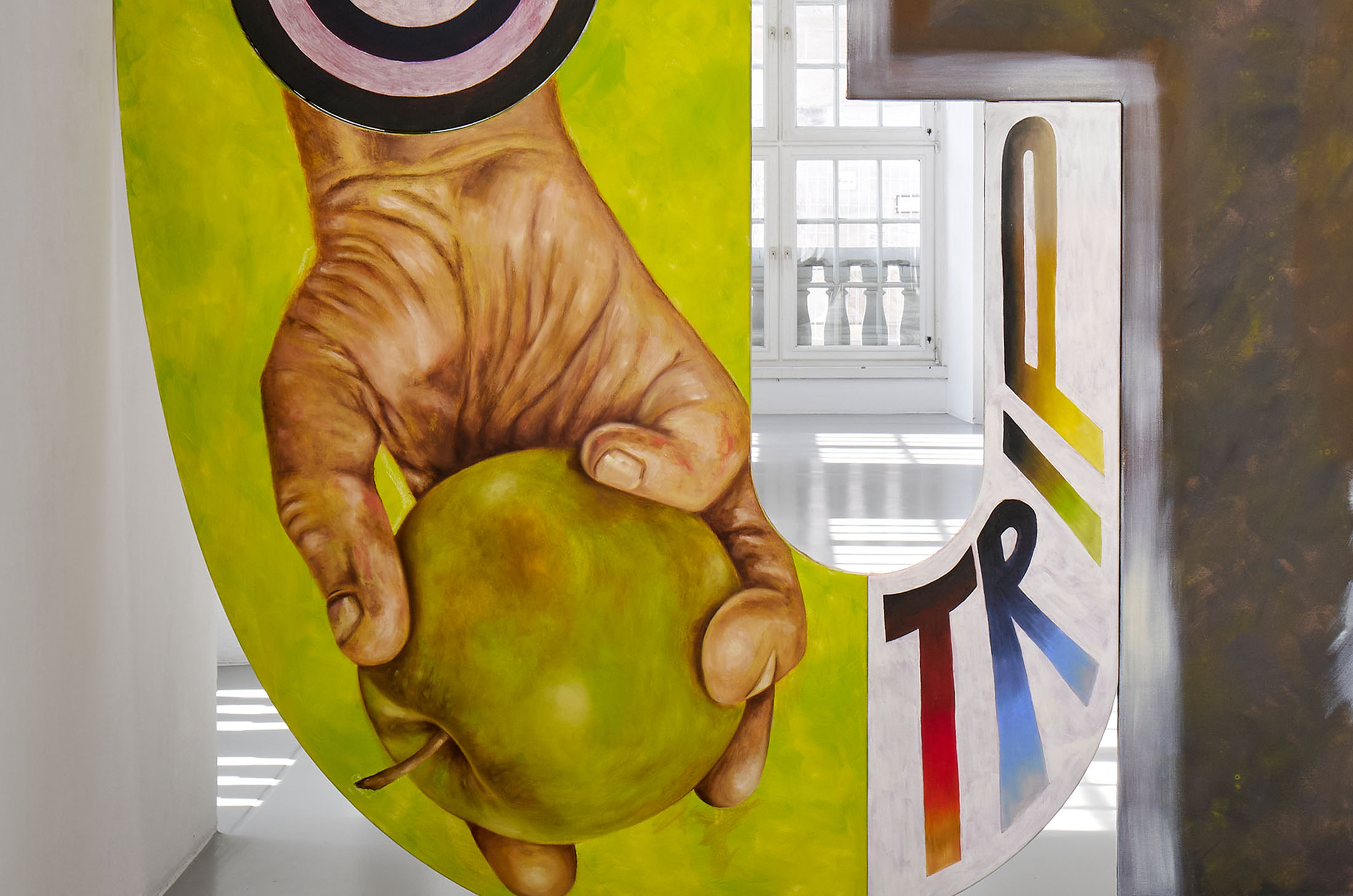 Amongst them, one can find a petrified-looking dodo, a windmill, an eye being forced open, and an apple, all of which appear more as isolated symbolic markers rather than representations of immersive scenes. The apple, particularly, is a recurring theme in Nis-Hansen’s work, as it carries a proliferation of connotations from sin, temptation, by its voluptuous, shiny curves, fertility, as well as its associations with health and lifestyle. There is also an abundance of extended, bodiless limbs, either pointing towards something out of frame or stretched out so as to offer an object to be received by another. These gestures are directional, leading the eye throughout the canvas, but also hold an appeal-like immediacy in their demand. Read along the sentence fragments that repeatedly carry a similar imperative, or mantra-like tone, and one begins to grasp the disparate fragments of a verbal and visual mode of communication beyond their fixed meaning in language. Writing through images, so to say. A kind of hieroglyphic charades.