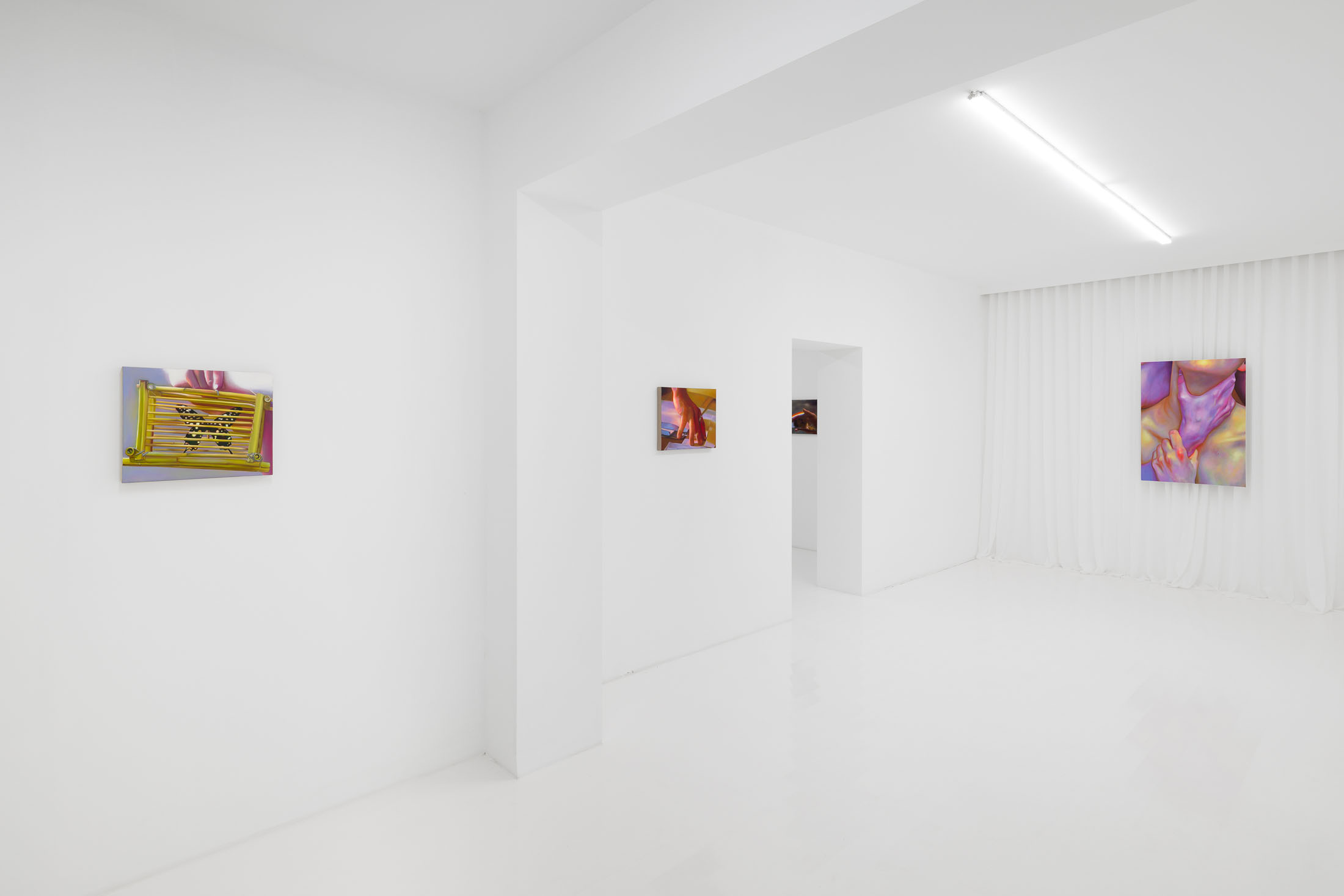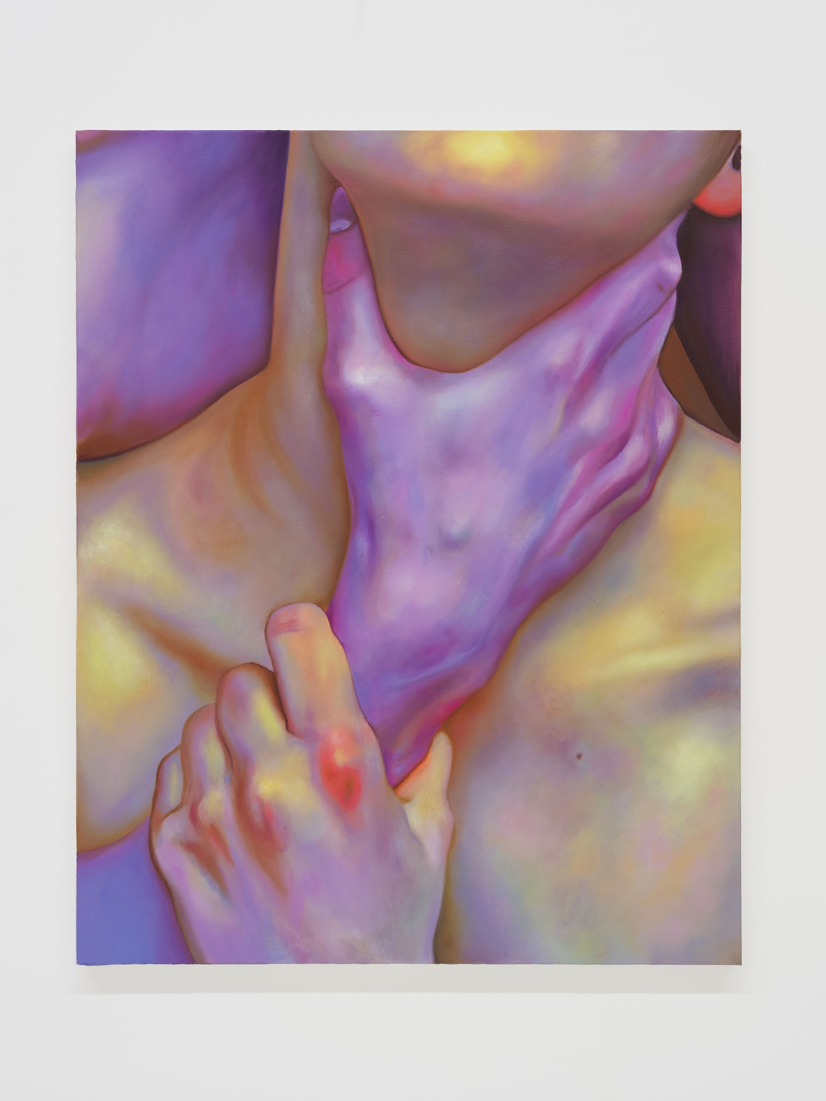 In these pieces Tao Siqi deploys a more naturalistic palette than her earlier works, while retaining her signature surreal auras. On her canvases, color carries both humidity and toxicity: fluorescent-tinged pinks and purples, liquid-like crimson, skin tones that are soft yet tinged with melancholy. Muted greys and murky greens rumble at the edges with a repressed echo—they conjure distorted memories of touch, scent, and sound, giving her paintings a moist, dreamlike texture. These colors drift between beauty and pathology, seducing us with sweetness before abruptly jolting us awake. Drawing upon imagery from cinema, literature or endless online scrolling, Tao Siqi imbues contemporary tropes of desire with corporeal and sensory memories.