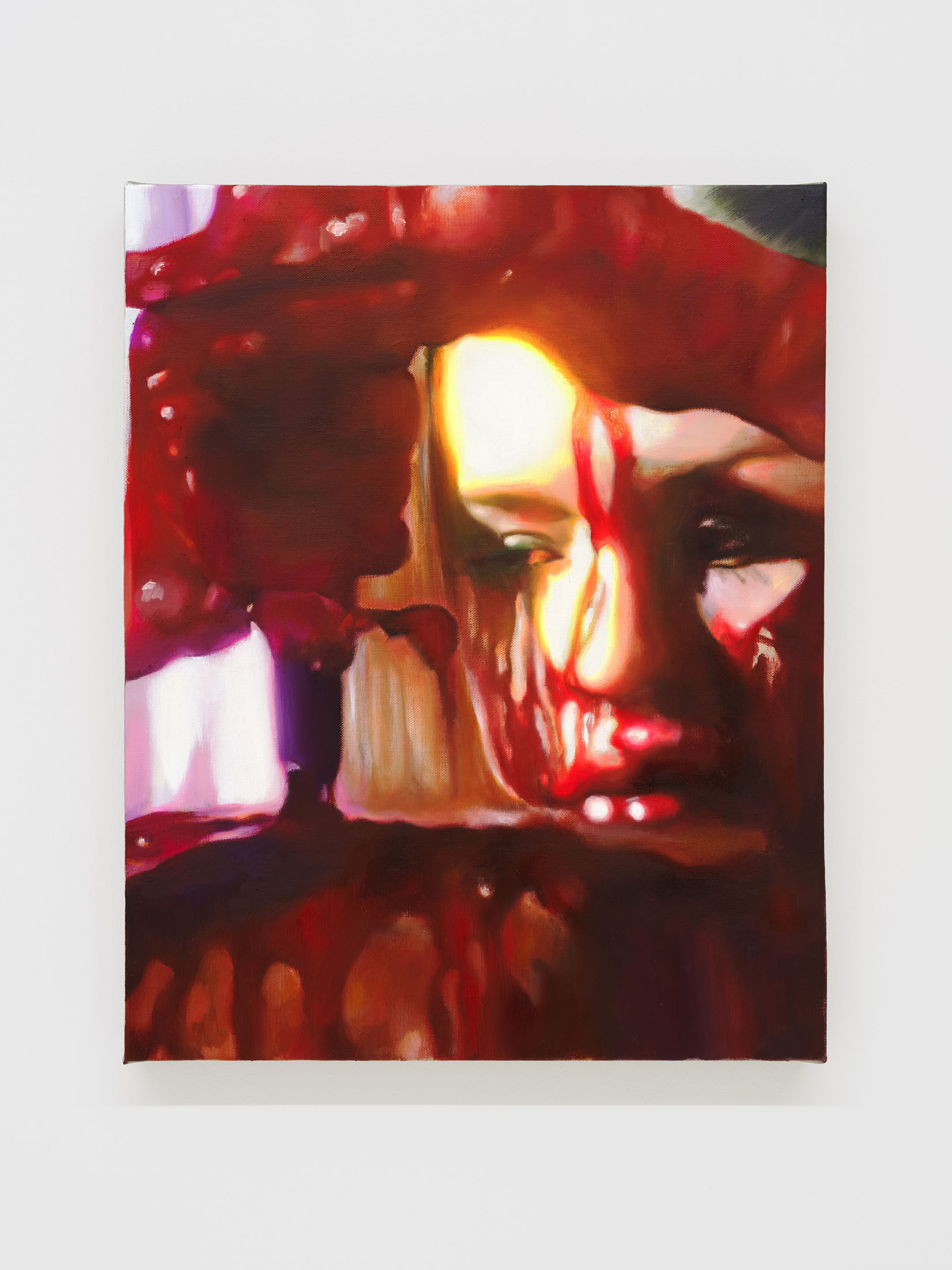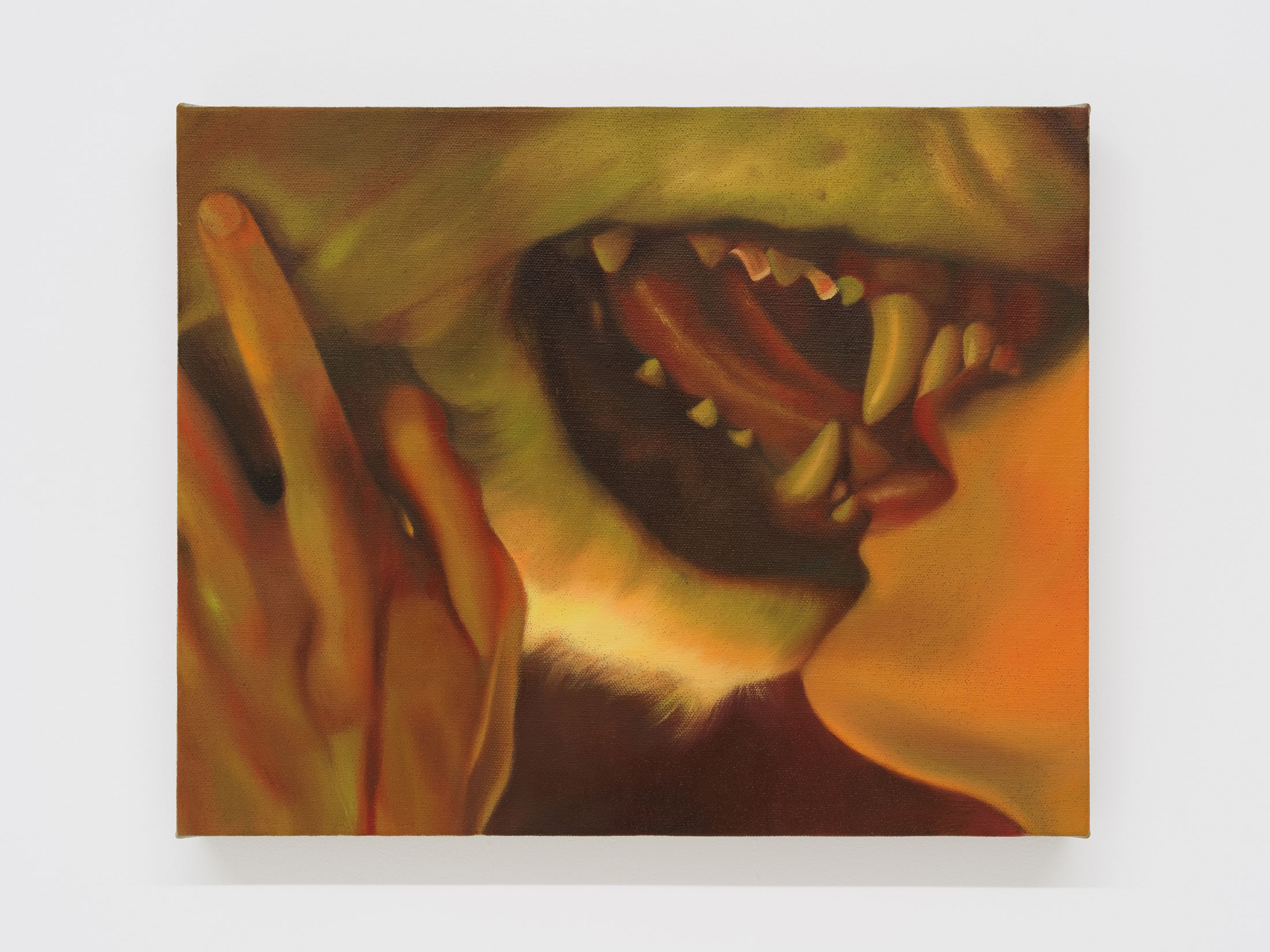 Tao Siqi depicts gendered power relations bluntly, without presenting solutions to the complexities of dominance or submission. She does not judge the people, animals and spaces she paints. Instead Tao Siqi lets her subjects act as abjectly as they please. Her subjects often revel in some kind of jouissance–pleasure to the nth degree, pleasure that one loses one’s identity in, pleasure that morphs into something else. Take Mad Love, a stabbing: a young woman’s face is splattered with blood as she drives a knife into flesh with fixed fascination. Nearby, in Melting, a woman acts as a candlestick, head tilted back, candle jutting from mouth, hot wax dripping down her chin. Pleasure and pain merge in a smoky, Rembrandt-esque palette with equal parts neon light. As luminous as the candle it depicts, Melting is built sculpturally, touch by touch.
