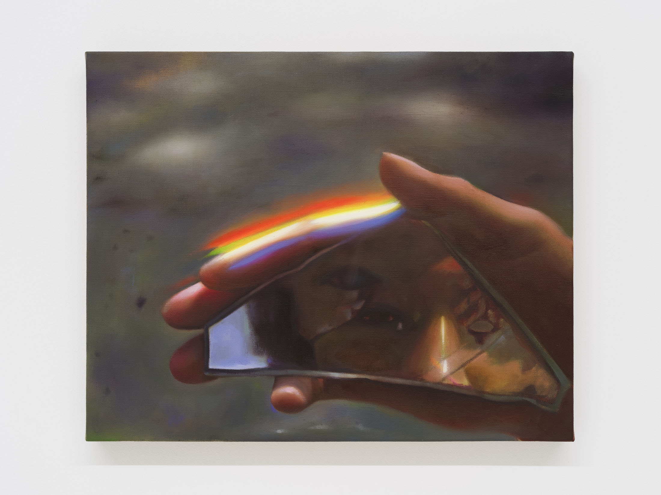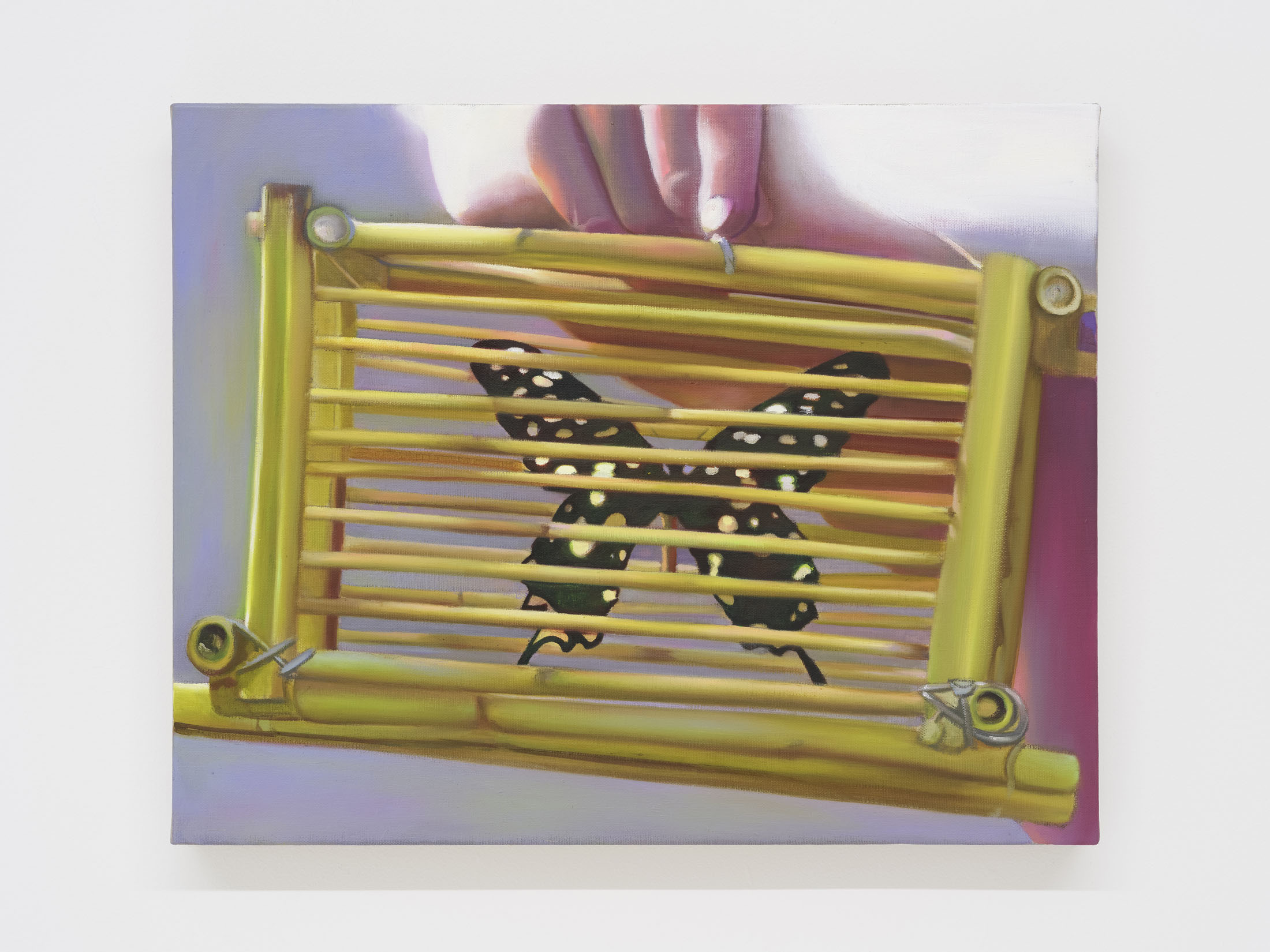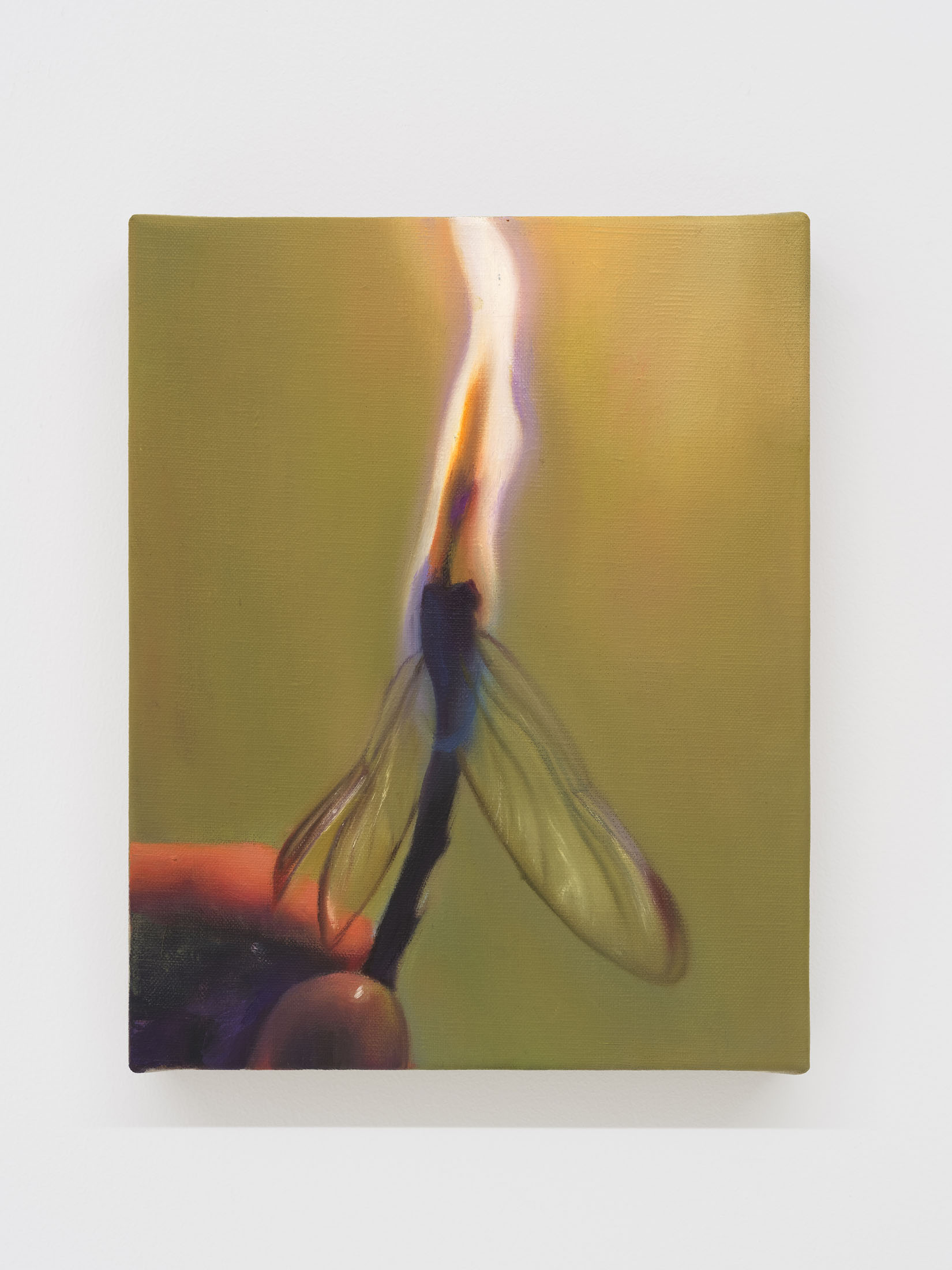 In particular, for this exhibition, Tao Siqi looked to Virginia Woolf’s gender-bending 1928 novel Orlando. The book spans several centuries, as Orlando transforms from a young nobleman into a woman across historical periods. Obsessed by Orlando’s slippery nature and ability to travel through time and gender with ease, Tao Siqi’s paintings manifest a similar fluidity. Mirror nods directly to a scene where Orlando catches her own reflection after shape-shifting from male to female. Taking in her new form, Orlando observes that “the change of sex, though it altered their future, altered nothing in their identity”[1]. In Tao Siqi’s version, we behold a shard of mirror from a first-person perspective. As the hand in Mirror becomes our own, the painting suggests that we may not recognize our own reflection. Although some pieces in this exhibition can be read as fairytale or parable, Tao Siqi’s insistent first-person POV unnerves again in the gem titled Fading. Our hand again; the burning of a dragonfly. How close can we get to this netherworld and still leave it unscathed?