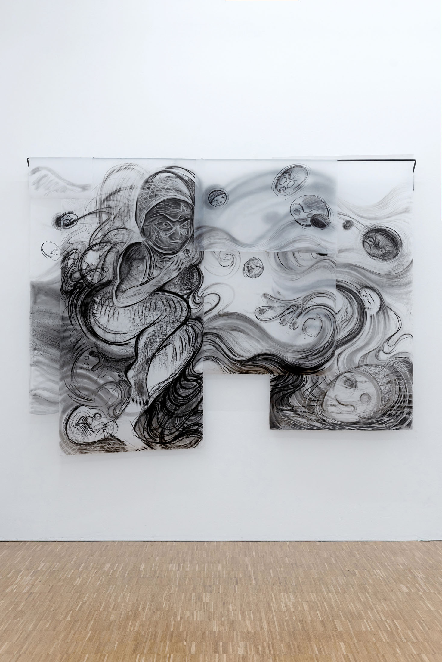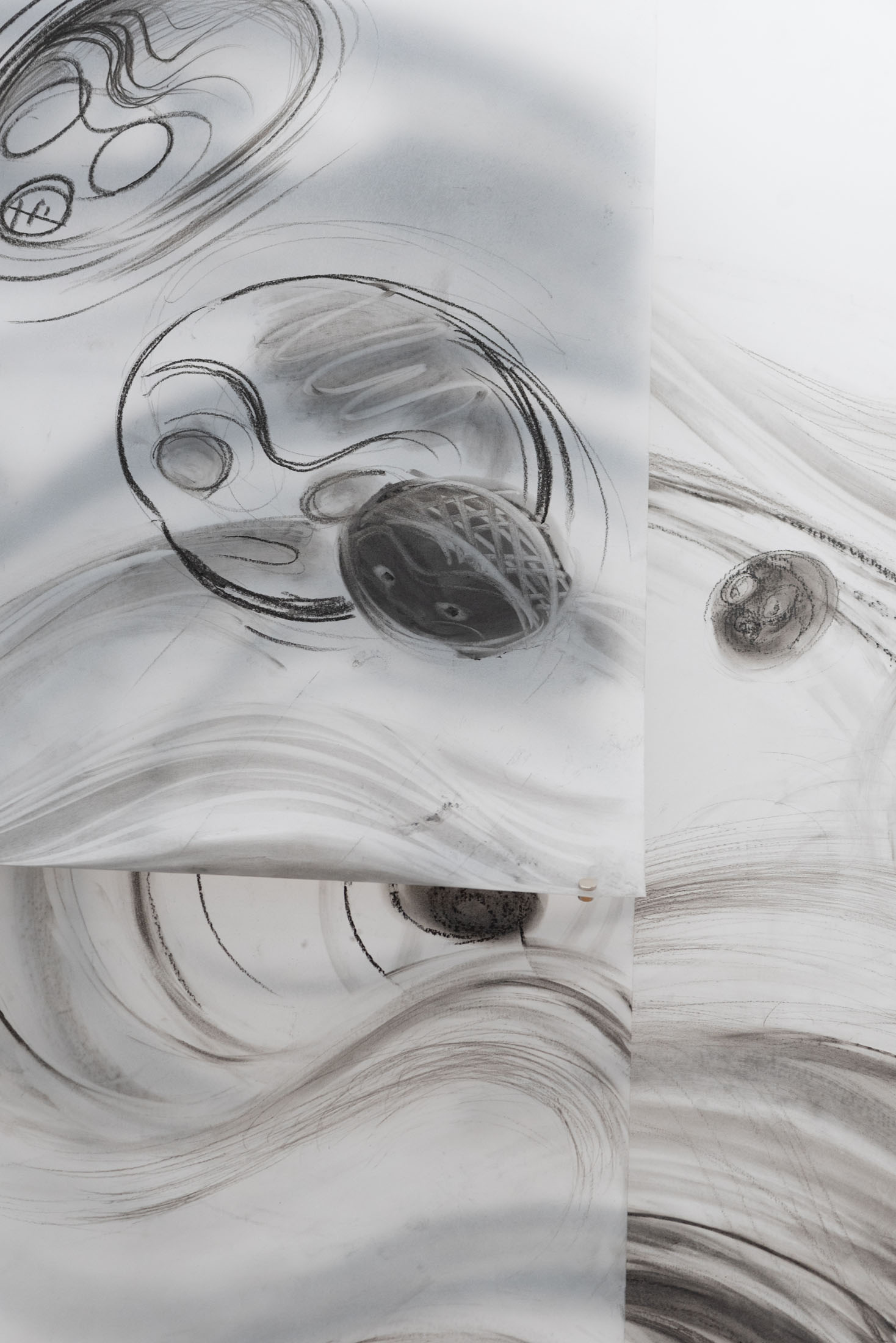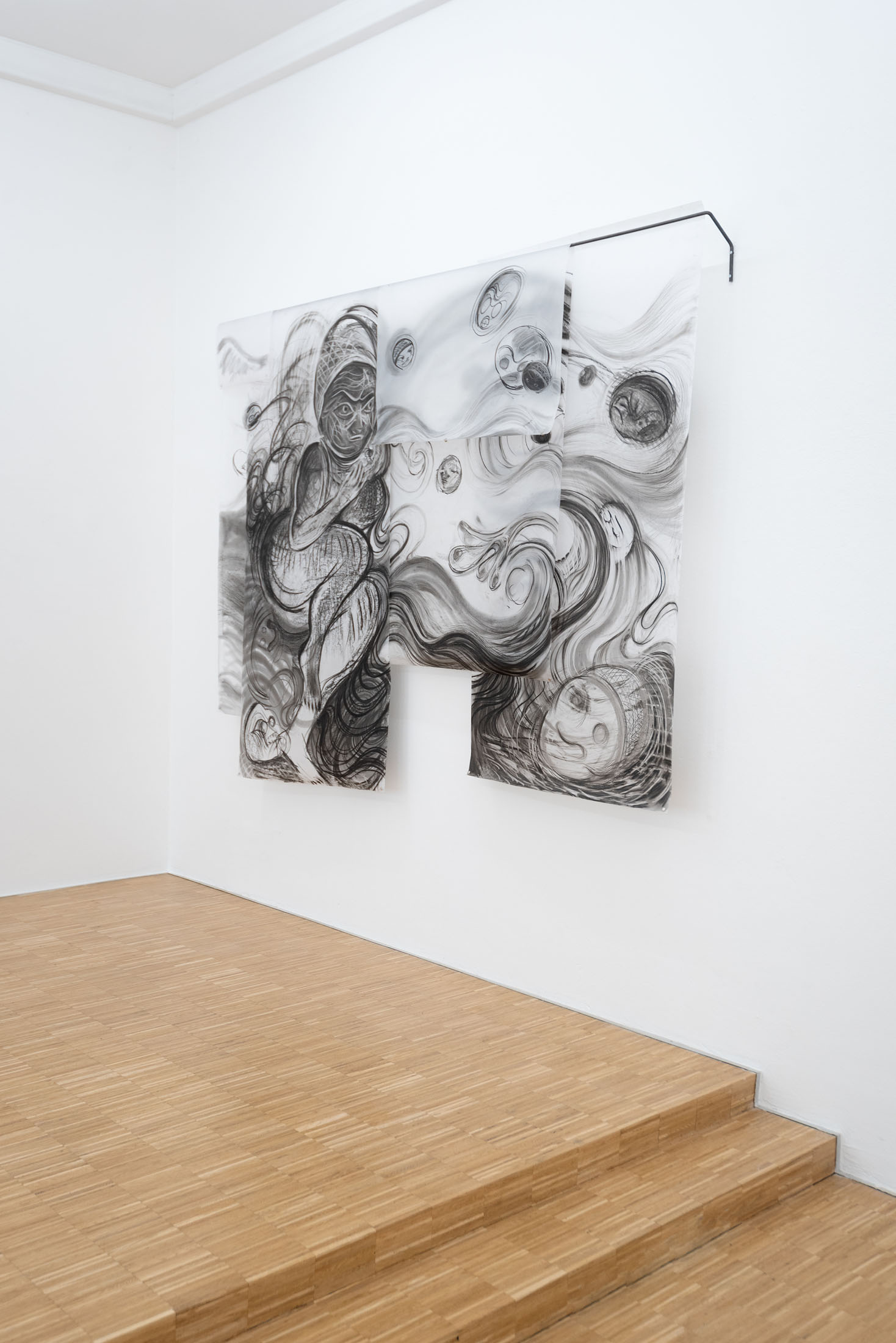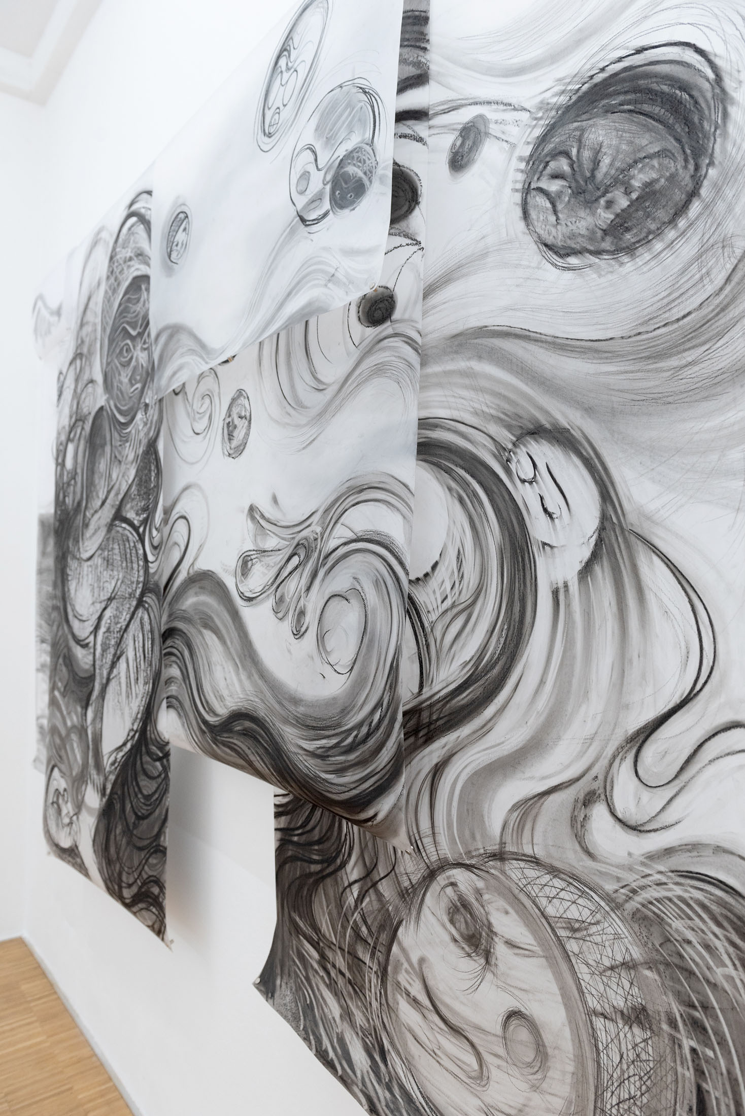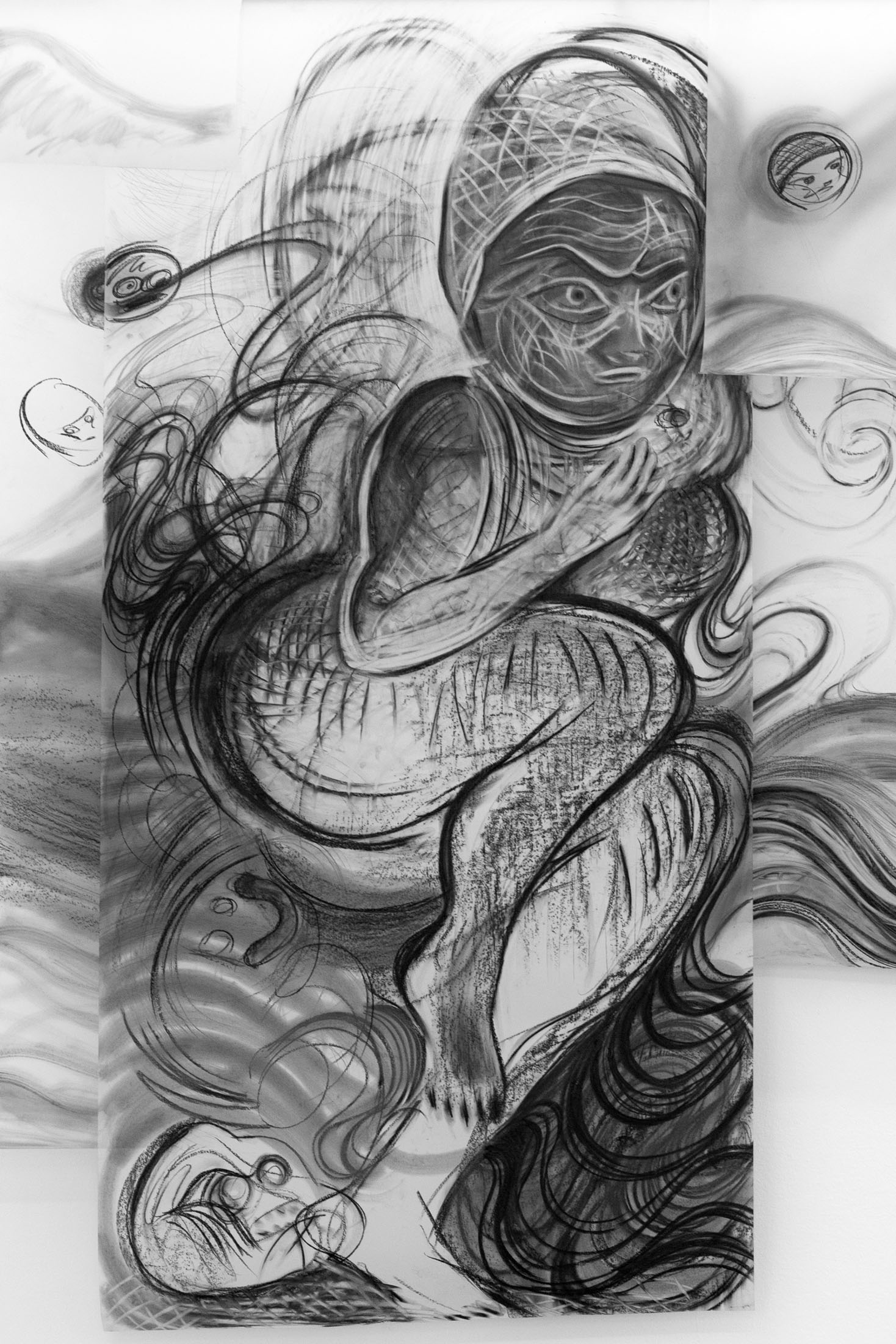 The bodies and faces of women looking out at us from Yuchu Gao’s drawings belong to a female community, like the one of “Haenyeo” from the South Korean island of Jeju, though many others of a similar kind can be found around southern Asia. Not one but many, all con- fronting us at eye level. They free dive, often to a depth of 20 m, to harvest molluscs from the sea floor. Many are elderly now, as this cultural practice is in decline, a consequence of ongoing industrialisation. But for a long time, these divers formed their own semi-matriarcal society, challenging our preconceived notions concerning the distribution of labor and eco- nomic leadership. They looked out to the sea and saw a smooth space, or rather, they found a way of making the space of the sea smooth again for themselves. We all know women who are like this, who build difference within. We walk among them as they flutter deli- cately on transparent layers of tracing paper, moving up, down and around the supporting rod, edges curling inwards and outwards. In Indian mythology, the churning of the ocean represents the transition from chaos to creation. Difference carried within is never still. It bobs up and down on the waves. Subjectivity becomes nomadic in motion.