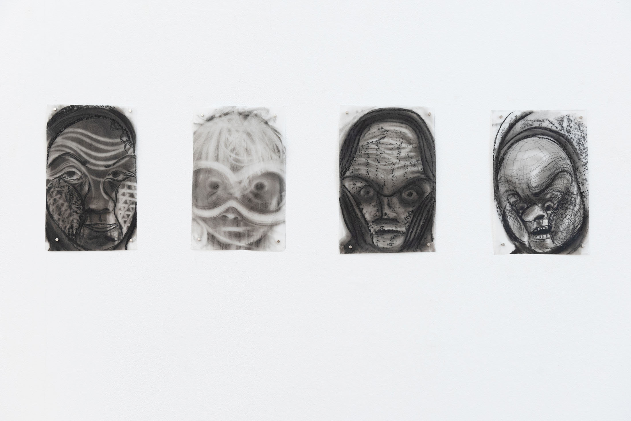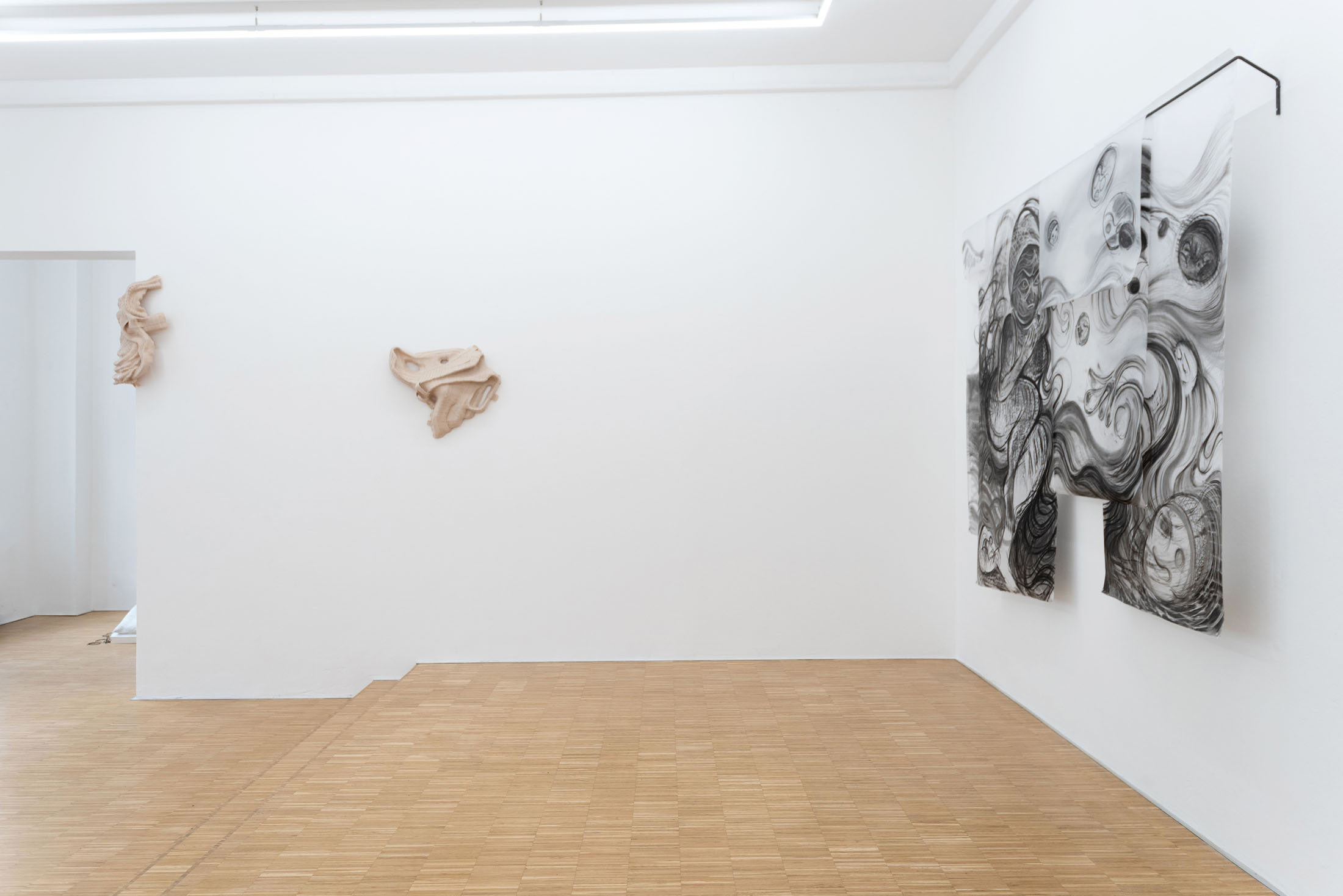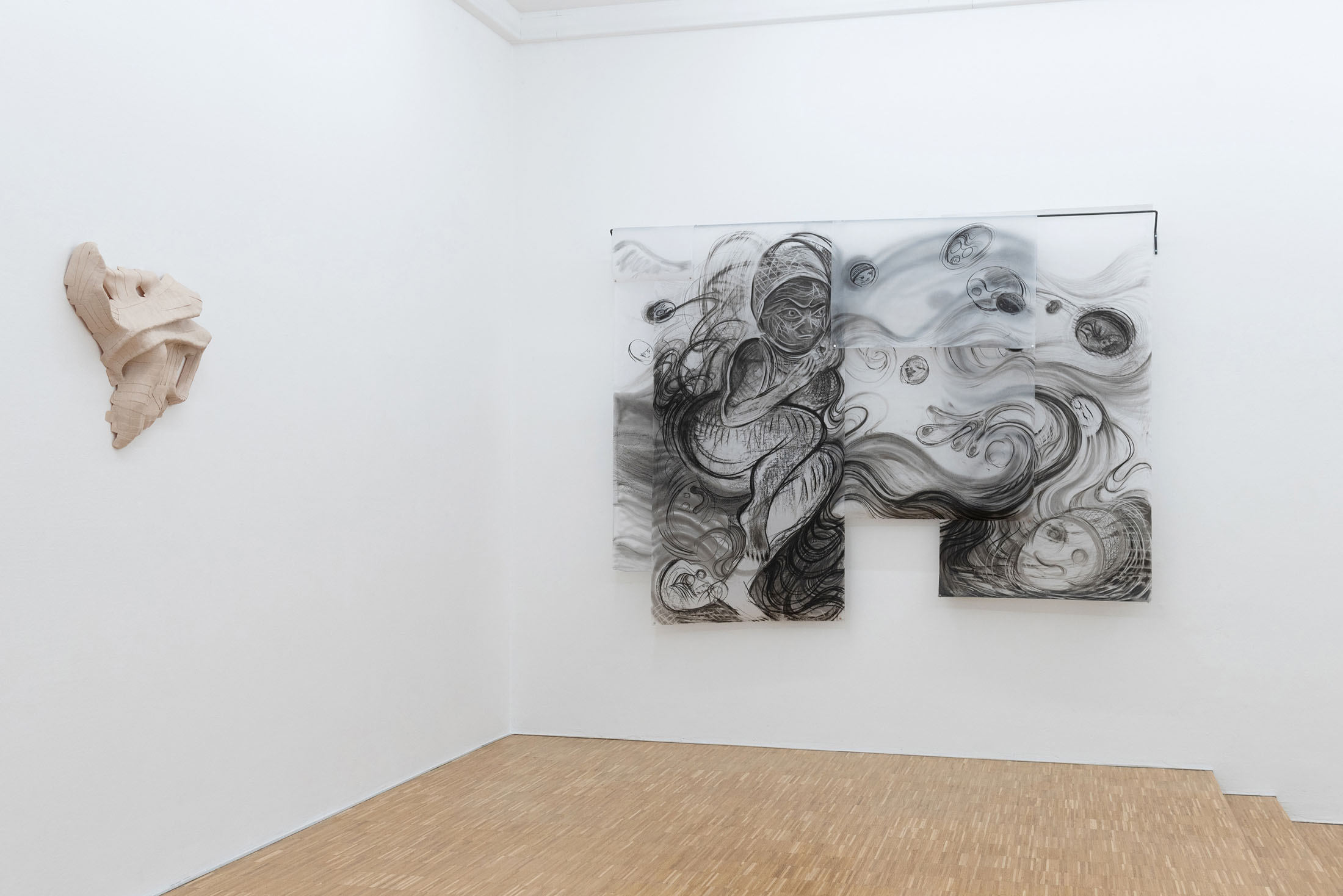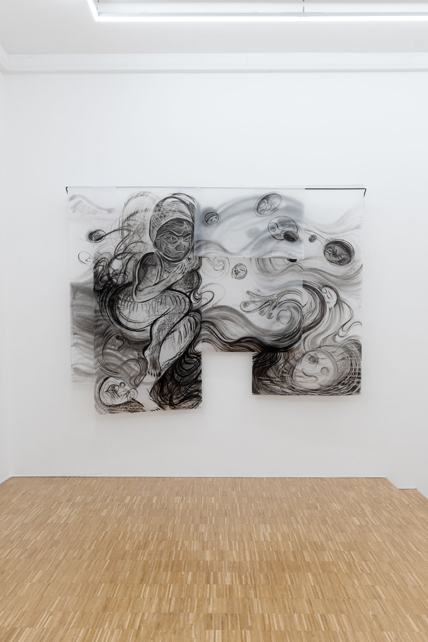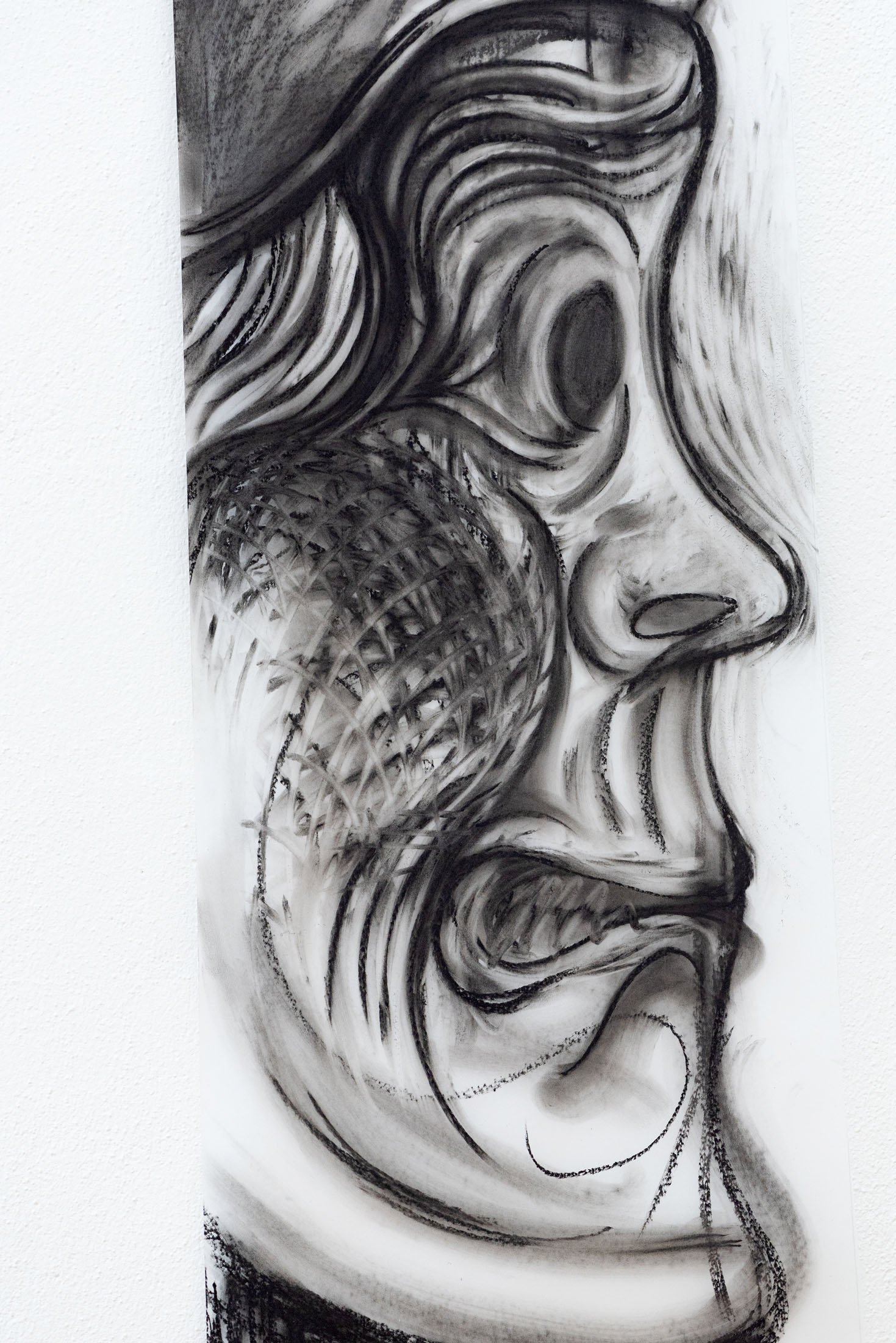 The bodies and faces of women looking out at us from Yuchu Gao’s drawings belong to a female community, like the one of “Haenyeo” from the South Korean island of Jeju, though many others of a similar kind can be found around southern Asia. Not one but many, all con- fronting us at eye level. They free dive, often to a depth of 20 m, to harvest molluscs from the sea floor. Many are elderly now, as this cultural practice is in decline, a consequence of ongoing industrialisation. But for a long time, these divers formed their own semi-matriarcal society, challenging our preconceived notions concerning the distribution of labor and eco- nomic leadership. They looked out to the sea and saw a smooth space, or rather, they found a way of making the space of the sea smooth again for themselves. We all know women who are like this, who build difference within. We walk among them as they flutter deli- cately on transparent layers of tracing paper, moving up, down and around the supporting rod, edges curling inwards and outwards. In Indian mythology, the churning of the ocean represents the transition from chaos to creation. Difference carried within is never still. It bobs up and down on the waves. Subjectivity becomes nomadic in motion.