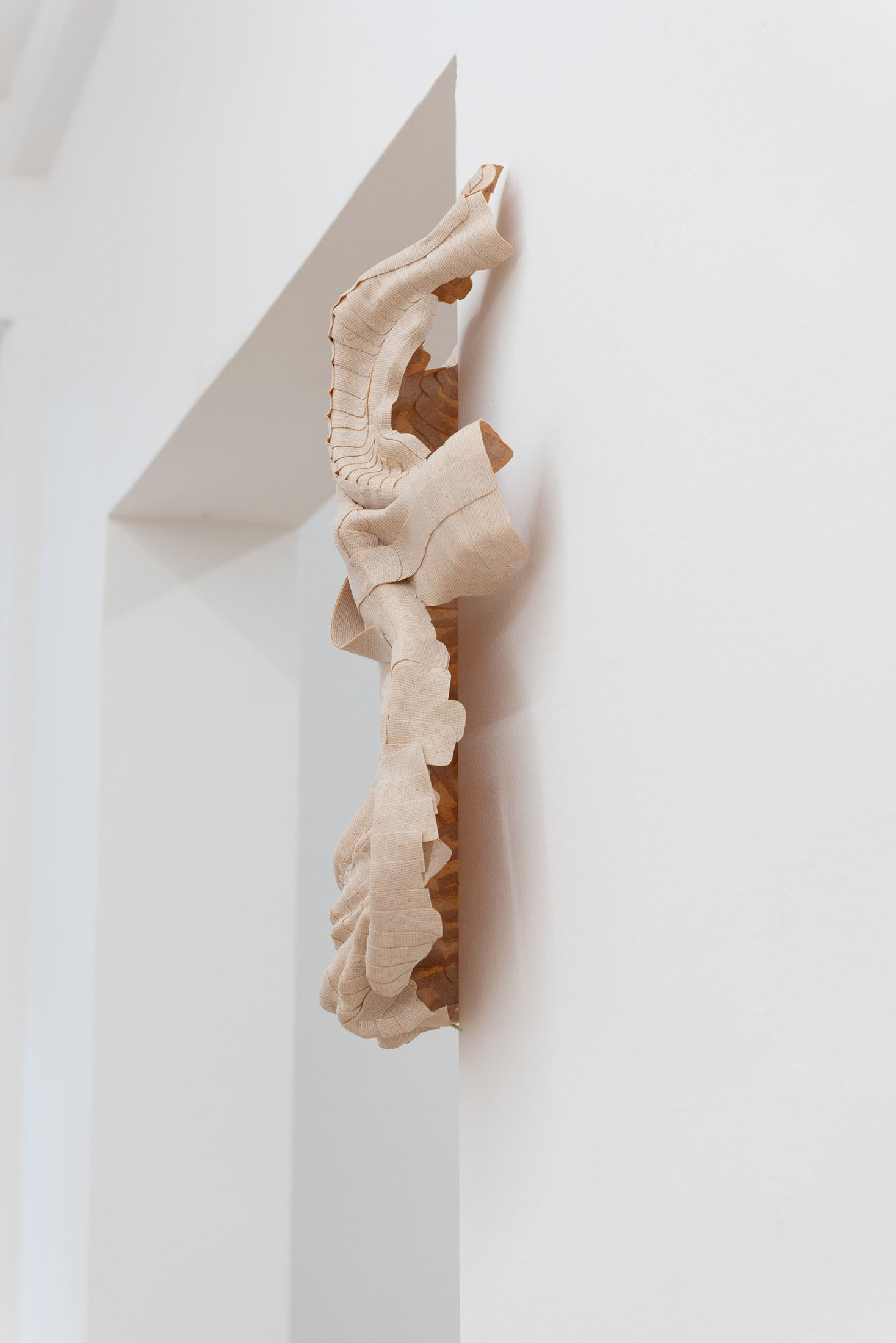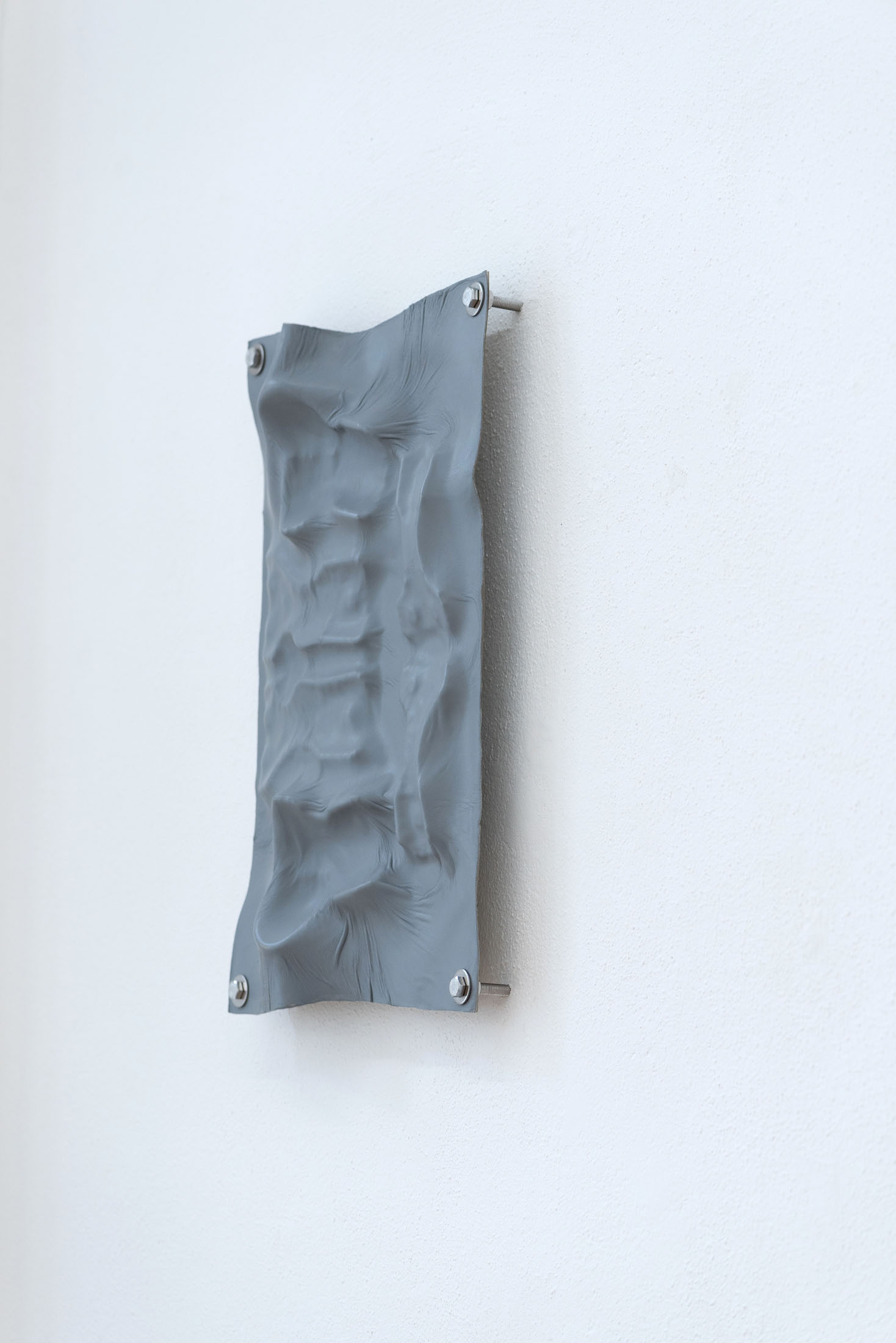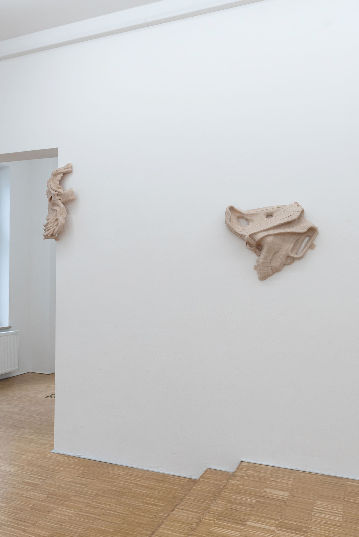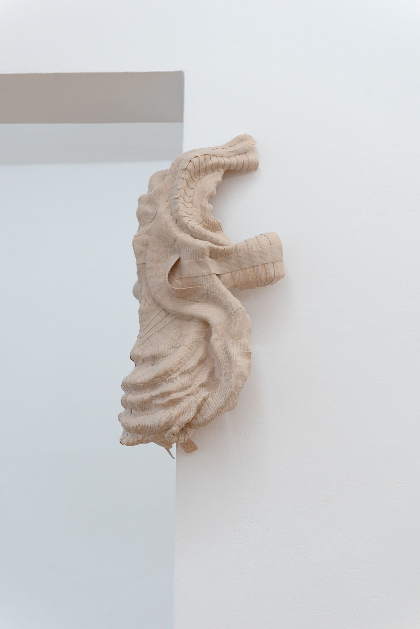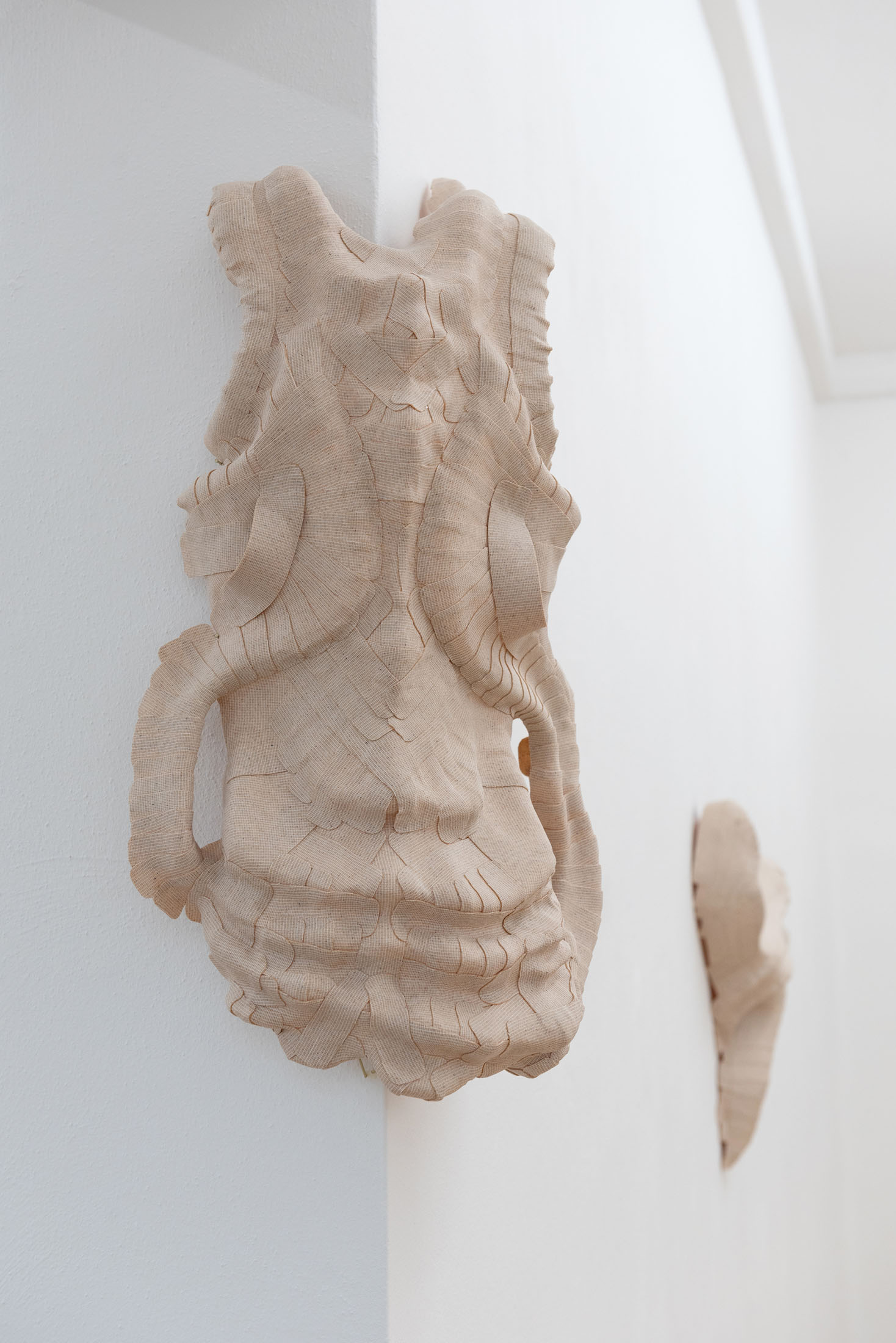 The curving structure of Anna Lena Keller’s thermoplastic exoskeletons support a double- understanding of the body. On the one hand, the body is the biological organism already exhibiting signs of proto-technicity, where organs are defined as technologies developed in the course of evolution, allowing us to function ever more efficiently. On the other hand, the body is presented as the “technium,” consisting of all those detachable external tech- nical artefacts that expand the organ’s individual capacities, necessarily fragmented, scat- tered, but also interconnected with each other in a complex wide-ranging network. These are bodies extending nomadically into space they rendered smooth. In physically deman- ding workplaces, the military or in rehabilitation, the kind of exoskeleton referenced to by Keller, has a supportive function, assisting, augmenting and enhancing the user’s body. However, Keller’s objects only perform this supportive function, as their specific materiali- ty – worbla tape, heated around a mould, then cooled and set – is more commonly used in cosplay. Keller’s objects operate within a prosthetic theory of technology, to play with the relation between the inner and the outer. By removing any claim of functionality, the object no longer serves as a supporting device, with the inside supported by an outside structure, but performs a redrawing of their boundary.