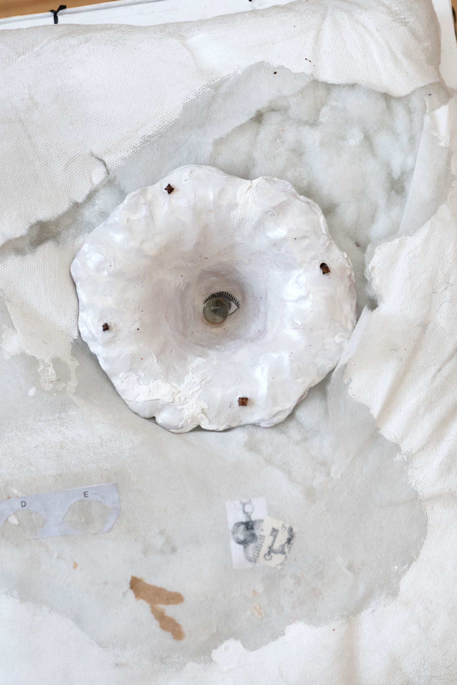 When Iris Böhnlein introduces her art practice, she refers to herself and the kind of do- mestic environment of middle class Franconian comfort she grew up in, with its familiar routines divided between work and home. She is interested in how these past rhythms can gain visual form. Examining the emotional, social and cultural codes inscribed in everyday objects and their environments, her work becomes a kind of mapping, the charting of the embedded subject’s location within the intersection of the symbolic, the social and the cultural. She remakes routines out of paper and card – hollow, repetitive acts represented by the jug pouring or the tying of knots in black ribbon that looks like wet hair – to produ- ce what in Braidotti’s terms would be a cartography of the subject in becoming. Böhnlein understands how our past and present shapes our current subjectivities and the subjectivi- ties yet to come. An old photograph is stamped with a date in pink, as is the egg shell, an Ei containing the eye like a talisman. So much we have learnt from psychoanalysis: that the subject – the“I”- is non-unitary and non-unified, a process of negotiation between different levels of power and desire, wilful choices and unconscious drives. It is a tangled knot of different, contradictory impulses given a grand illusion of unity. My making the location of our subjectivities unfamiliar to us, Böhnlein brings to representation what by definition escapes our consciousness.