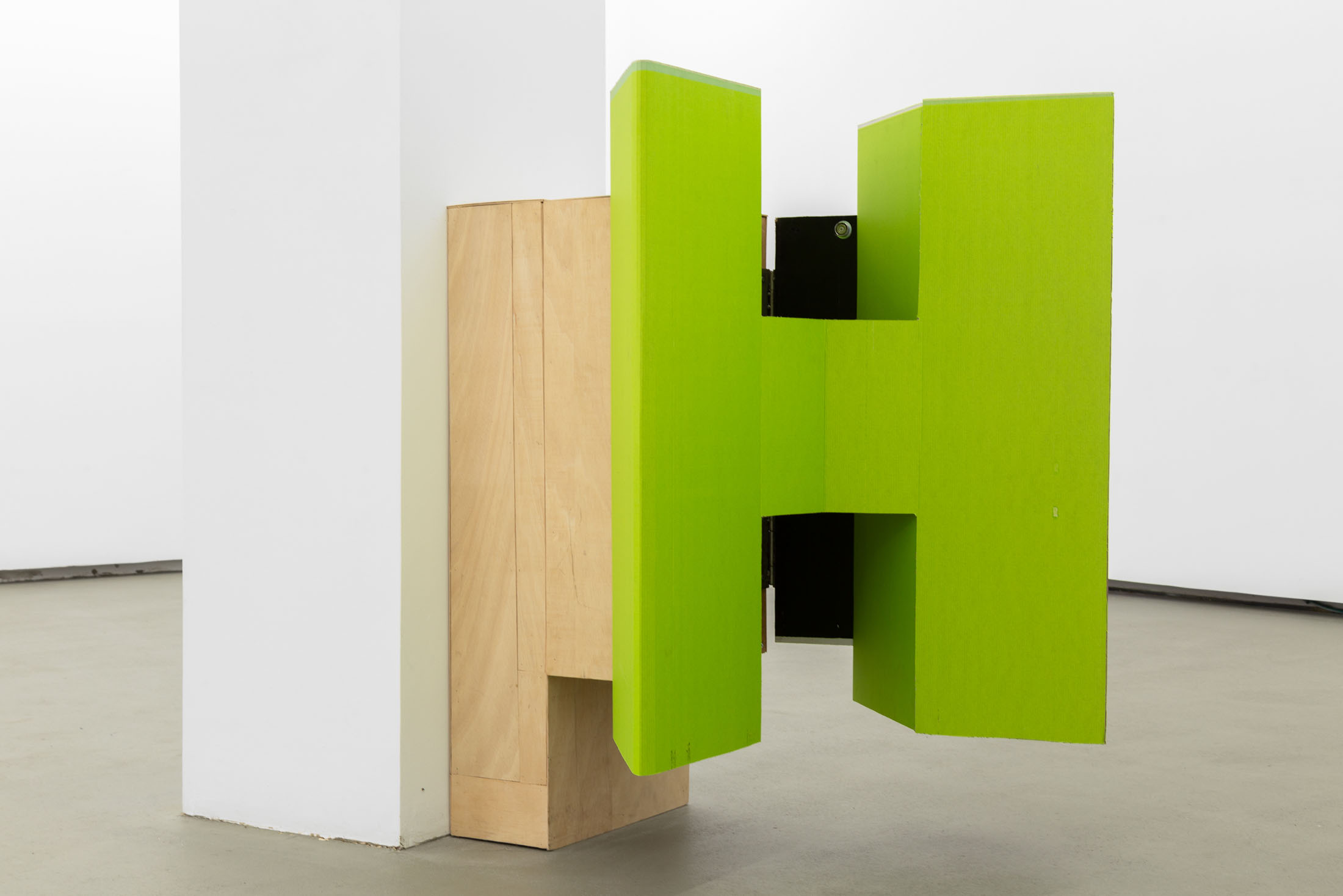 One is first greeted by a reflective wall work by Victor Ruiz Colomer, the first in a series of sculptures where quotidian mirrored medicine cabinets house folded cardboard objects. They are displayed laying dormant but when they are opened they expand spatially to reveal distinct letters T, M and H respectively. They transform and interact with the viewer’s body and create, at times, cavernous architectures to look into and navigate around.