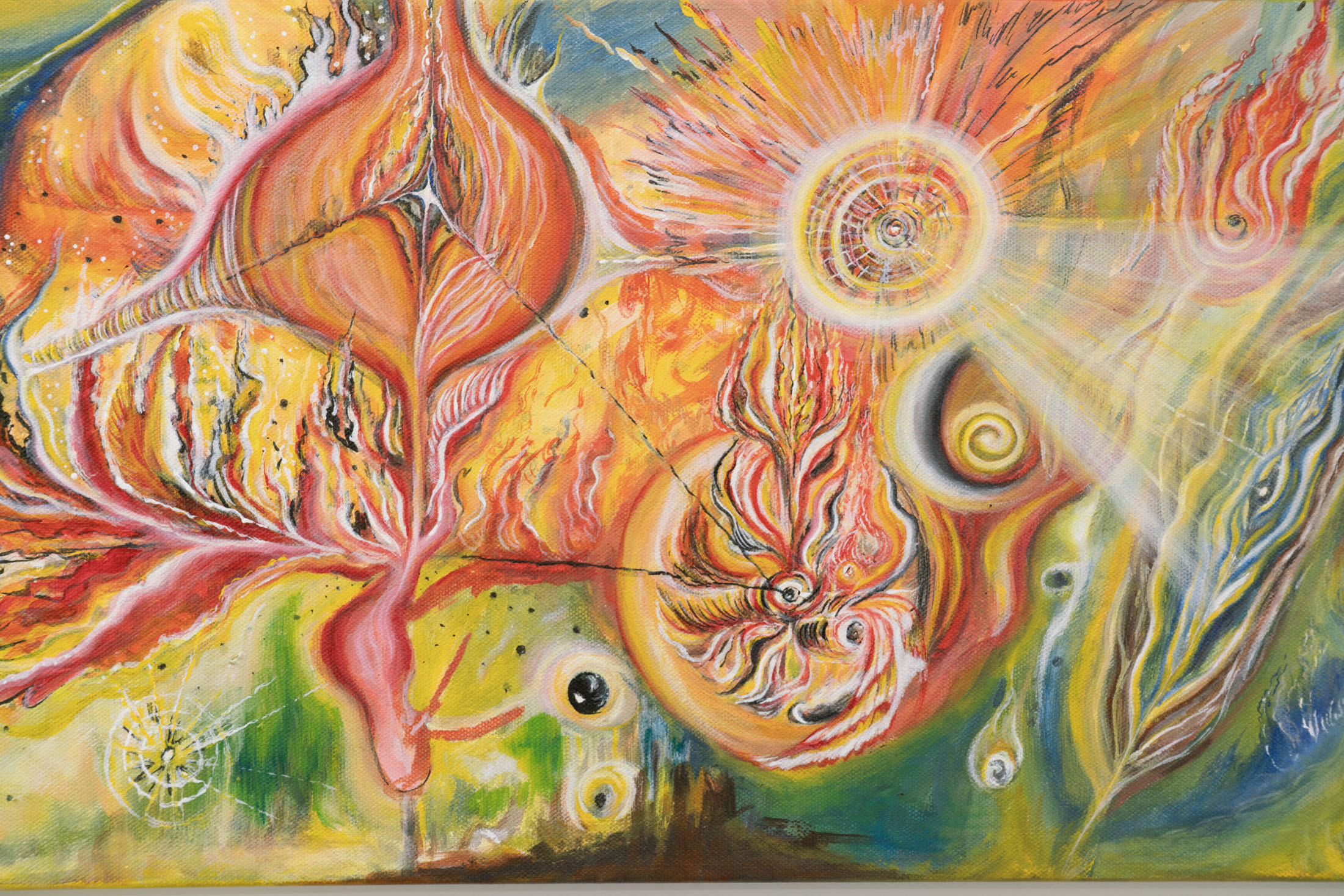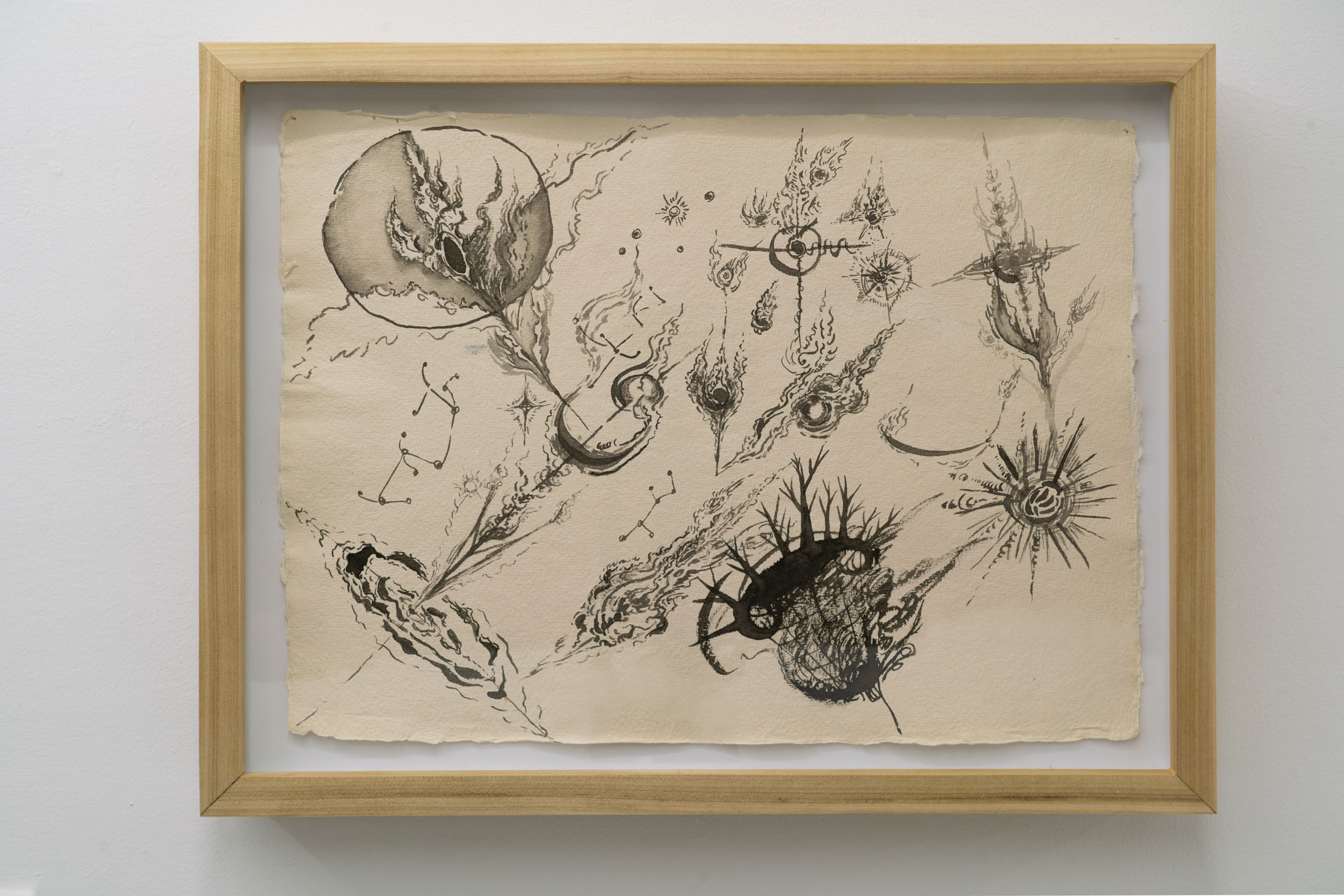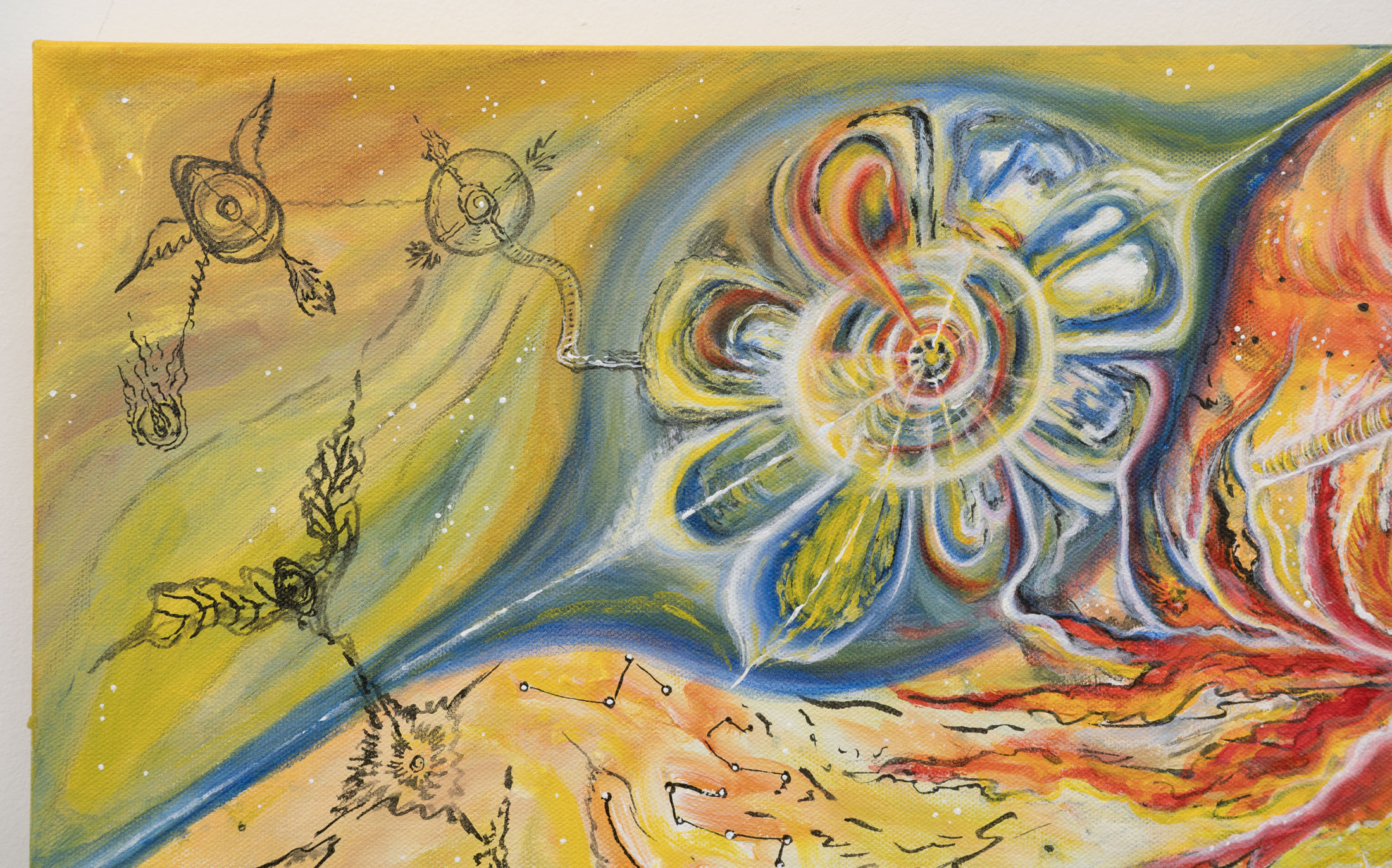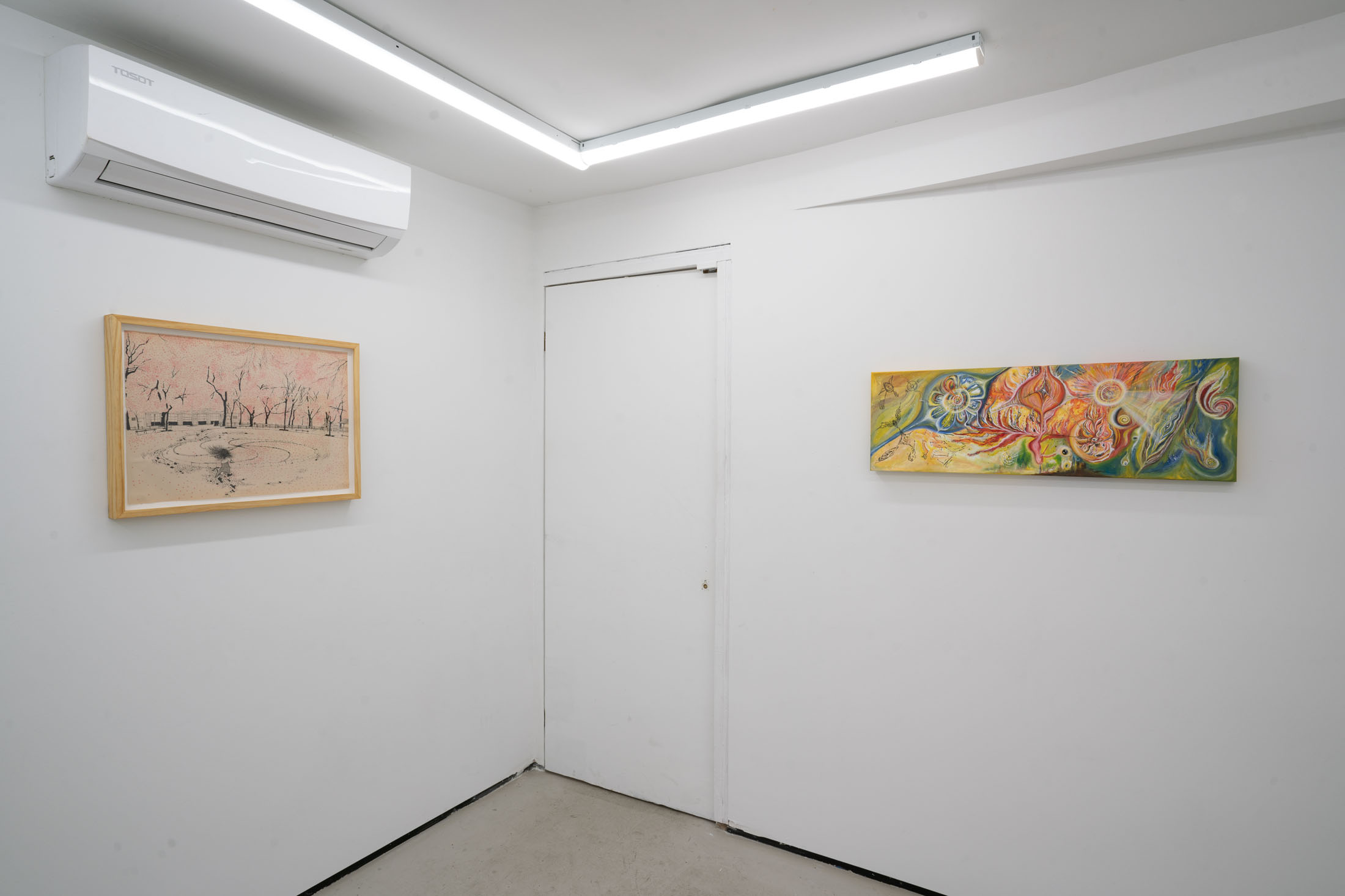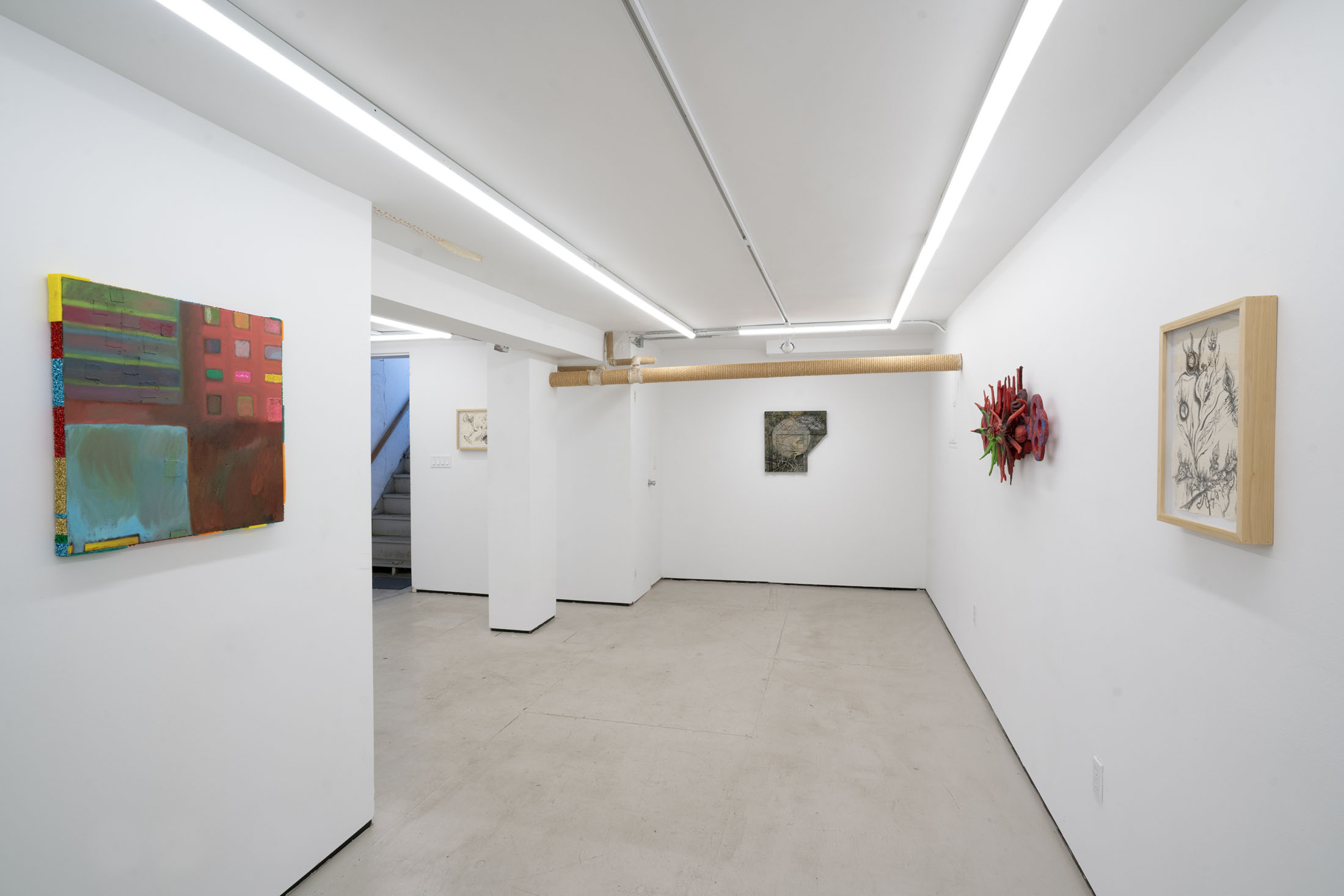 What potent cosmological title would encapsulate all the deep and brilliant soul explorations within the works in the group exhibition? We were meditating on the phrases ”hearts of space” “steam within rubies”, “molten underground intarsias” & “threads of hope in the inferno,” the artist Orange Li’s line~