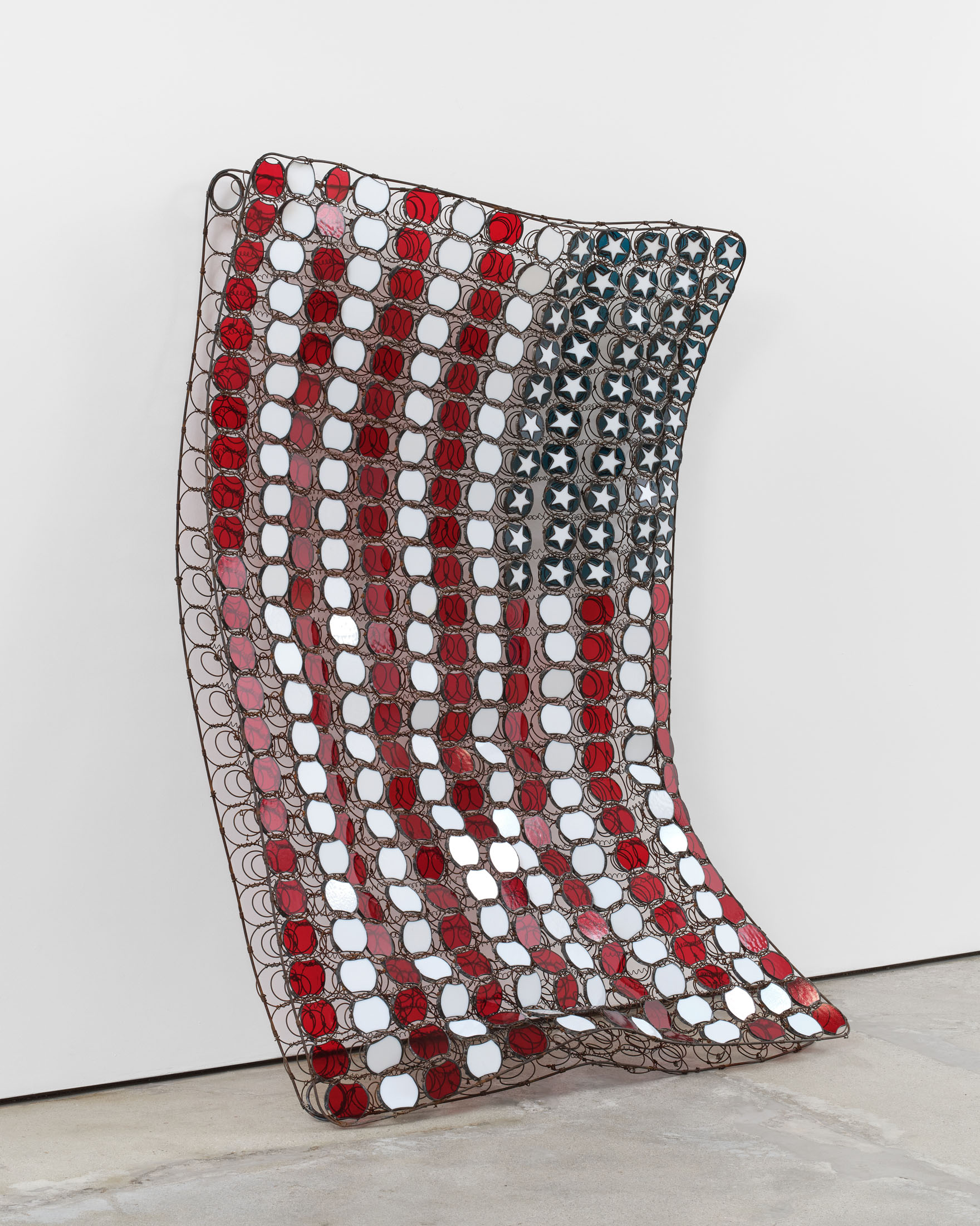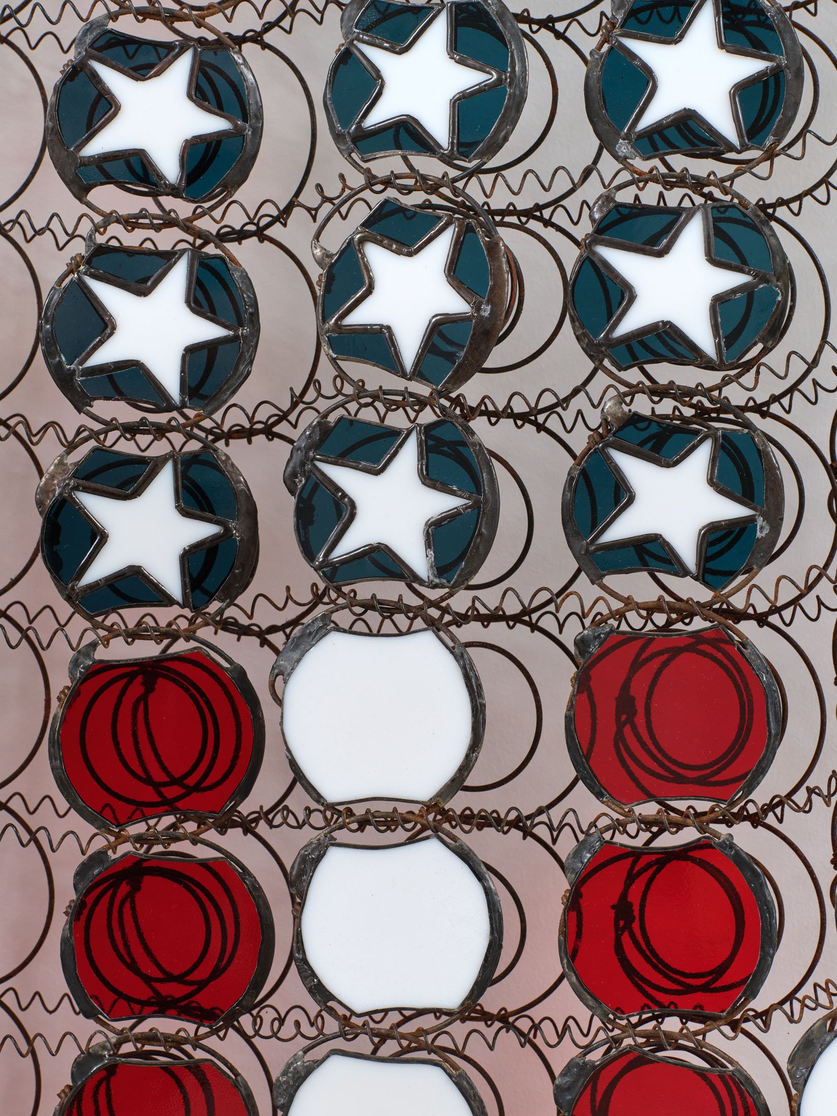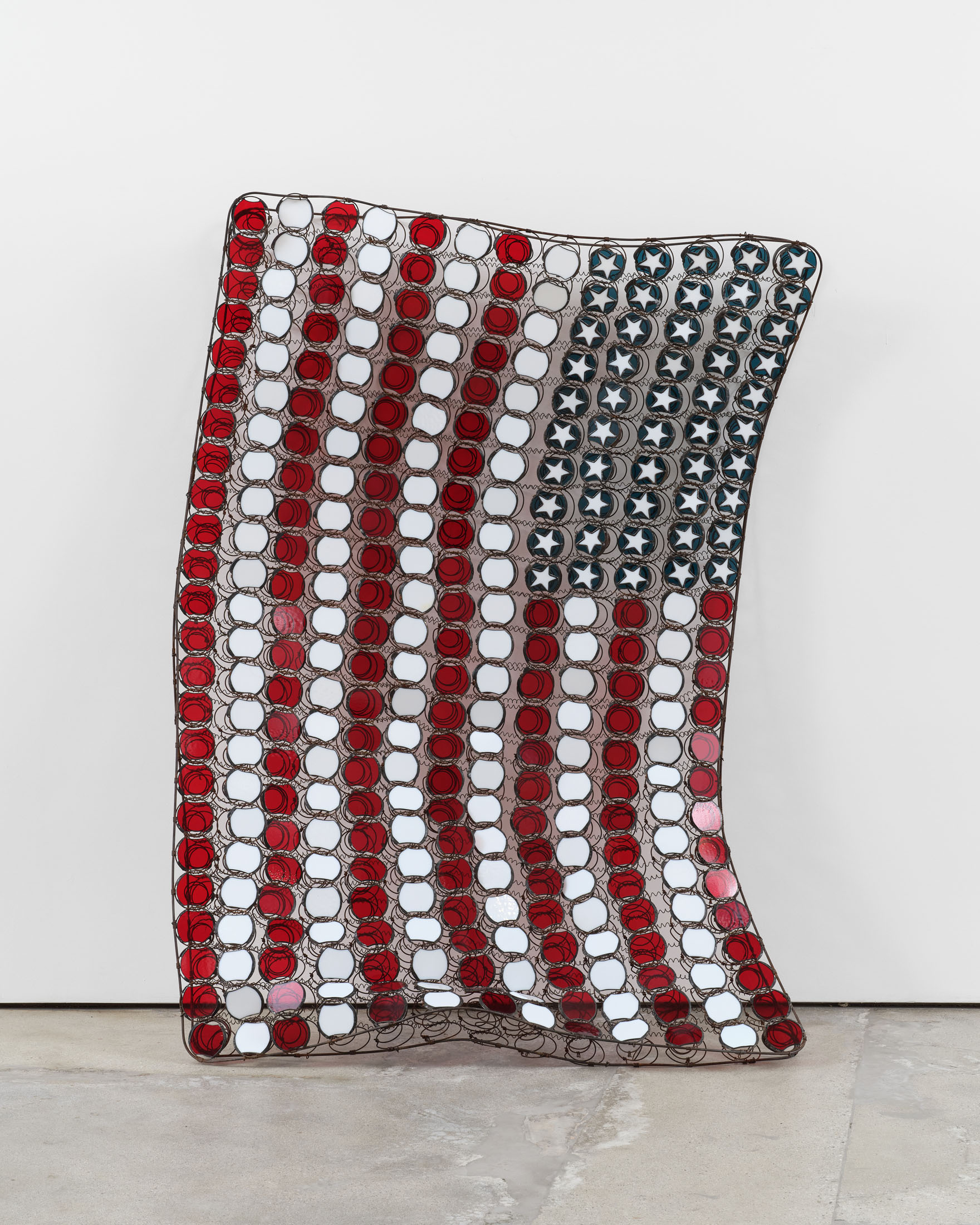 The exhibition begins with a discarded mattress bedspring found in Los Angeles in 2024. fahler came across it while running, an integral part of his studio practice. For months it leaned on a studio wall until one day it revealed itself as a flag. The thirteen rows of springs became rows of red and white stripes. That act of recognition became the first gesture in this body of work, built from what was discarded and found around Los Angeles. flag was the last piece fahler made in the U.S., a quiet artifact that marks the end of an era for him.
