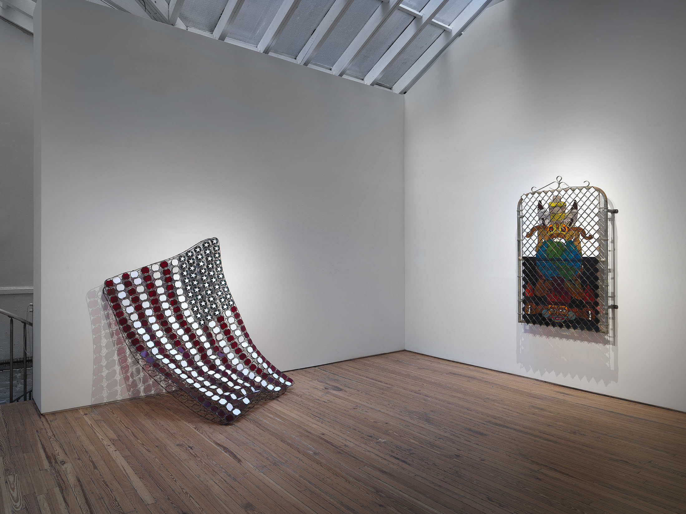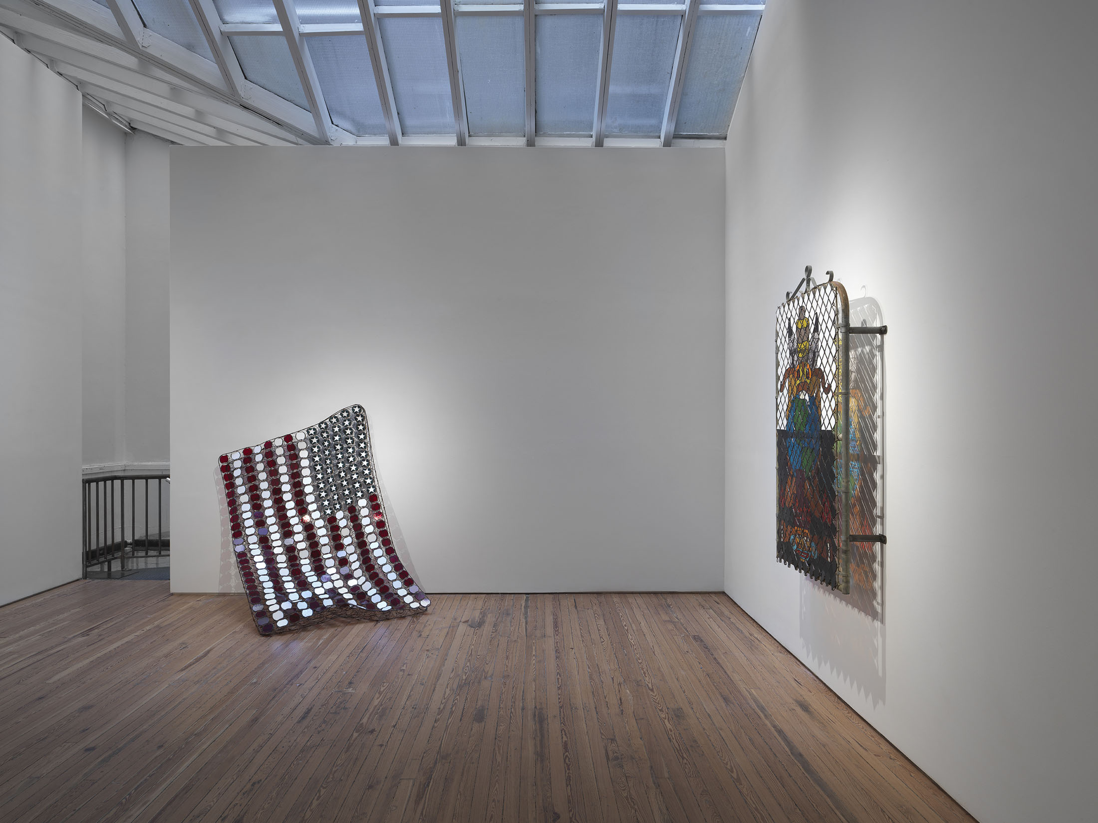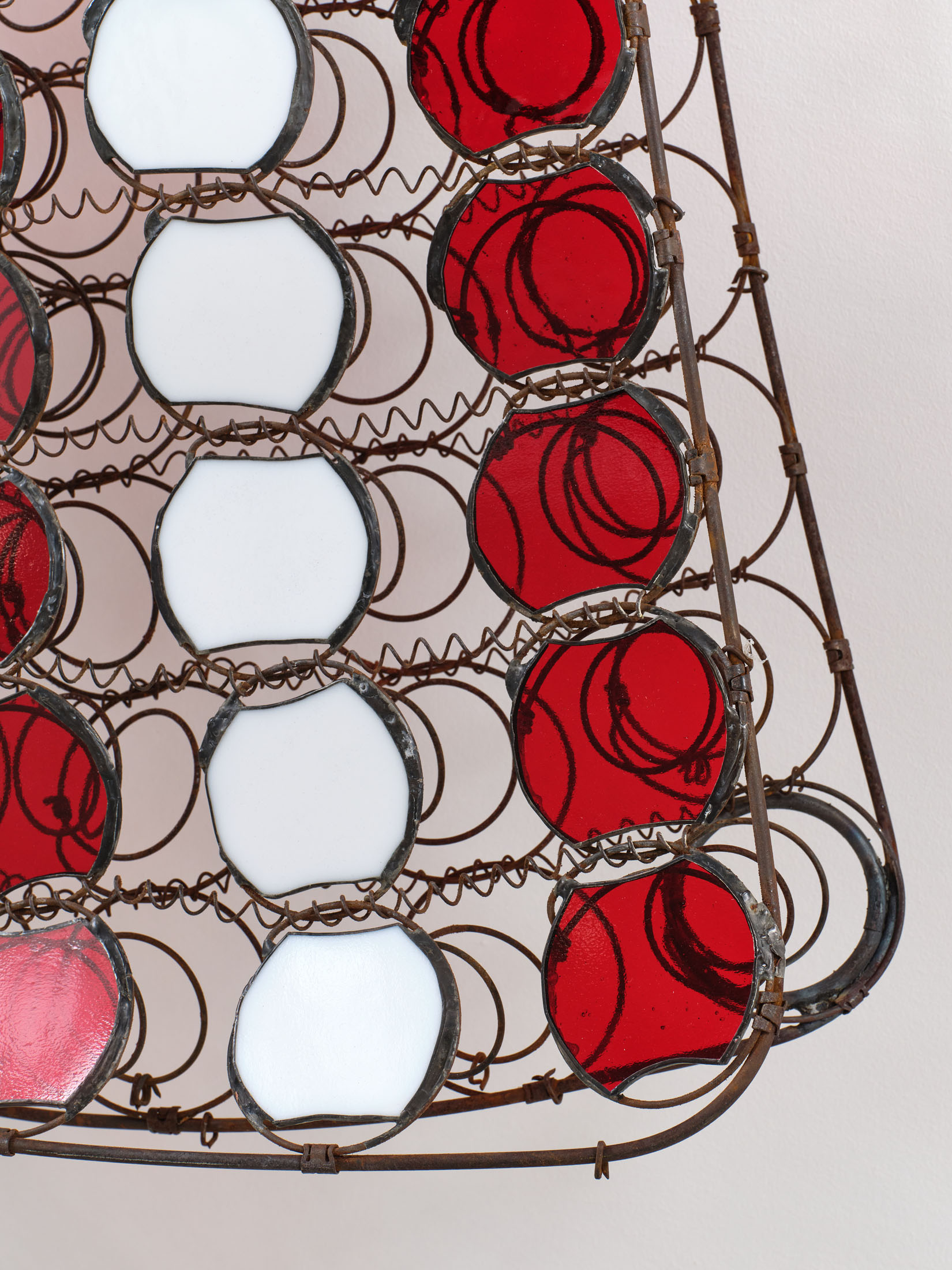 The exhibition begins with a discarded mattress bedspring found in Los Angeles in 2024. fahler came across it while running, an integral part of his studio practice. For months it leaned on a studio wall until one day it revealed itself as a flag. The thirteen rows of springs became rows of red and white stripes. That act of recognition became the first gesture in this body of work, built from what was discarded and found around Los Angeles. flag was the last piece fahler made in the U.S., a quiet artifact that marks the end of an era for him.