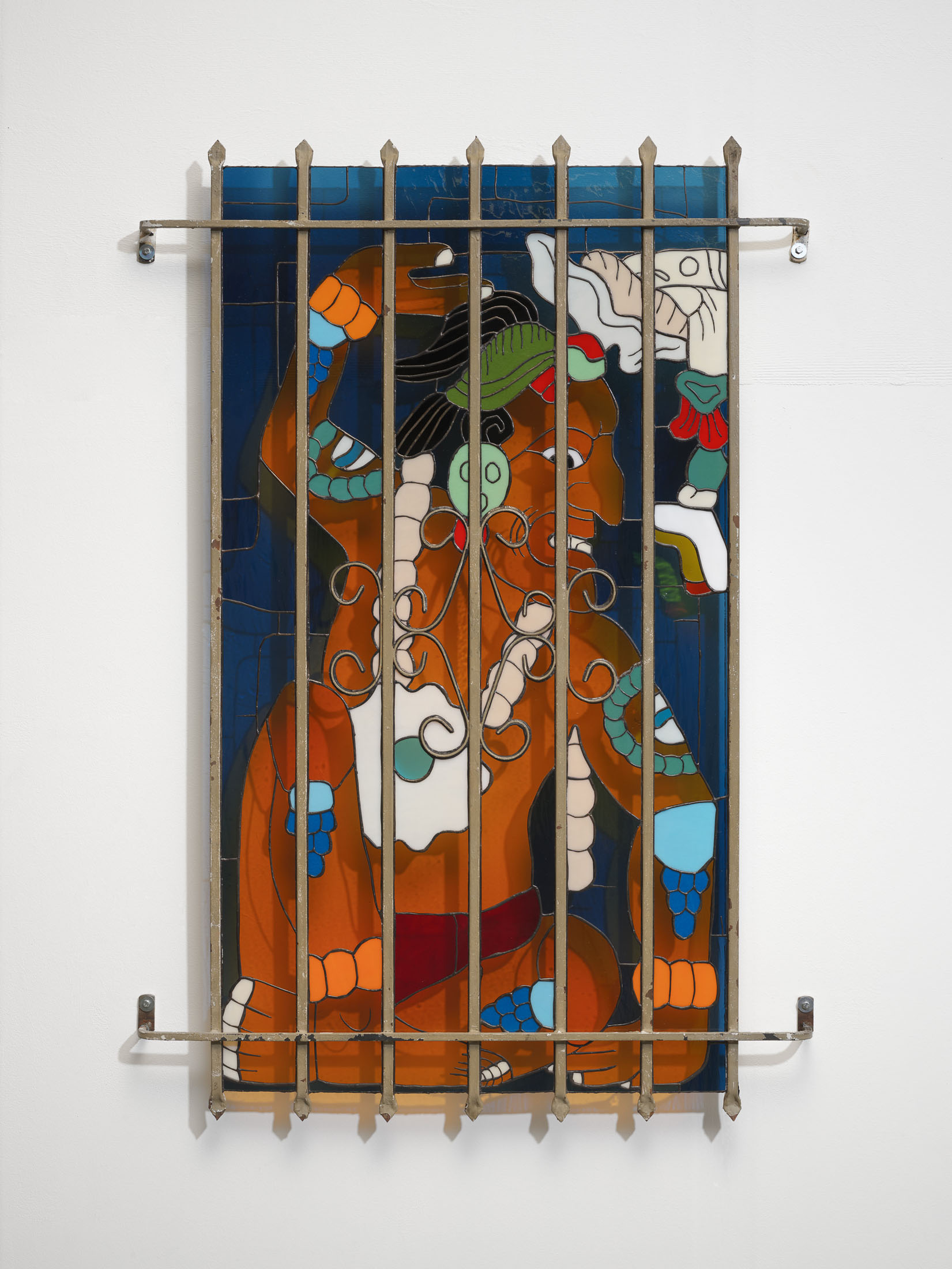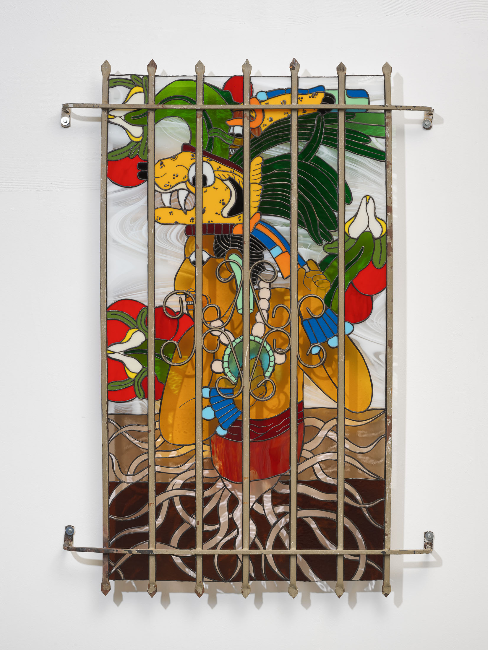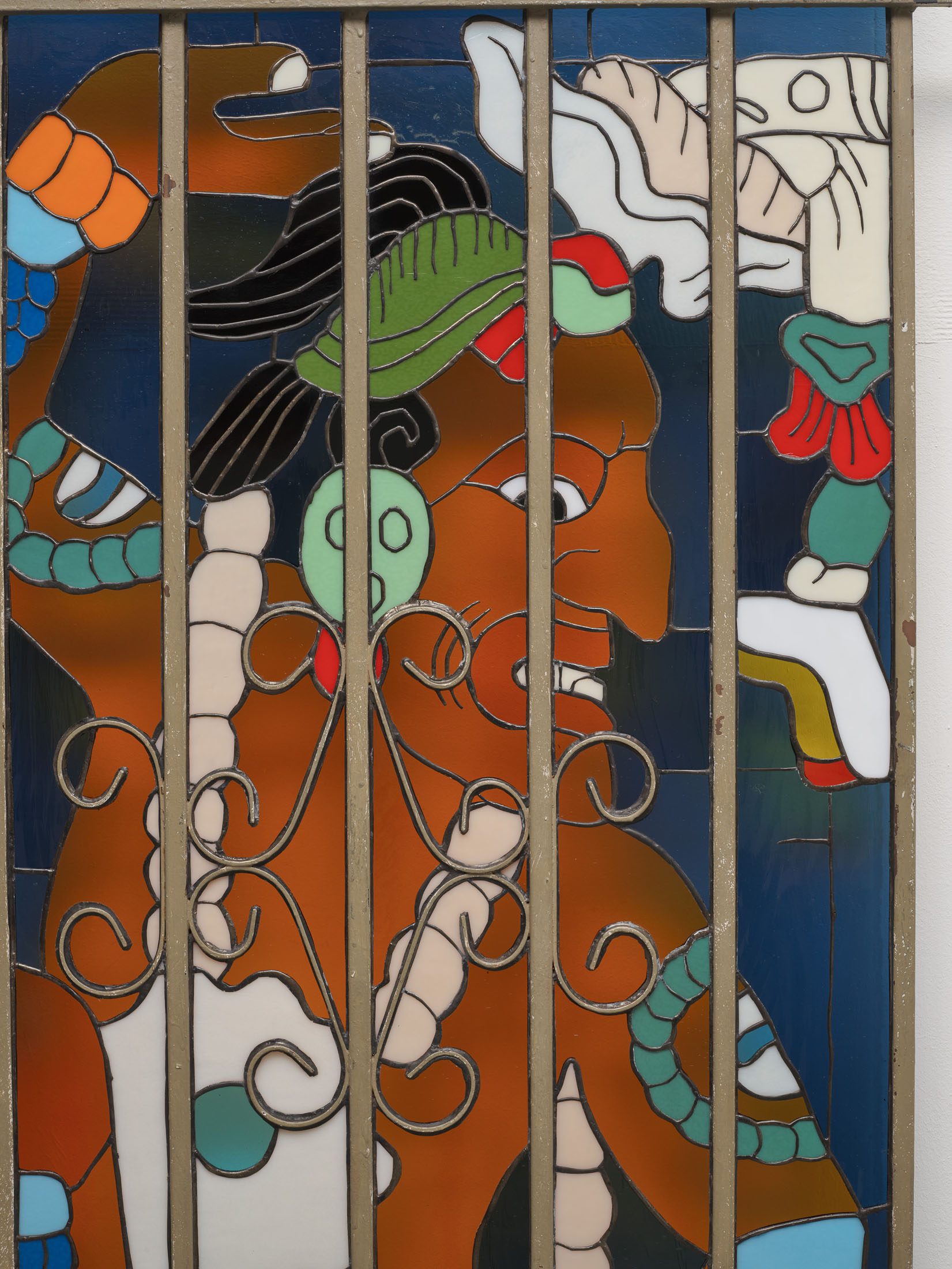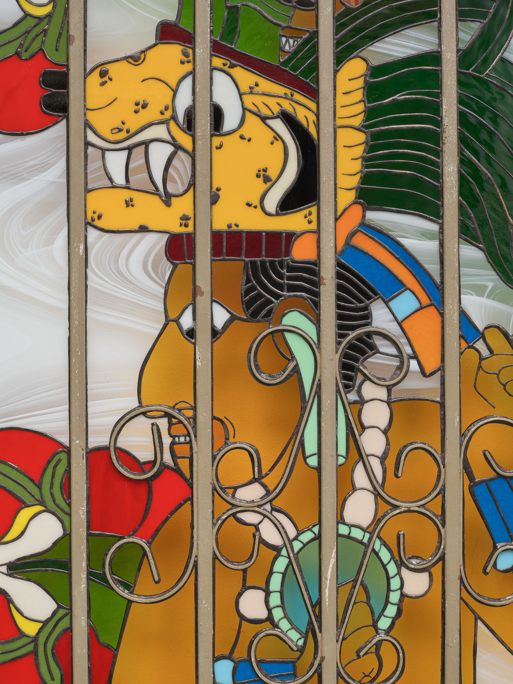 From there, the materials began to guide him toward imagery that contrasts the ancient with the contemporary. The White House appears as a façade, like a stage prop or an empty shell, holding only the idea of something. The Mayan bee god Ah Muzen Cab shows up in glass with coin eyes and earpieces, a meditation on ecological loss, its link to economic fragility, and early notions of capital and class hierarchy. The Skybearer and Earthbearer, drawn from the tomb of Pakal, seem to hold a world that’s slipping apart. Smaller images pulled from Mayan codices—skulls, serpents, fragments of glyphs—echo the endless cycle of creation and destruction that belongs to both myth and the present.