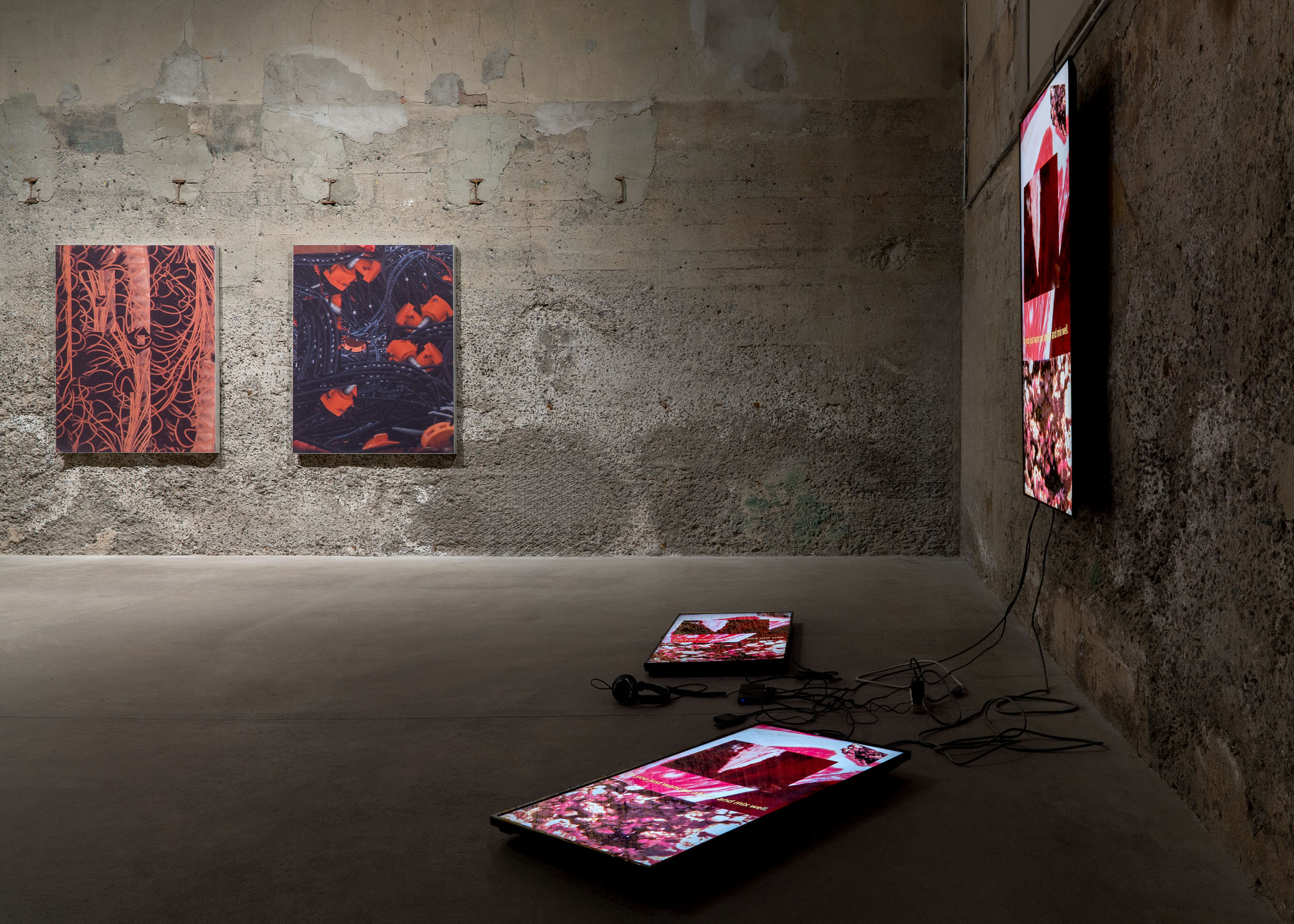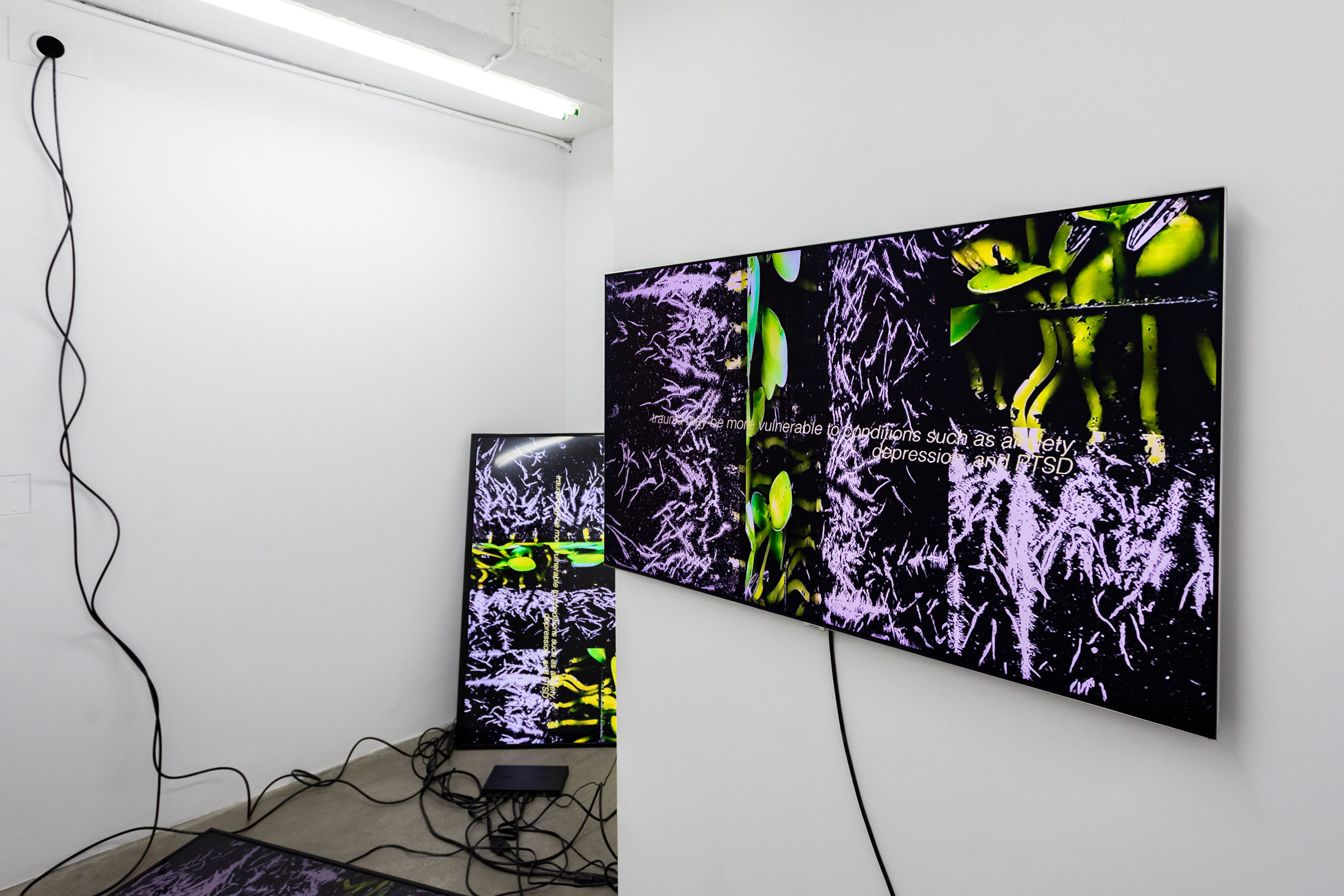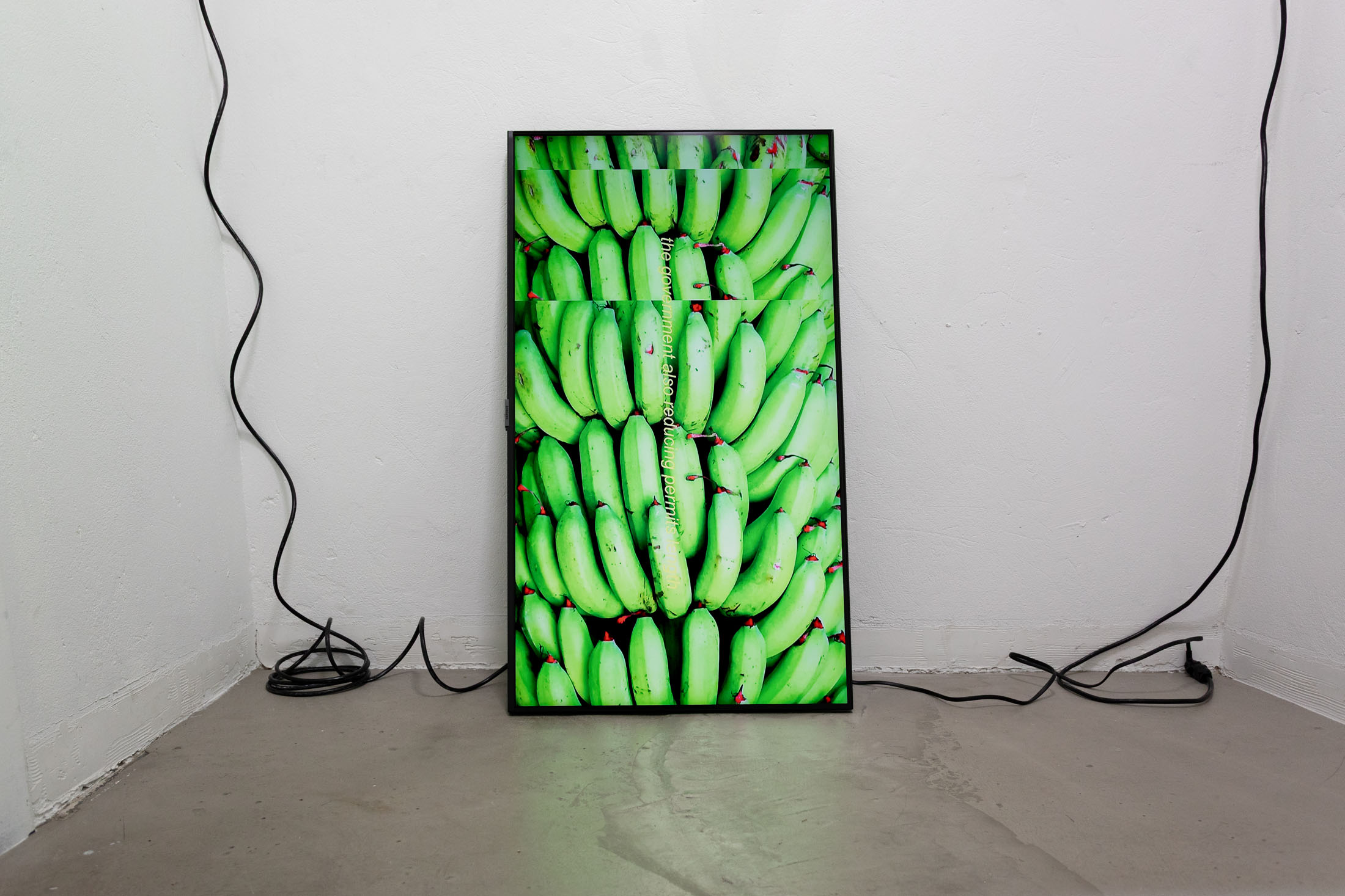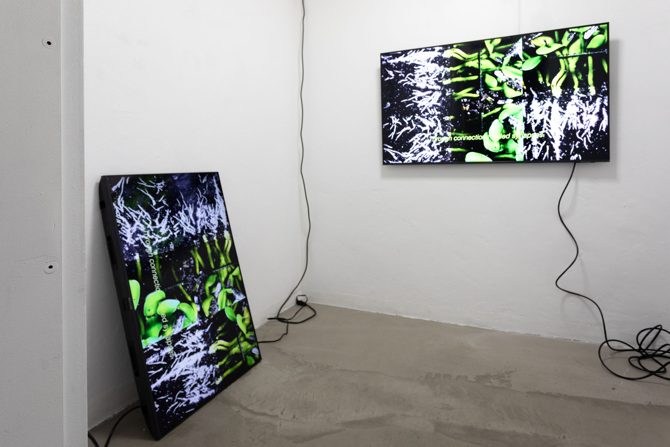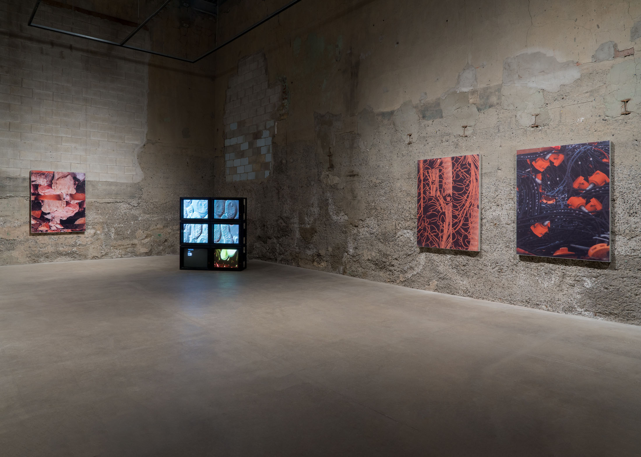 The imagery moves between infrastructural and organic registers: wiring systems appear alongside igneous foundations, biological traces of growth, and the human body. These material juxtapositions underscore how technological networks and environmental processes mirror one another in their fragility and capacity for transformation. The artworks take form as vessels for advertising, presented on commercial signage and screens, using the language of public display to question how images circulate, persuade, and shape collective understanding.