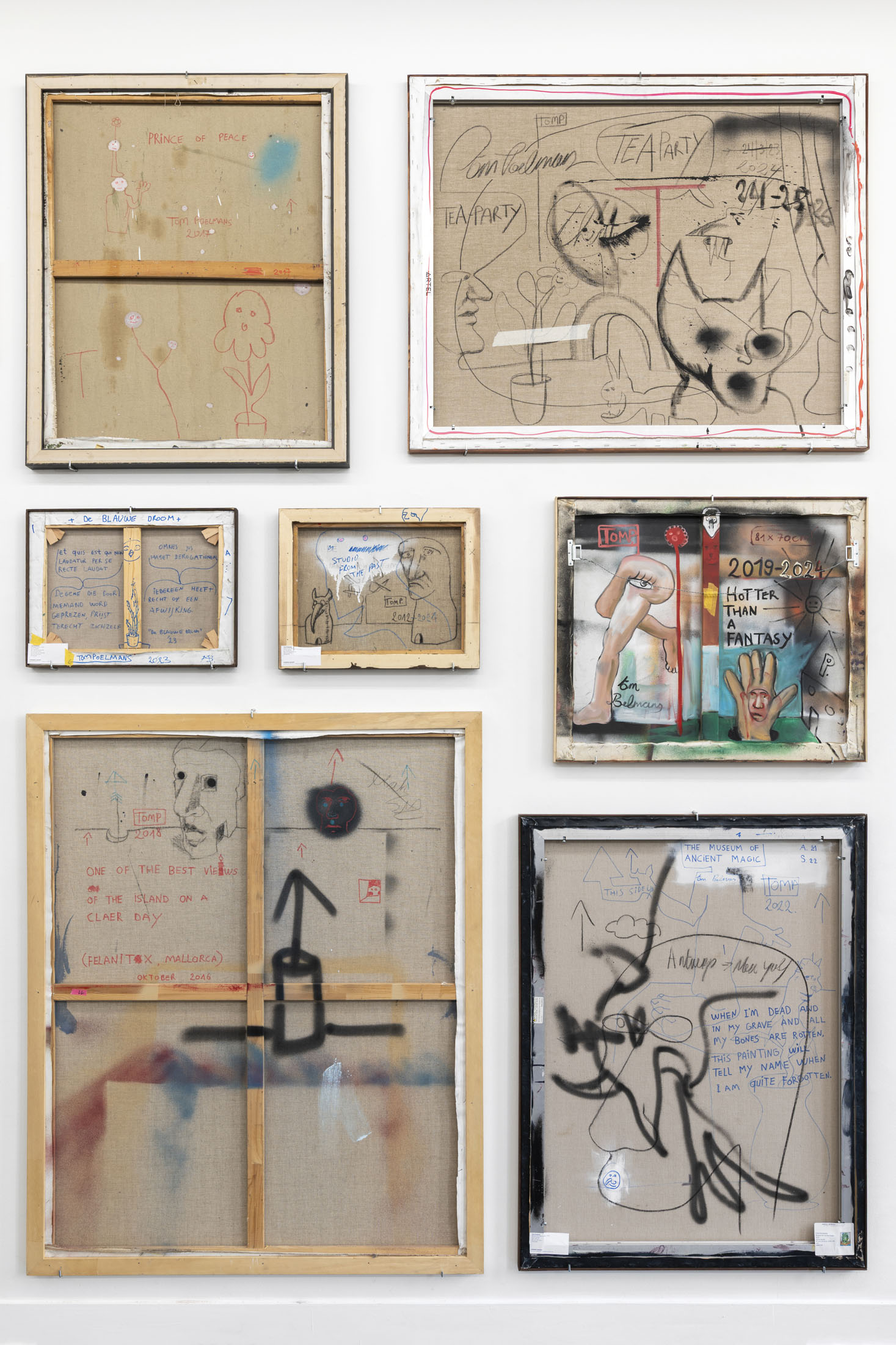 On December 6, two weeks prior to the closing of the show, all works will be turned around, revealing their front sides for the first time. That same day, the book A Spirit in Painting will be launched, published by MER. Alongside front and back views of a broad selection of works, the book includes drawings and poems by Tom Poelmans, as well as texts by people close to him.