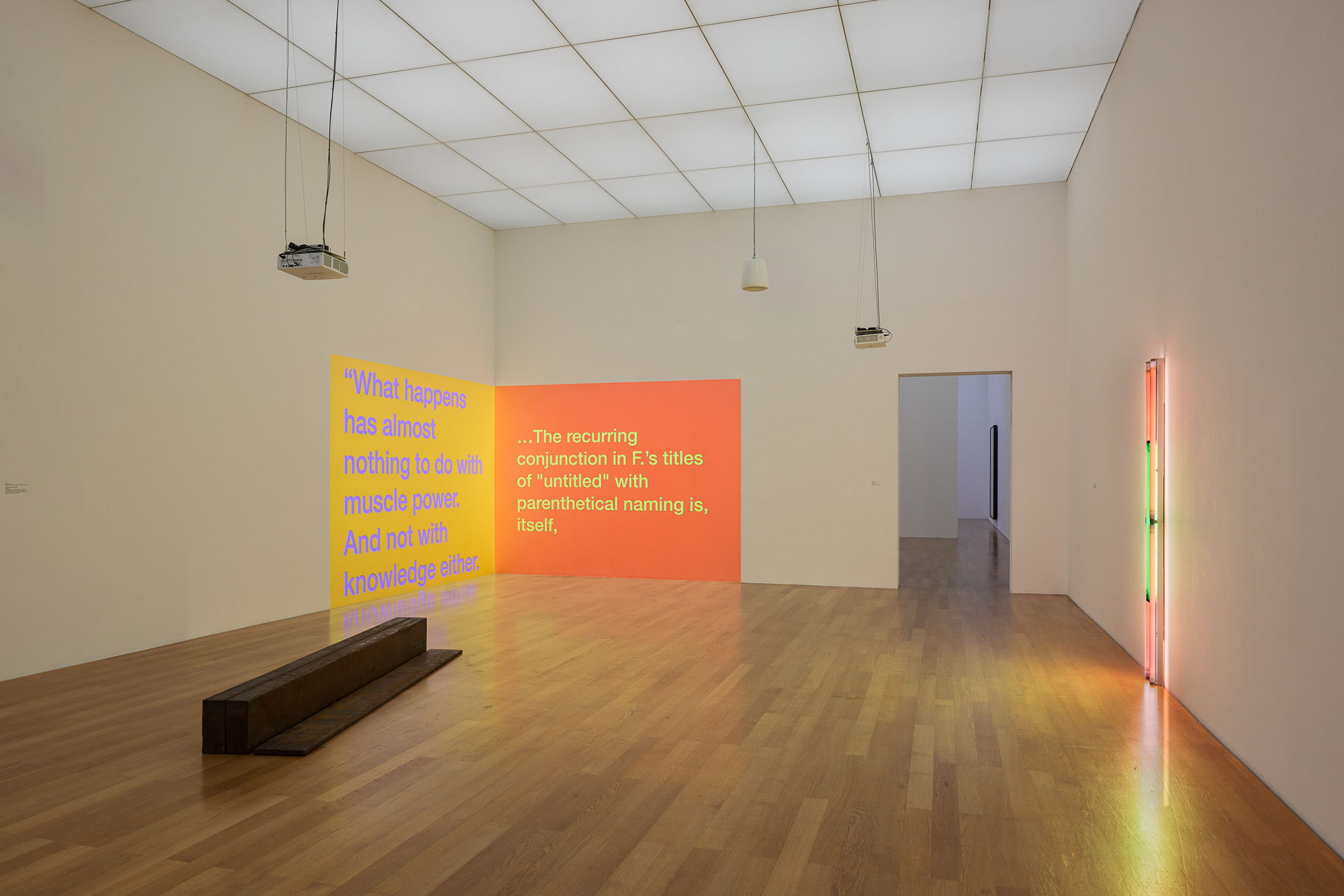 The exhibition at Kunstmuseum Liechtenstein ties in with Cokes’ recently increasing focus on the history and reception of conceptual art and minimalism: he presents exclusively works from his oeuvre that engage with personalities and themes from the fields of visual art and music. Cokes combines them with works by Nazgol Ansarinia, Bill Bollinger, James Lee Byars, Dan Flavin, Dan Graham, Anne Marie Jehle, Donald Judd, Gary Kuehn, Allan McCollum, Liliana Moro, Cady Noland, Steven Parrino, Pope.L, Fred Sandback, Richard Serra and Andy Warhol. The artist chose the works himself. The structure of Let Yourself Be Free is informed by Tony Cokes’s oeuvre and method. At the same time, the exhibition raises questions related to curating and what it means for artists to act as curators.
