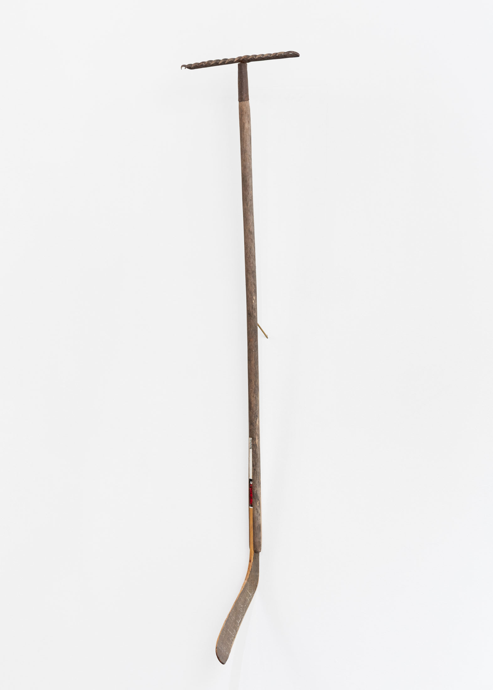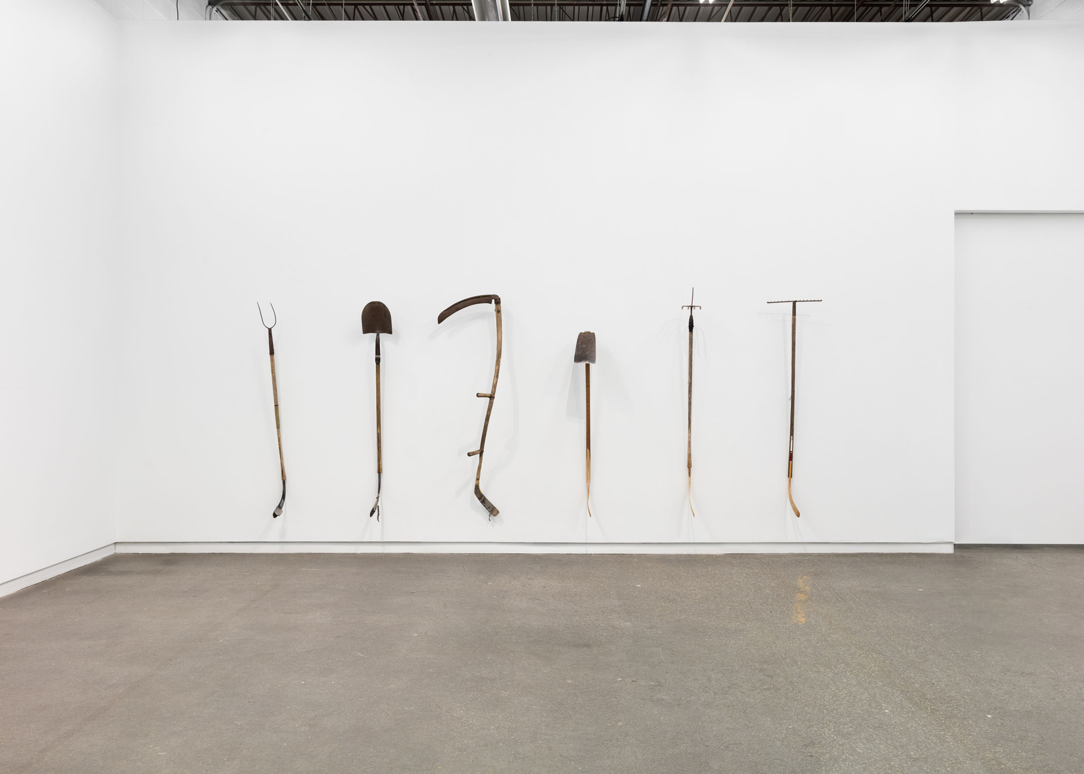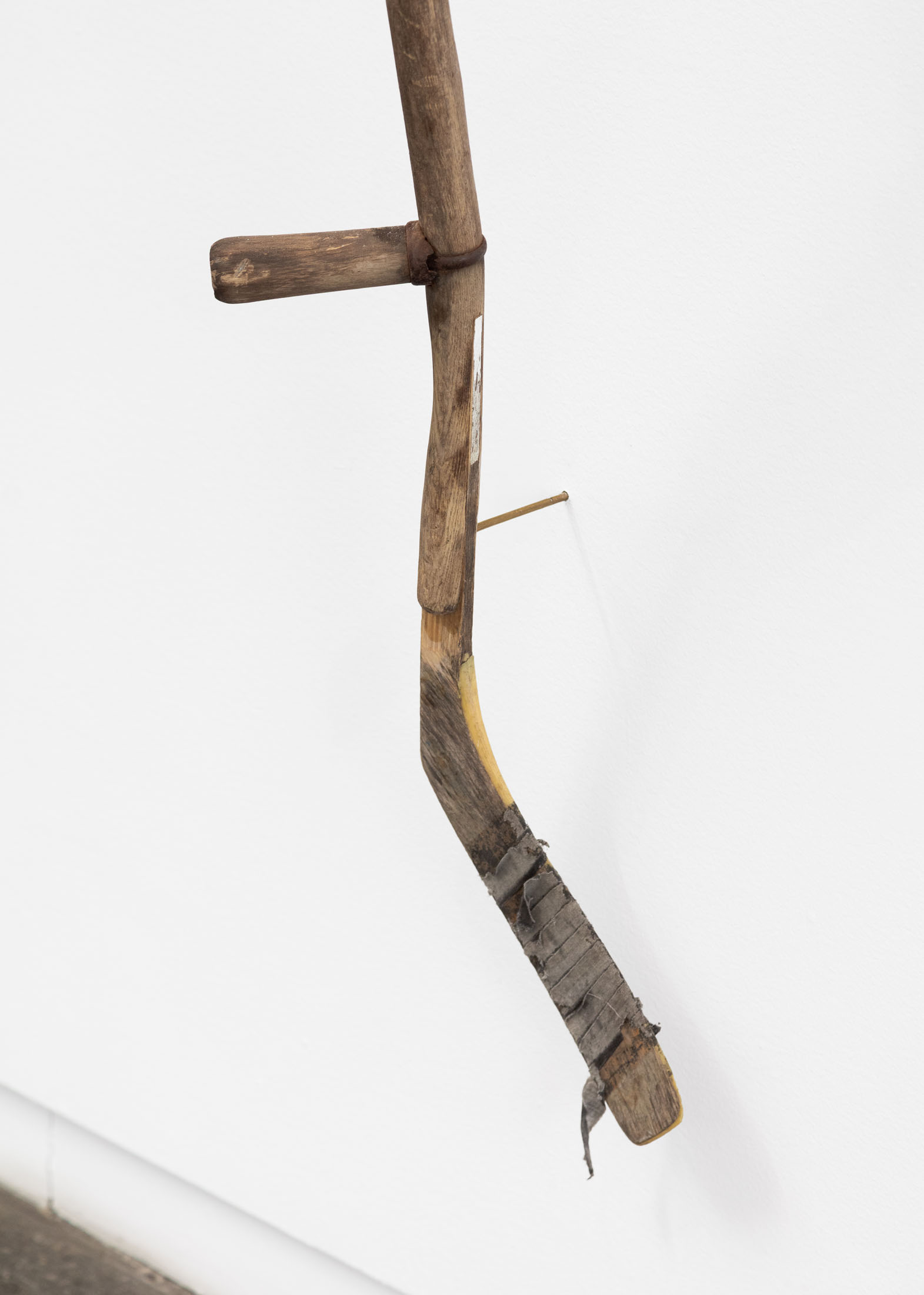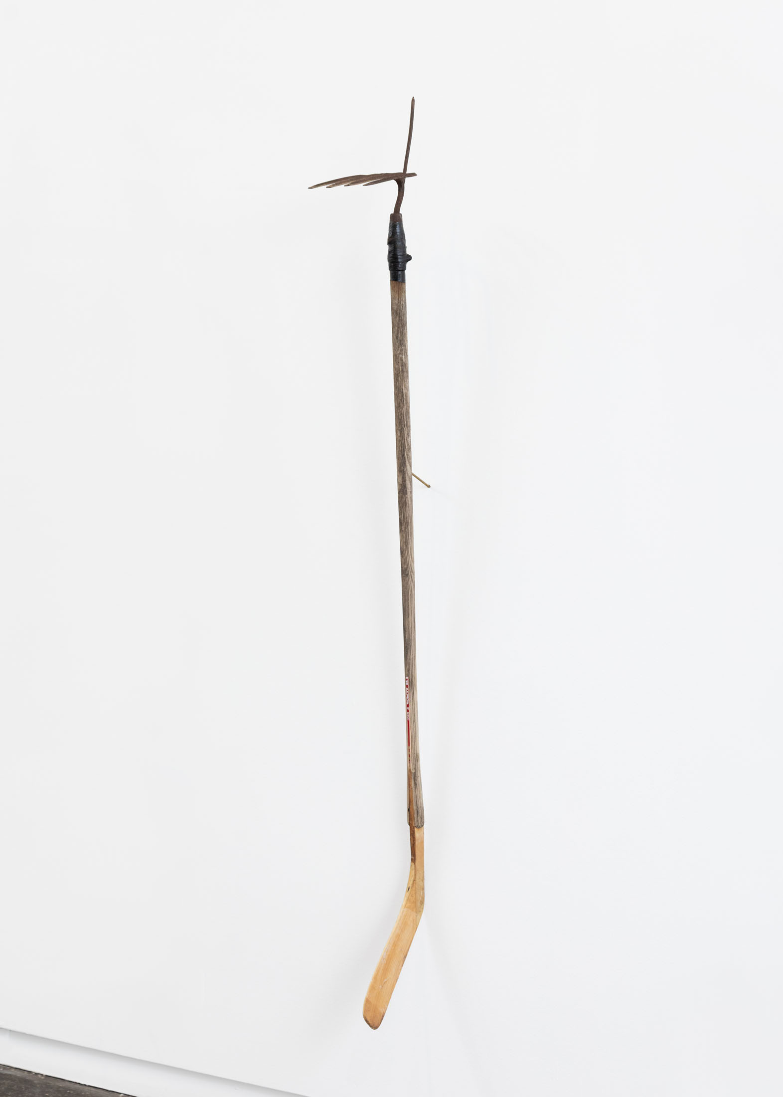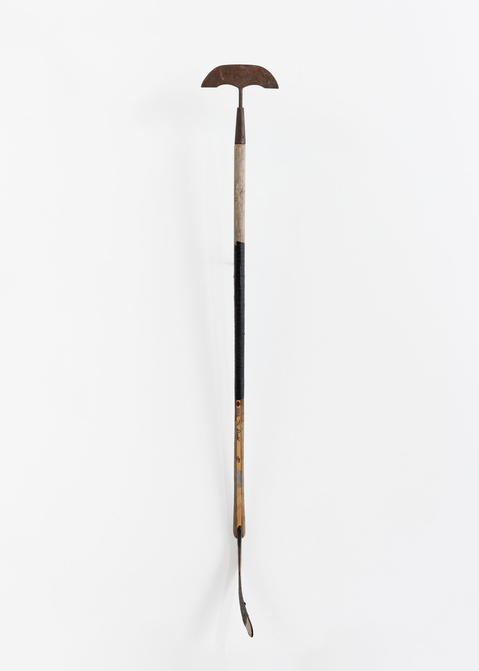 First exhibited at the MOCA GTA Triennial in 2021, Ploughing Liberty is an ongoing series born from Oluseye’s research on the migration of Loyalists, Jamaican Maroons, and fugitive slaves who moved to Nova Scotia and Ontario in the late 18th century, often with the near impossible task of farming a hard and unforgiving landscape. The antique farm tools, worn with hard use, reference those who spent their lives trying to make the rocky, infertile land arable. Fusing these tools with discarded hockey sticks—a sport from which Black presences are often elided—the resulting works bring up questions of labour and leisure, belonging and exclusion, within the Canadian settler state. “Close inspection of the sculptures reveals the traces of use in the wood. These imperfections appear as historical repositories, or precise markers of bygone labour and play. The places on the farming tools where the handles appear slim denote wear; the work of hands making wood smooth.”[2] These works also link the history of Black labour in Canada with the present-day labour of agricultural workers from the Caribbean and Latin America on Ontario’s farms, where close to 27,000 temporary foreign workers were employed in 2021.