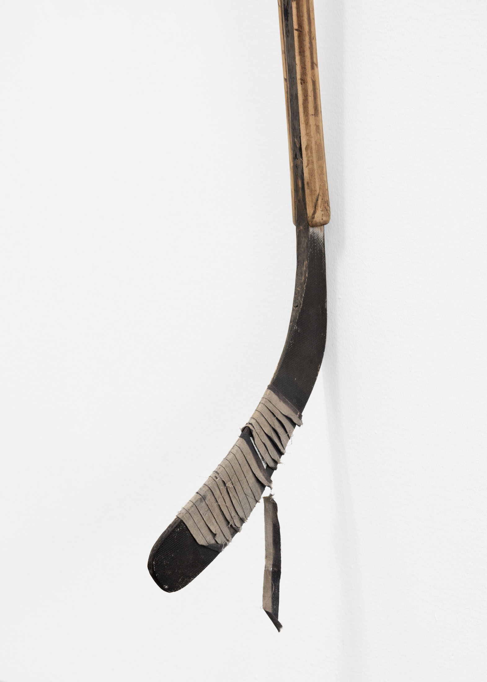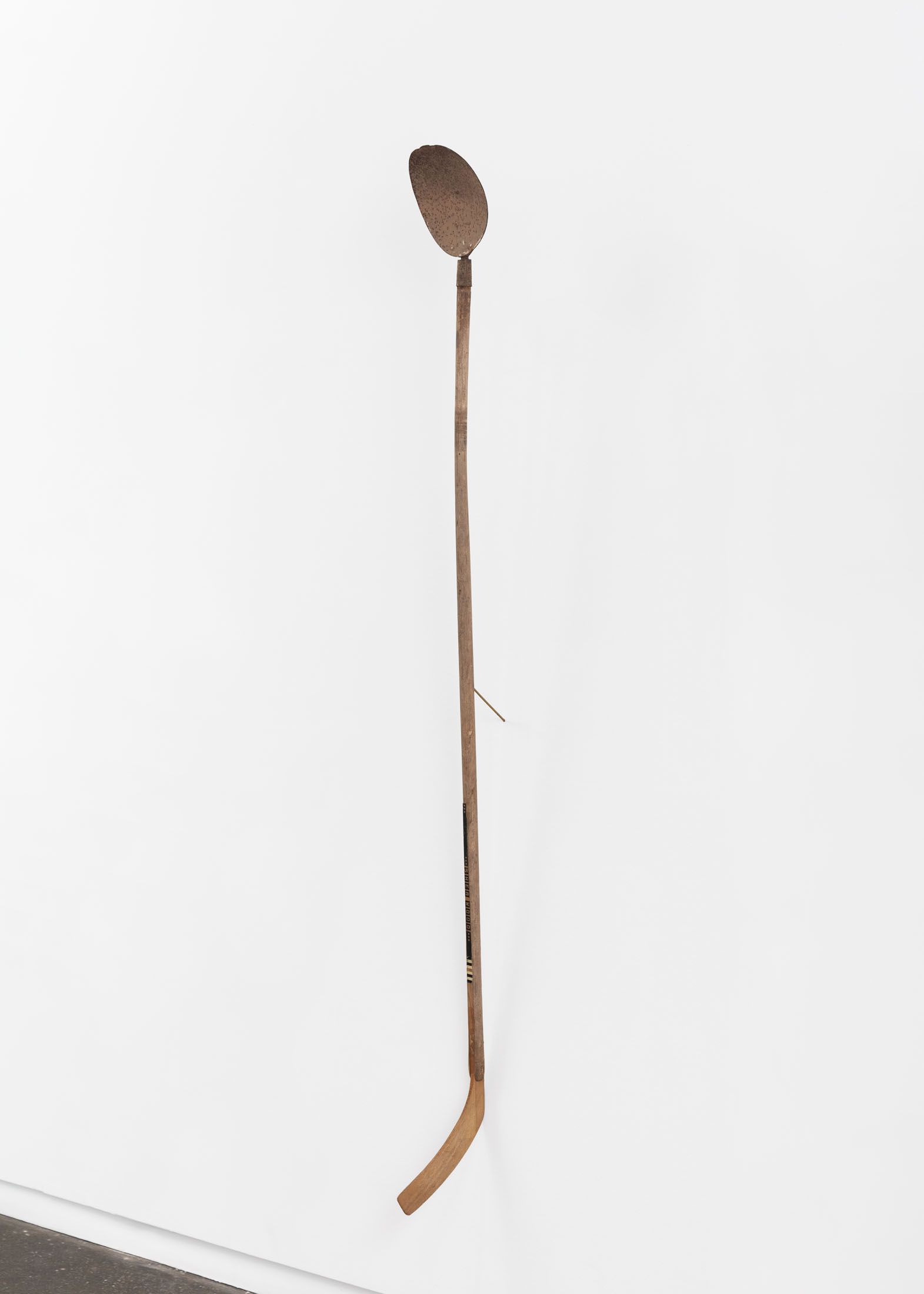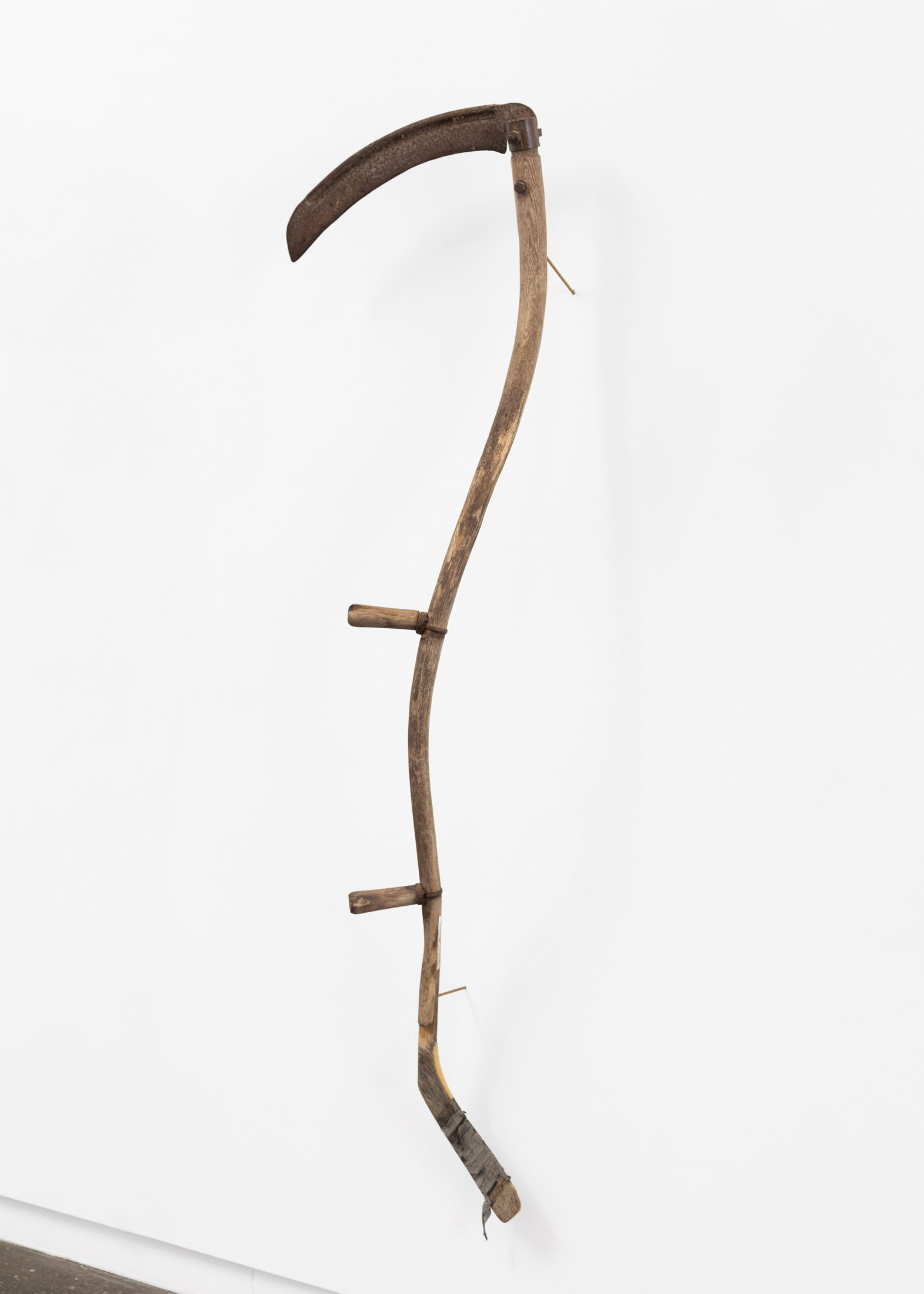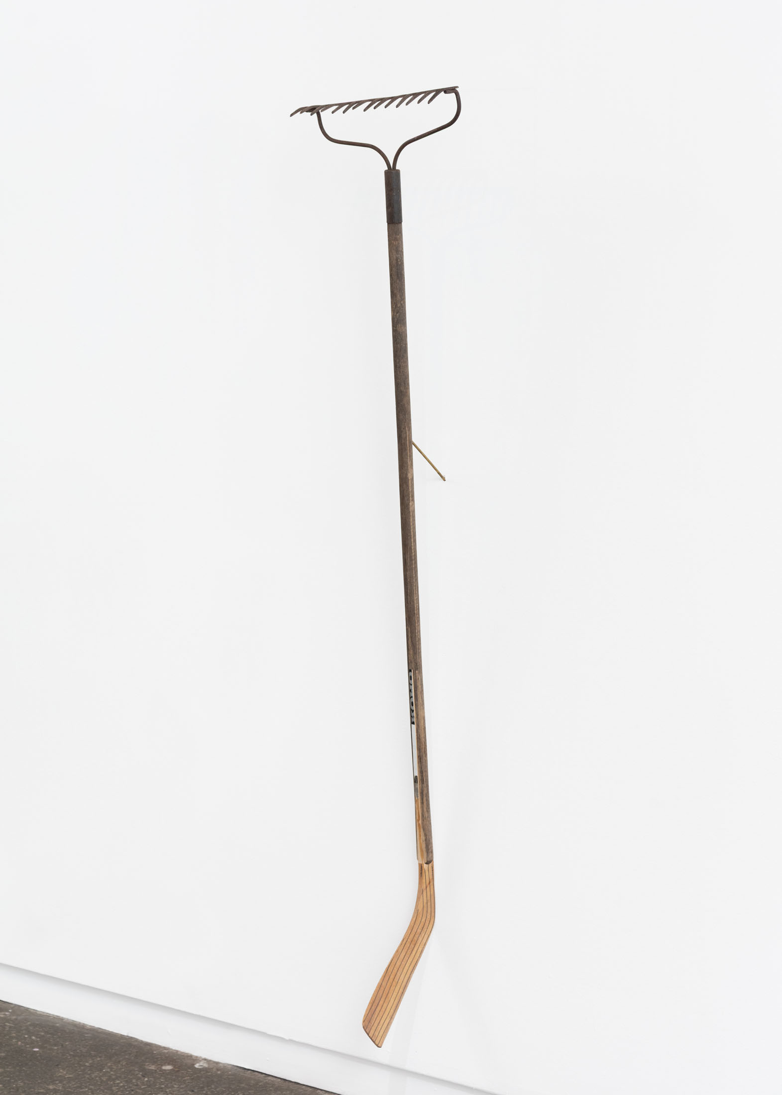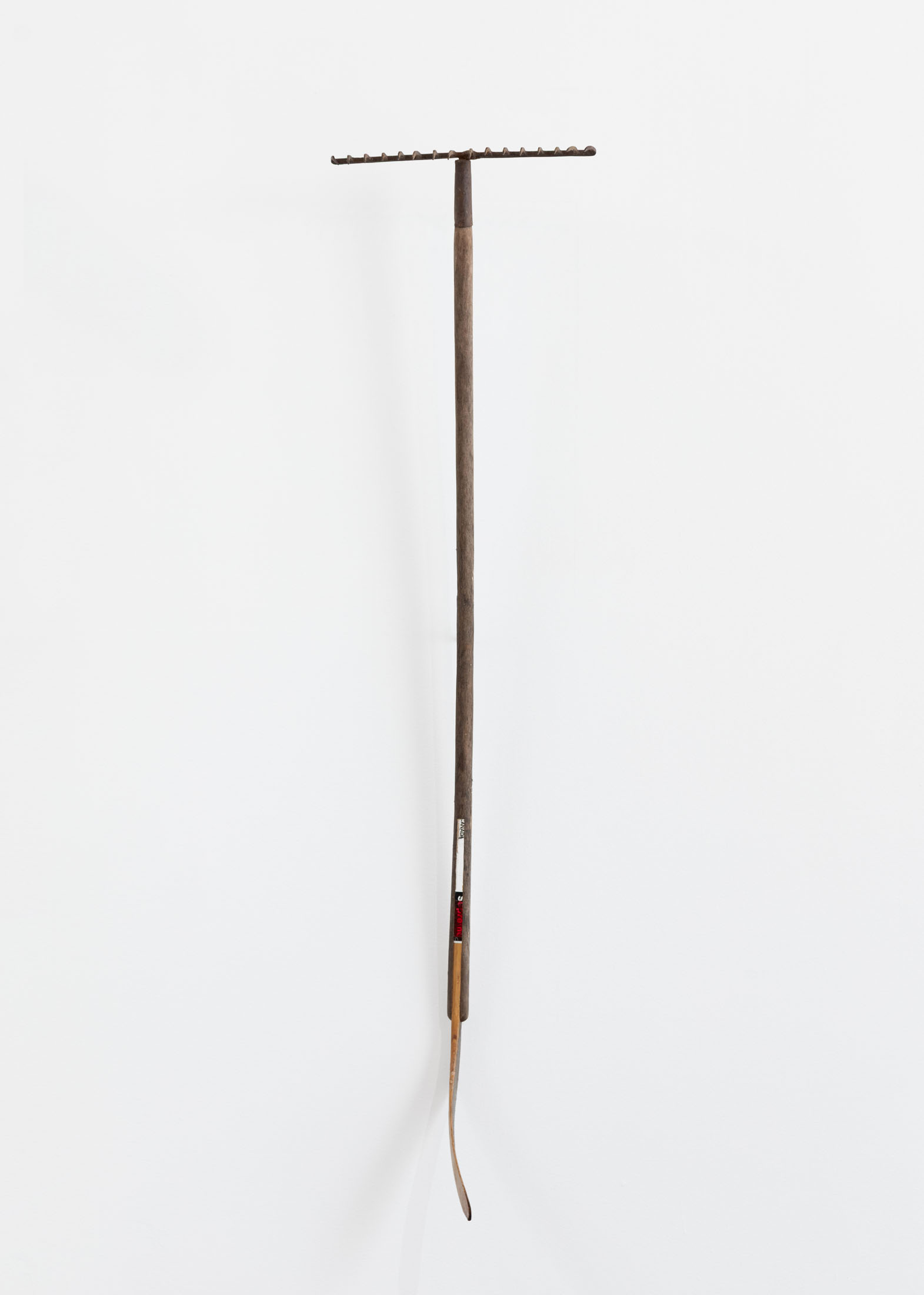 First exhibited at the MOCA GTA Triennial in 2021, Ploughing Liberty is an ongoing series born from Oluseye’s research on the migration of Loyalists, Jamaican Maroons, and fugitive slaves who moved to Nova Scotia and Ontario in the late 18th century, often with the near impossible task of farming a hard and unforgiving landscape. The antique farm tools, worn with hard use, reference those who spent their lives trying to make the rocky, infertile land arable. Fusing these tools with discarded hockey sticks—a sport from which Black presences are often elided—the resulting works bring up questions of labour and leisure, belonging and exclusion, within the Canadian settler state. “Close inspection of the sculptures reveals the traces of use in the wood. These imperfections appear as historical repositories, or precise markers of bygone labour and play. The places on the farming tools where the handles appear slim denote wear; the work of hands making wood smooth.”[2] These works also link the history of Black labour in Canada with the present-day labour of agricultural workers from the Caribbean and Latin America on Ontario’s farms, where close to 27,000 temporary foreign workers were employed in 2021.