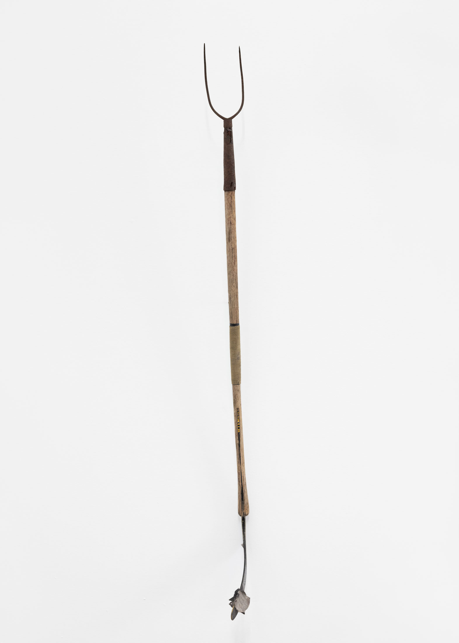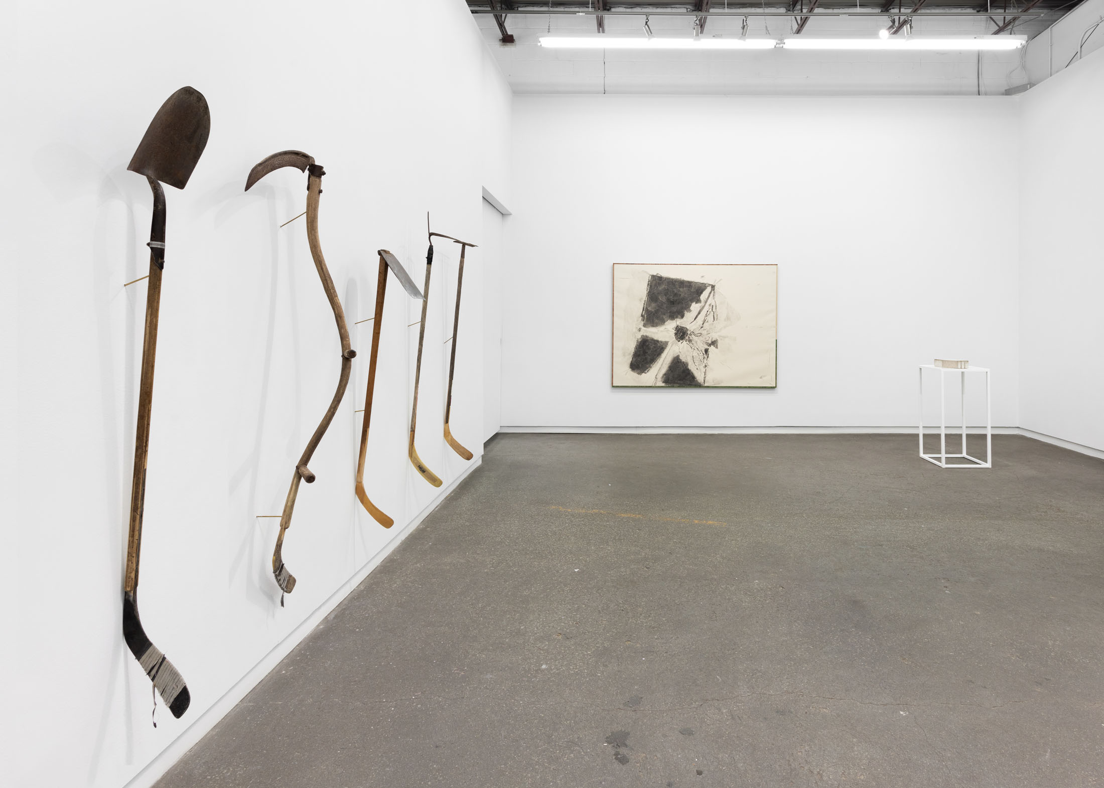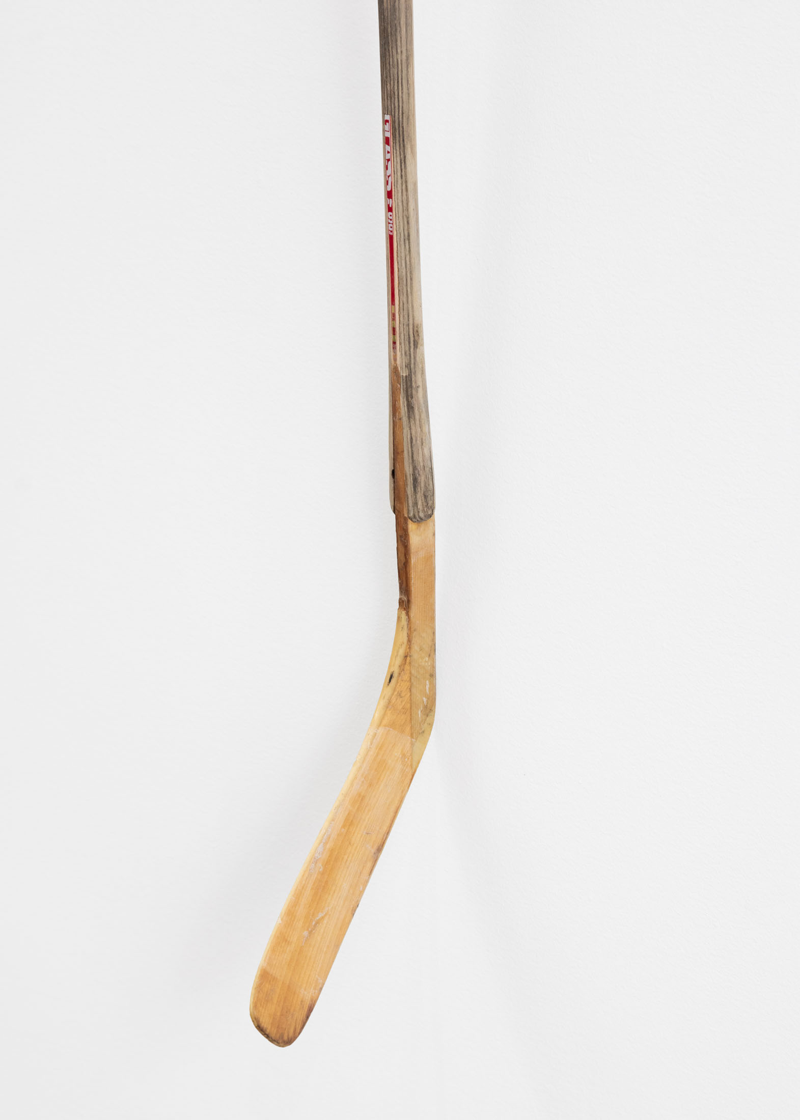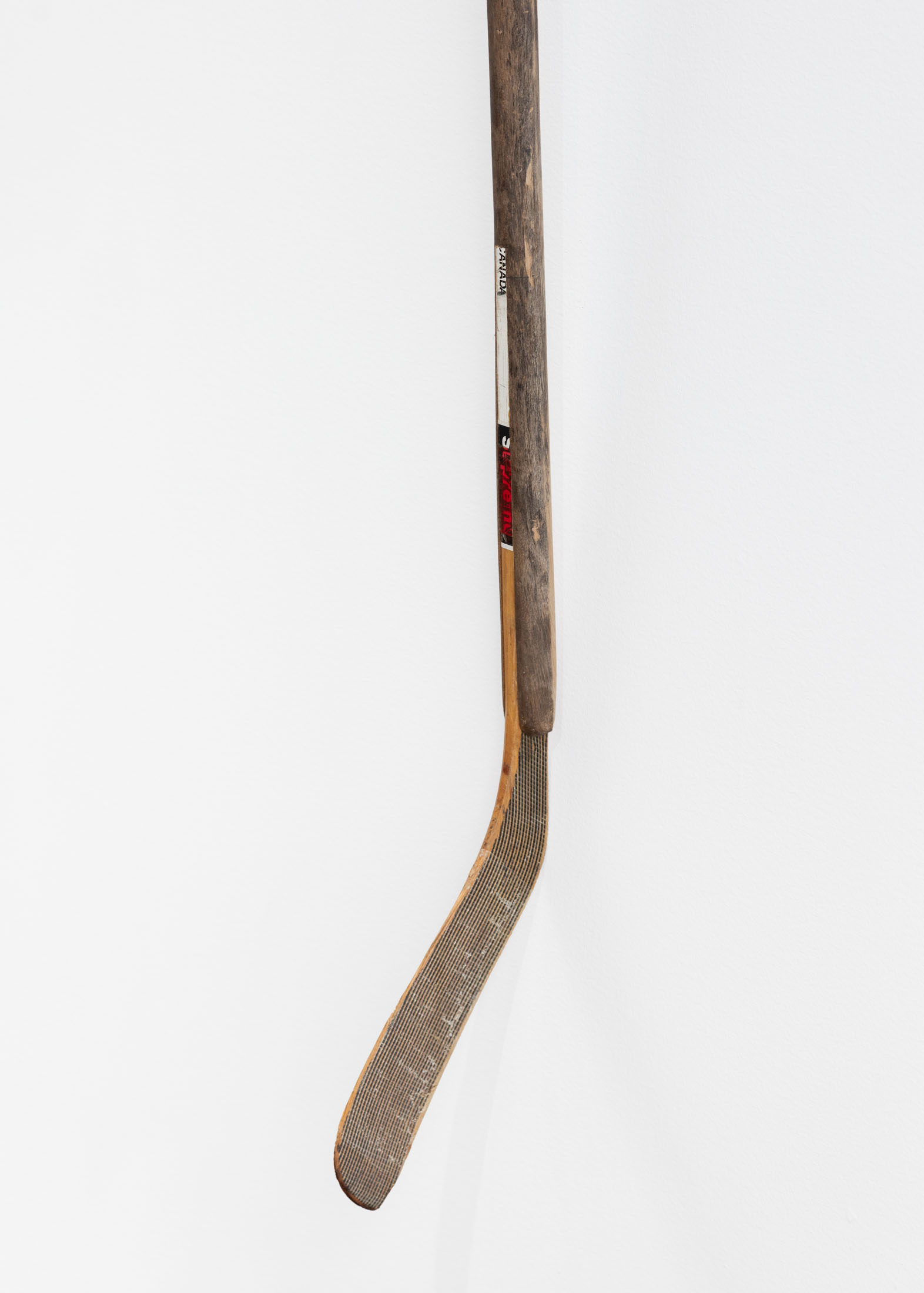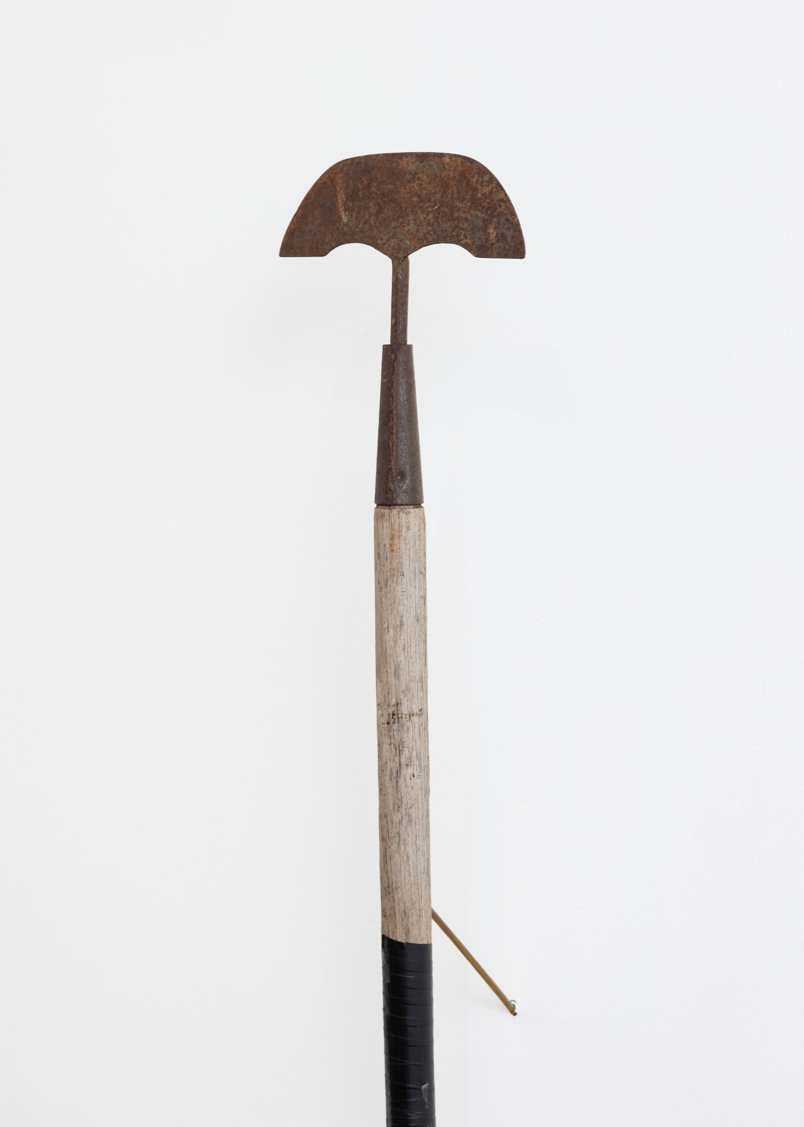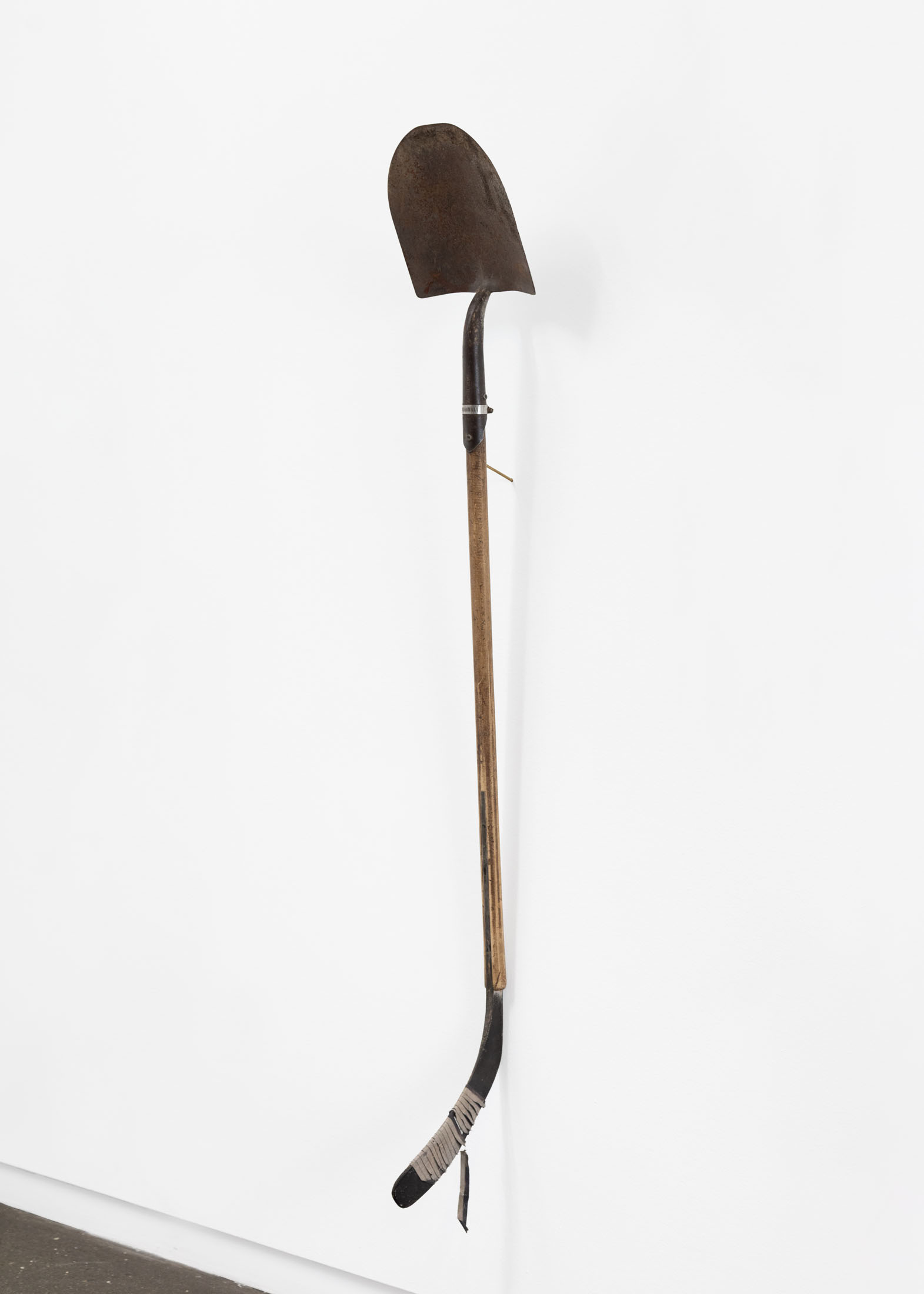 First exhibited at the MOCA GTA Triennial in 2021, Ploughing Liberty is an ongoing series born from Oluseye’s research on the migration of Loyalists, Jamaican Maroons, and fugitive slaves who moved to Nova Scotia and Ontario in the late 18th century, often with the near impossible task of farming a hard and unforgiving landscape. The antique farm tools, worn with hard use, reference those who spent their lives trying to make the rocky, infertile land arable. Fusing these tools with discarded hockey sticks—a sport from which Black presences are often elided—the resulting works bring up questions of labour and leisure, belonging and exclusion, within the Canadian settler state. “Close inspection of the sculptures reveals the traces of use in the wood. These imperfections appear as historical repositories, or precise markers of bygone labour and play. The places on the farming tools where the handles appear slim denote wear; the work of hands making wood smooth.”[2] These works also link the history of Black labour in Canada with the present-day labour of agricultural workers from the Caribbean and Latin America on Ontario’s farms, where close to 27,000 temporary foreign workers were employed in 2021.