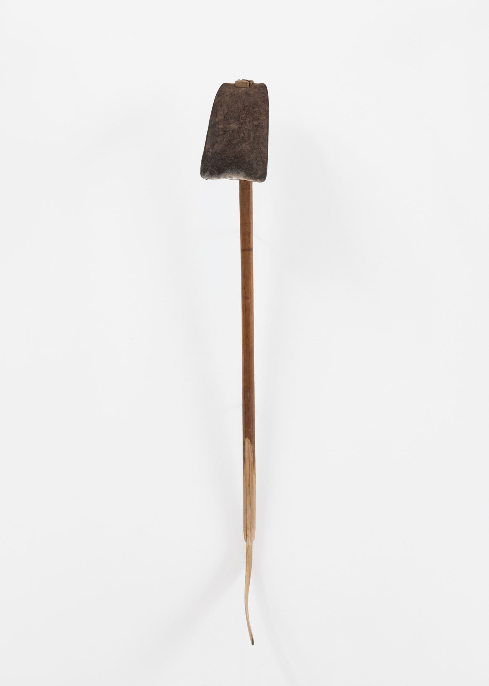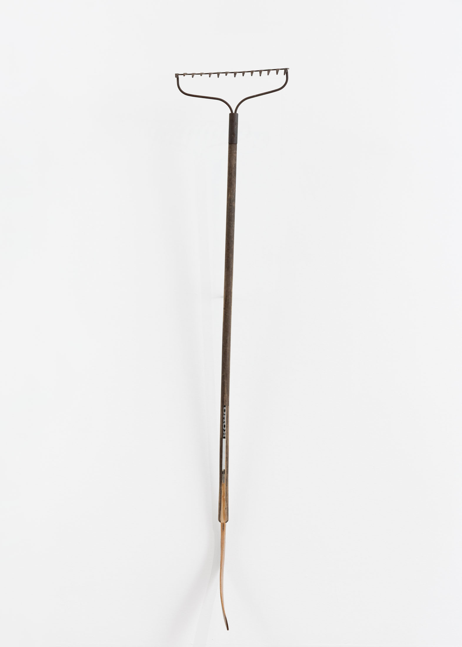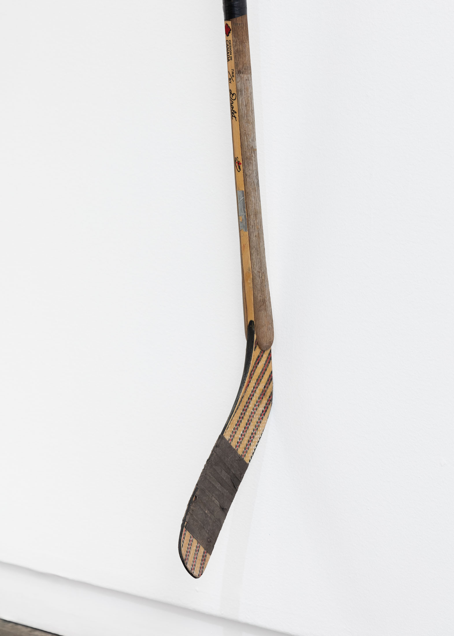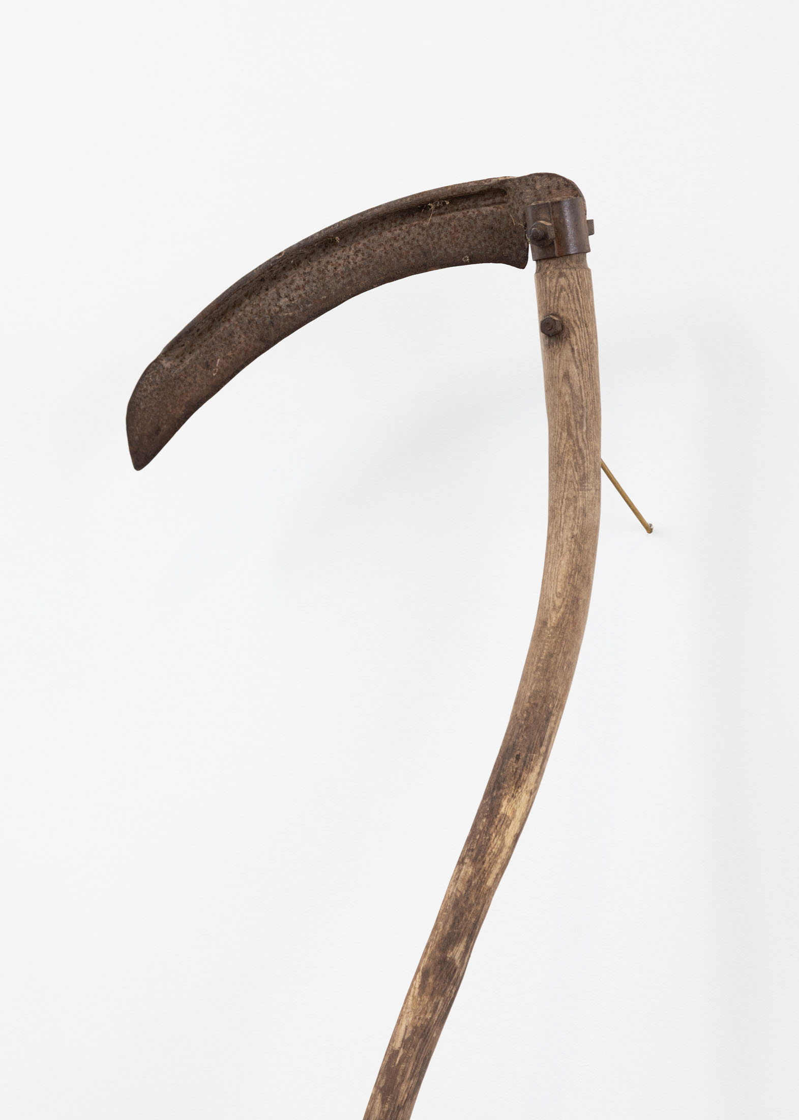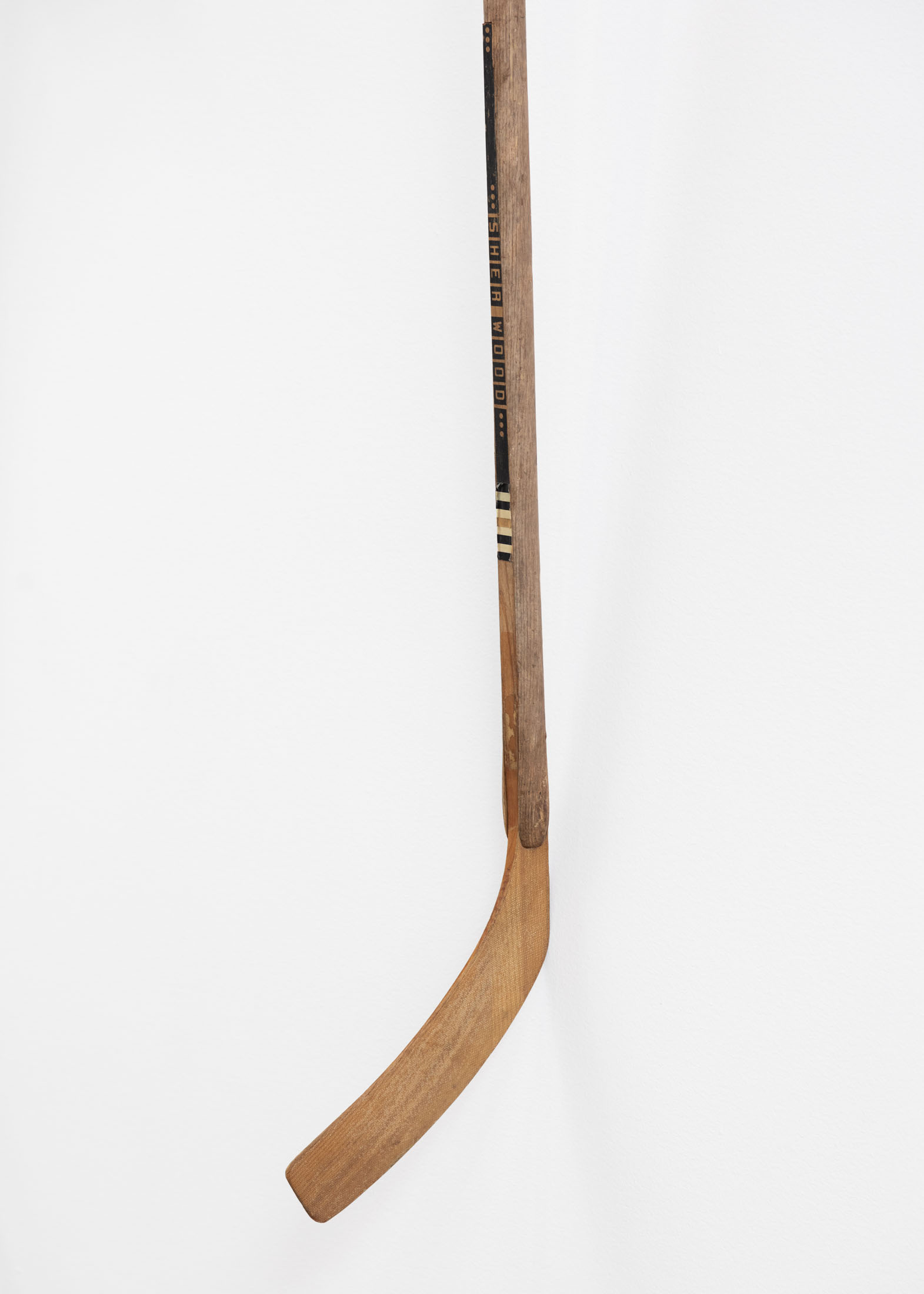 First exhibited at the MOCA GTA Triennial in 2021, Ploughing Liberty is an ongoing series born from Oluseye’s research on the migration of Loyalists, Jamaican Maroons, and fugitive slaves who moved to Nova Scotia and Ontario in the late 18th century, often with the near impossible task of farming a hard and unforgiving landscape. The antique farm tools, worn with hard use, reference those who spent their lives trying to make the rocky, infertile land arable. Fusing these tools with discarded hockey sticks—a sport from which Black presences are often elided—the resulting works bring up questions of labour and leisure, belonging and exclusion, within the Canadian settler state. “Close inspection of the sculptures reveals the traces of use in the wood. These imperfections appear as historical repositories, or precise markers of bygone labour and play. The places on the farming tools where the handles appear slim denote wear; the work of hands making wood smooth.”[2] These works also link the history of Black labour in Canada with the present-day labour of agricultural workers from the Caribbean and Latin America on Ontario’s farms, where close to 27,000 temporary foreign workers were employed in 2021.