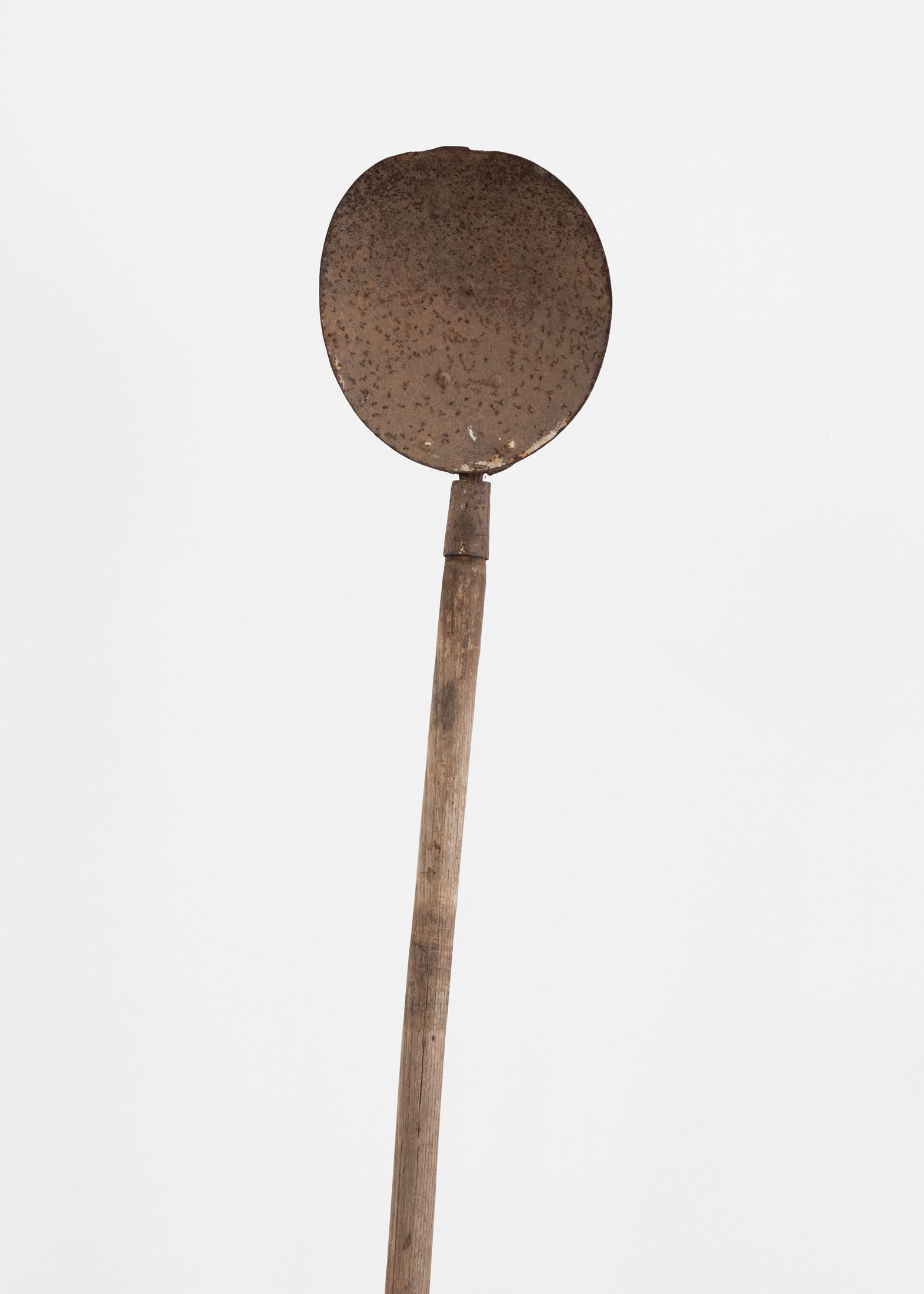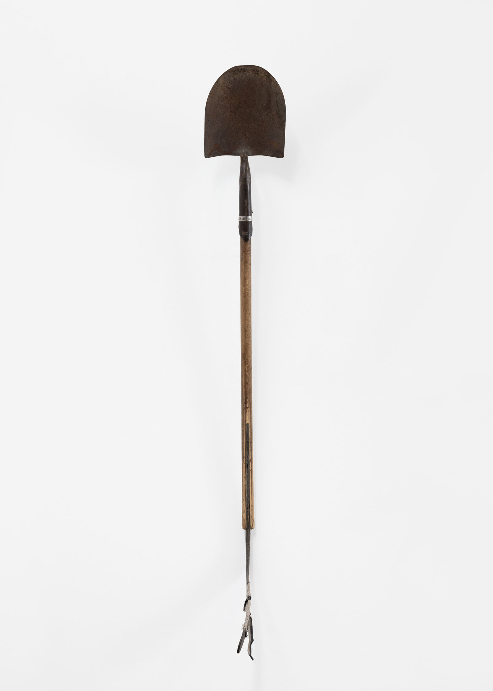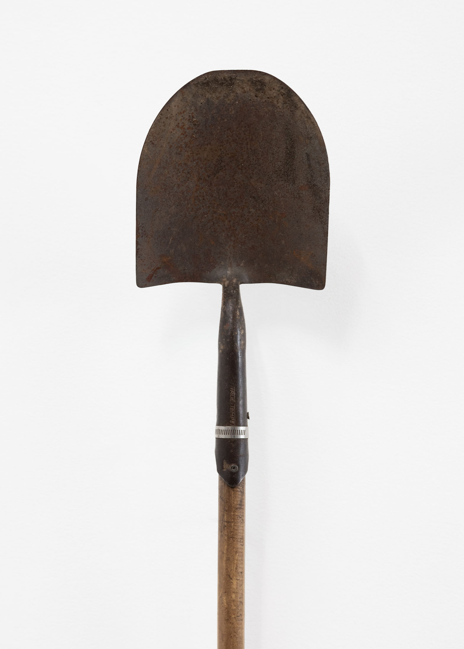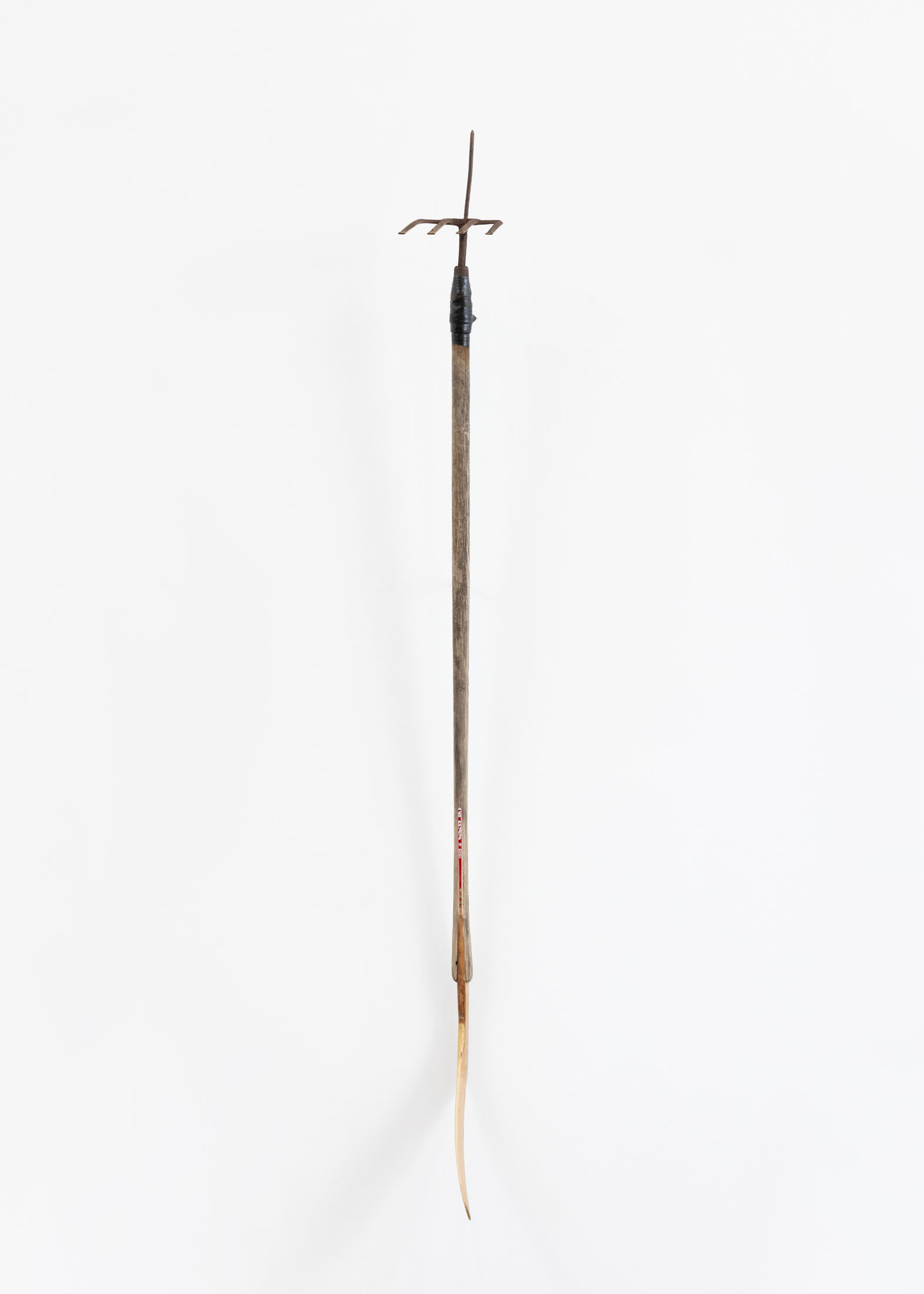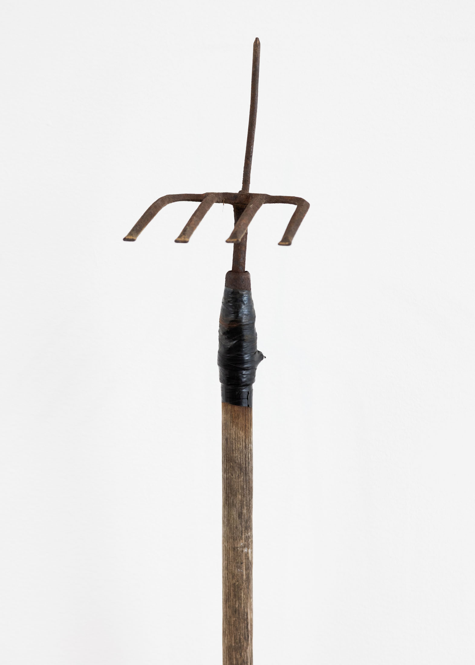 First exhibited at the MOCA GTA Triennial in 2021, Ploughing Liberty is an ongoing series born from Oluseye’s research on the migration of Loyalists, Jamaican Maroons, and fugitive slaves who moved to Nova Scotia and Ontario in the late 18th century, often with the near impossible task of farming a hard and unforgiving landscape. The antique farm tools, worn with hard use, reference those who spent their lives trying to make the rocky, infertile land arable. Fusing these tools with discarded hockey sticks—a sport from which Black presences are often elided—the resulting works bring up questions of labour and leisure, belonging and exclusion, within the Canadian settler state. “Close inspection of the sculptures reveals the traces of use in the wood. These imperfections appear as historical repositories, or precise markers of bygone labour and play. The places on the farming tools where the handles appear slim denote wear; the work of hands making wood smooth.”[2] These works also link the history of Black labour in Canada with the present-day labour of agricultural workers from the Caribbean and Latin America on Ontario’s farms, where close to 27,000 temporary foreign workers were employed in 2021.