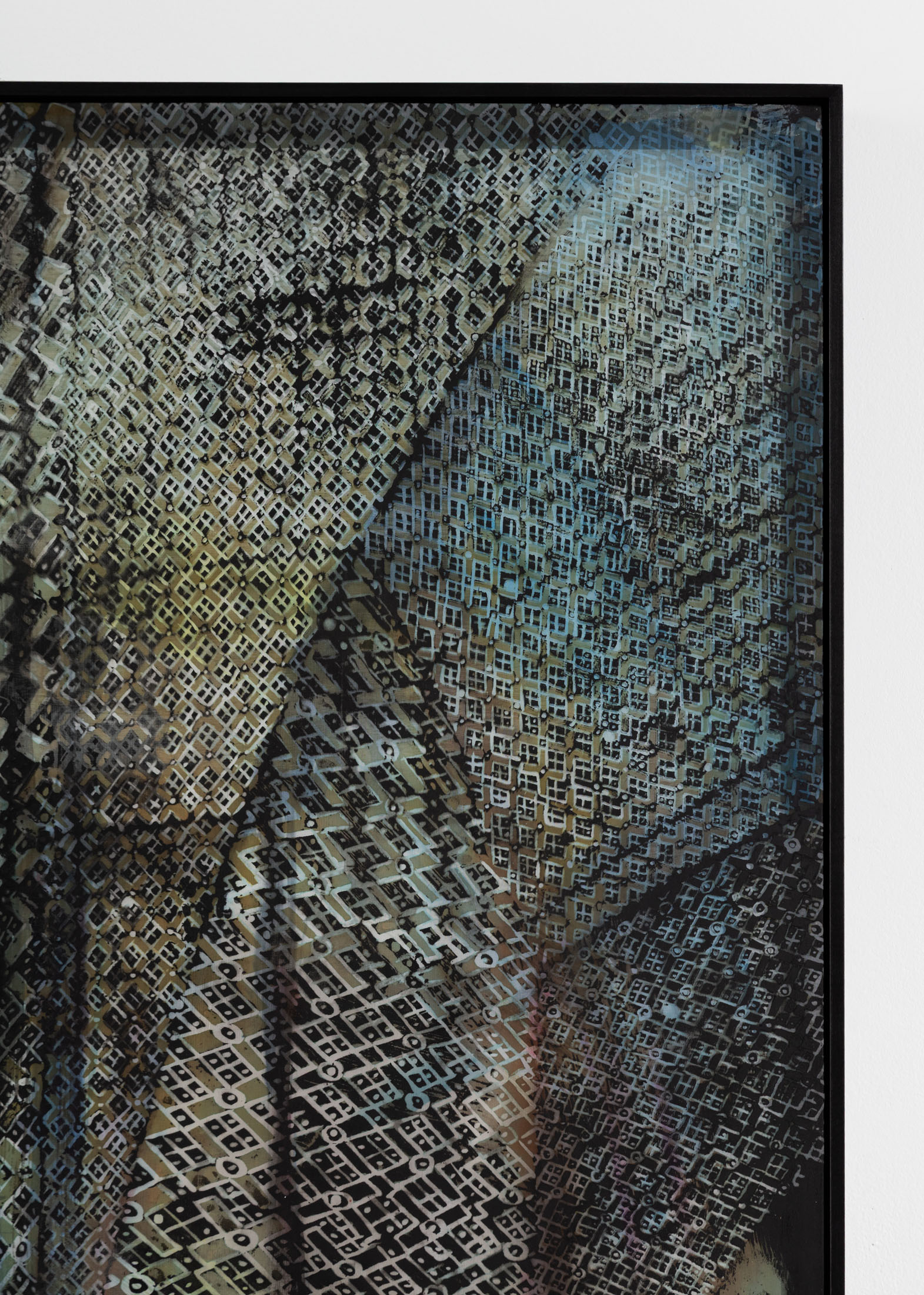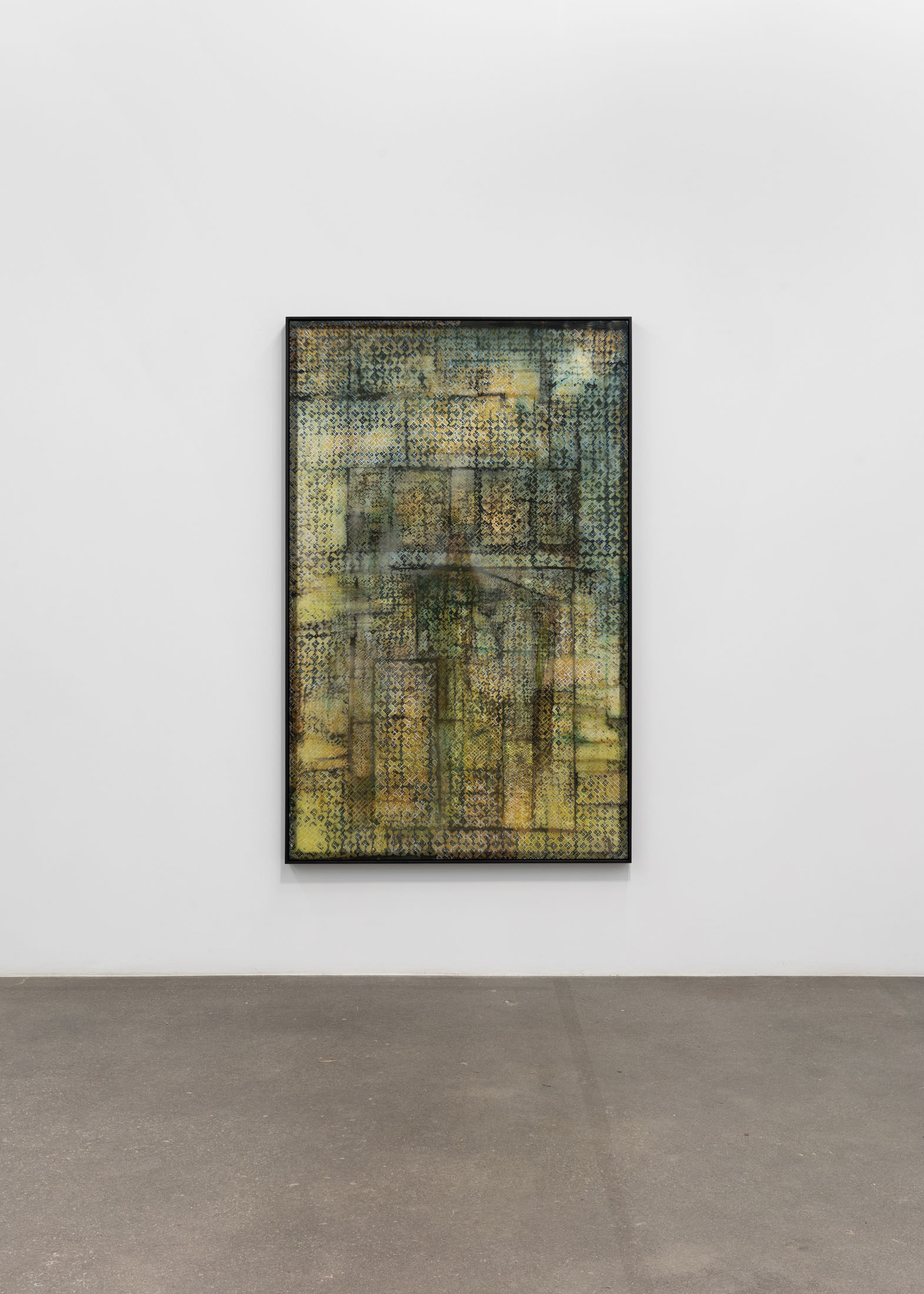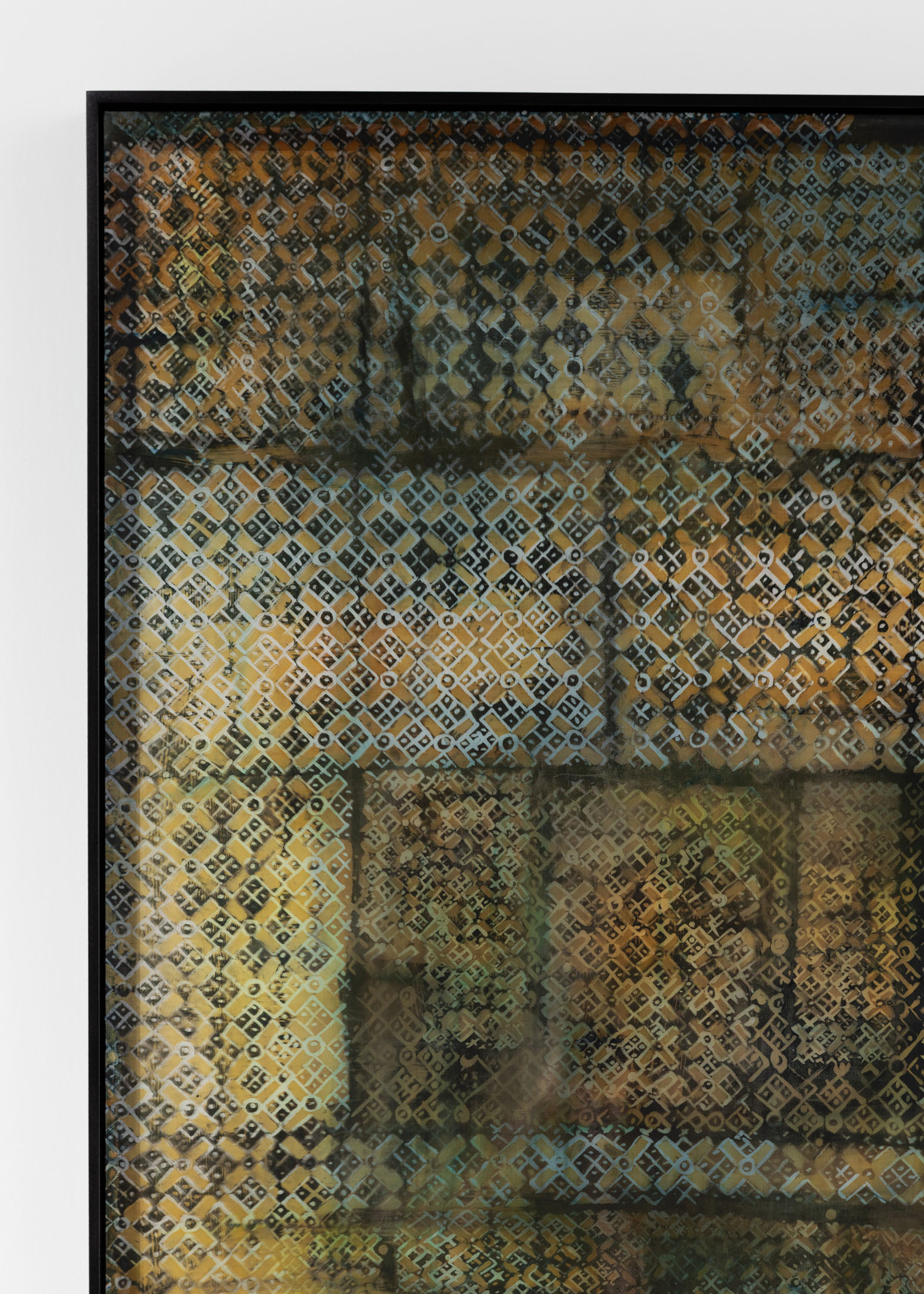 Bool’s silk paintings are based on images of different architectural bodies that she then abstracts by “collaging” grids over them on the computer. Spreegold (2026), is based on the façade of an Art Deco/Fascist building, while Veiled Façade (2026) is based on an experimental building made of fabric. Using chiffon silk and a batik painting technique, with wax, oil paint and textile paint, the resulting patterns form once the wax is removed and the painting’s negative space is revealed. The thin silk is then stretched over a mirror, so that the painting reflects itself, its surroundings, and the viewer’s own body. In this manner, Bool takes the static modernist grid and opens it up to the environment, making it unfixed and negotiable.