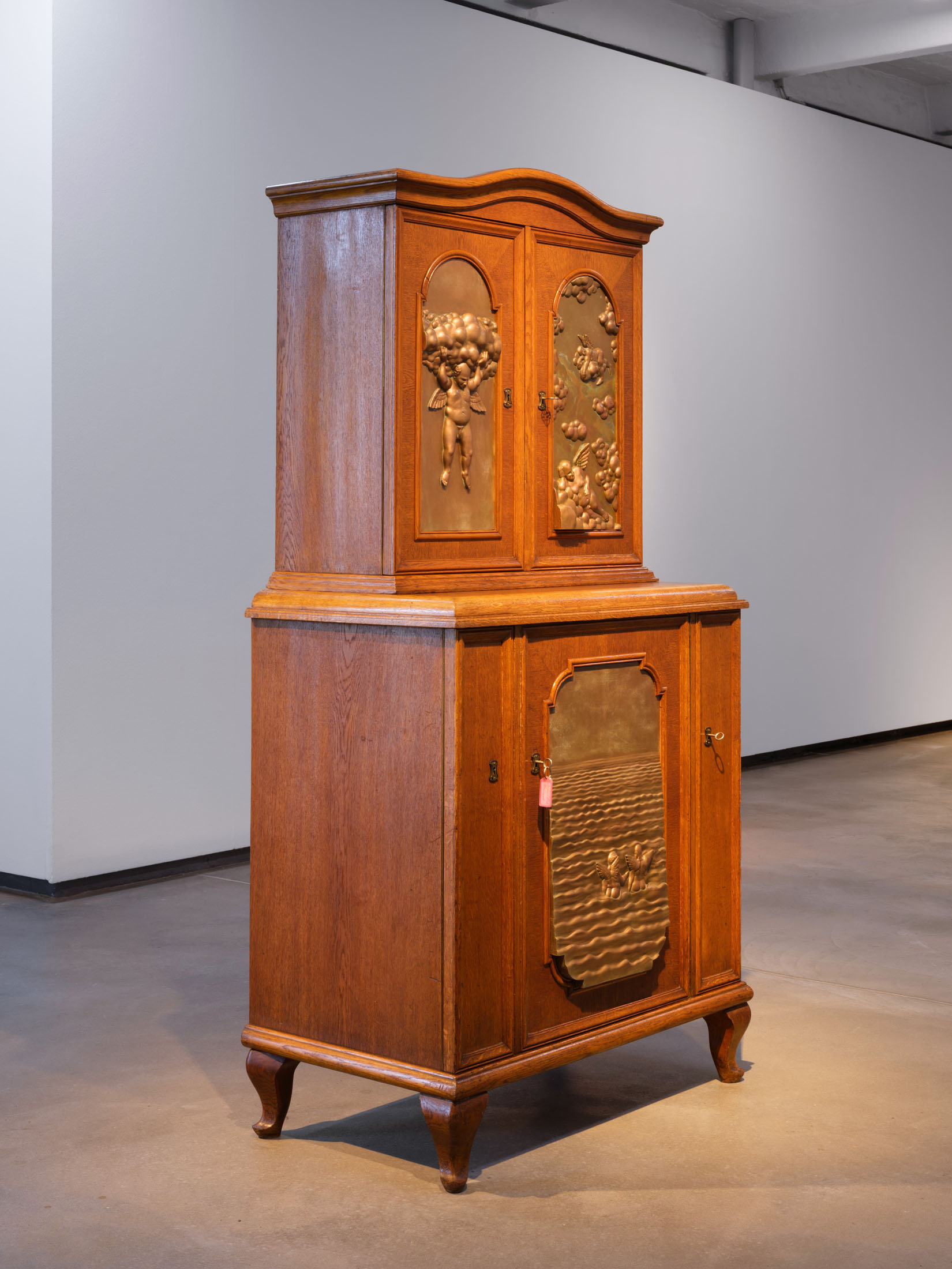 For his exhibition at Künstlerhaus Bethanien, Zamir developed a new body of work combining furniture made of dark, heavy wood—cabinets, dressers, and clock cases—with finely crafted reliefs. These pieces of furniture do more than simply carry the images; they shape how the reliefs are perceived. Unlike traditional frames, they situate the reliefs within a private, domestic context: they resemble heirlooms, familiar everyday objects, and status symbols all at once.
