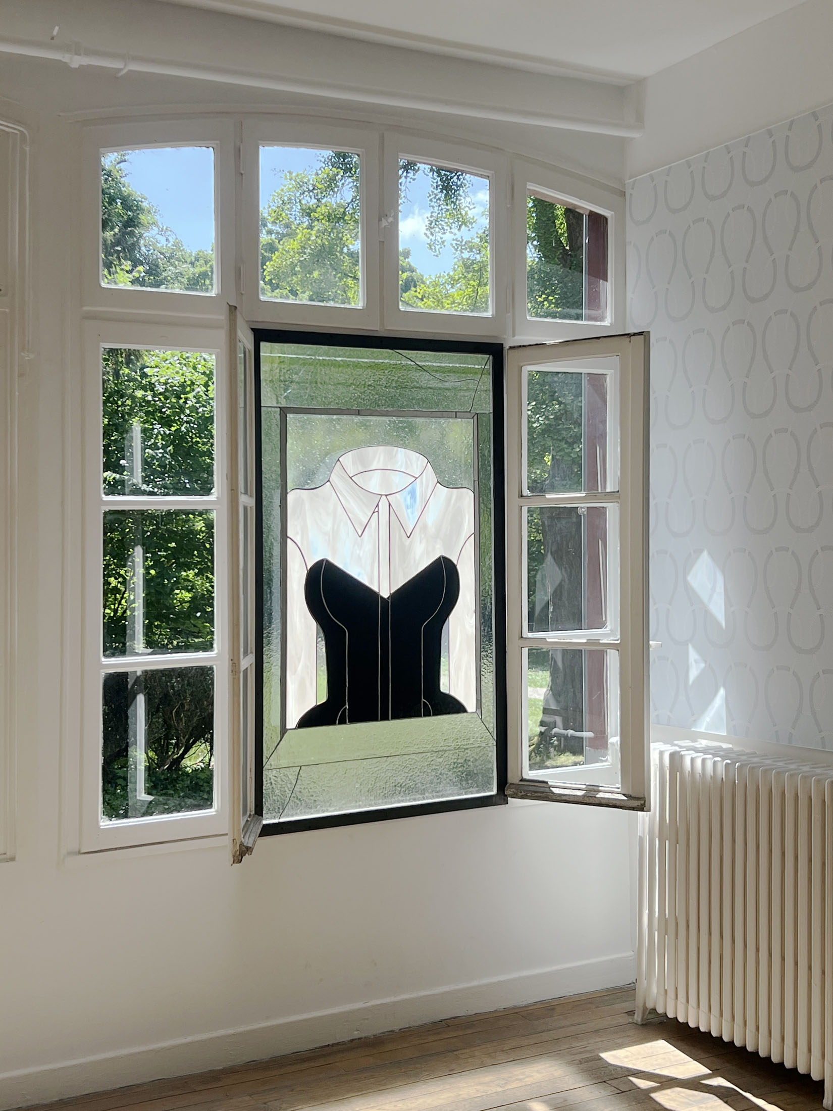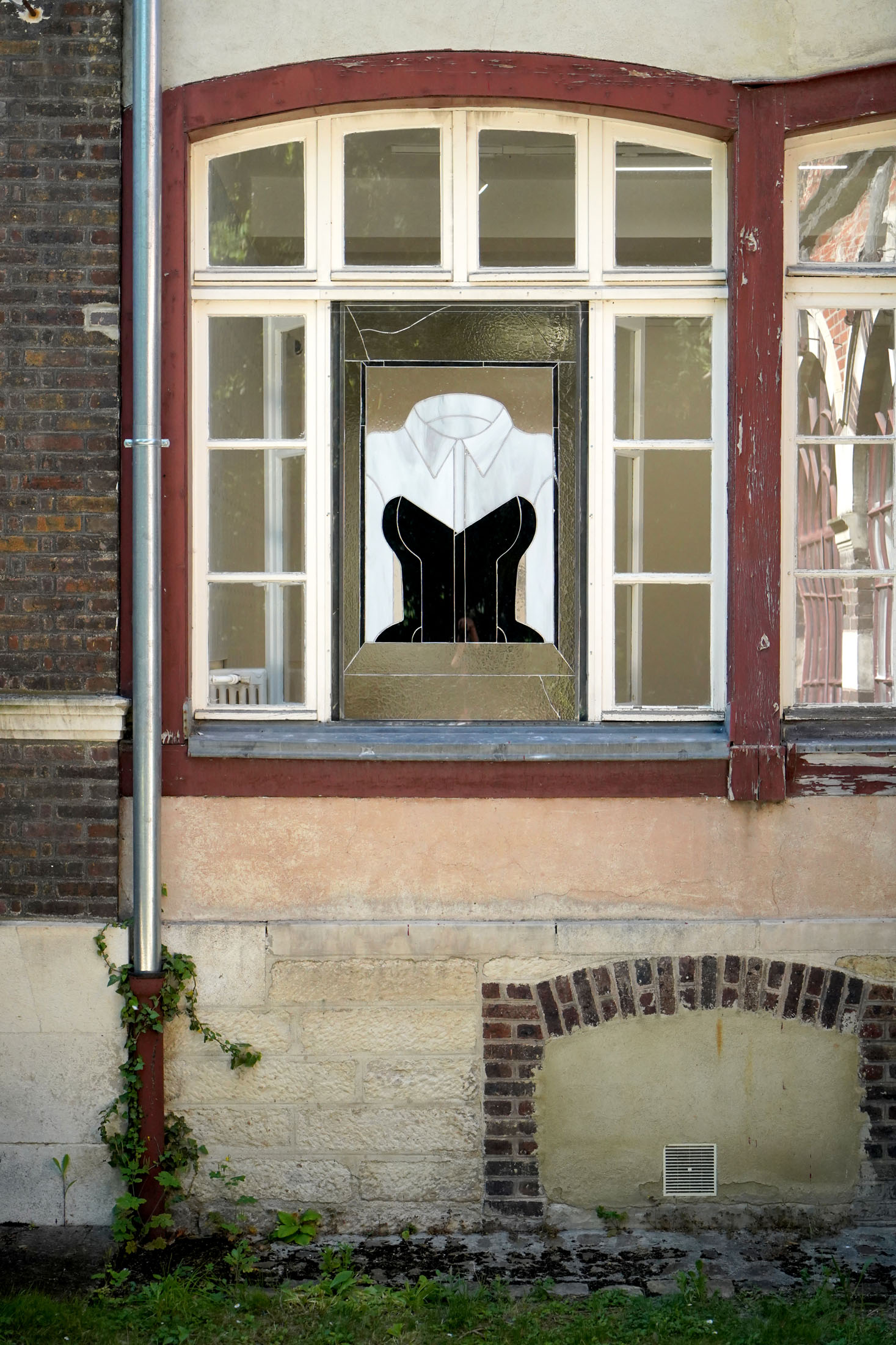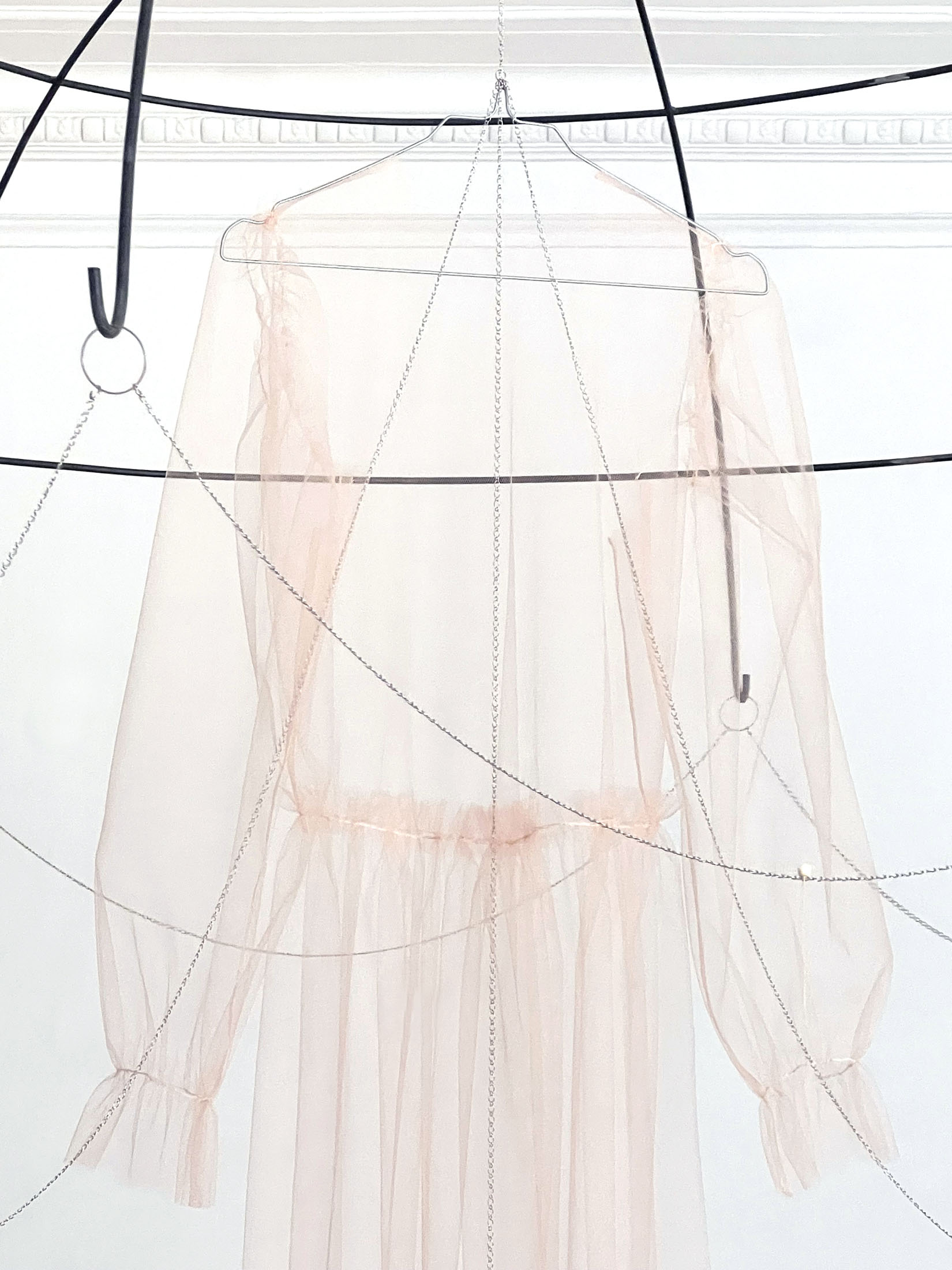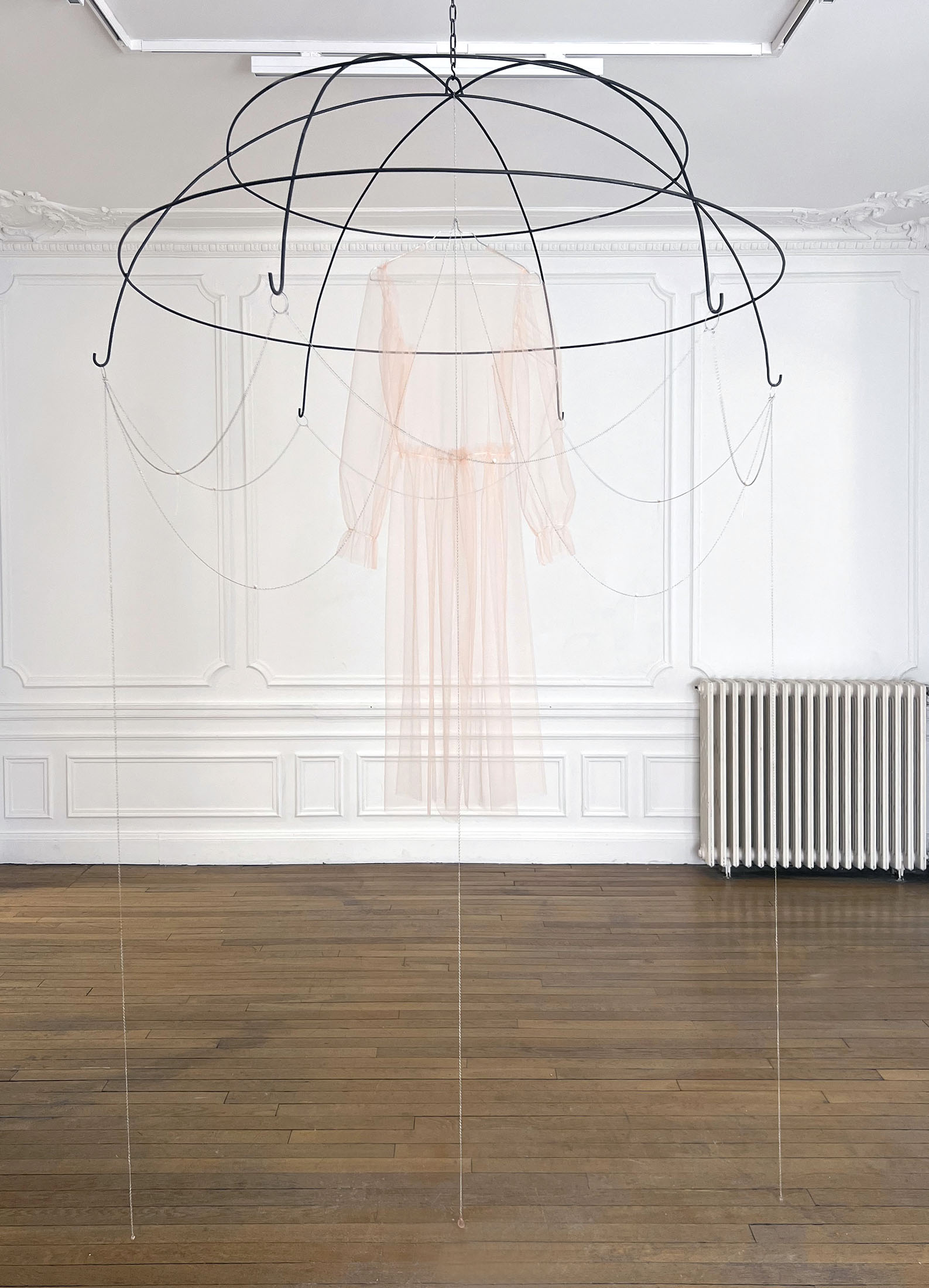 Brown’s practice navigates a tension between temporalities: between the urgencies of the present and a poetic attention to the traces of gestures and stories that came before us. Recurring symbols often appear in her work — a hand, a moth, a key, stitched knots, armored dresses… — suspended somewhere between dream and reality. Many of the forms featured in the exhibition draw direct inspiration from the local context of Troyes, with its deep ties to hosiery, care, and the ongoing preservation of this material heritage still visible in the public space today.