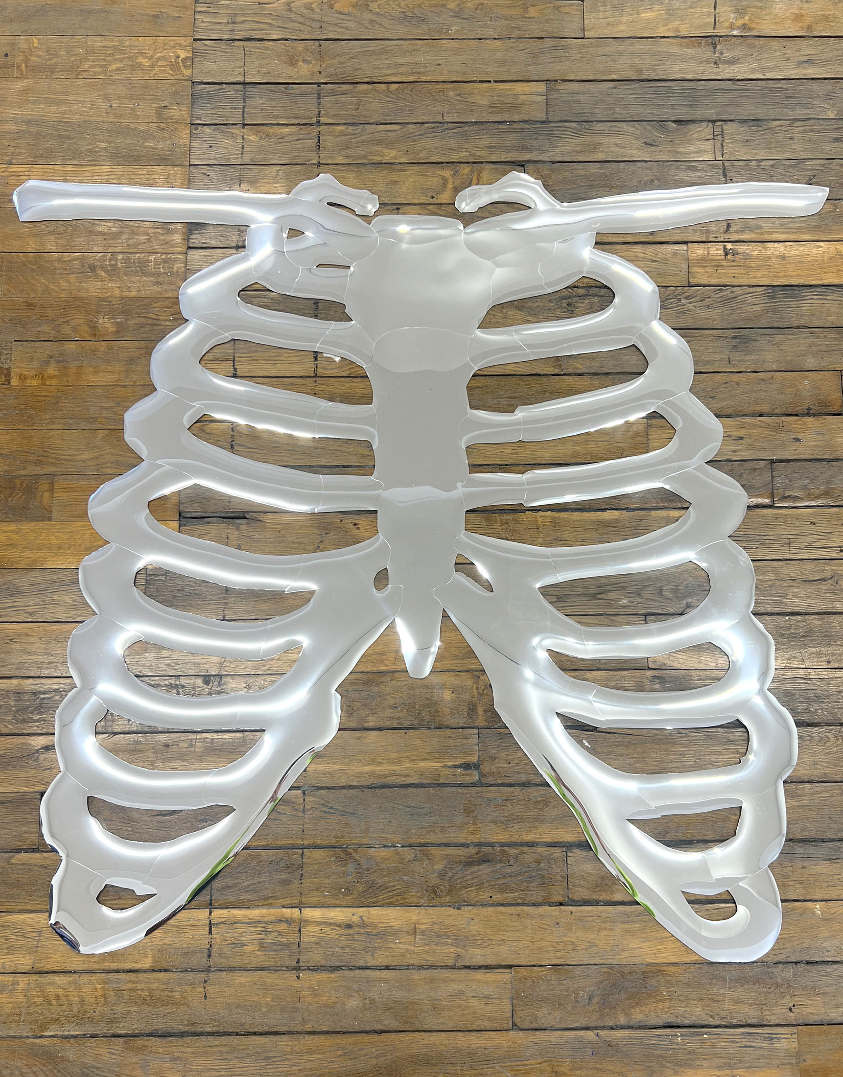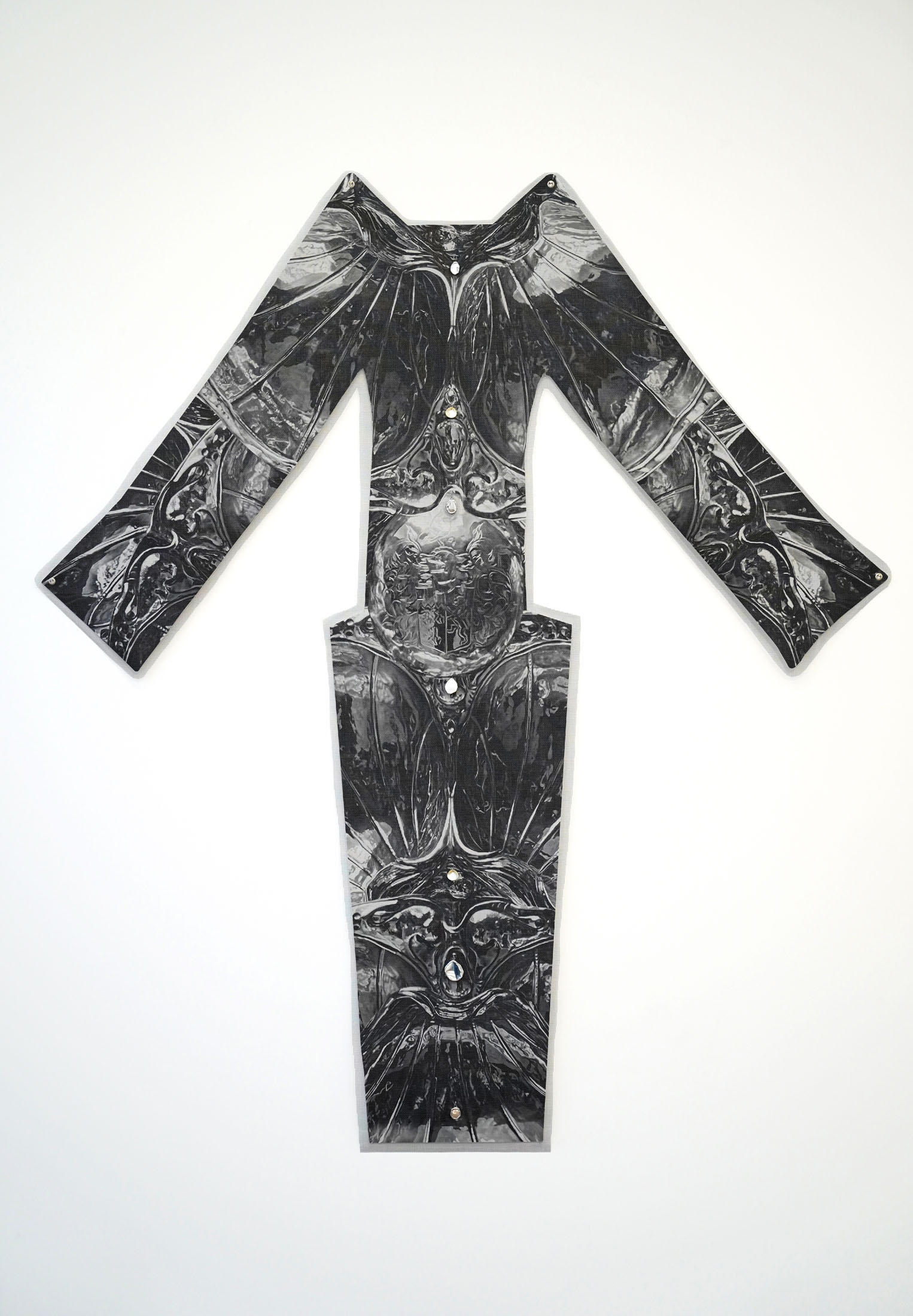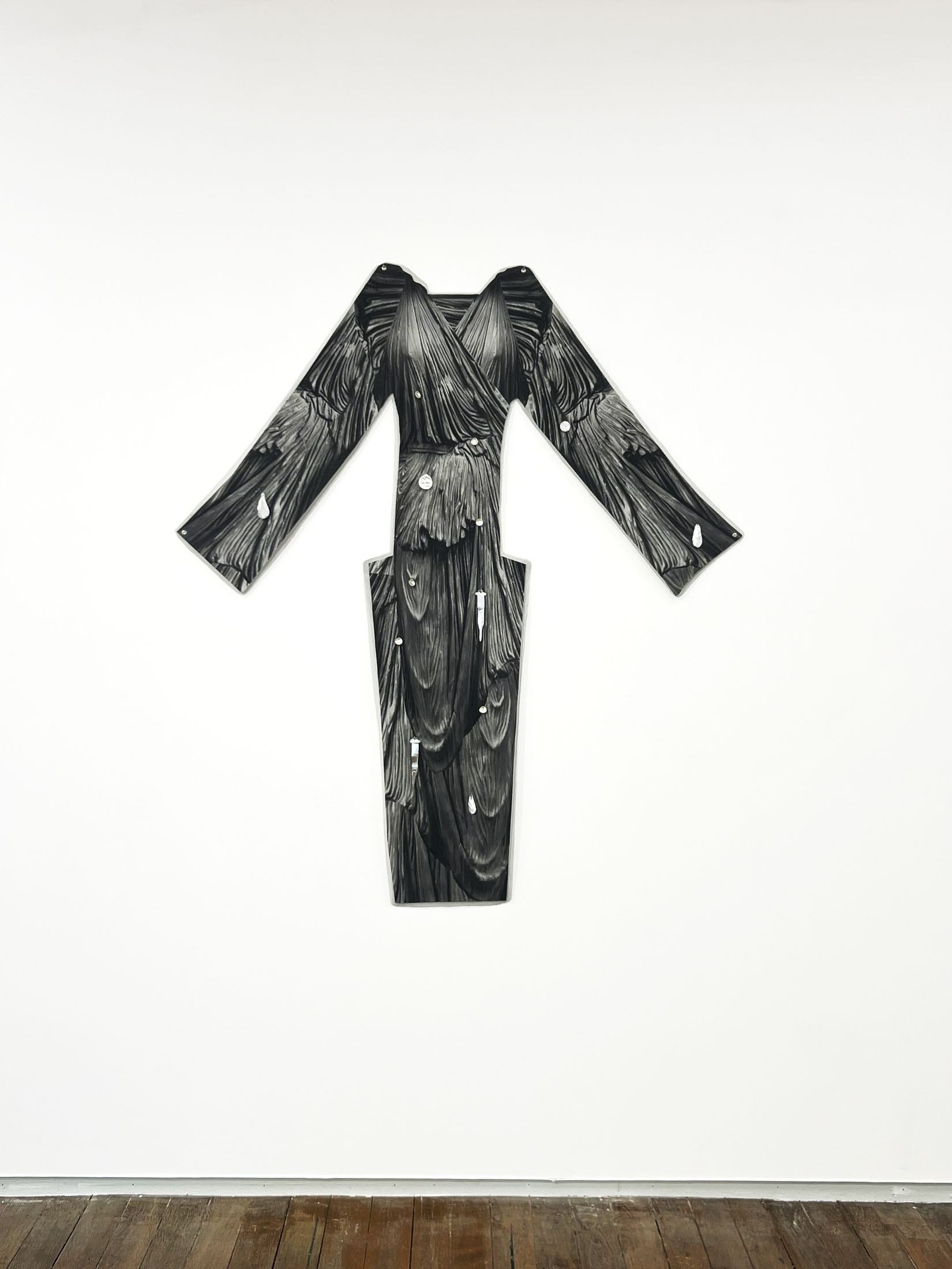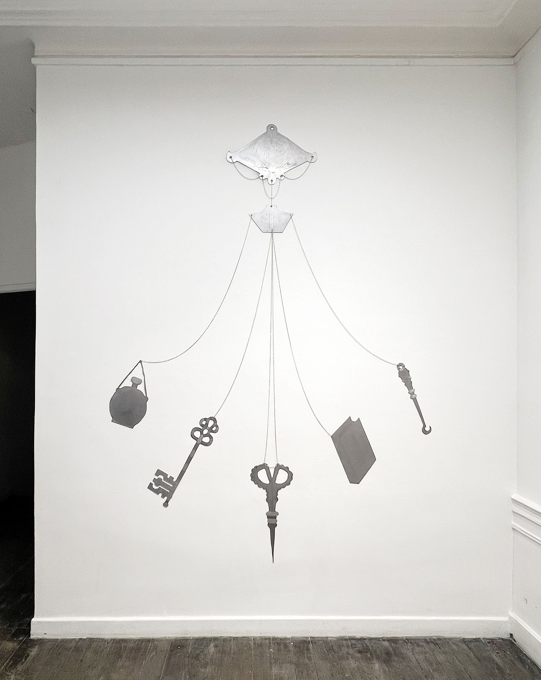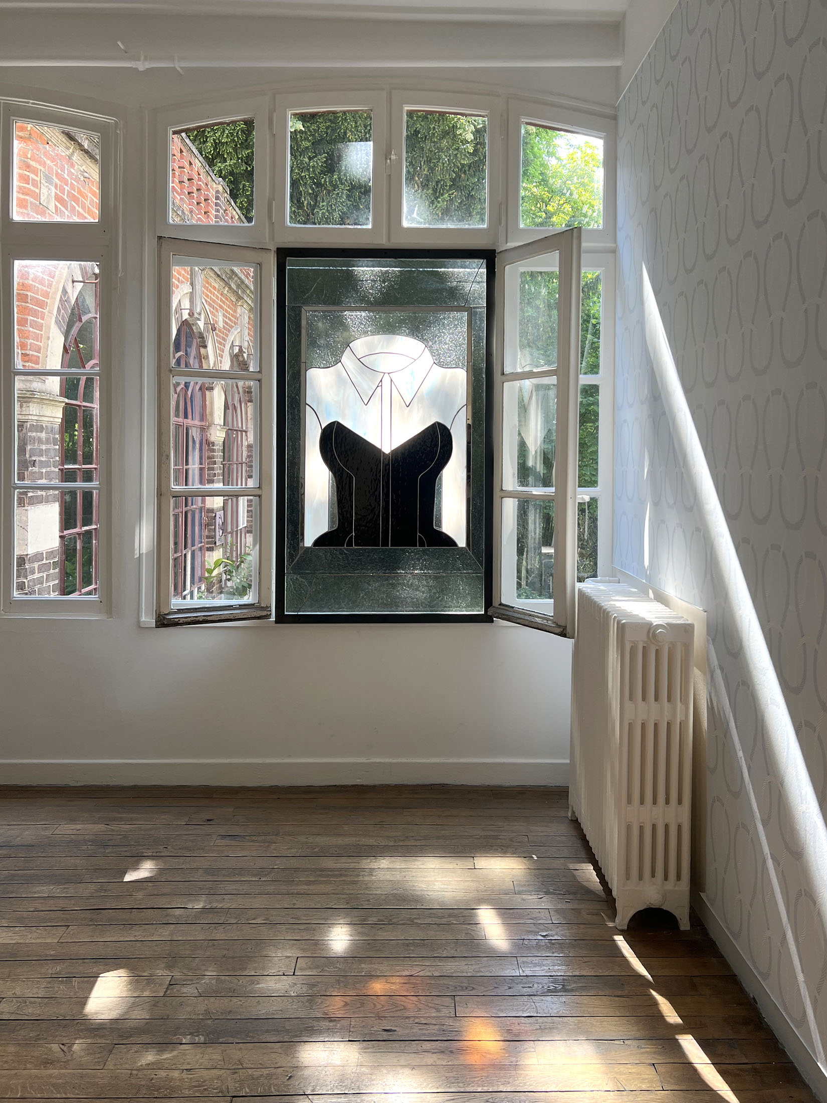 Brown’s practice navigates a tension between temporalities: between the urgencies of the present and a poetic attention to the traces of gestures and stories that came before us. Recurring symbols often appear in her work — a hand, a moth, a key, stitched knots, armored dresses… — suspended somewhere between dream and reality. Many of the forms featured in the exhibition draw direct inspiration from the local context of Troyes, with its deep ties to hosiery, care, and the ongoing preservation of this material heritage still visible in the public space today.