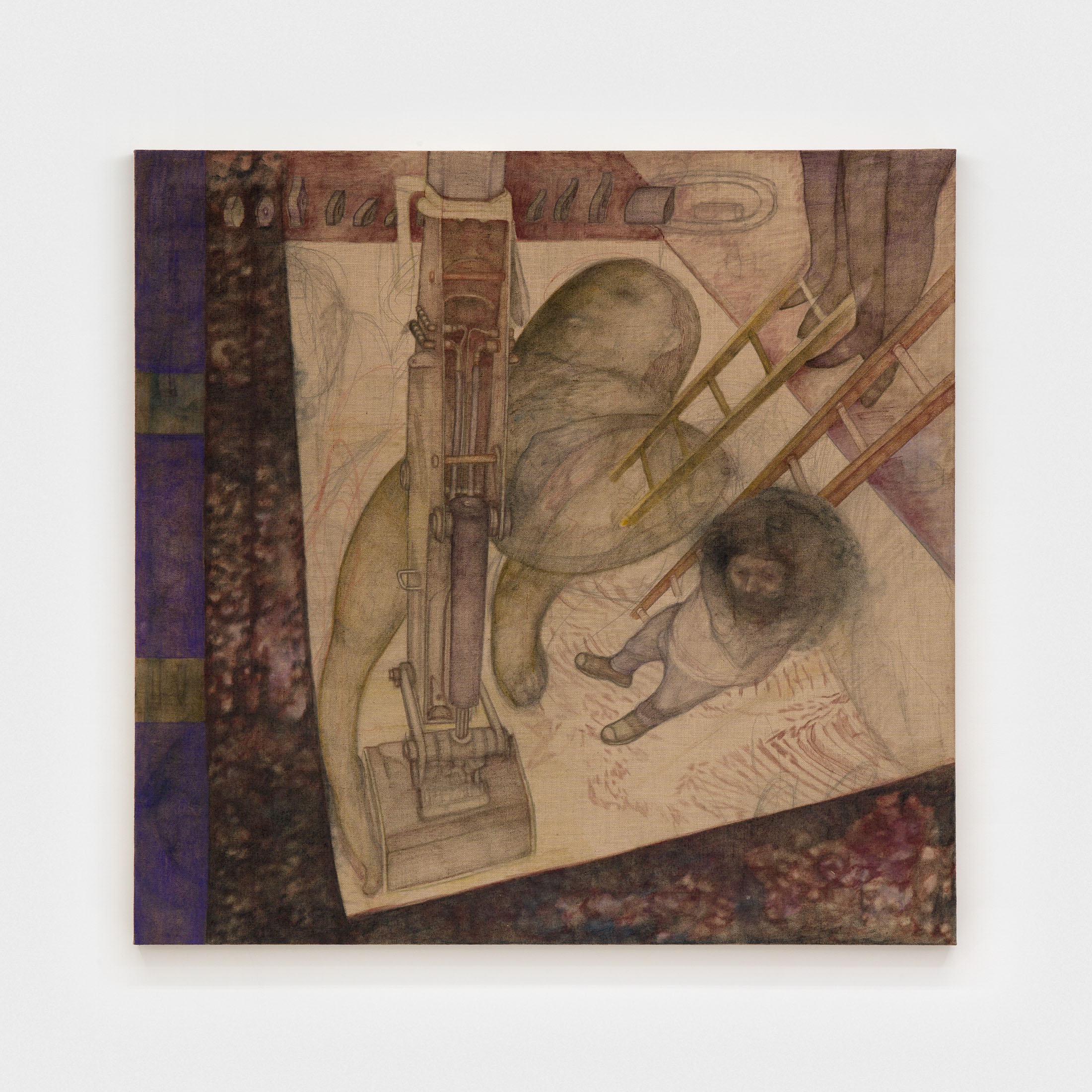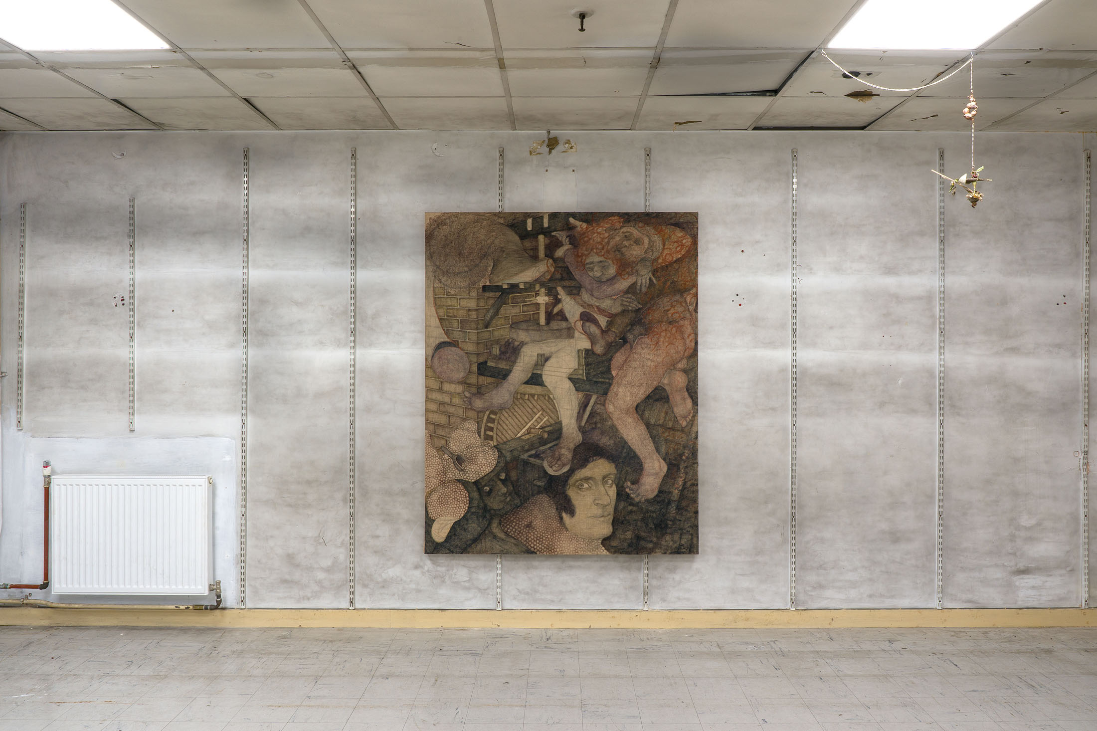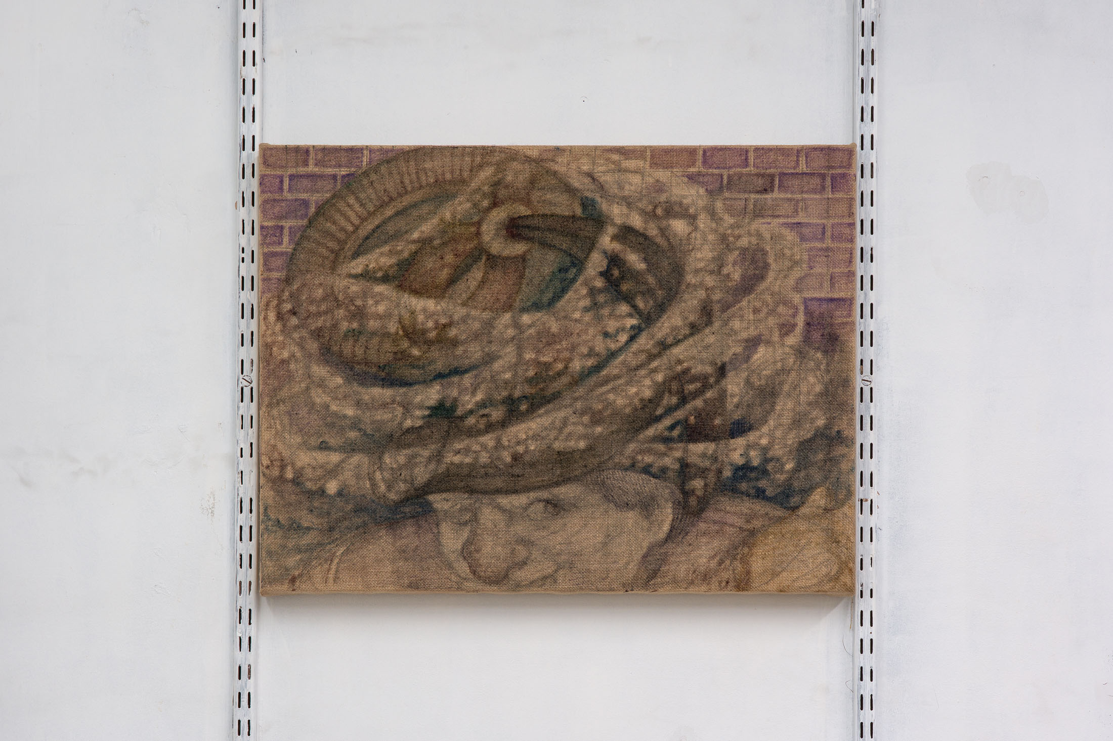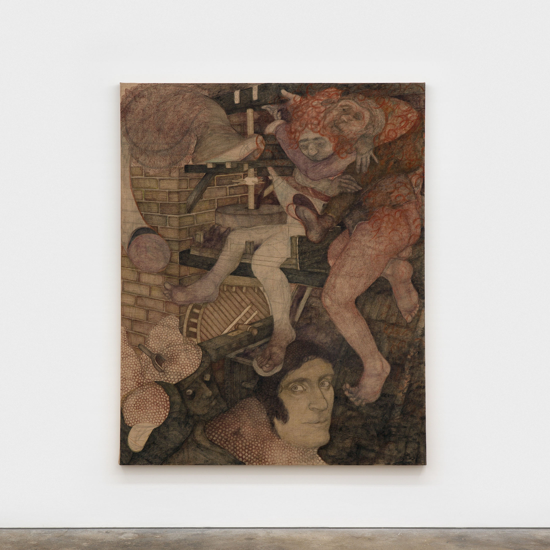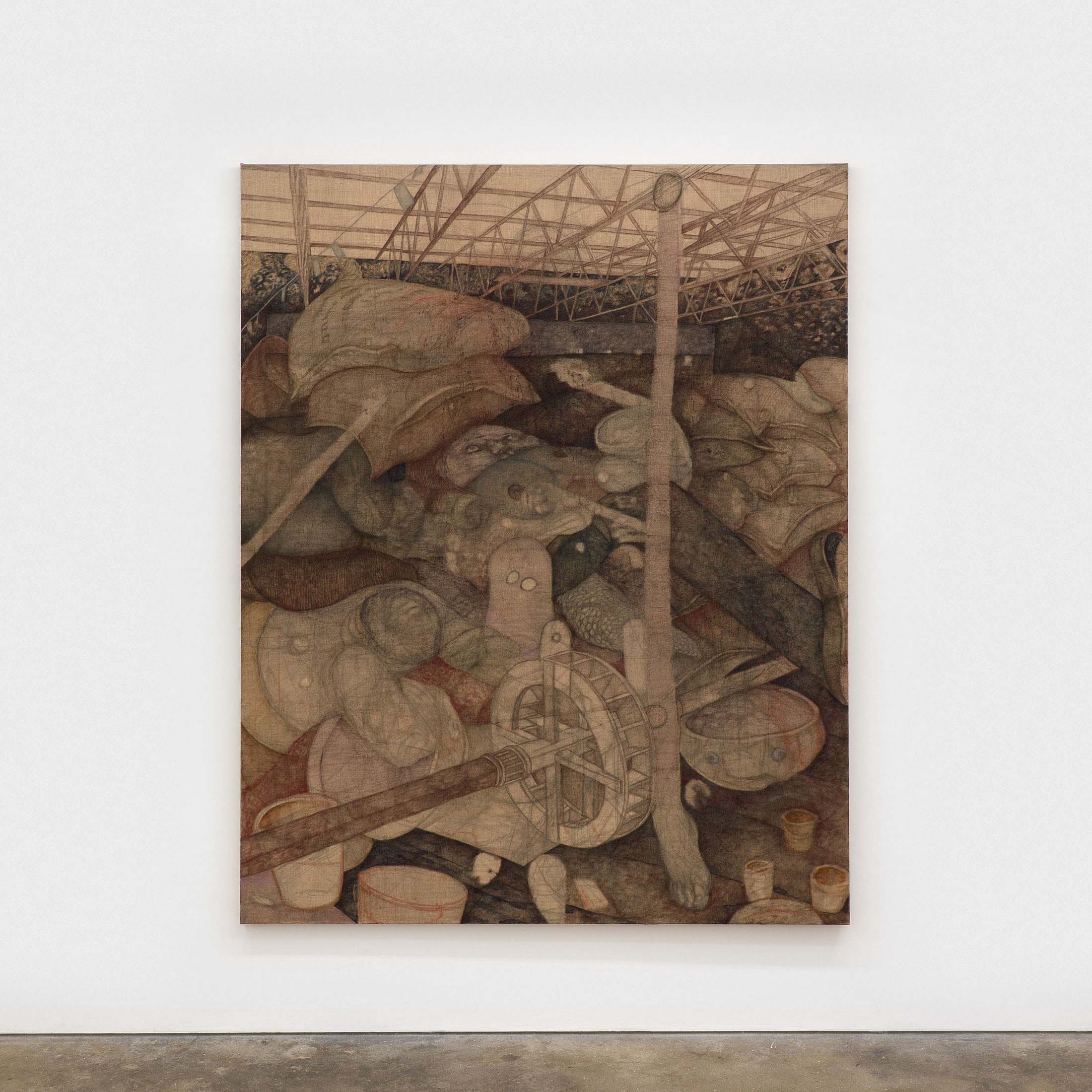 Victor Bengtsson approaches painting as a stage for corporeal transformation. Working in undiluted oil on raw jute, Bengtsson’s work engages with the construction and reconstruction of narrative – the deformation of information as it circulates. His works destabilize distinctions between competing systems of knowledge, exploring how language and image become reshaped and obscured over time. The mill, a repeating motif across this new body of work, serves as a central analogy for Bengtsson, symbolizing the processing, digestion, and transformation of material culture. His compositions oscillate between light-hearted humor to dark and disturbed, reflecting on the hybridization of empirical data and myth, producing a fragmented, speculative history.