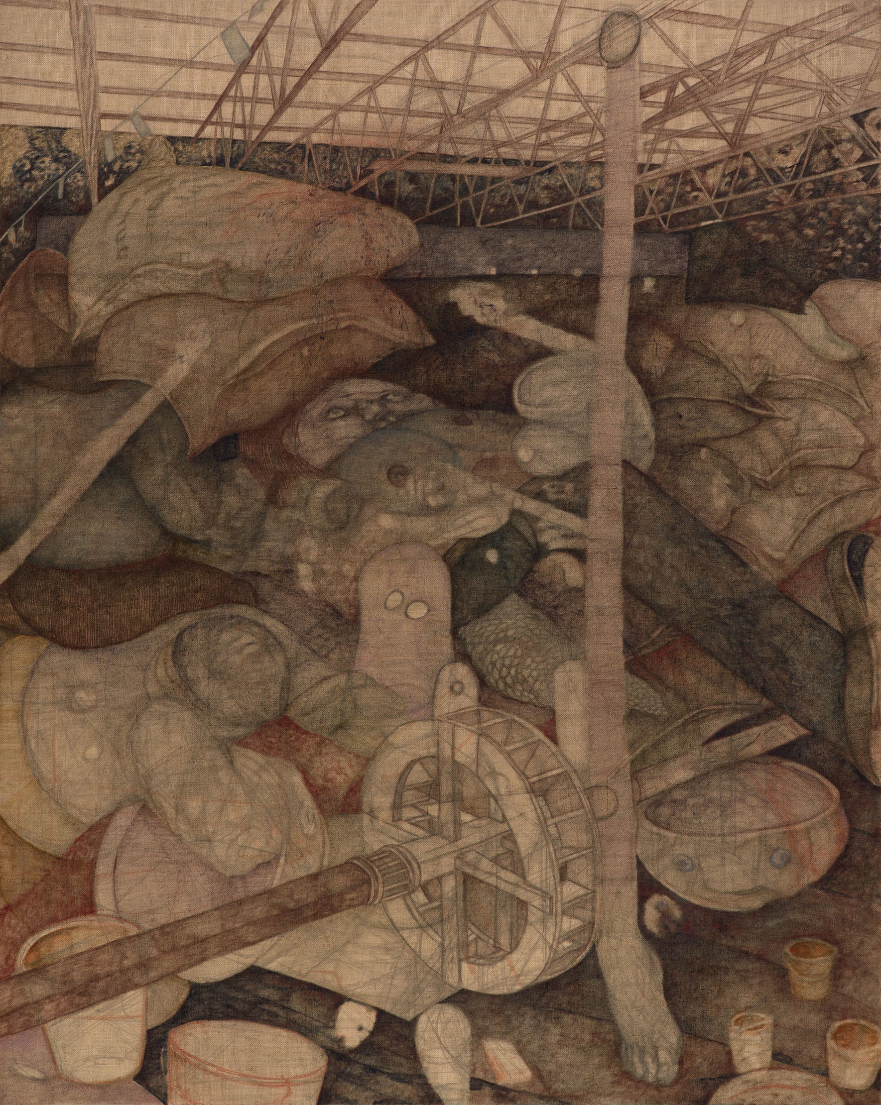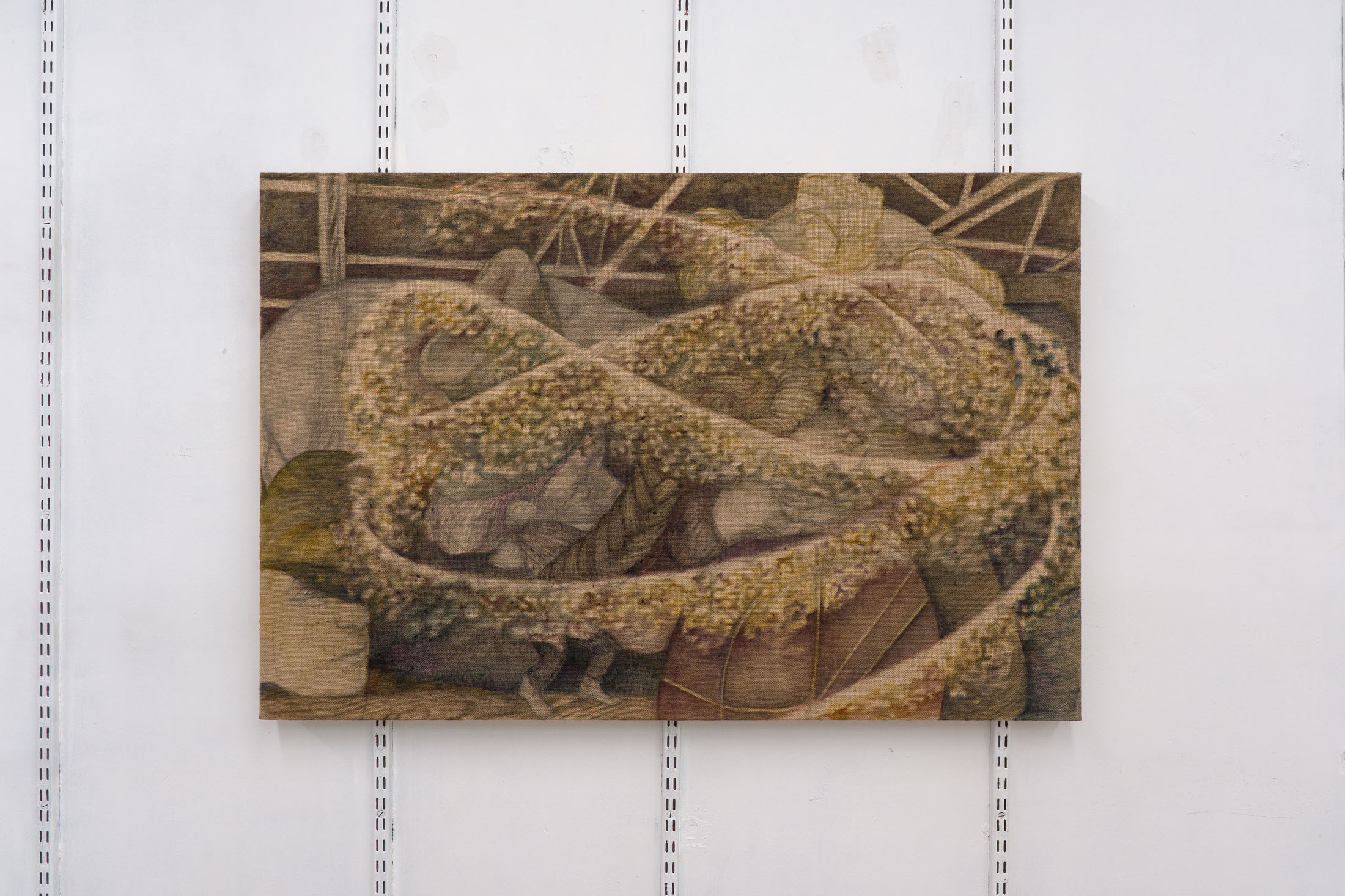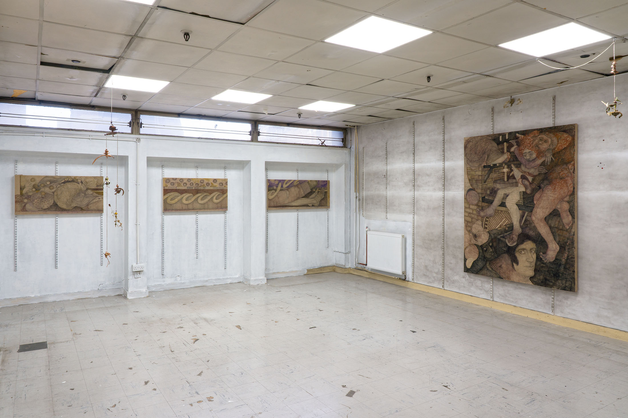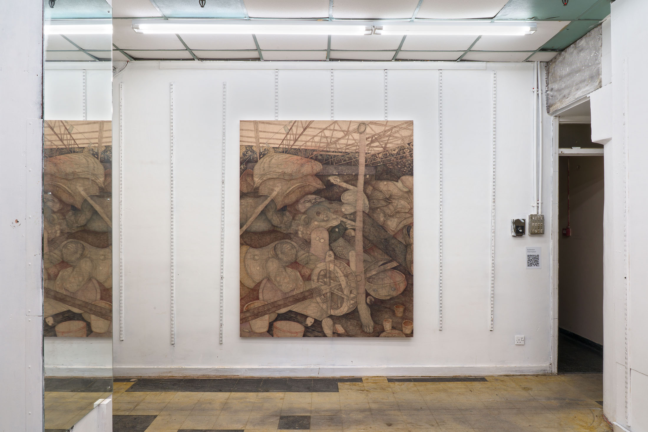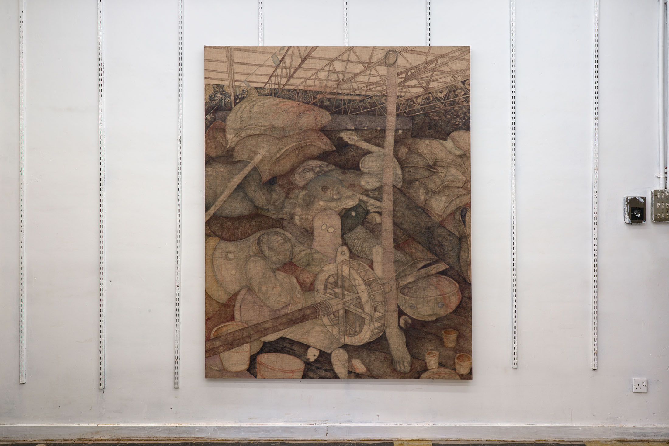 Victor Bengtsson approaches painting as a stage for corporeal transformation. Working in undiluted oil on raw jute, Bengtsson’s work engages with the construction and reconstruction of narrative – the deformation of information as it circulates. His works destabilize distinctions between competing systems of knowledge, exploring how language and image become reshaped and obscured over time. The mill, a repeating motif across this new body of work, serves as a central analogy for Bengtsson, symbolizing the processing, digestion, and transformation of material culture. His compositions oscillate between light-hearted humor to dark and disturbed, reflecting on the hybridization of empirical data and myth, producing a fragmented, speculative history.