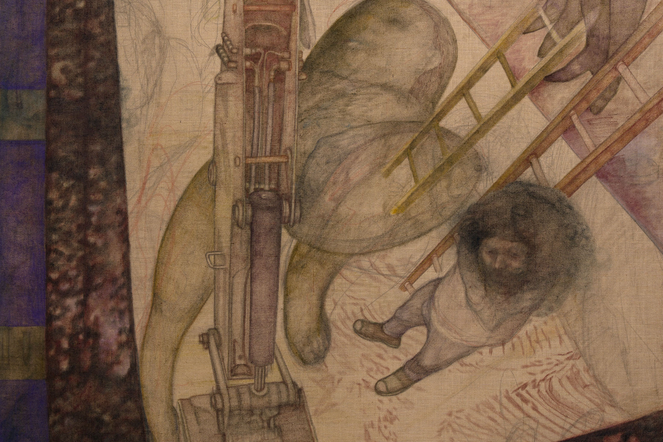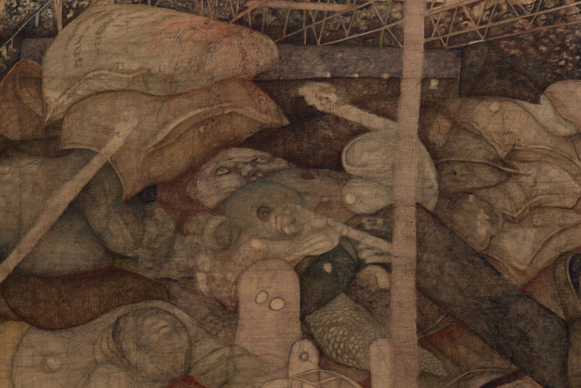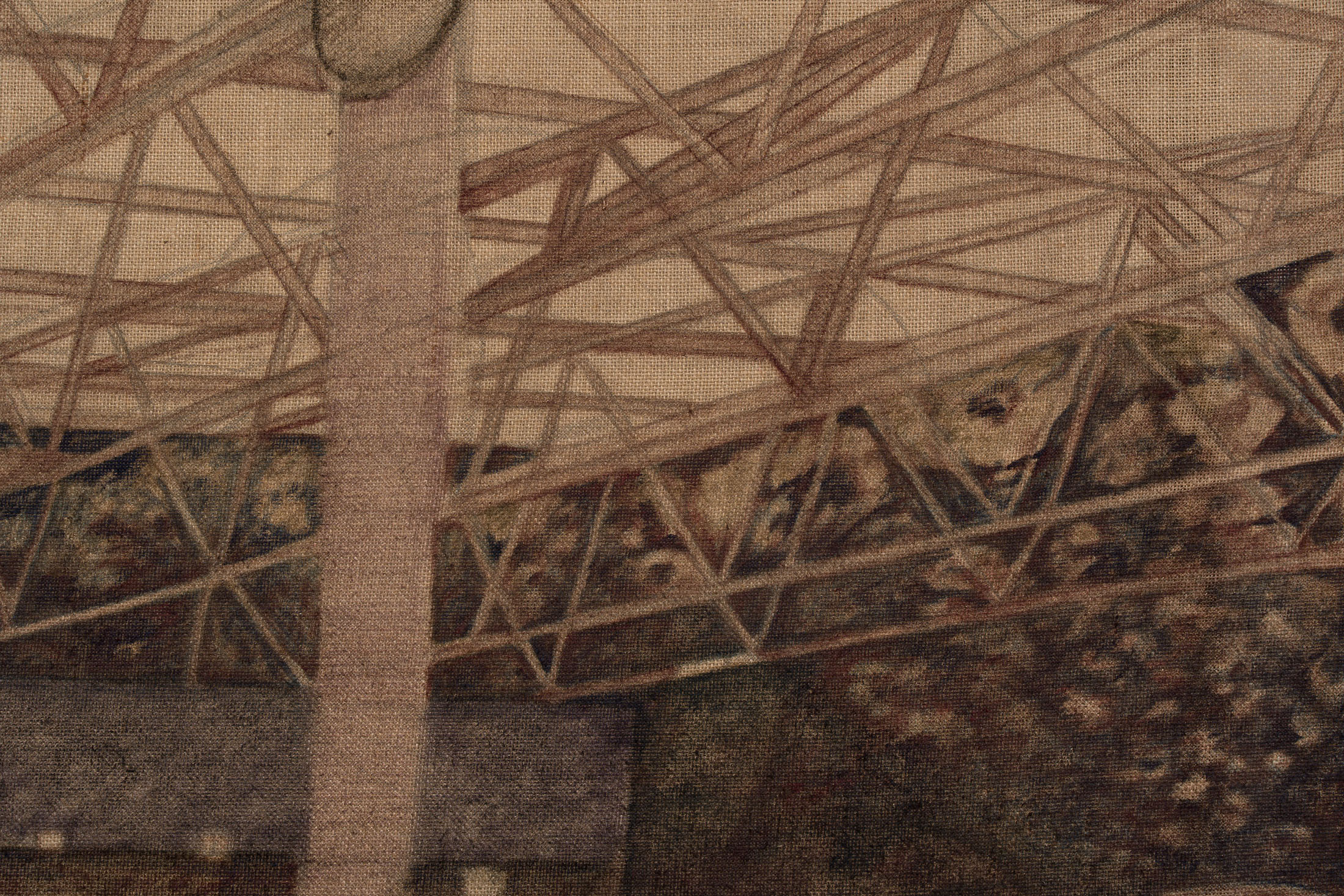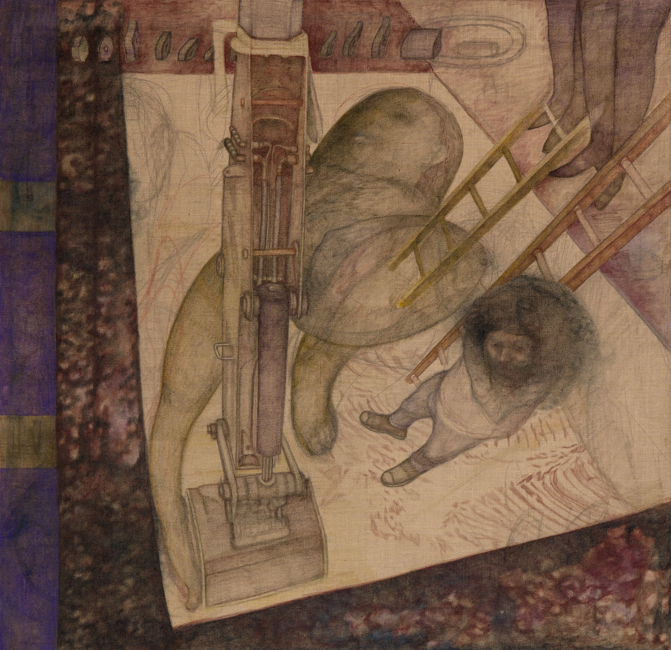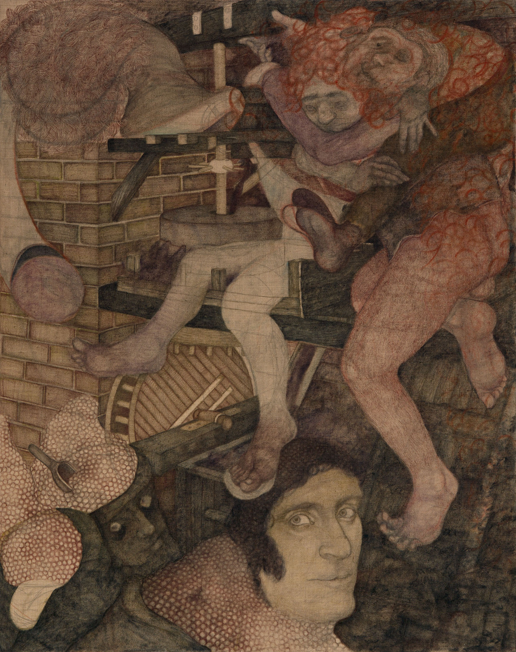 Victor Bengtsson approaches painting as a stage for corporeal transformation. Working in undiluted oil on raw jute, Bengtsson’s work engages with the construction and reconstruction of narrative – the deformation of information as it circulates. His works destabilize distinctions between competing systems of knowledge, exploring how language and image become reshaped and obscured over time. The mill, a repeating motif across this new body of work, serves as a central analogy for Bengtsson, symbolizing the processing, digestion, and transformation of material culture. His compositions oscillate between light-hearted humor to dark and disturbed, reflecting on the hybridization of empirical data and myth, producing a fragmented, speculative history.