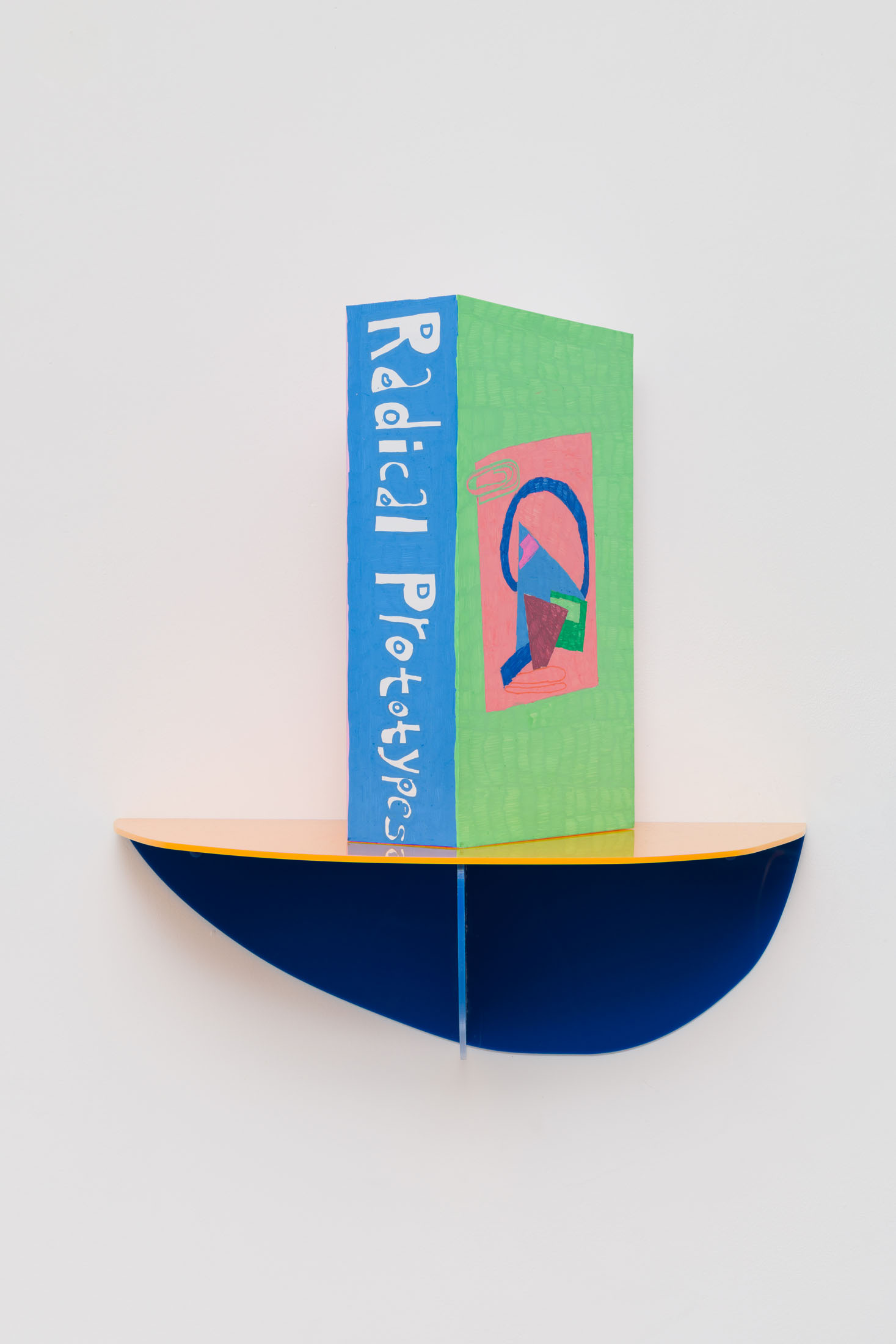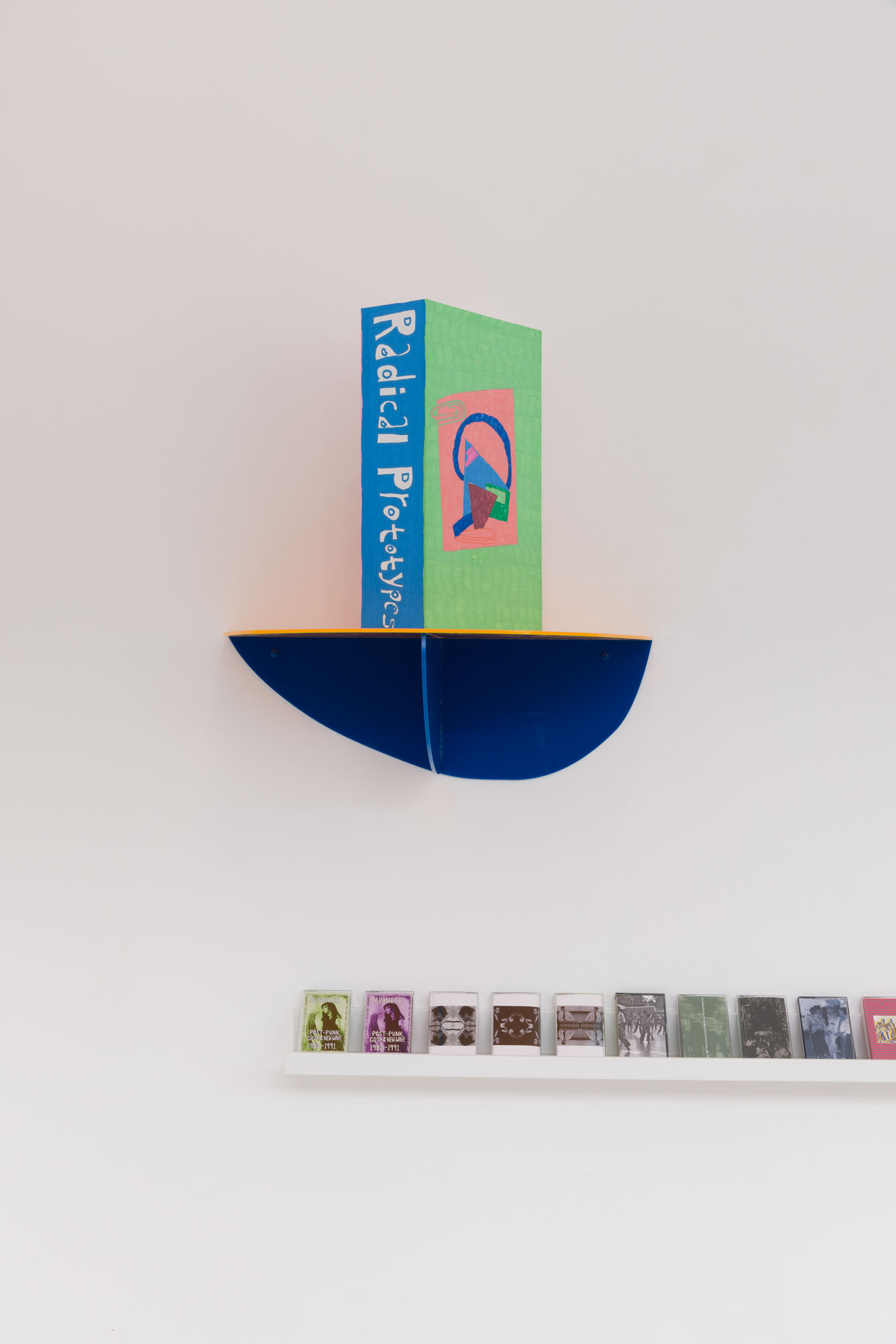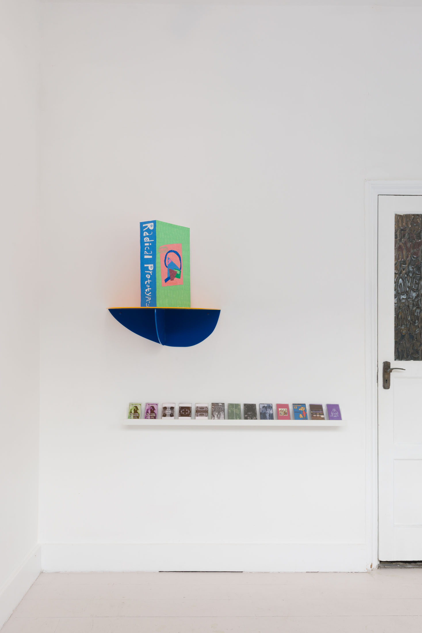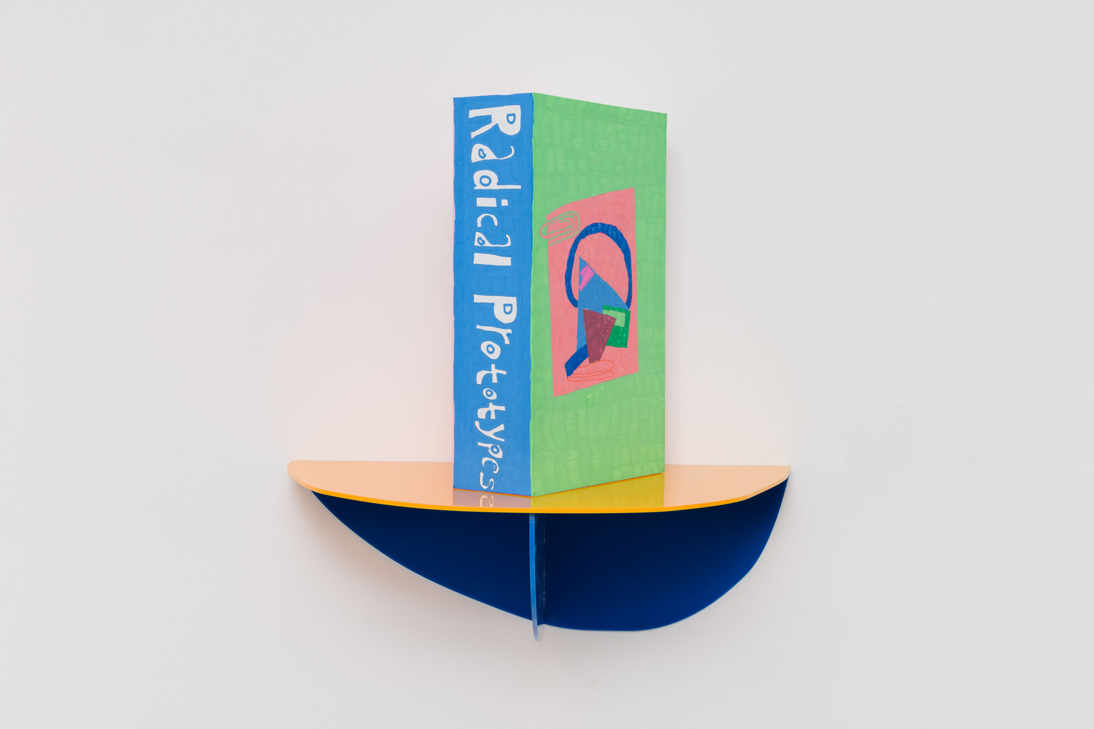 Cantilevered through the front of Flat Time House sits John Latham’s enormous sculpture of two books he named the Face. The pages of the books are interleaved so that they cannot be read in a rational manner rather signifying that knowledge should be communicated intuitively. This reflective and intuitive approach has been central to the experience of this group of artists during their time researching and working with the context of FTHo. In the first gallery, which Latham called The Mind, Andre Williams has responded to Latham’s work with a series of book sculptures using his graphic drawing style and striking typography in the first and final galleries. Radical Prototypes is presented here on a shelf designed by the artist in the same colours as Latham’s sculpture.