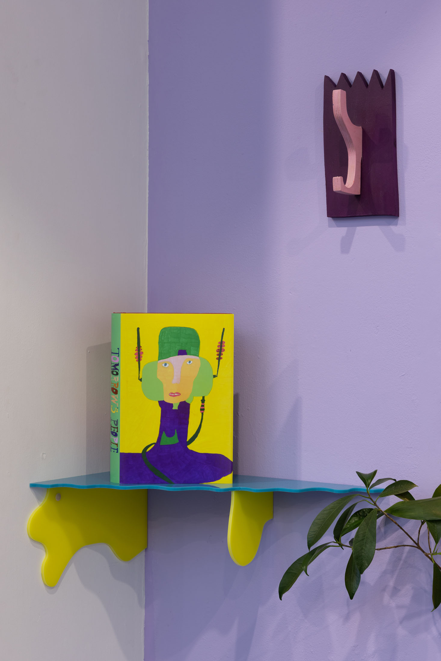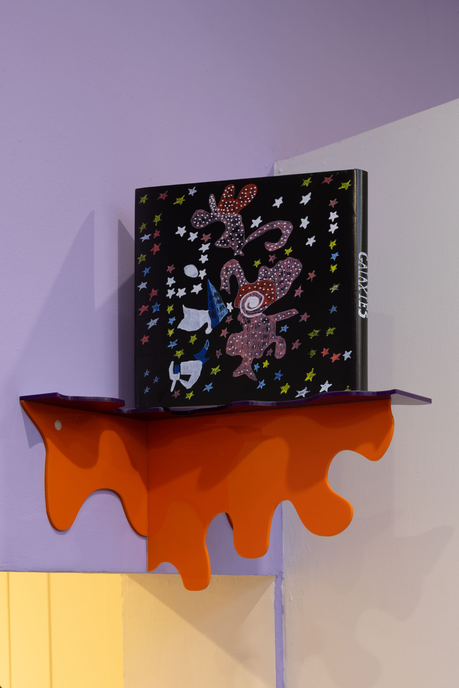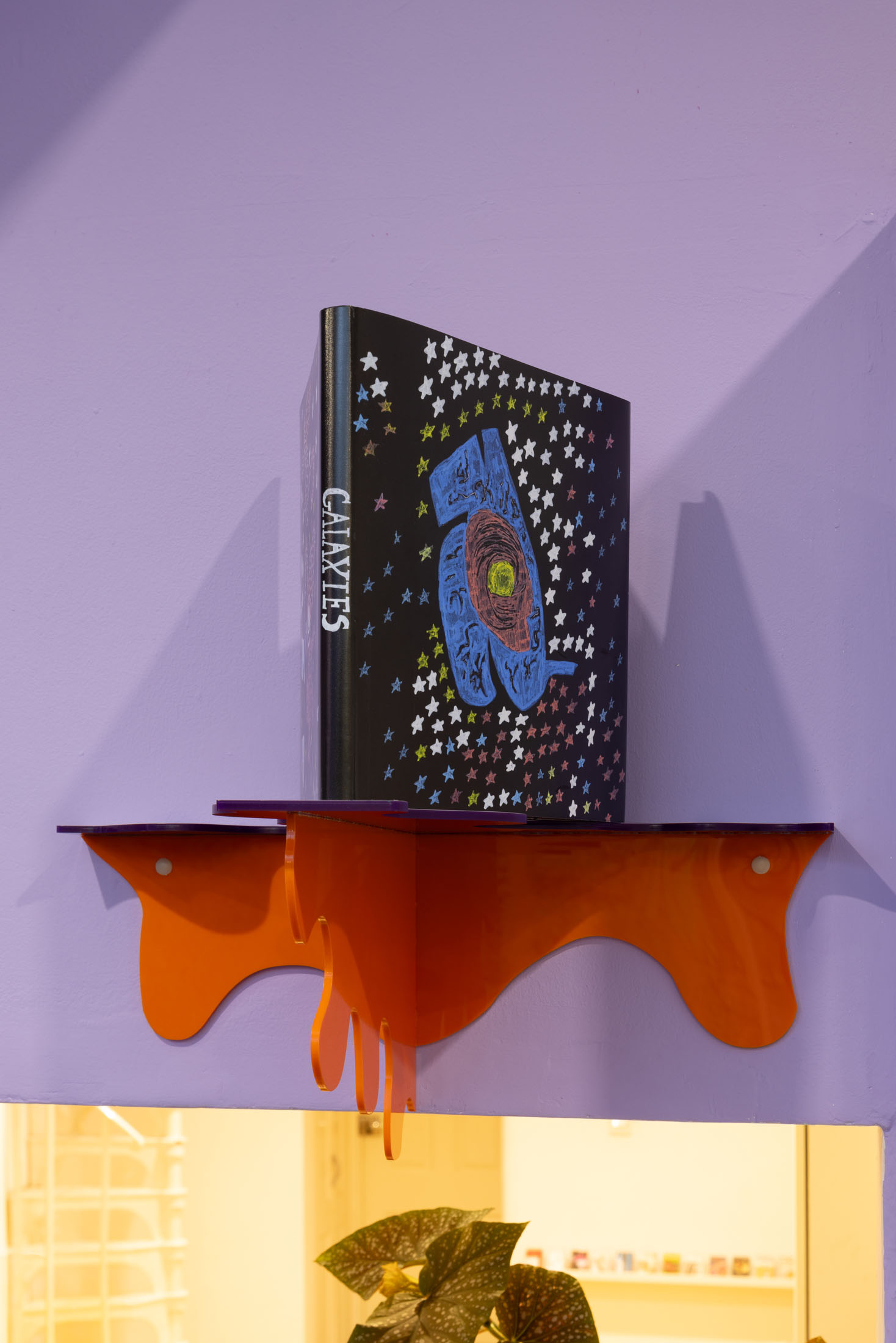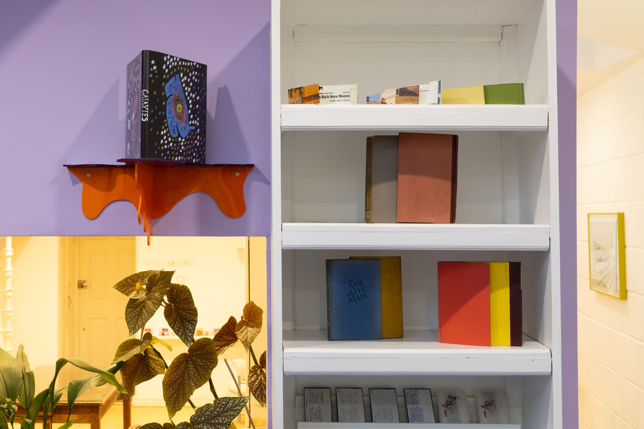 Cantilevered through the front of Flat Time House sits John Latham’s enormous sculpture of two books he named the Face. The pages of the books are interleaved so that they cannot be read in a rational manner rather signifying that knowledge should be communicated intuitively. This reflective and intuitive approach has been central to the experience of this group of artists during their time researching and working with the context of FTHo. In the first gallery, which Latham called The Mind, Andre Williams has responded to Latham’s work with a series of book sculptures using his graphic drawing style and striking typography in the first and final galleries. Radical Prototypes is presented here on a shelf designed by the artist in the same colours as Latham’s sculpture.
