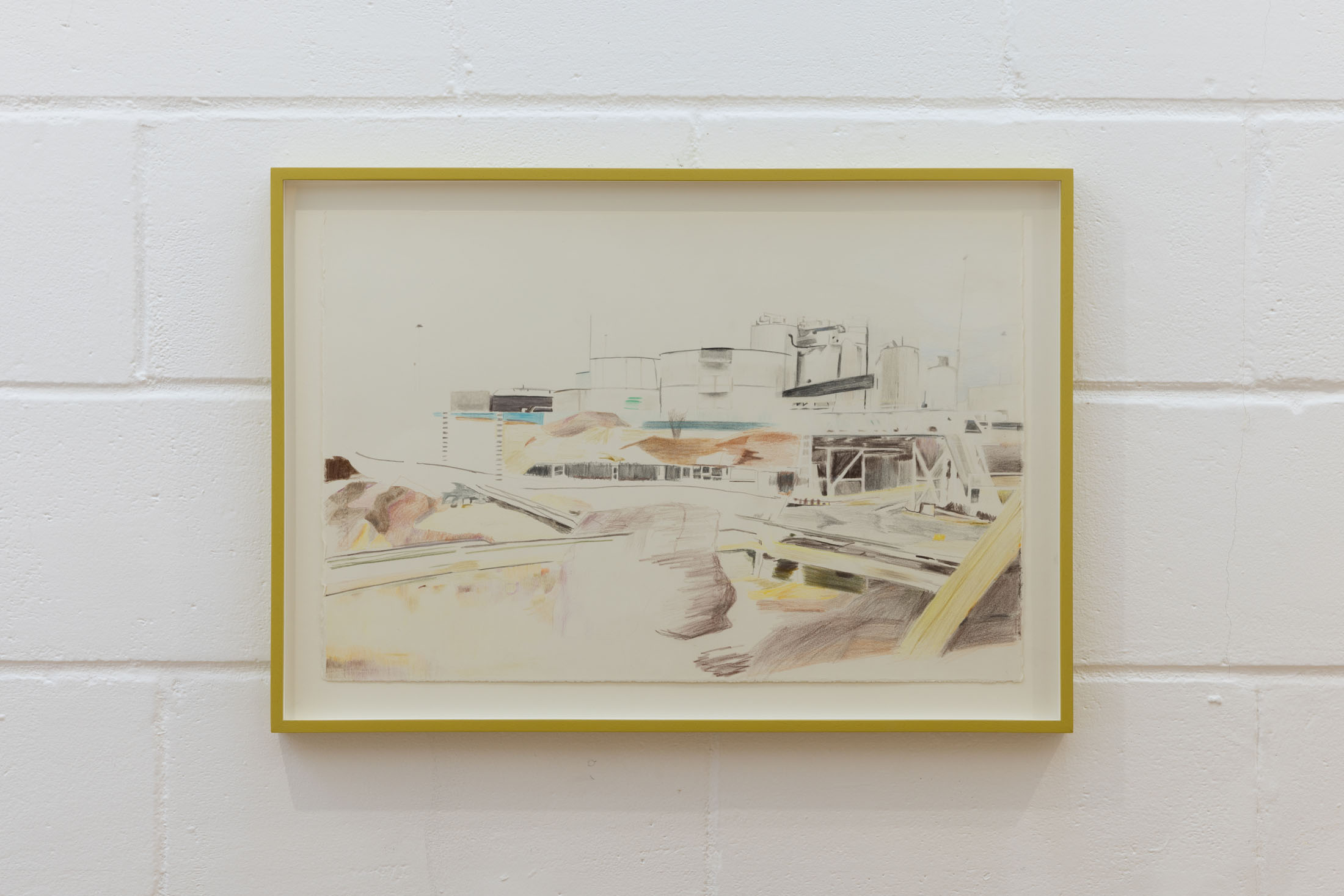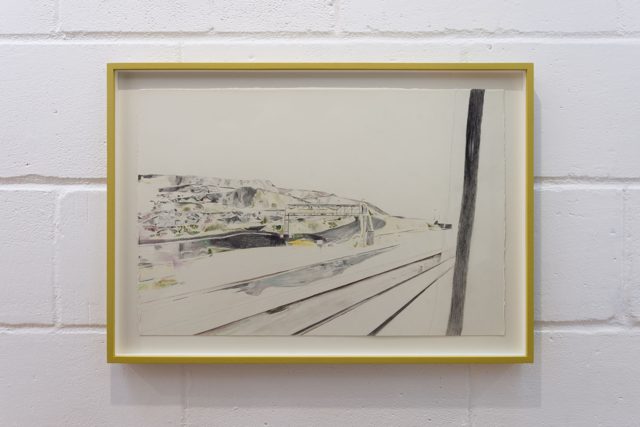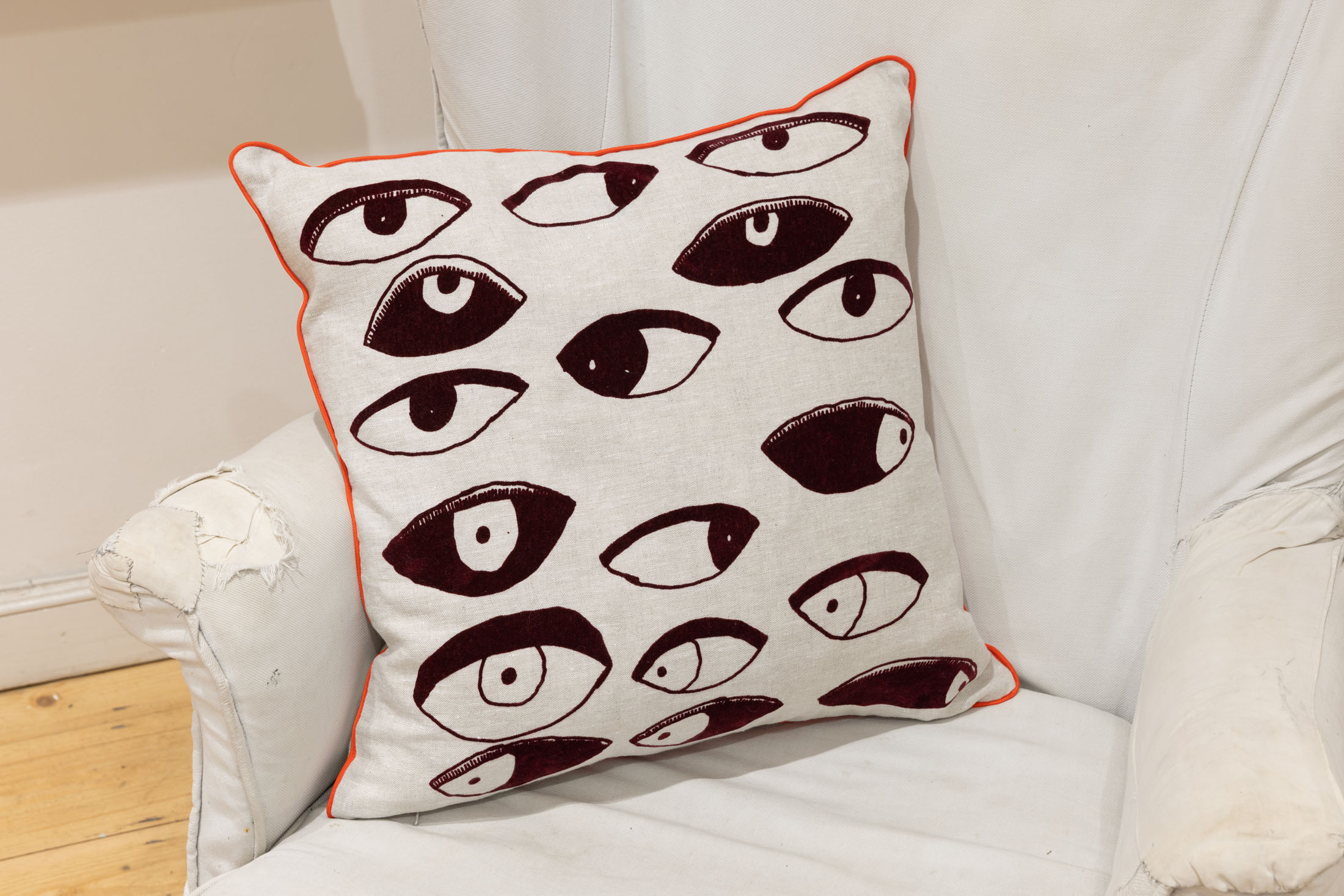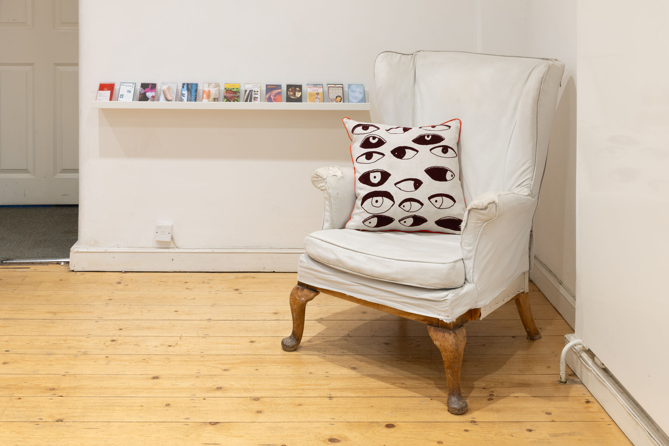 In the corridor and in the living area that Latham called The Body Event are works by Nick Fenn. His detailed series of site-specific drawings transcribe the sights and sounds of the post-industrial landscape of coastal North Yorkshire. The Blur series of pastel drawings capture photographic artifacts and effects from landscape images, zoomed in to abstraction. Redcar is Crawling with Sound depicts a landscape from a train window in passing. Fenn envisioned the view as a score in real time, similar to a spectrogram, which he used for a multi-layered sonic composition. Alongside, a hand-woven hanging echoes geological strata, considering the earth itself as a score emerging over epochs. The piece sits alongside One State One by John Latham, the two artists sharing an understanding of the landscape as representation of time. Latham’s original armchair can be used to listen to the sound piece, which sits in the space with Andre Williams’ Eye Cushion.