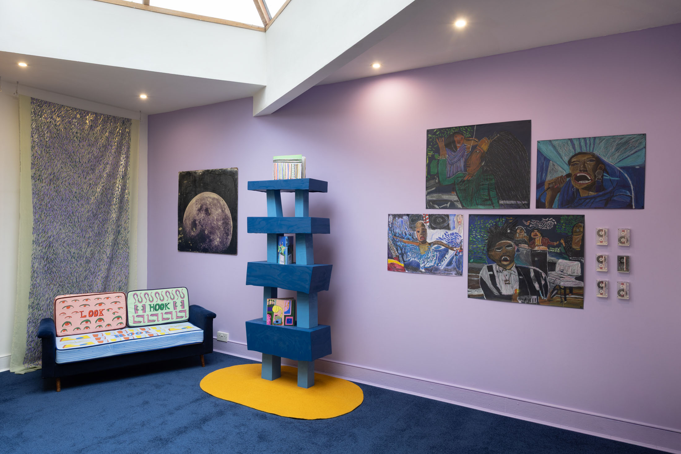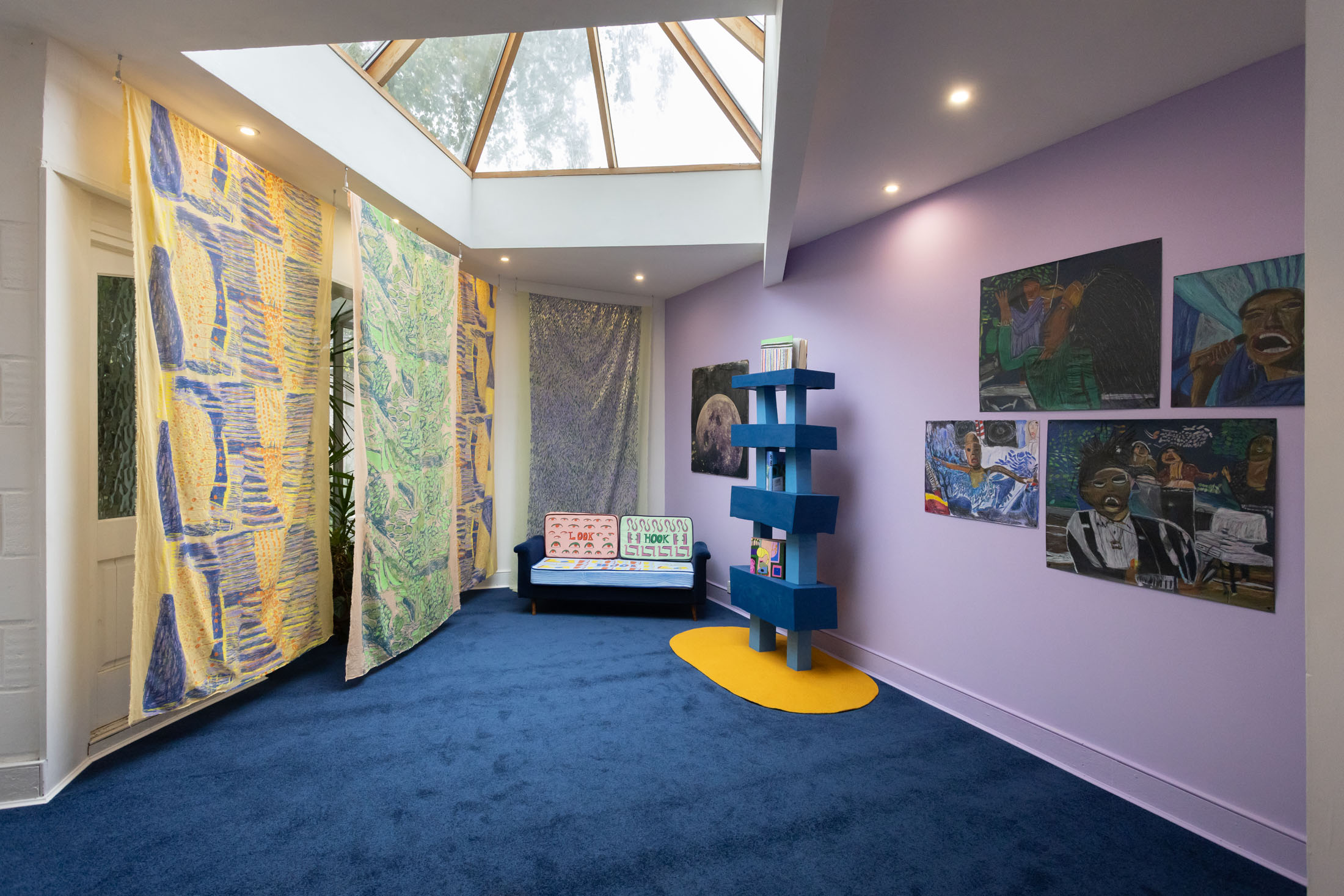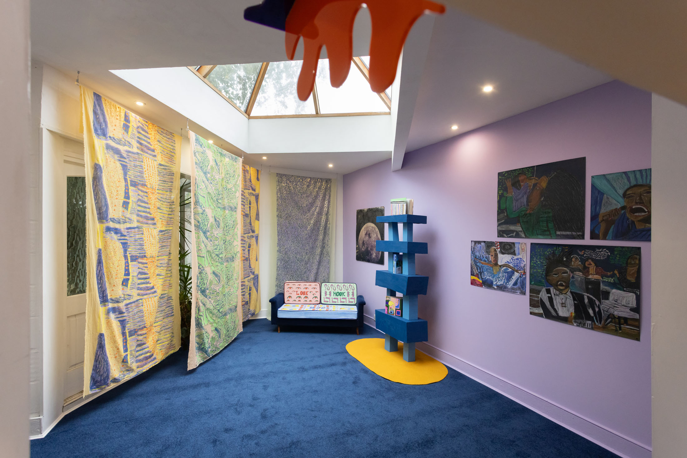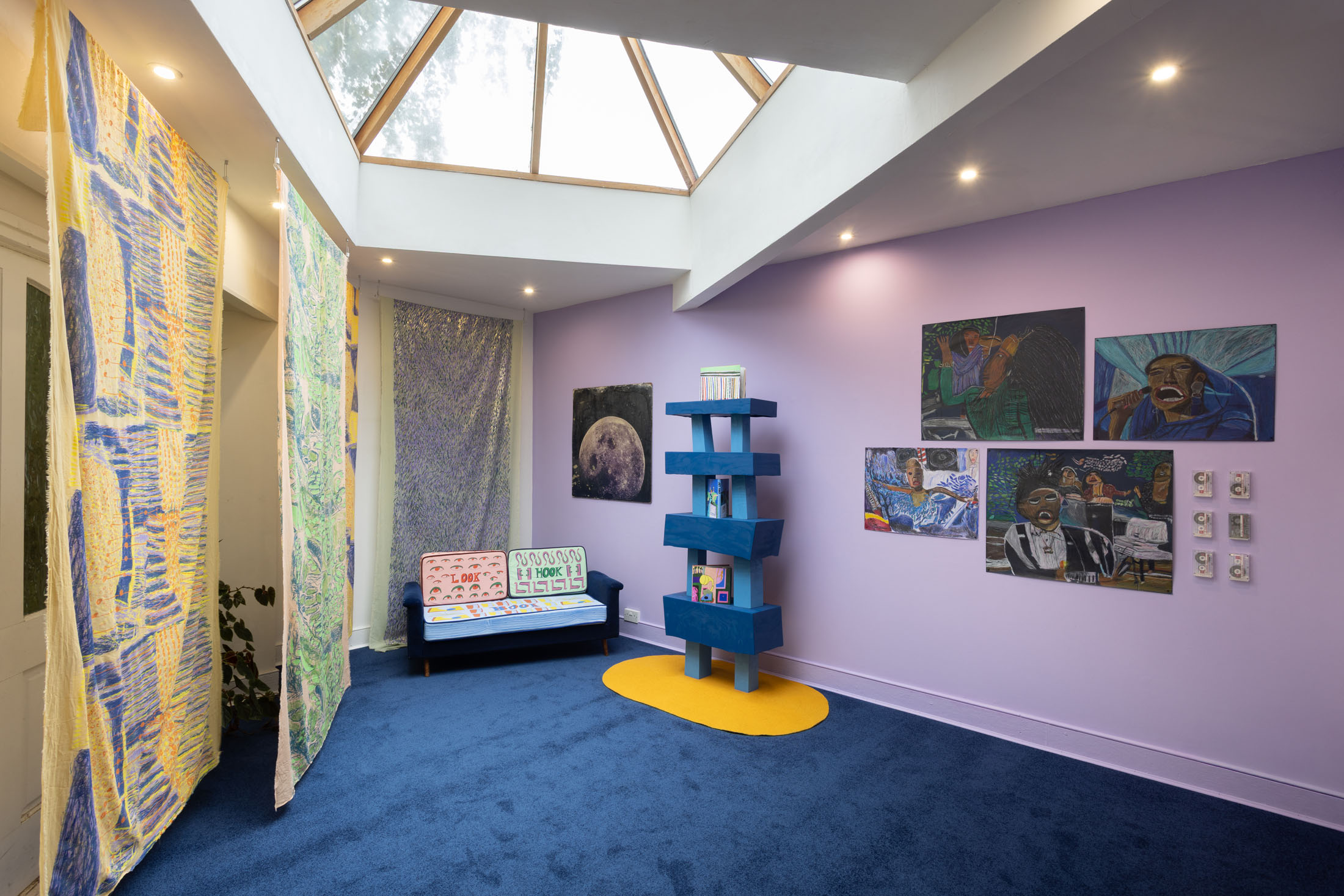 The rear gallery, The Hand was originally Latham’s studio and for this exhibition has been transformed into a domestic living space with a sound system reusing Latham’s original Hi-Fi speakers. Alongside, Christian Ovonlen’s work re-animates euphoric memories of dancing at home to the ‘KLF’ on MTV in the early 1990s. New works on paper depicting the KLF and Soul II Soul employing Ovonlen’s distinctive use of colour, explore and summon memories of music from his youth, which can be played in the space via cassette tape. Large textiles situated in front of the conservatory bring to mind Latham’s habit of using paintings on canvas as window blinds. Ovonlen uses them to transform the space, his drawn and painted gestural mark making on this scale is intended to convey the transcendent experience of listening to music and movement in space.