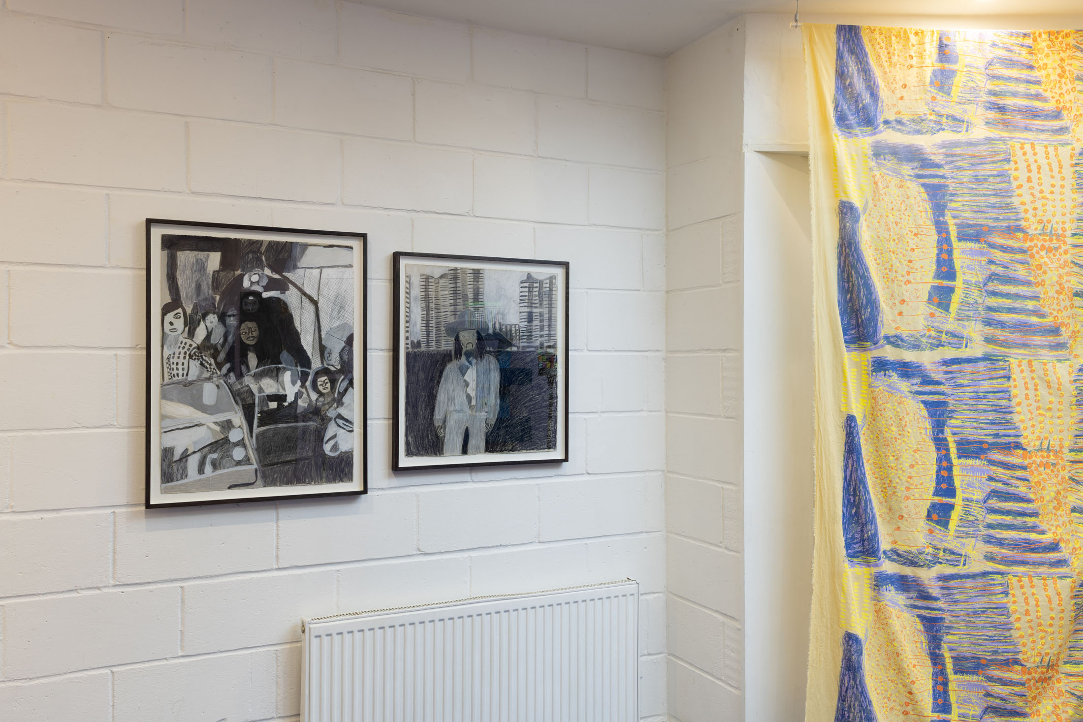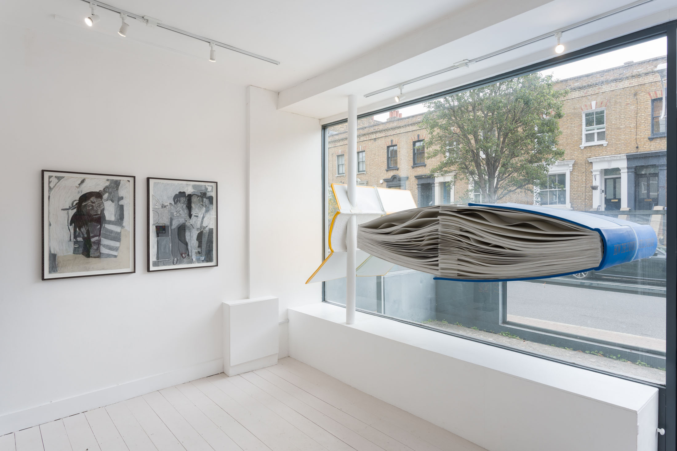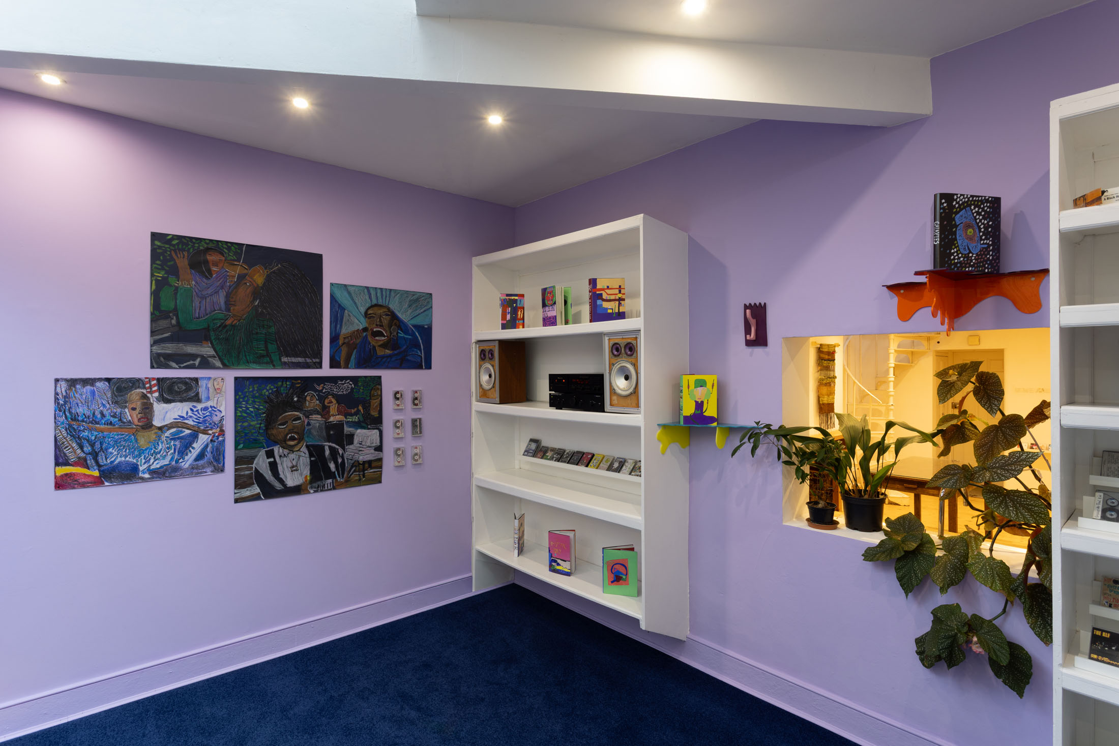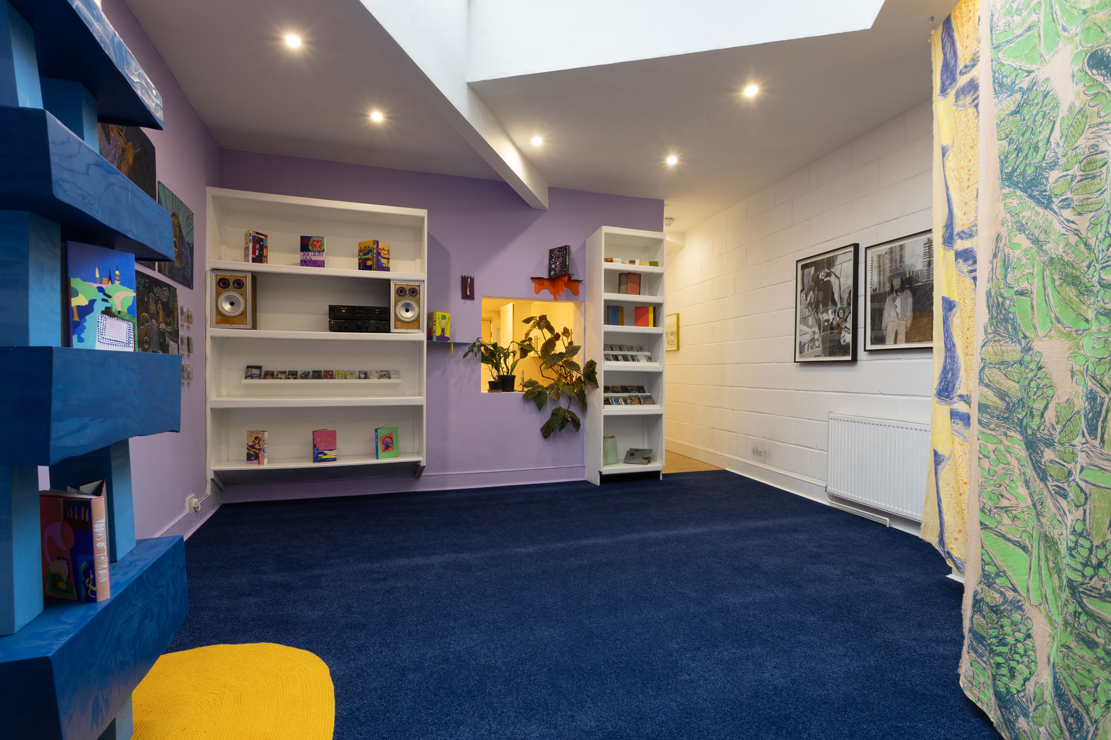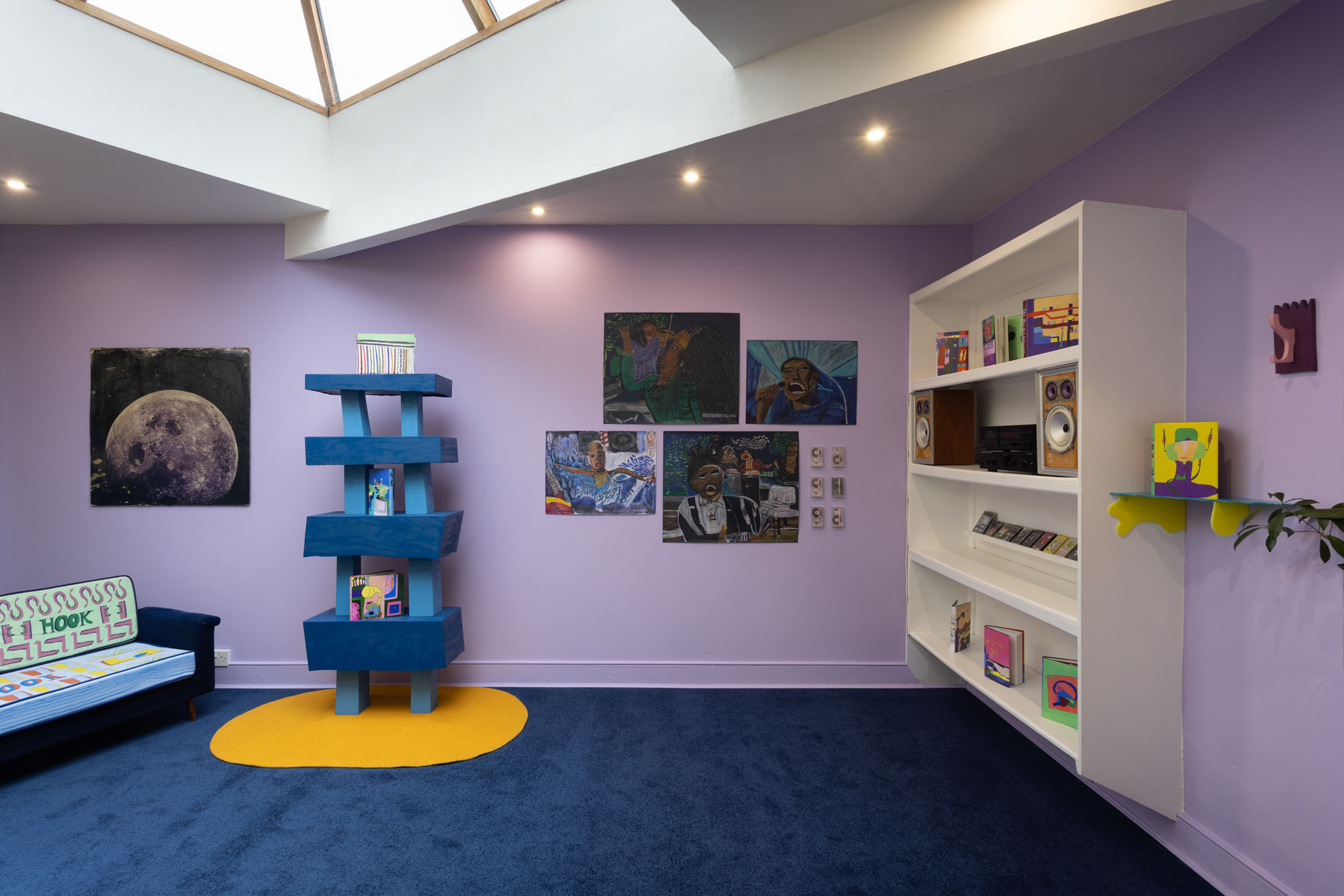 The rear gallery, The Hand was originally Latham’s studio and for this exhibition has been transformed into a domestic living space with a sound system reusing Latham’s original Hi-Fi speakers. Alongside, Christian Ovonlen’s work re-animates euphoric memories of dancing at home to the ‘KLF’ on MTV in the early 1990s. New works on paper depicting the KLF and Soul II Soul employing Ovonlen’s distinctive use of colour, explore and summon memories of music from his youth, which can be played in the space via cassette tape. Large textiles situated in front of the conservatory bring to mind Latham’s habit of using paintings on canvas as window blinds. Ovonlen uses them to transform the space, his drawn and painted gestural mark making on this scale is intended to convey the transcendent experience of listening to music and movement in space.